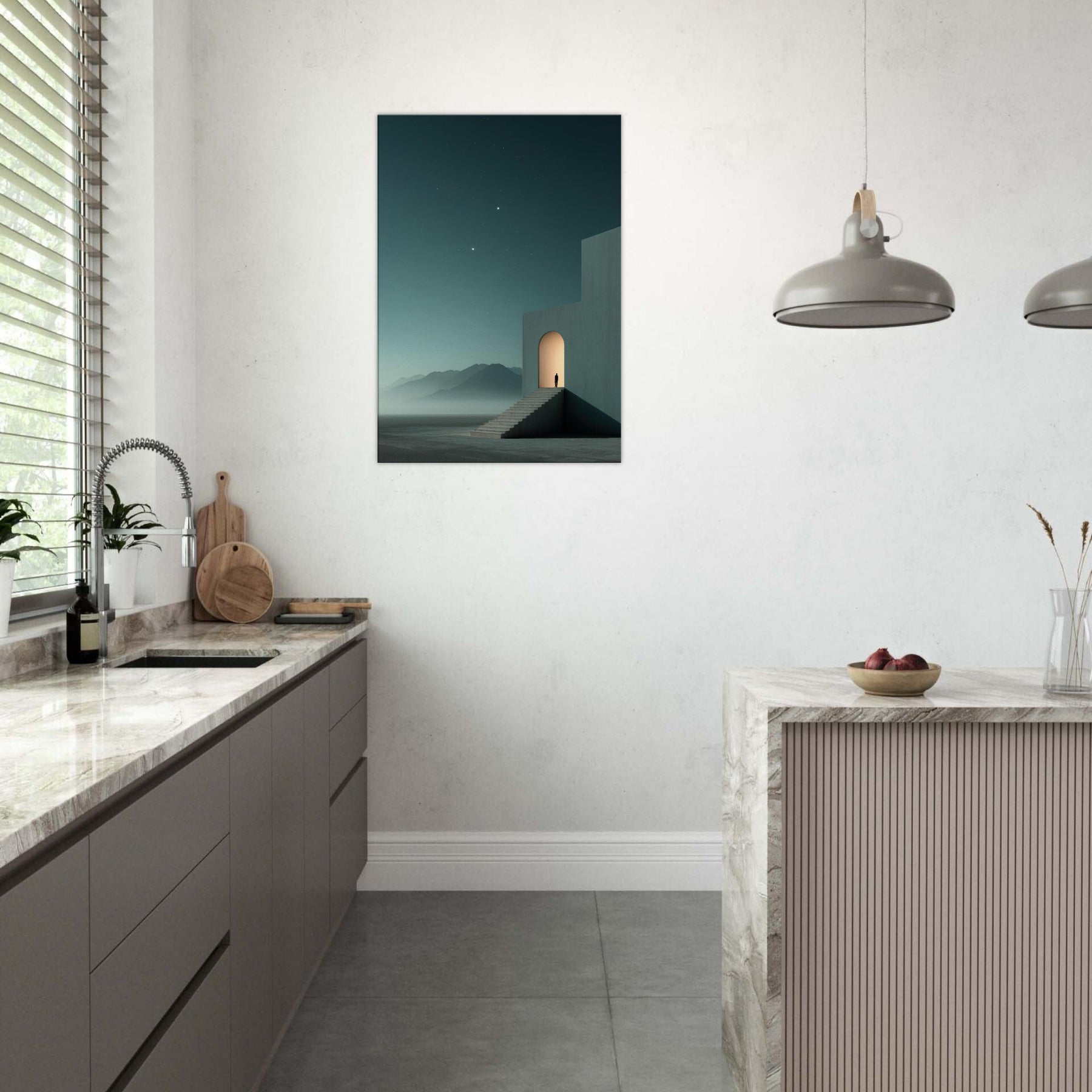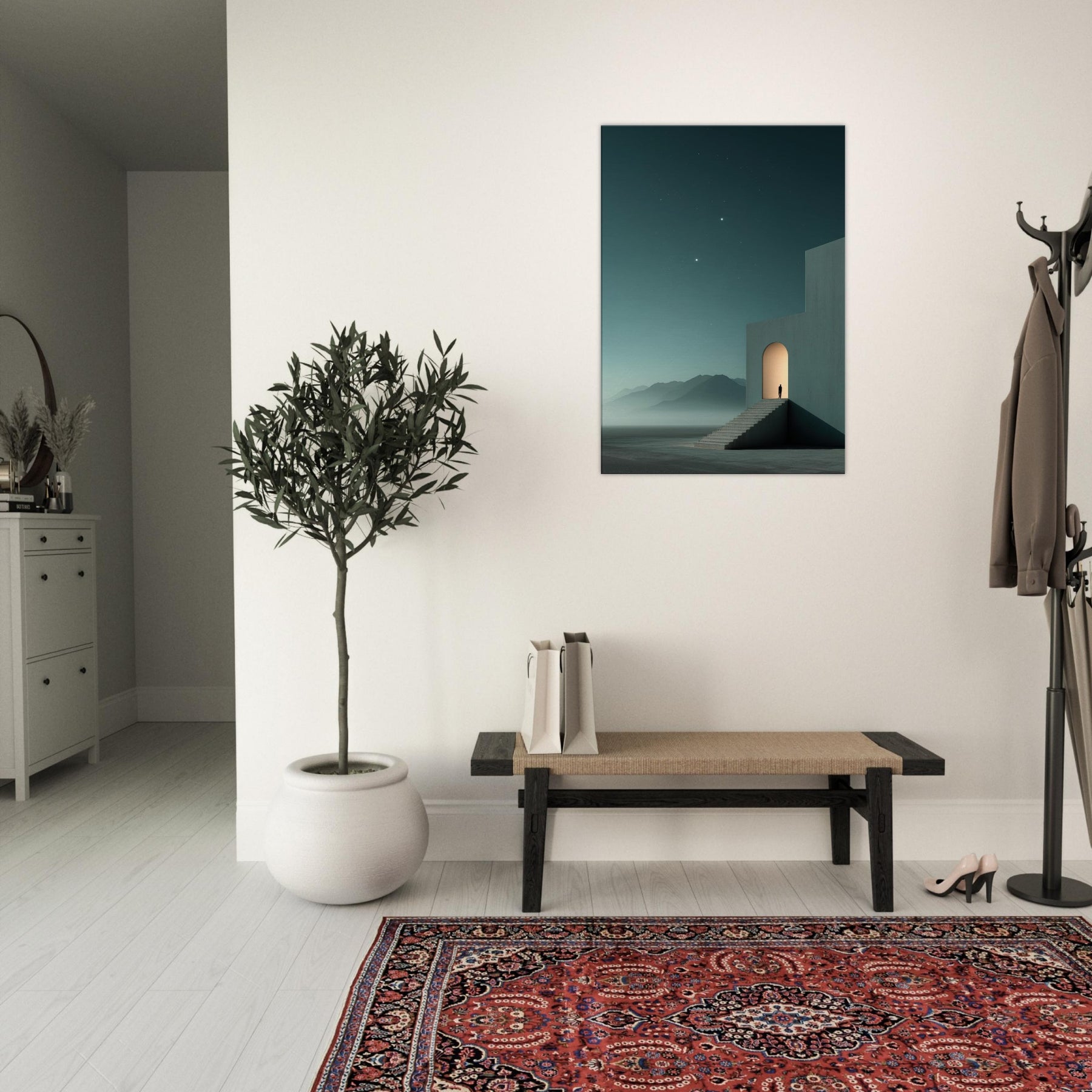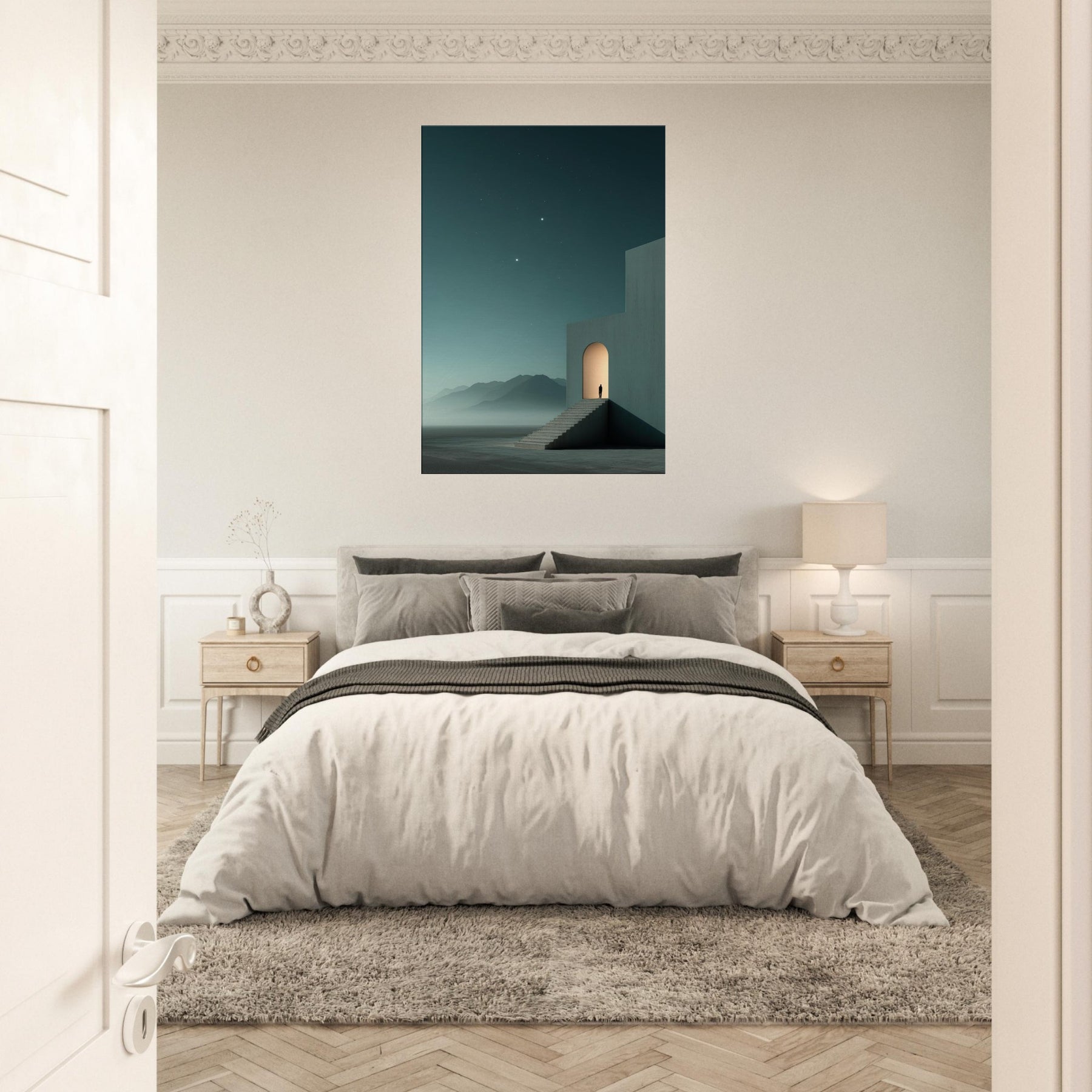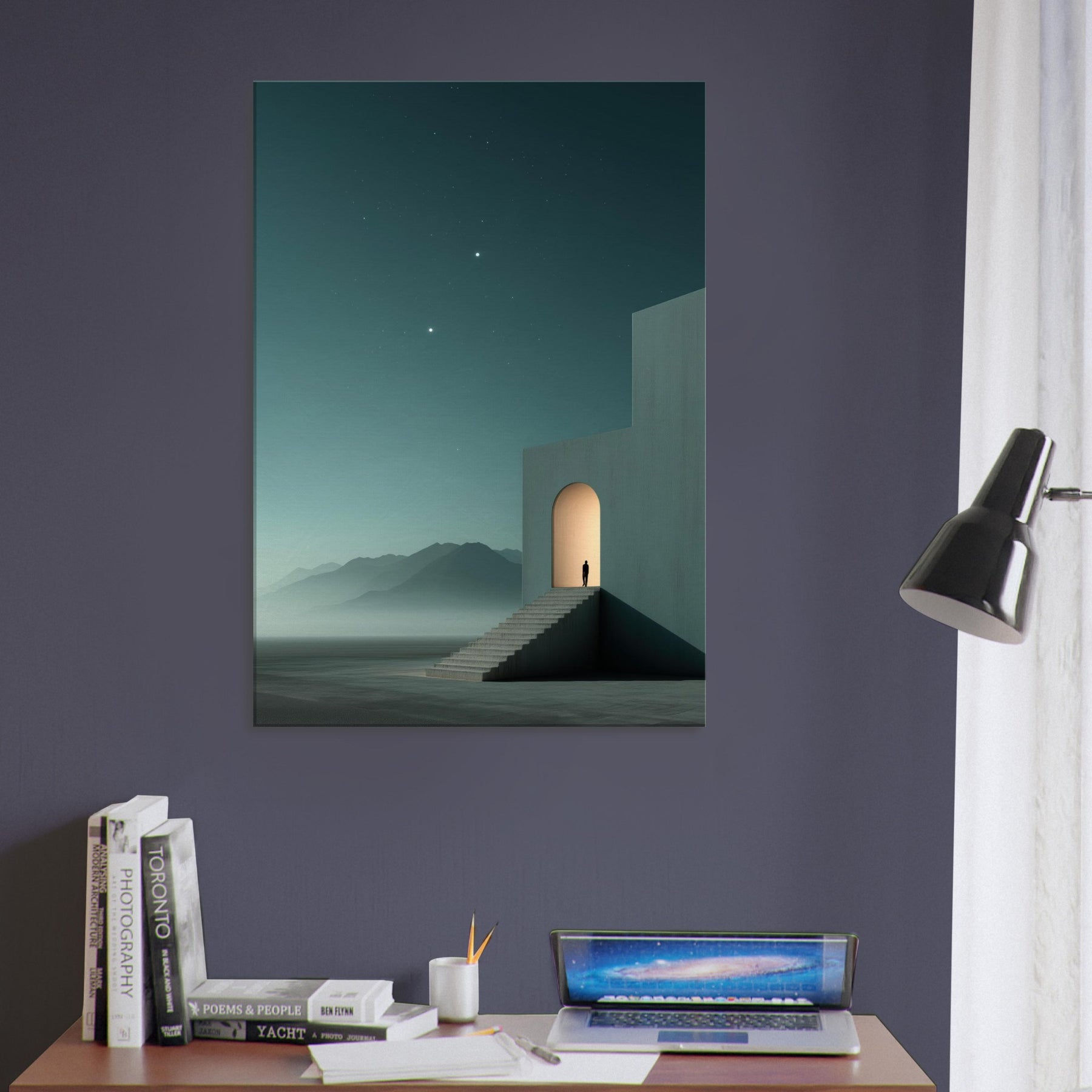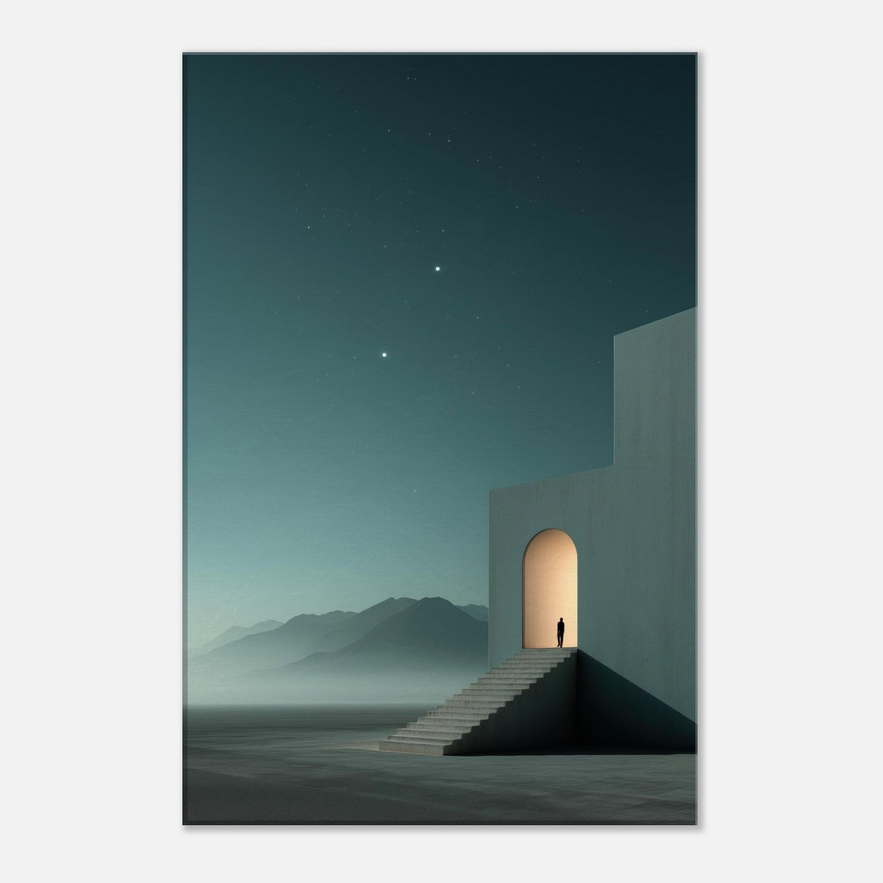 Colosseum gleams in a moonlit dreamscape, where stairs rise like lighted thresholds and a lone figure steps into a soft amber glow. This surreal fuses architectural precision with ethereal hush, inviting quiet reflection as the room breathes around it. The artwork carries ancient memory while dissolving into impossible geometry, turning any wall into a portal of travel and time. Ideal for a living space seeking calm, cinematic presence and contemplative mood.