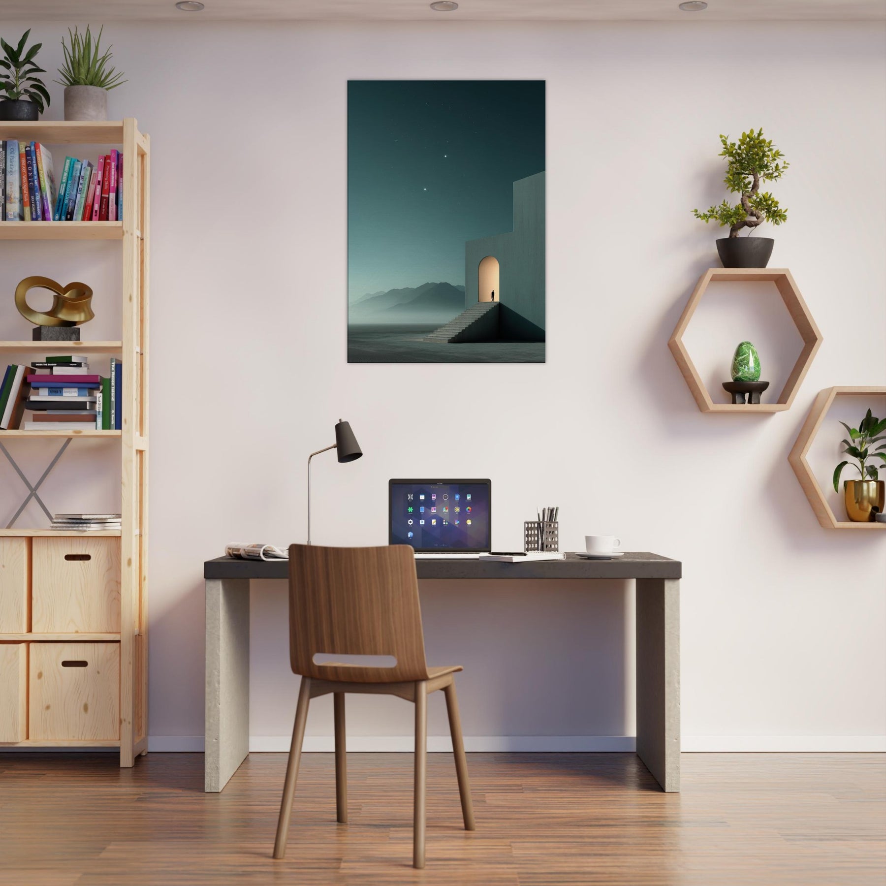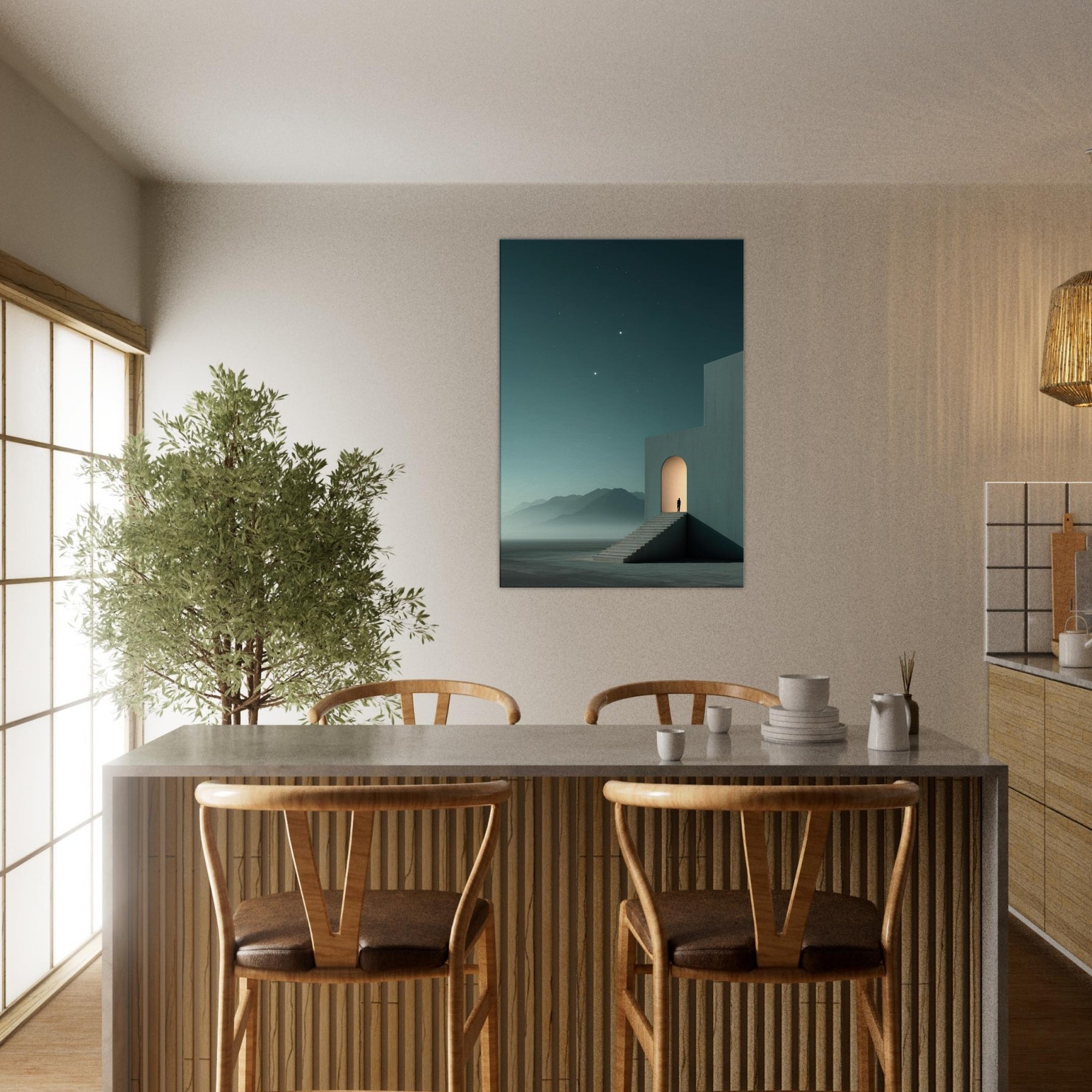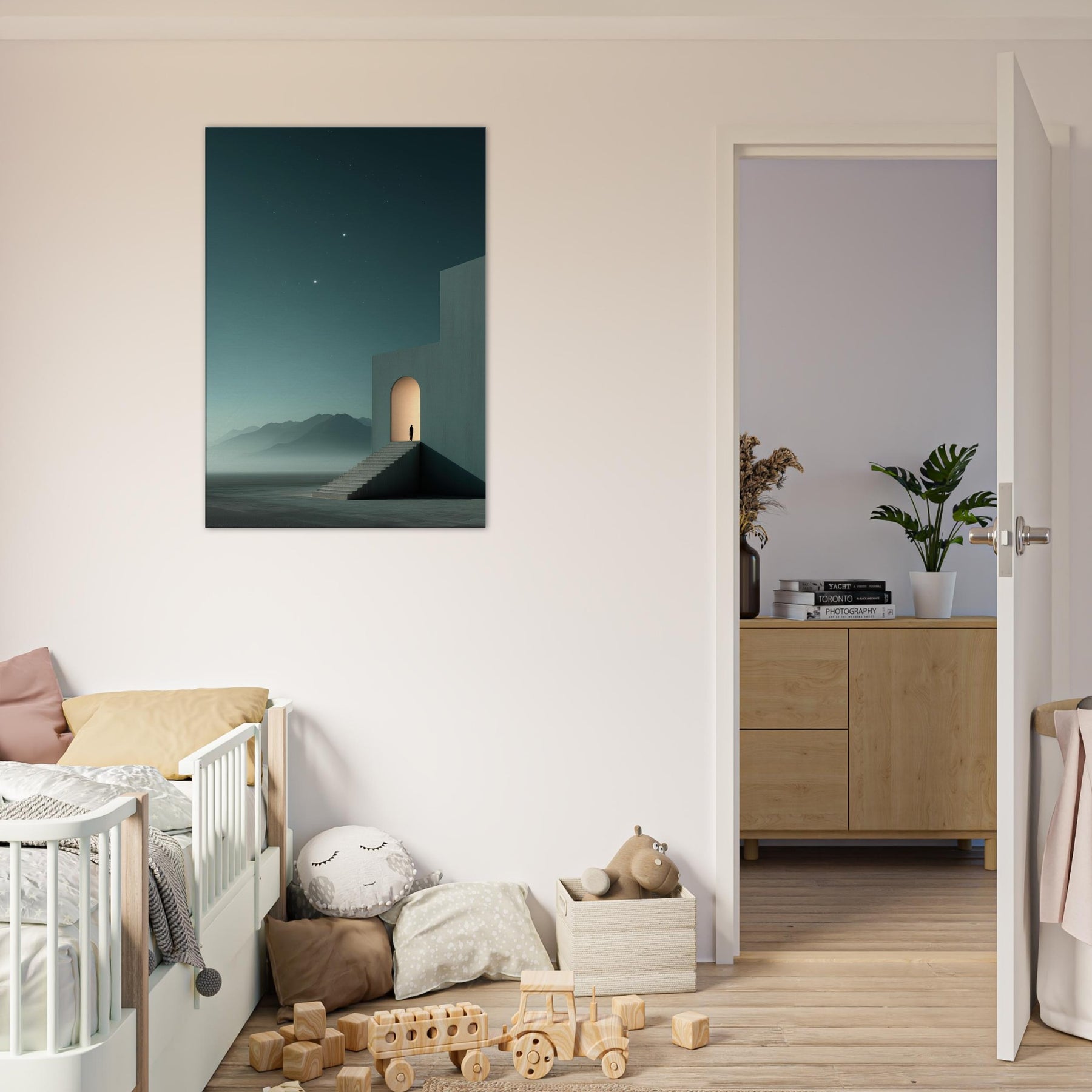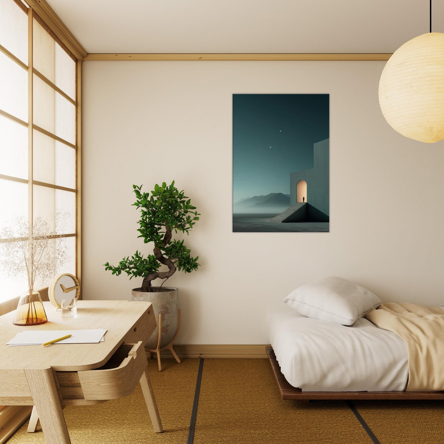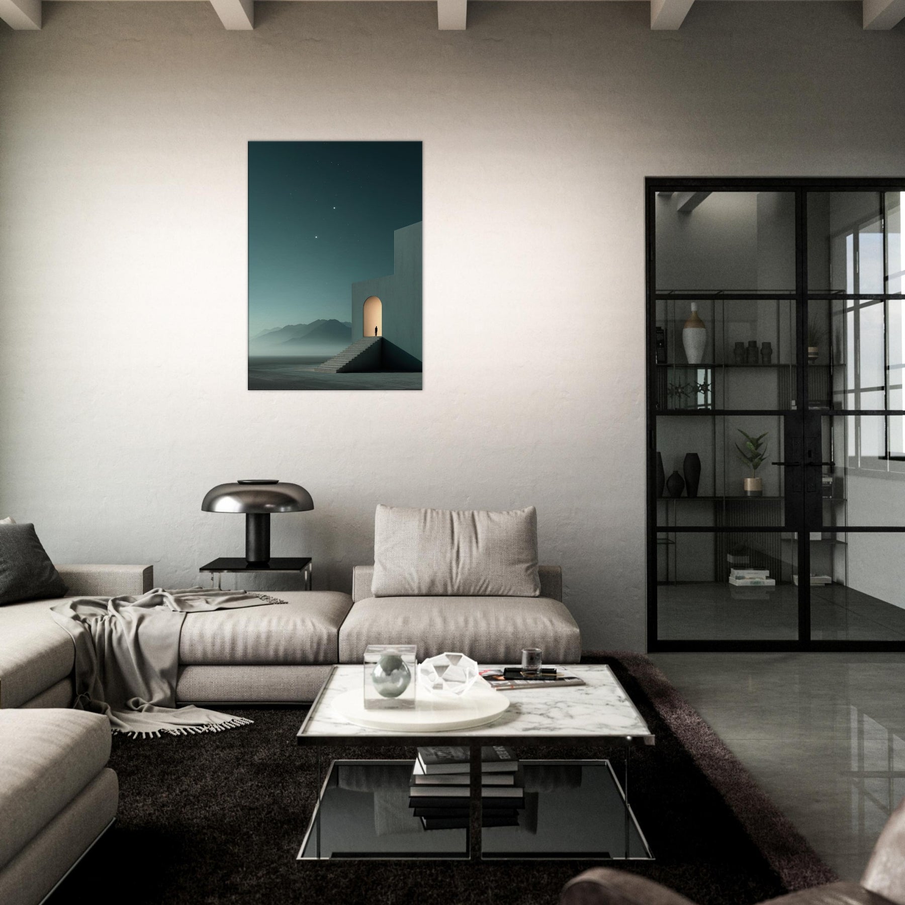 Colosseum gleams in a moonlit dreamscape, where stairs rise like lighted thresholds and a lone figure steps into a soft amber glow. This surreal fuses architectural precision with ethereal hush, inviting quiet reflection as the room breathes around it. The artwork carries ancient memory while dissolving into impossible geometry, turning any wall into a portal of travel and time. Ideal for a living space seeking calm, cinematic presence and contemplative mood.