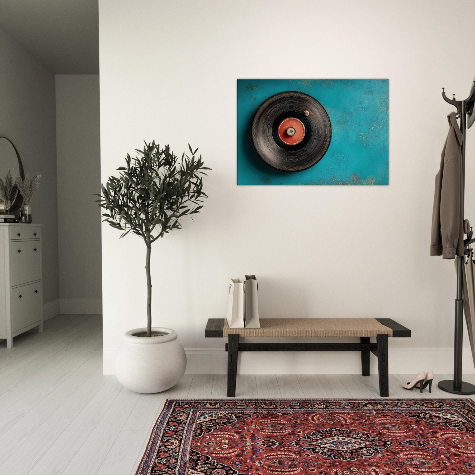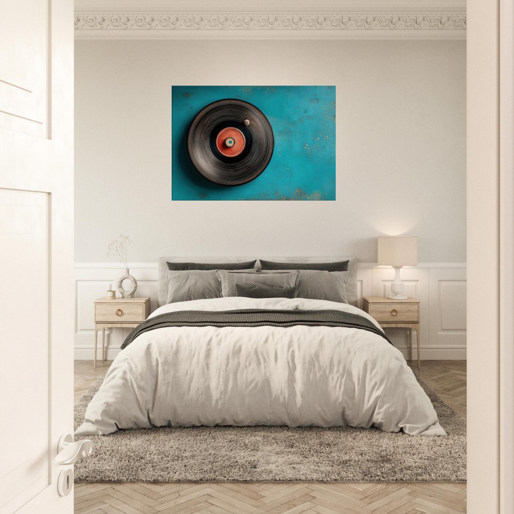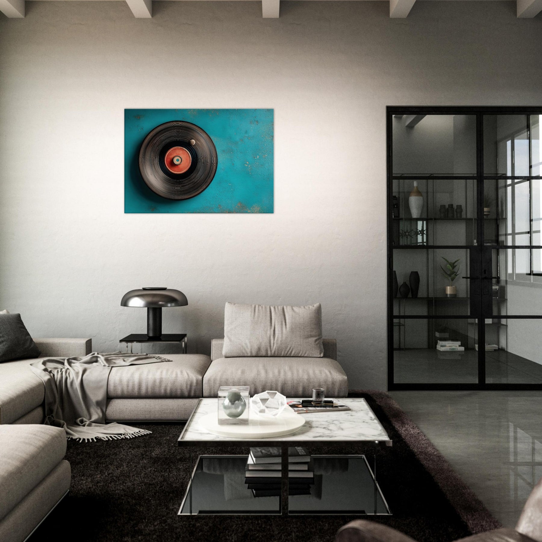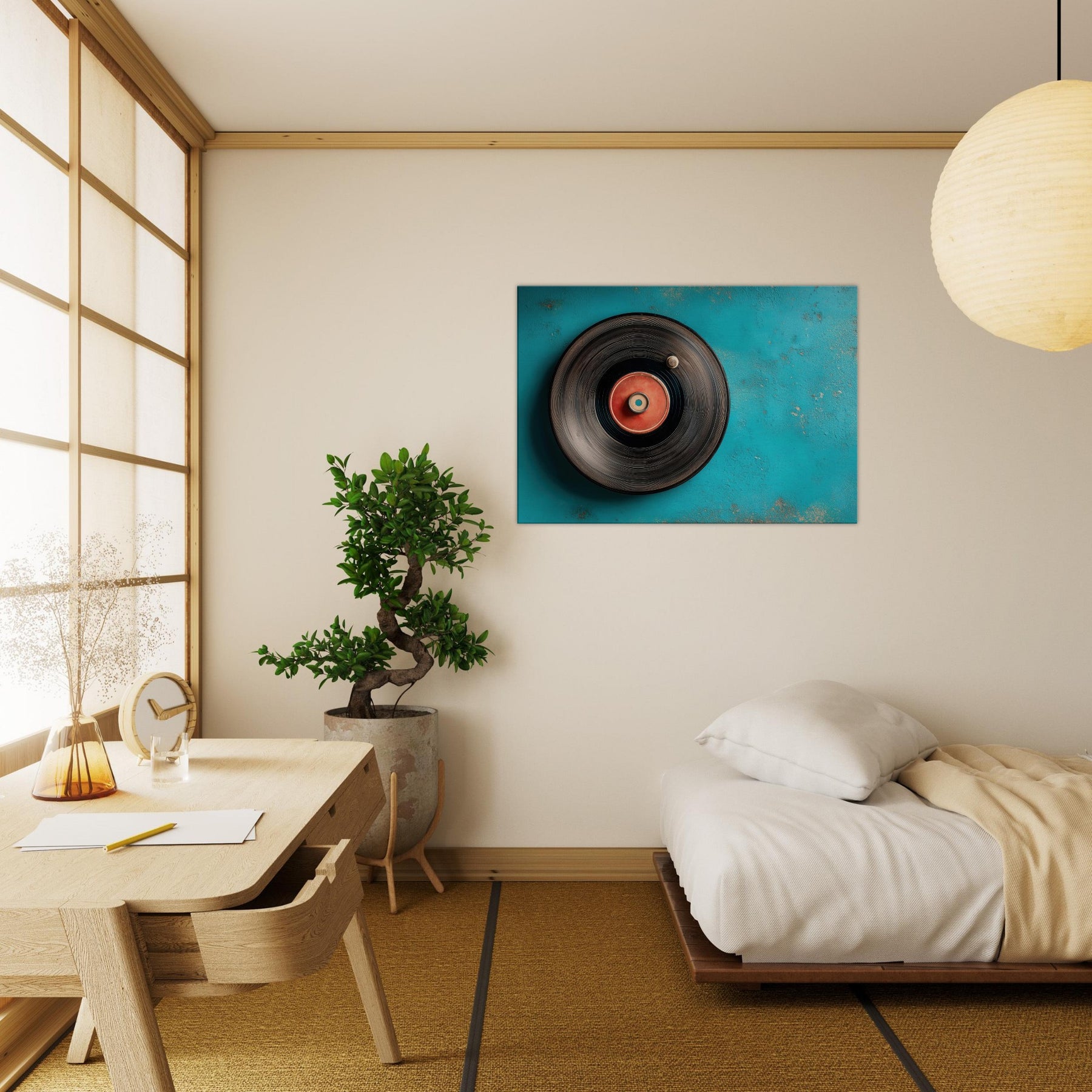 On the wall, the Primary Subject, a vinyl record, spirals into a dreamscape where sound becomes silhouette and memory takes shape. Concentric grooves ripple into a surreal horizon, inviting the eye to wander and the mind to drift. This piece elevates a living space with tactile texture and moody atmosphere, turning everyday icons into portals of mood. It pairs vintage resonance with contemporary flair, transforming any room into a quiet sanctuary for reflection, listening, and slow, deliberate wonder.