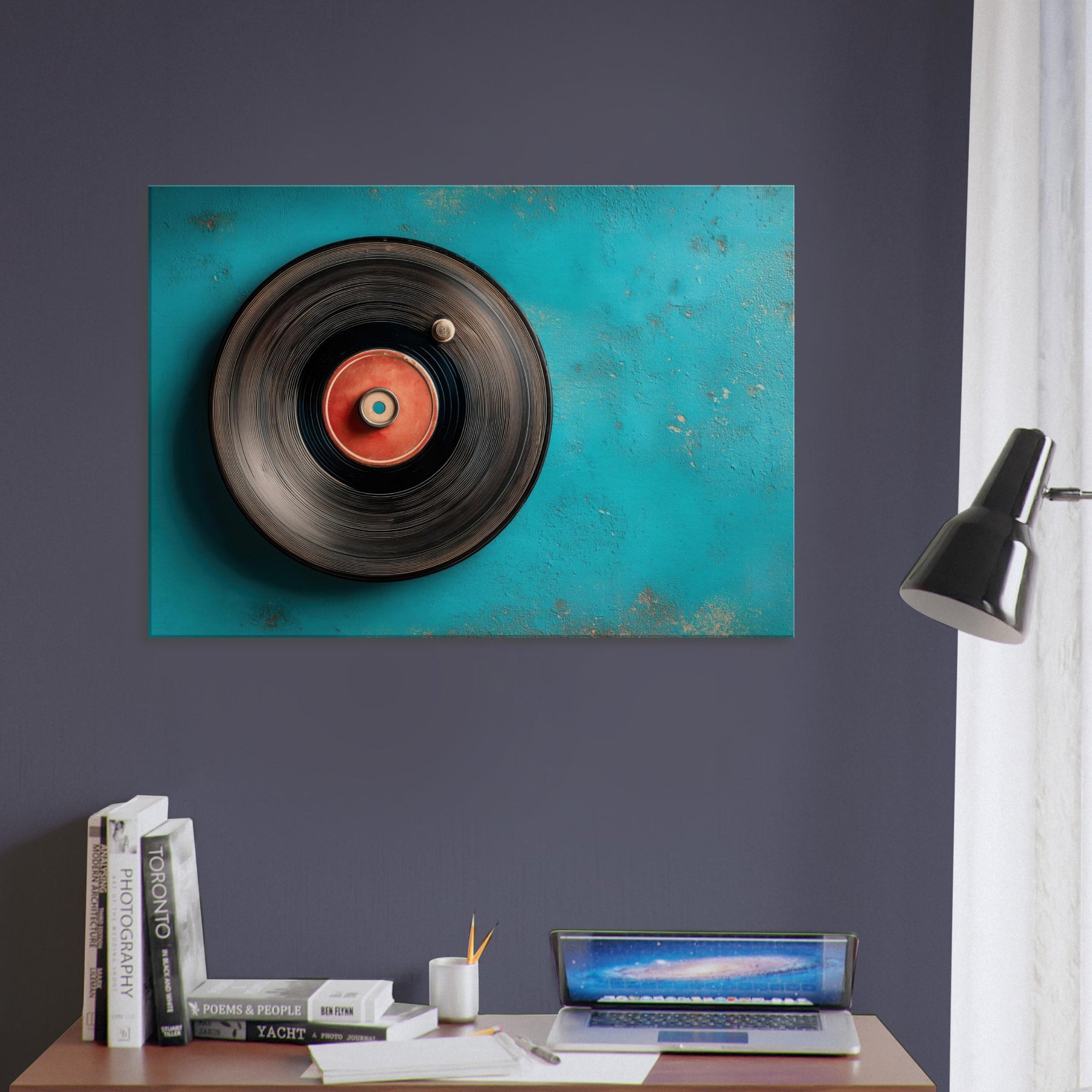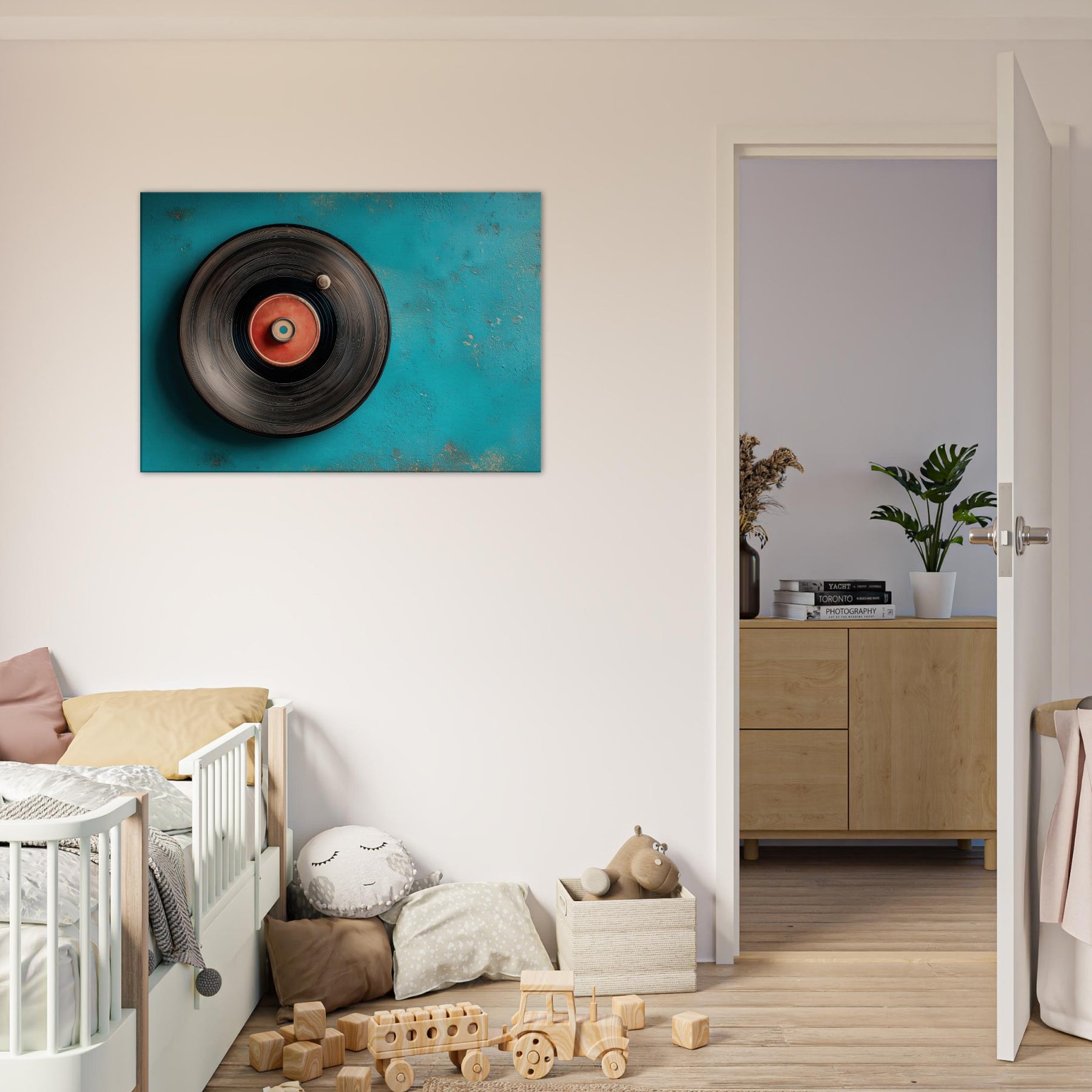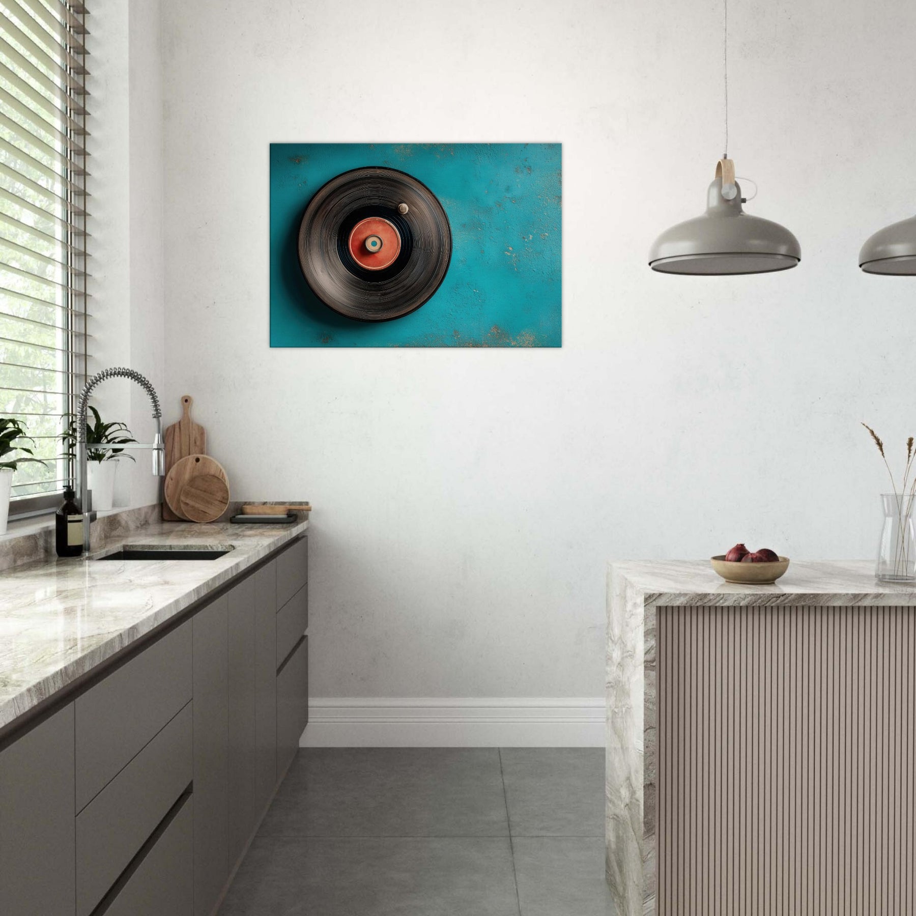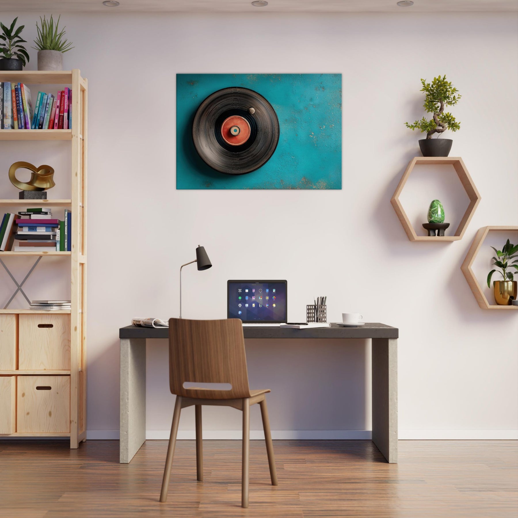 On the wall, the Primary Subject, a vinyl record, spirals into a dreamscape where sound becomes silhouette and memory takes shape. Concentric grooves ripple into a surreal horizon, inviting the eye to wander and the mind to drift. This piece elevates a living space with tactile texture and moody atmosphere, turning everyday icons into portals of mood. It pairs vintage resonance with contemporary flair, transforming any room into a quiet sanctuary for reflection, listening, and slow, deliberate wonder.