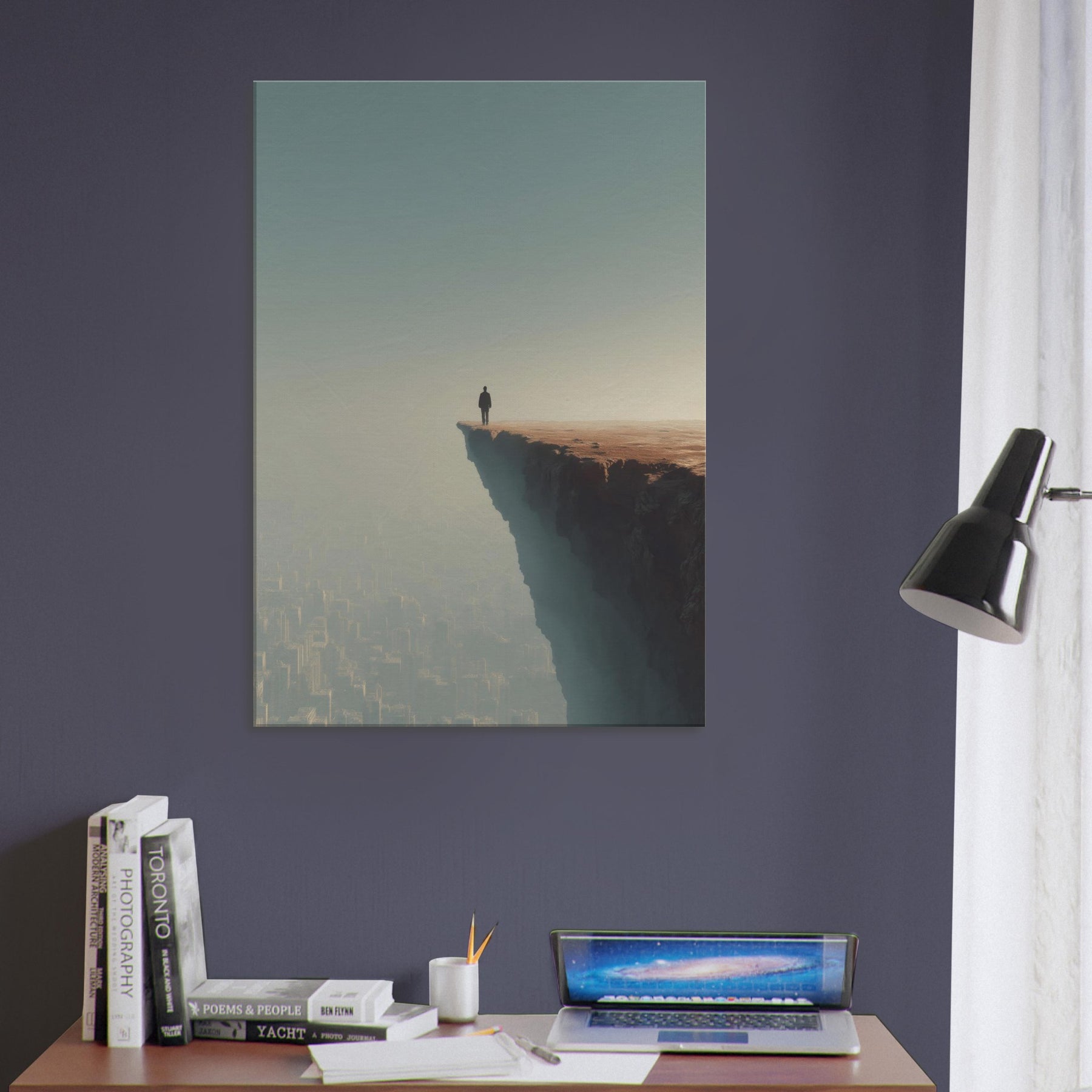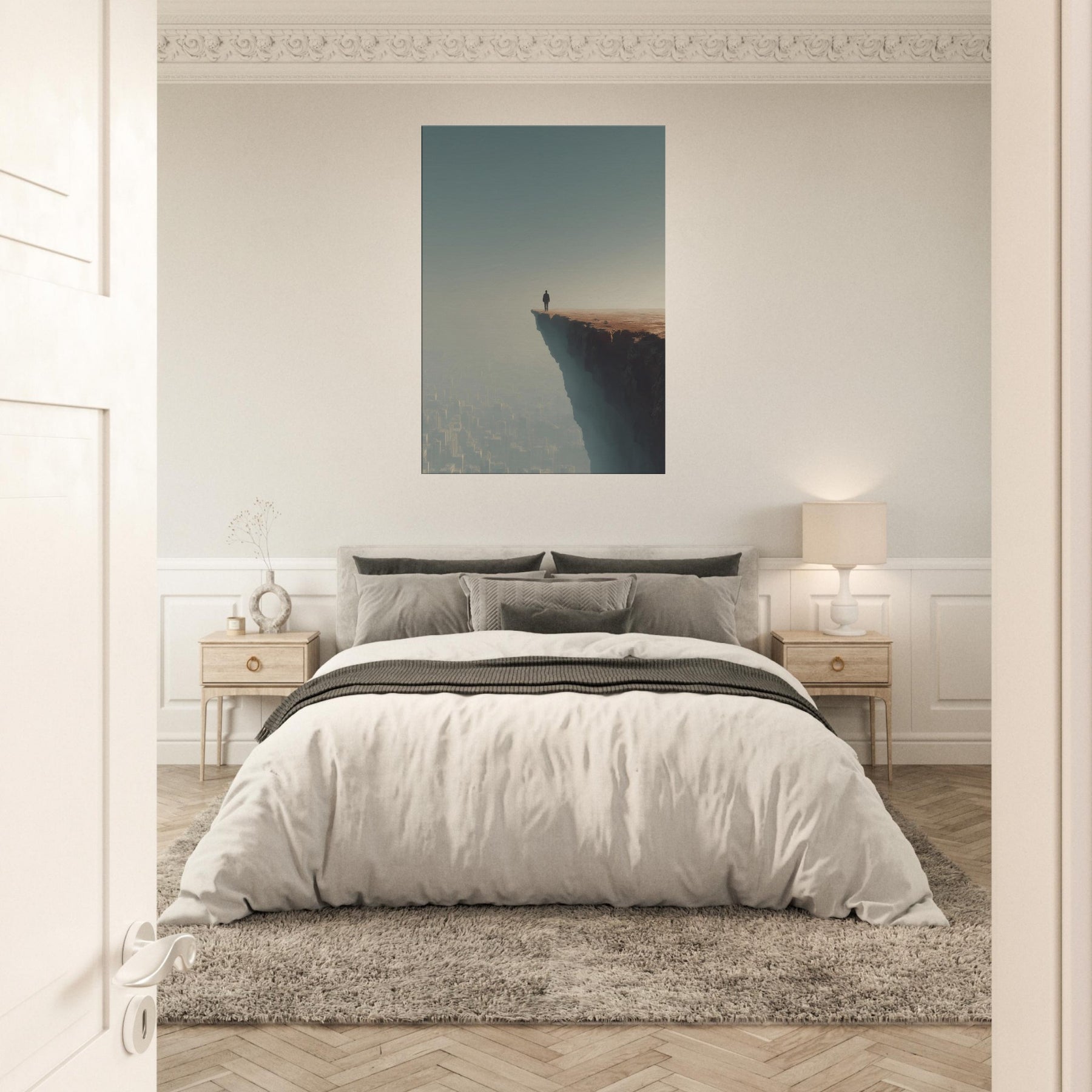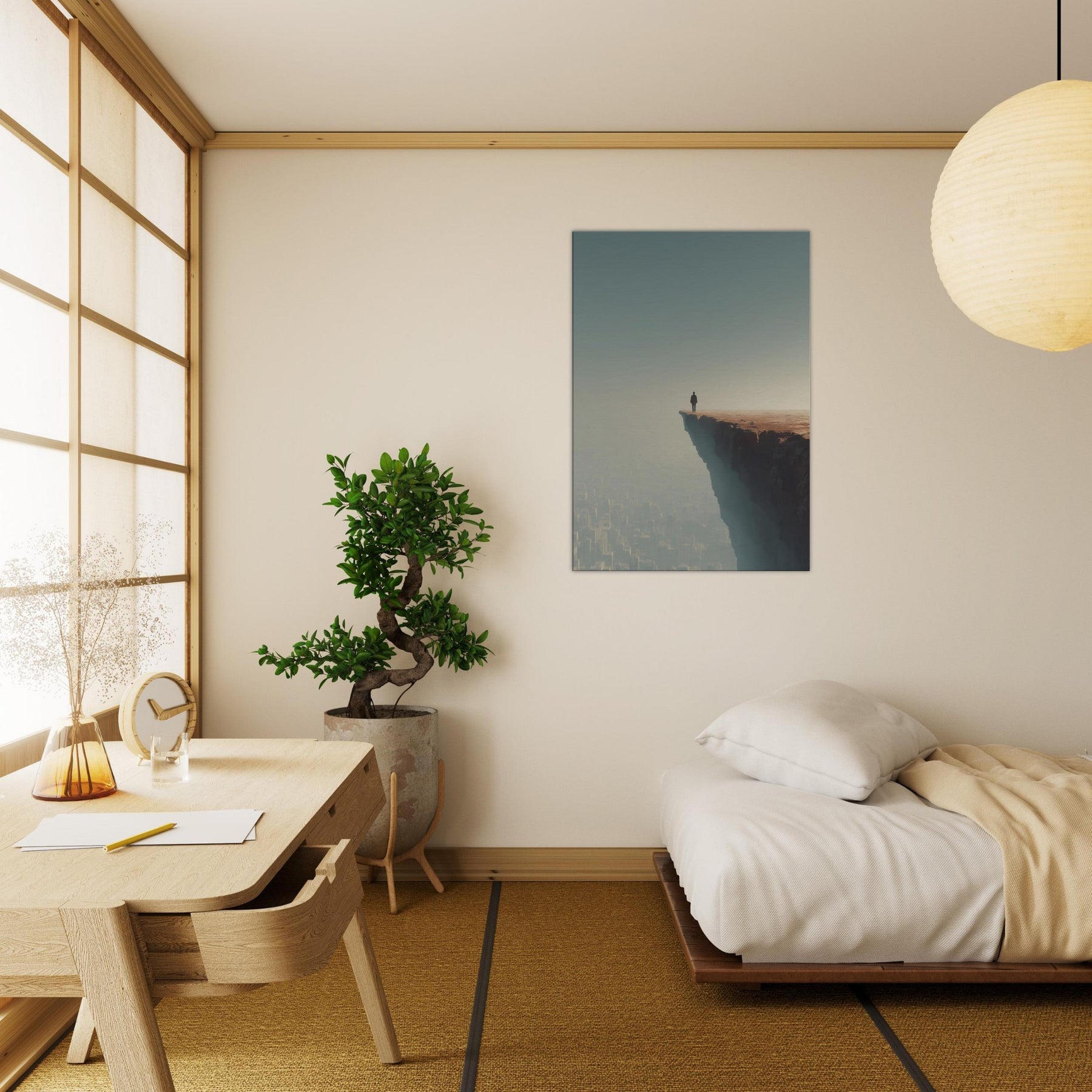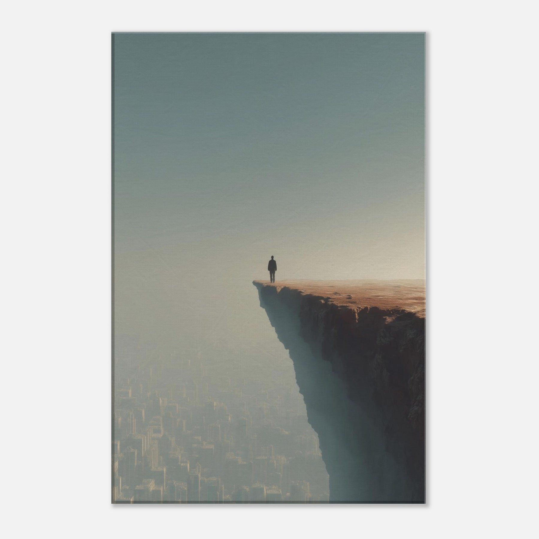 Let your space drift between dream and horizon with the Great Wall Silhouette in a surreal cityscape. A lone figure stands at the cliff's edge, surveying a sleeping metropolis veiled in fog and amber light. The image fuses ancient thresholds with modern geometry, creating a quiet tension between scale and serenity. Its breathable palette and ethereal atmosphere invite reflection, making it ideal for living rooms and bedrooms seeking atmosphere, conversation, and a sense of expansive possibility.