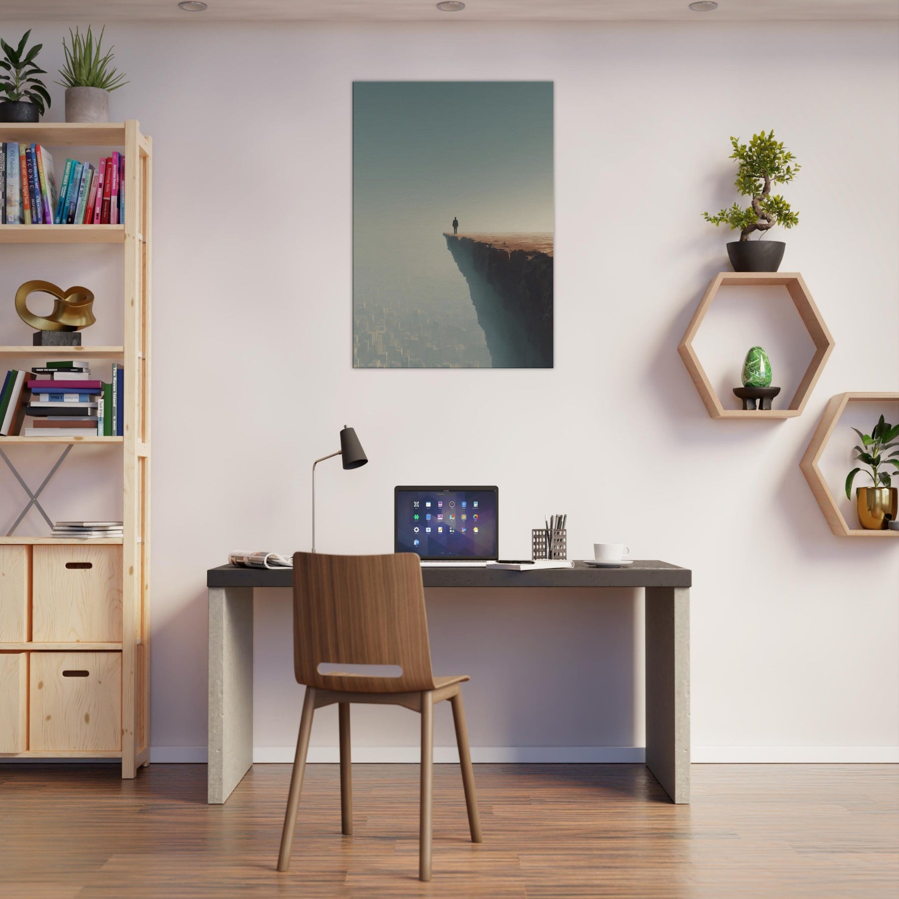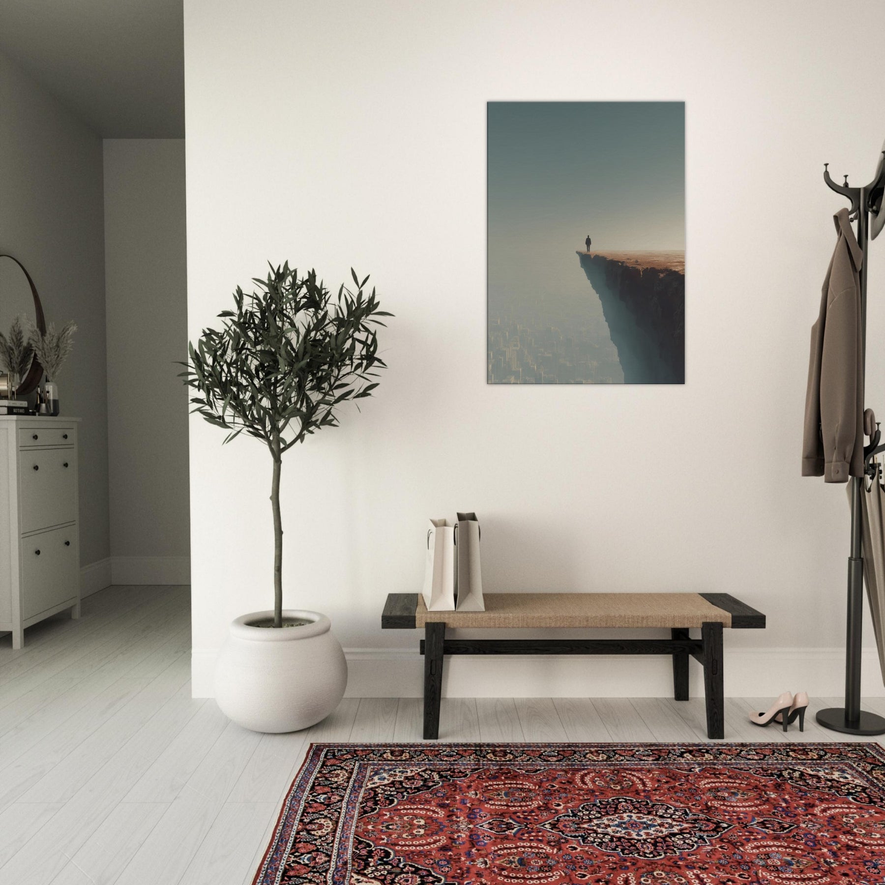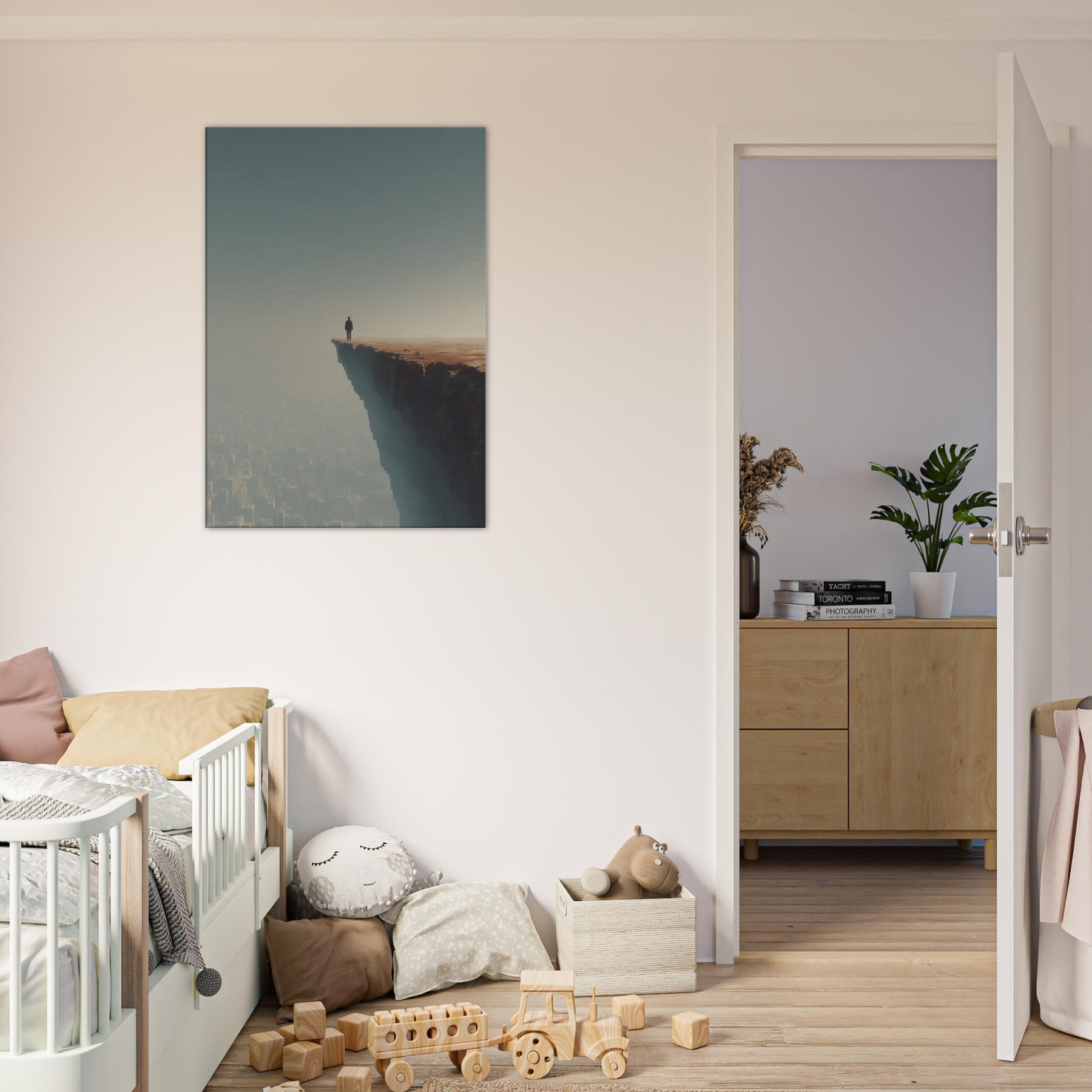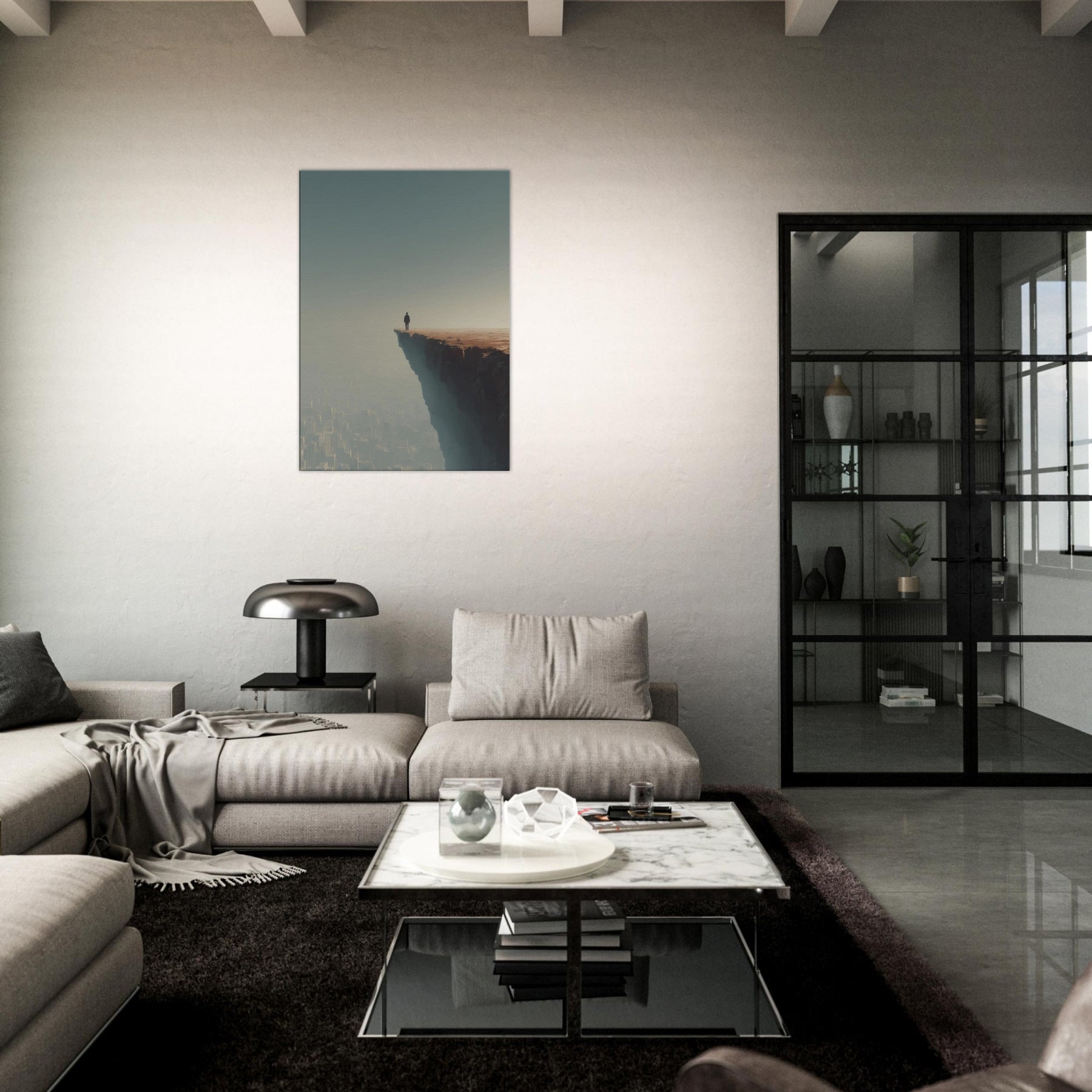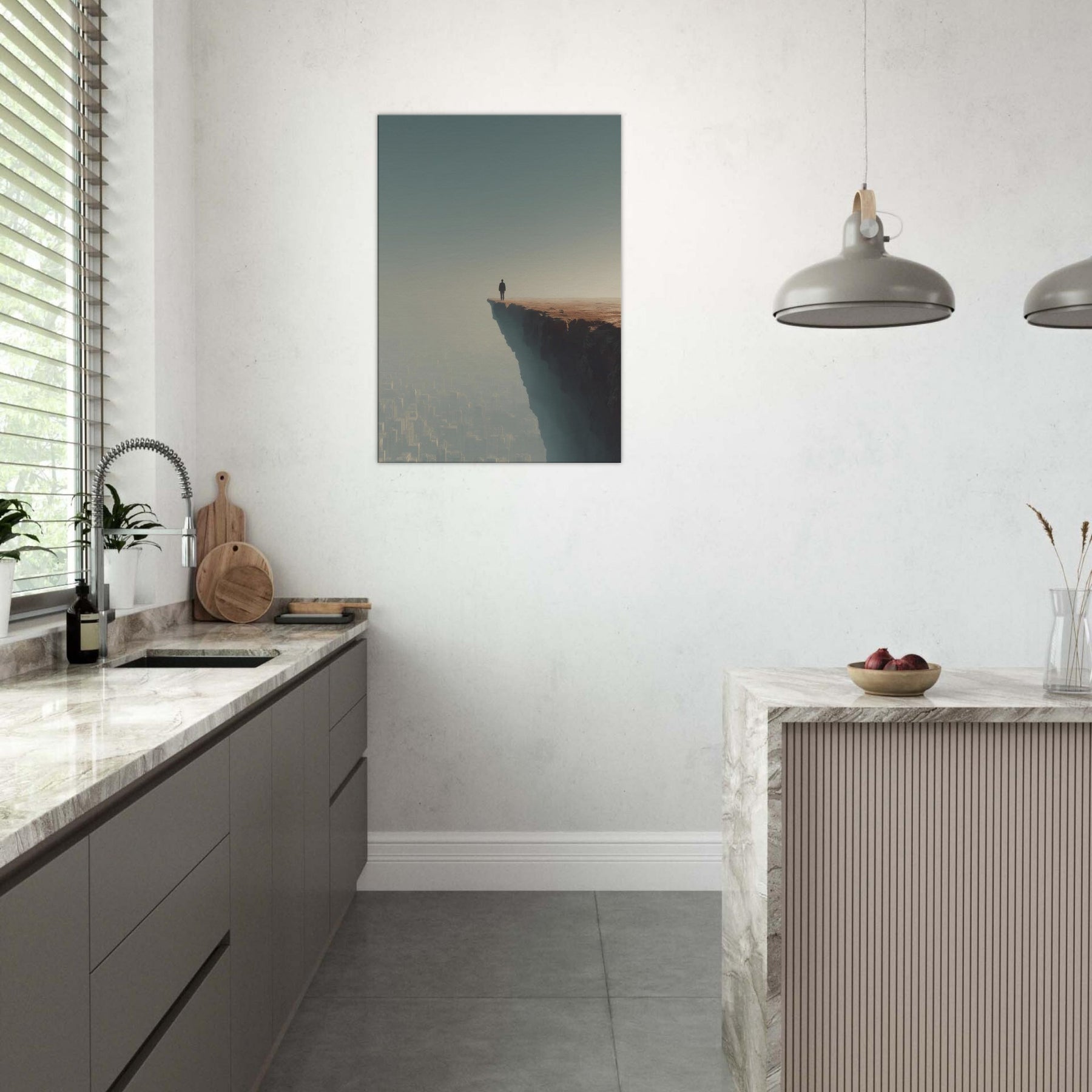 Let your space drift between dream and horizon with the Great Wall Silhouette in a surreal cityscape. A lone figure stands at the cliff's edge, surveying a sleeping metropolis veiled in fog and amber light. The image fuses ancient thresholds with modern geometry, creating a quiet tension between scale and serenity. Its breathable palette and ethereal atmosphere invite reflection, making it ideal for living rooms and bedrooms seeking atmosphere, conversation, and a sense of expansive possibility.