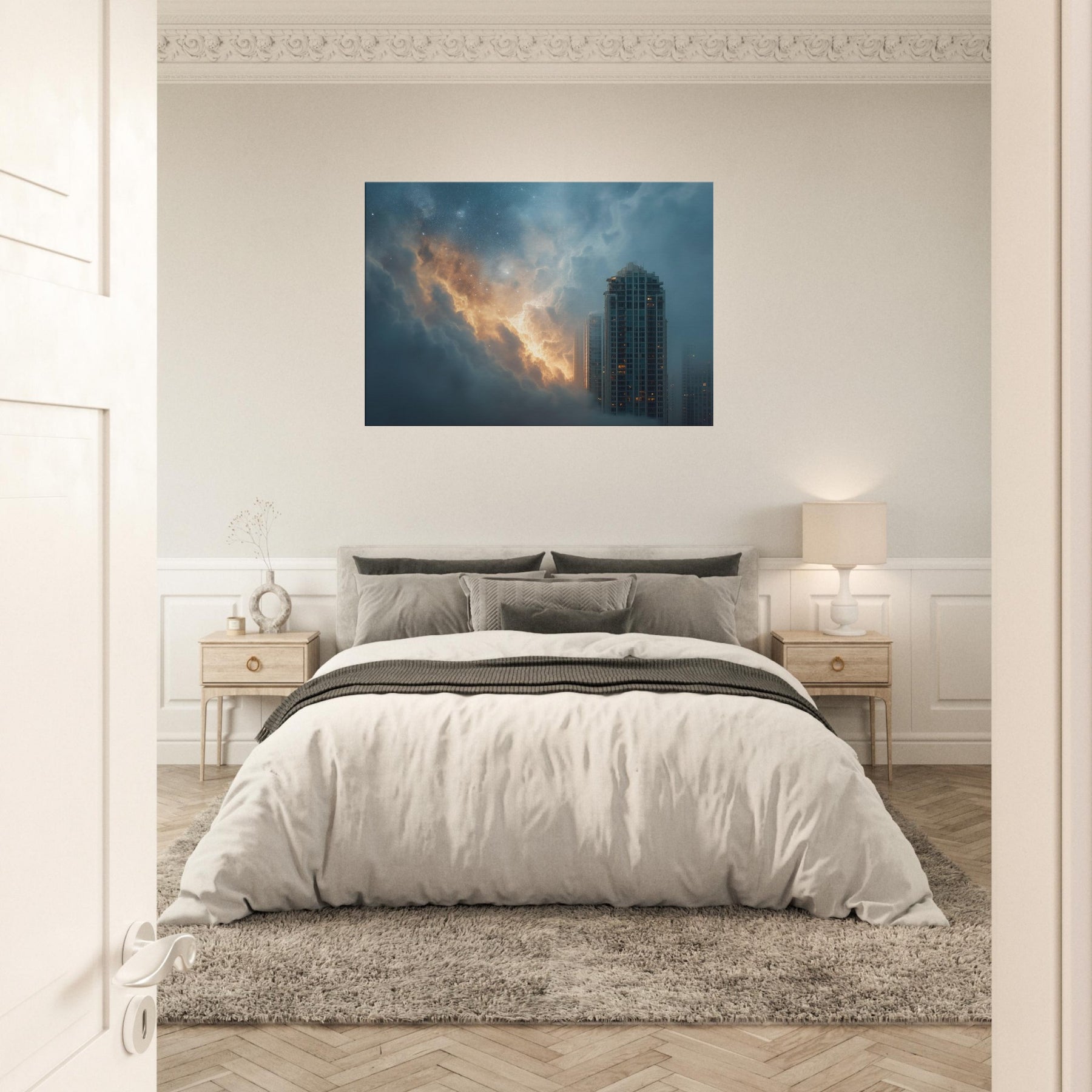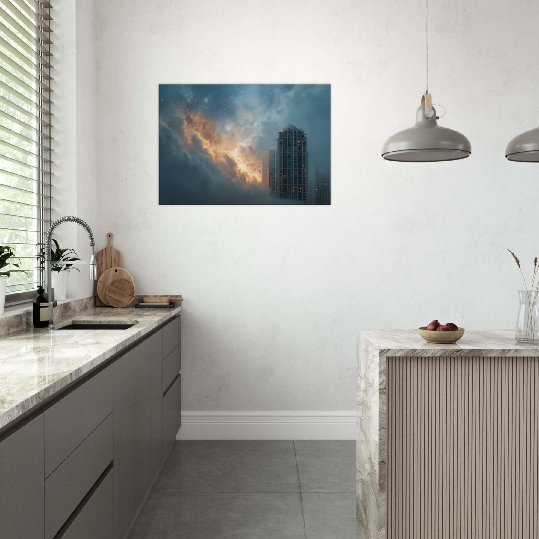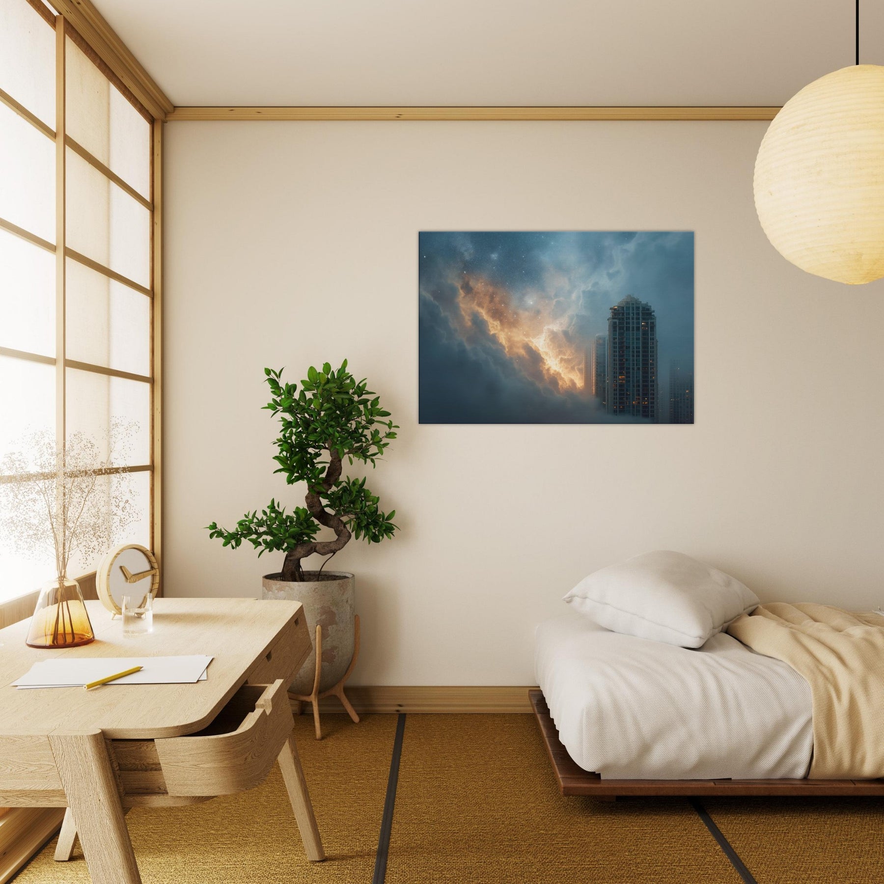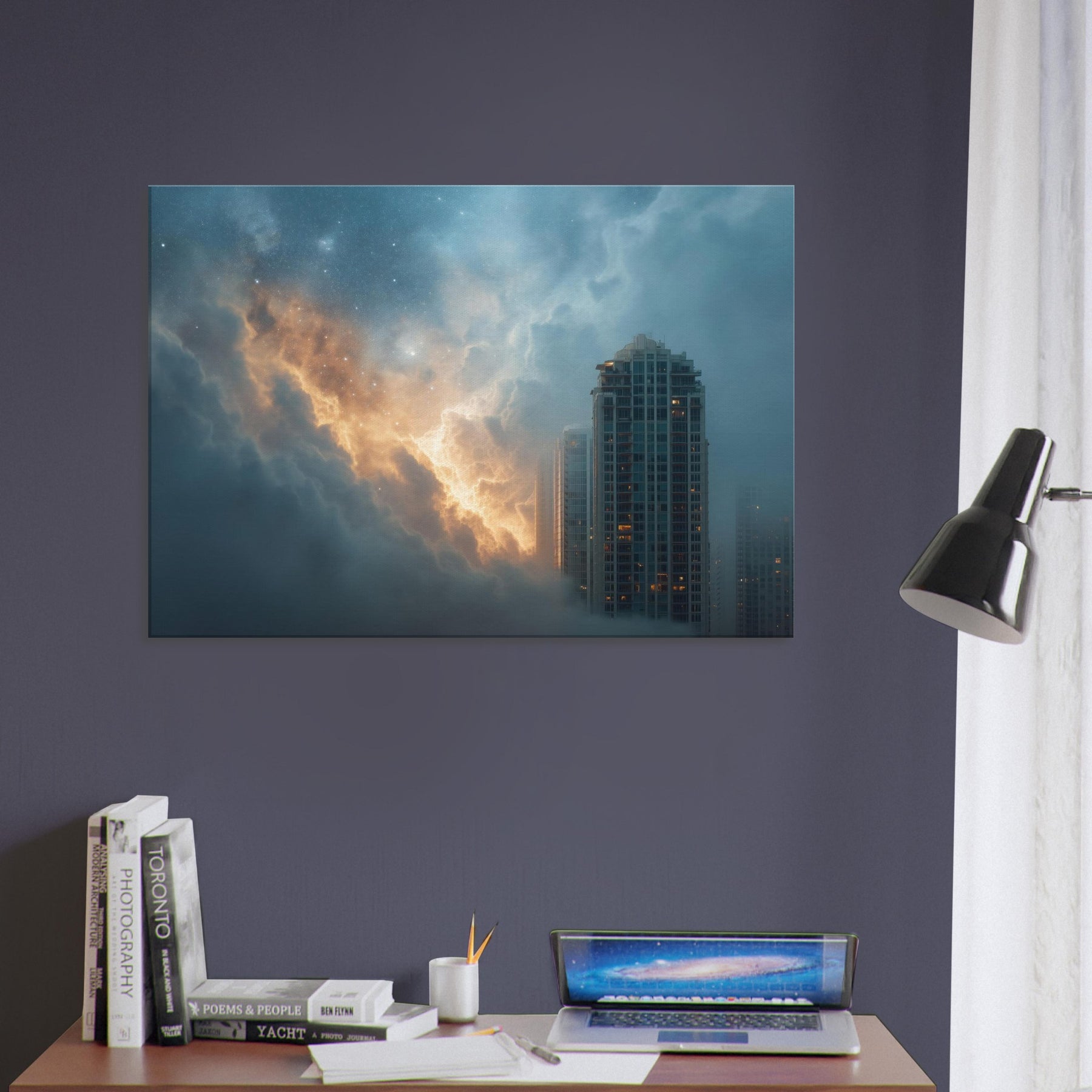 Seattle unfurls as a dream between thunder and neon, where towers lean into a swirling sky of copper light and velvet fog. This surreal composition folds the city into a luminous corridor of possibility; you can hear distant ferries, feel damp air on your skin, and taste rain on the tongue. The work invites quiet awe and conversation, a generous focal point that adds cinematic depth to any living space. Hang it where morning light meets evening glow for constant metamorphosis.