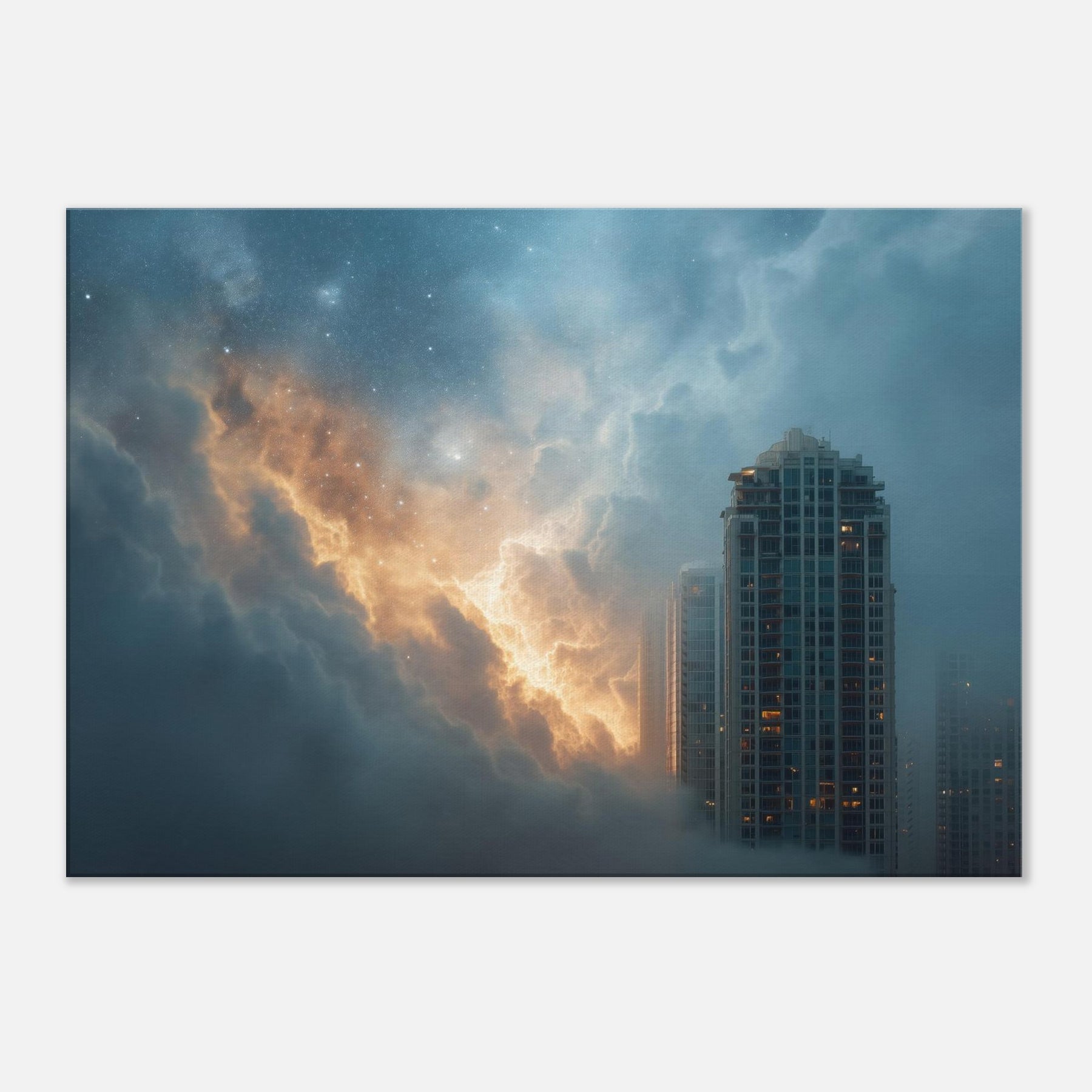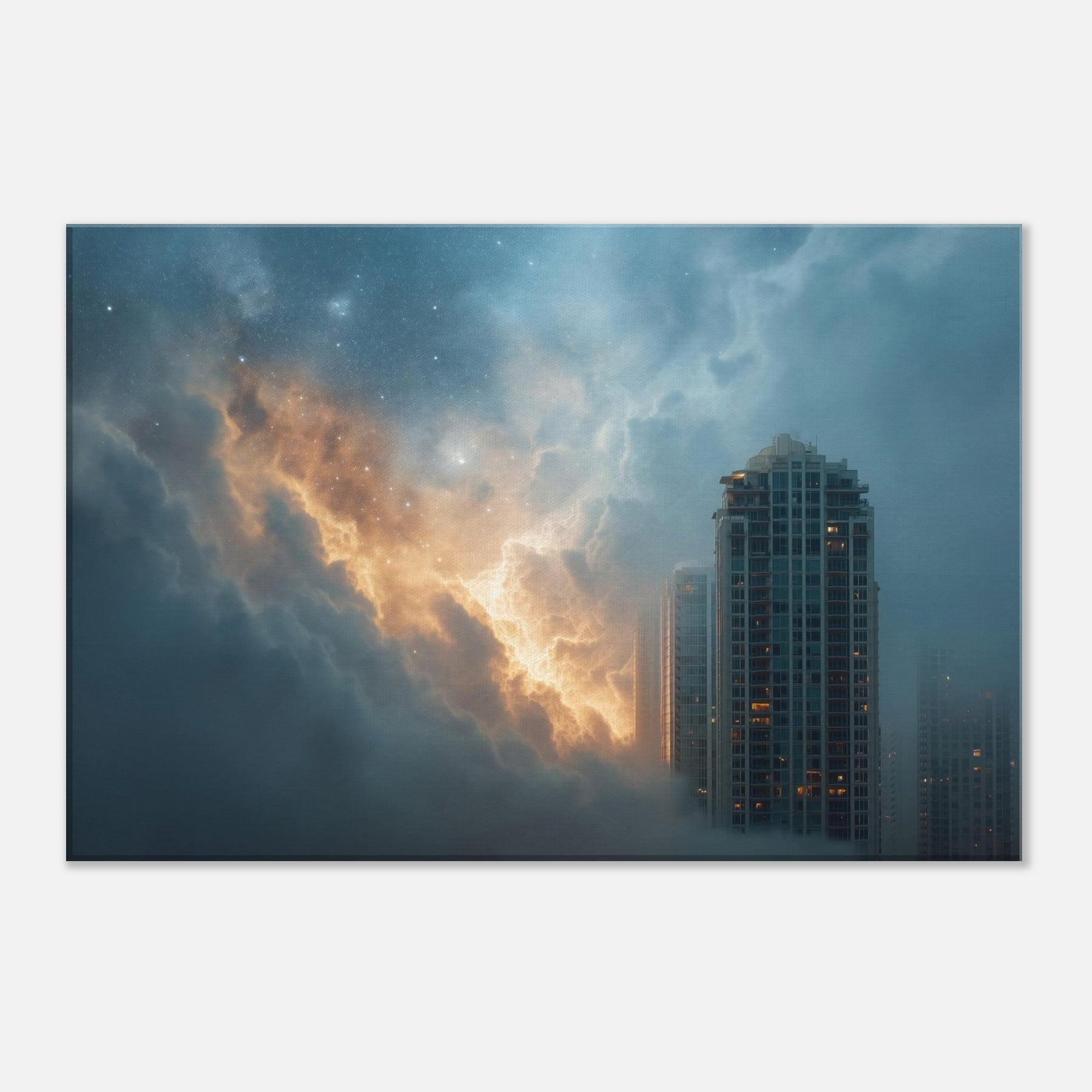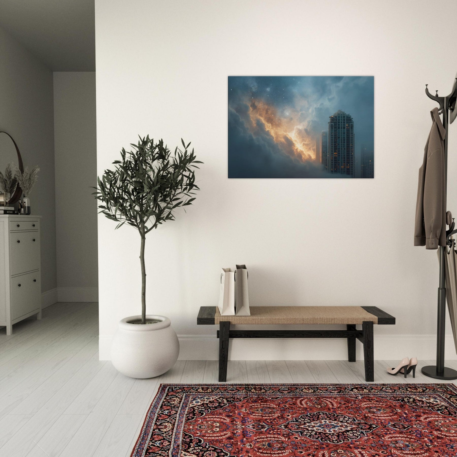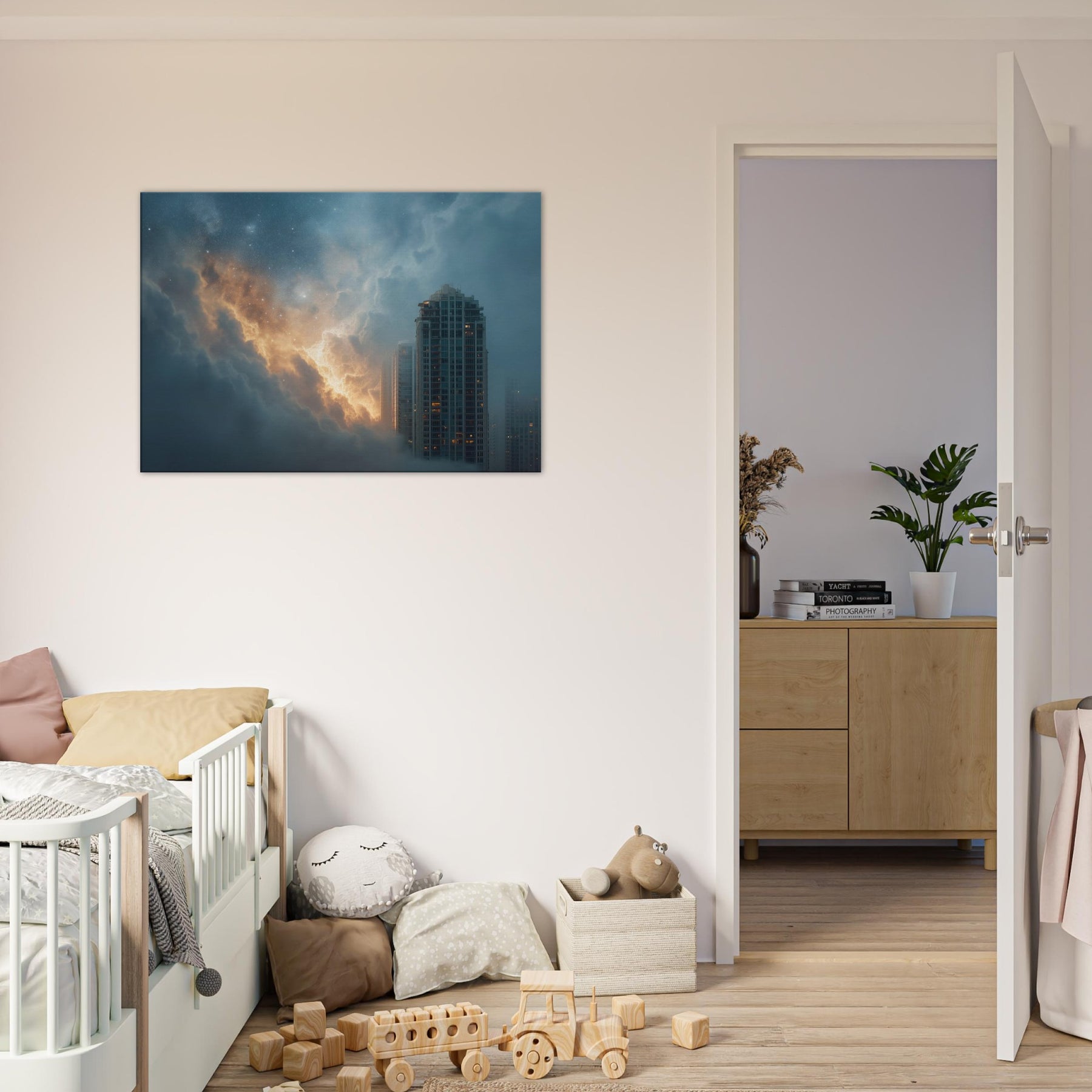 Seattle unfurls as a dream between thunder and neon, where towers lean into a swirling sky of copper light and velvet fog. This surreal composition folds the city into a luminous corridor of possibility; you can hear distant ferries, feel damp air on your skin, and taste rain on the tongue. The work invites quiet awe and conversation, a generous focal point that adds cinematic depth to any living space. Hang it where morning light meets evening glow for constant metamorphosis.