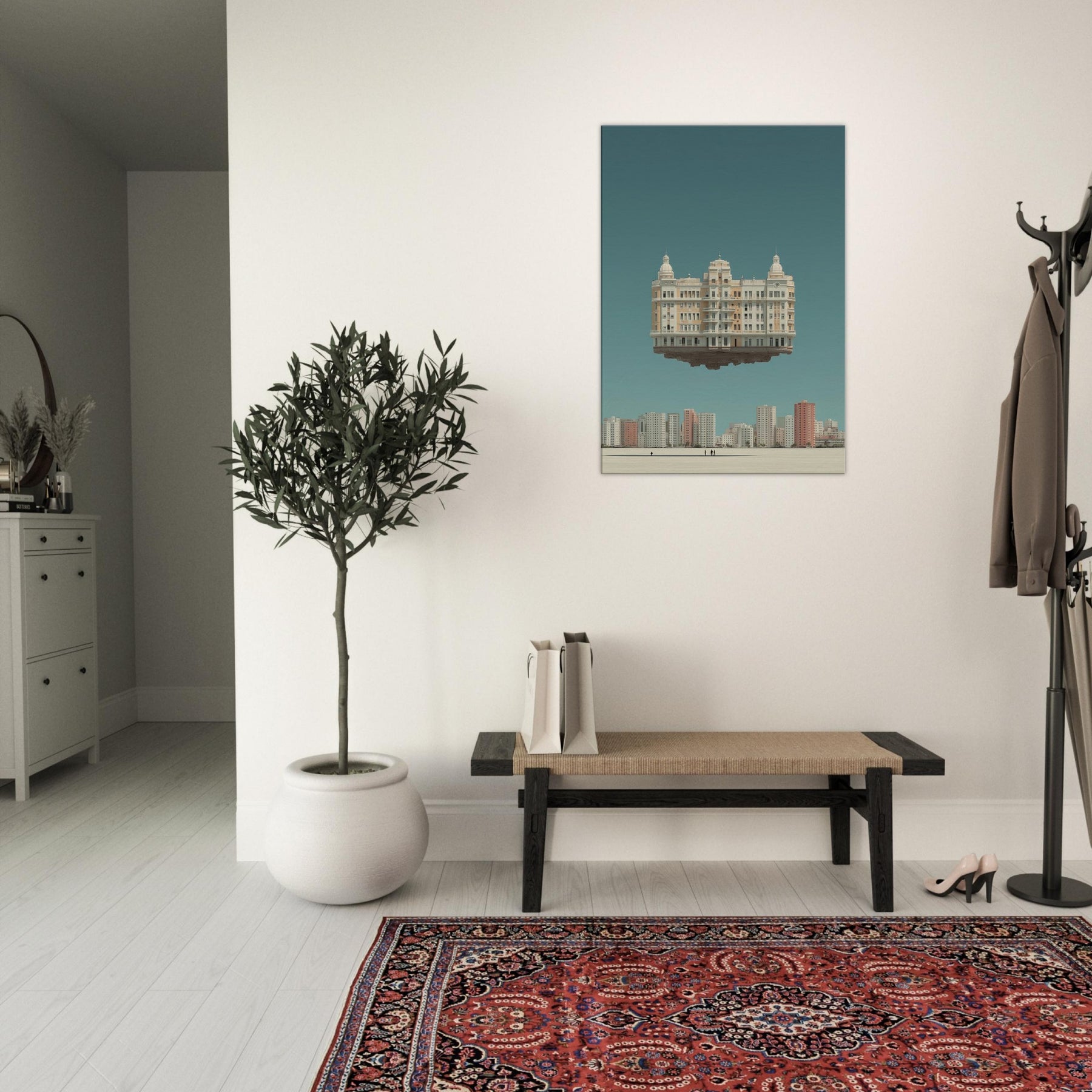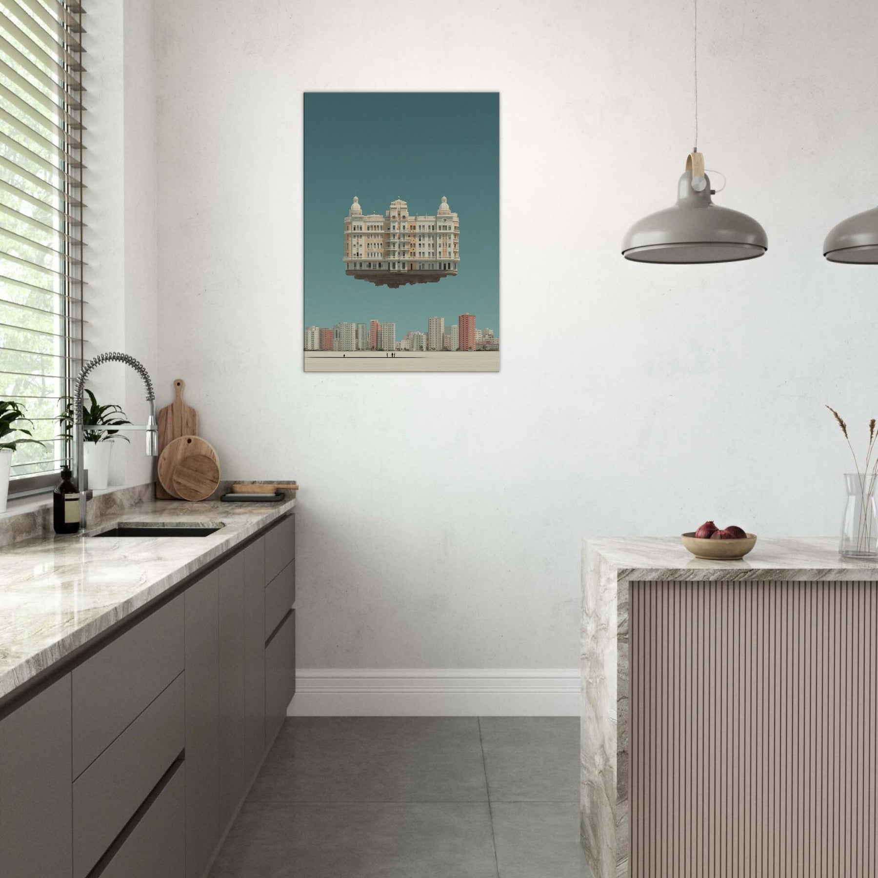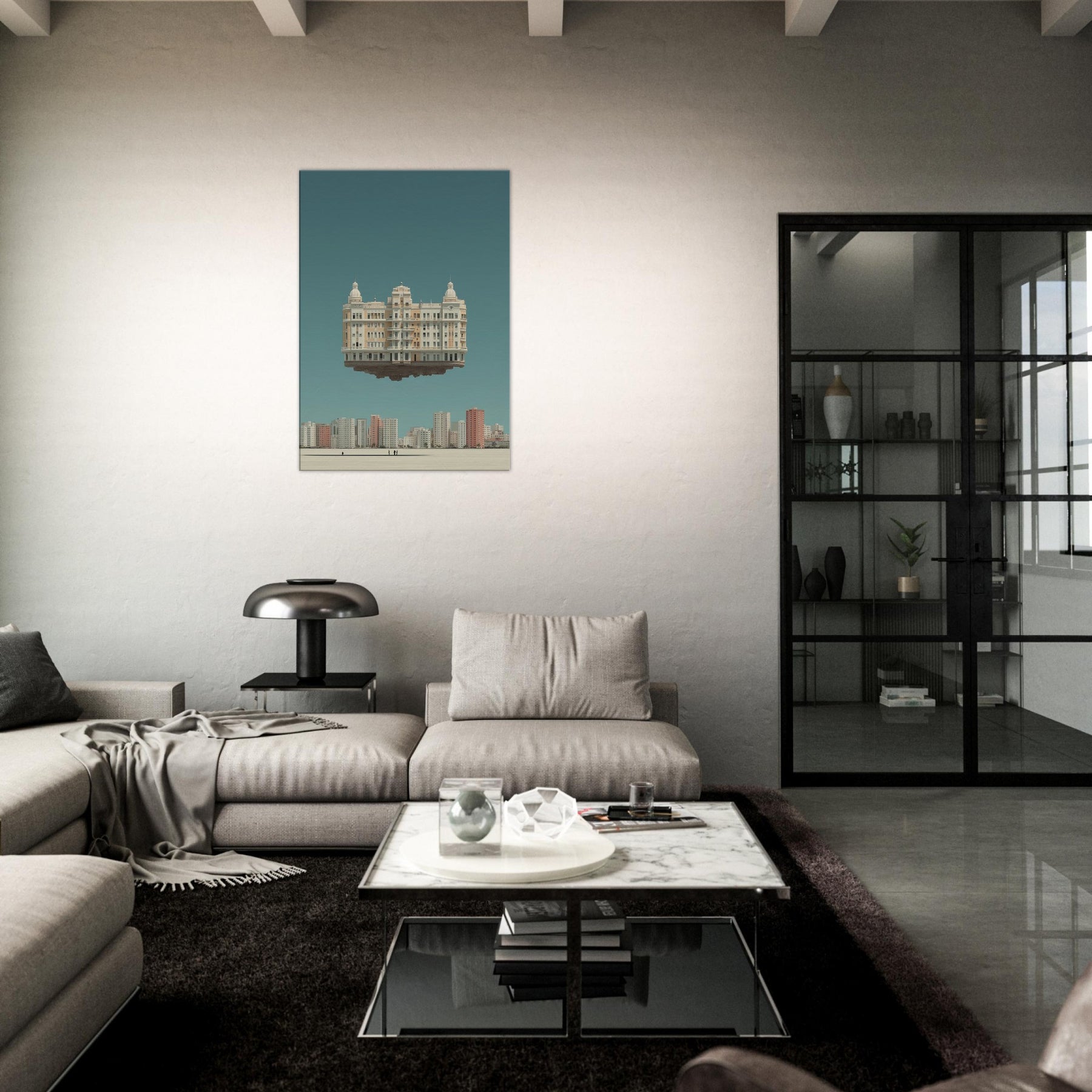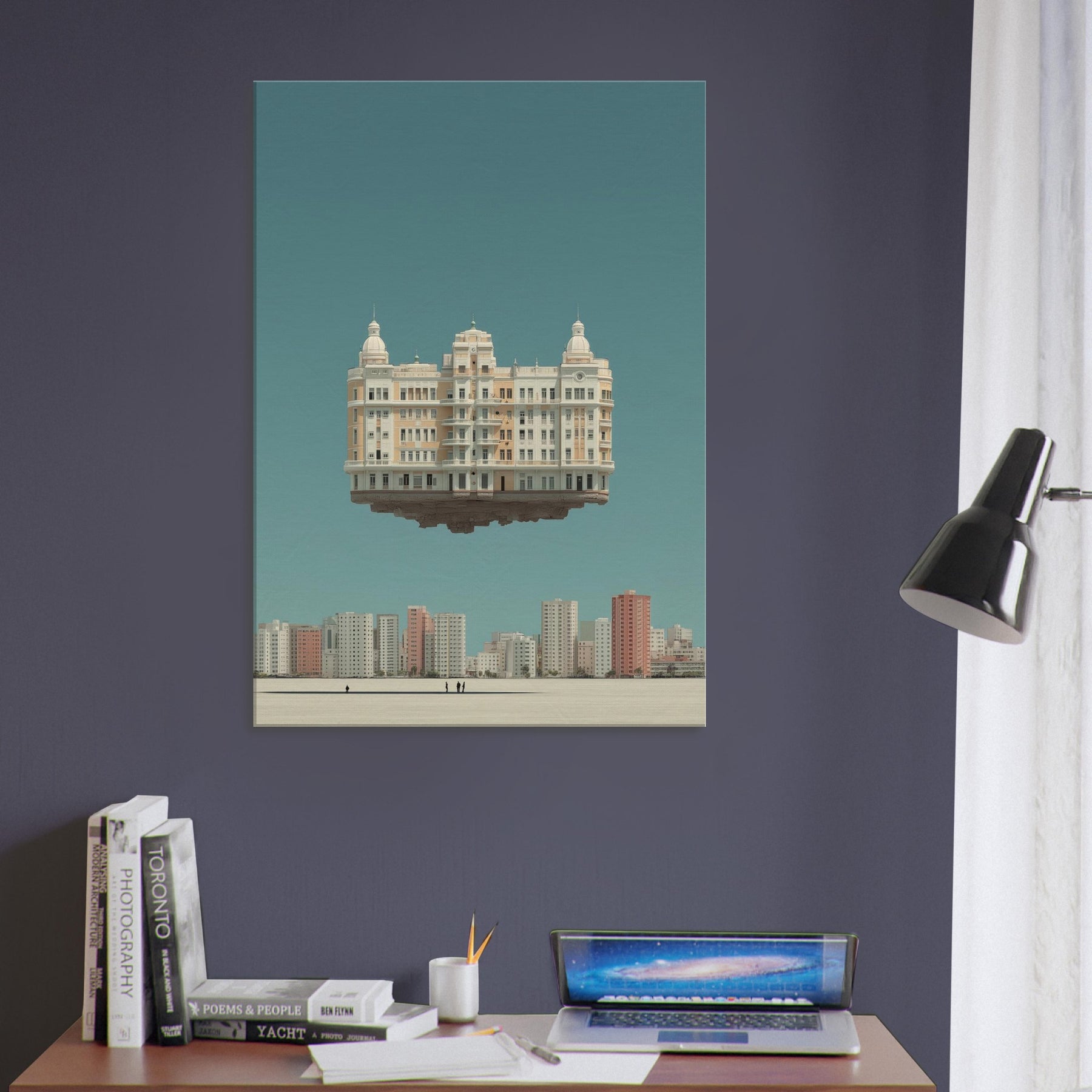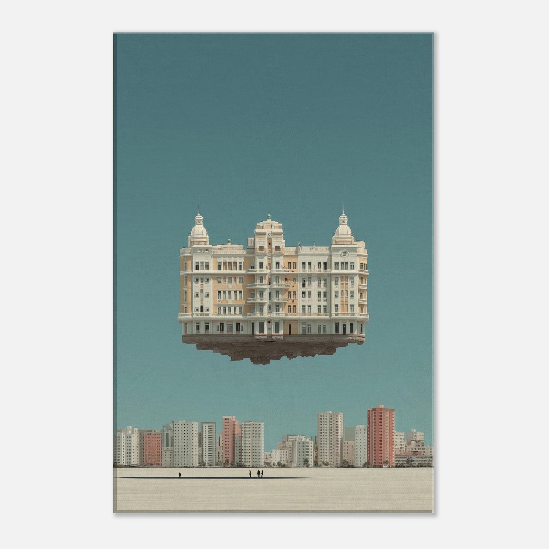 Mexico City unfolds in a dreamlike skyline, where a grand, ornamented building hovers above the horizon. This surreal composition folds time and place into a single, breathless moment, inviting contemplation of memory and movement. The soft, sunlit tones, pale creams, and copper accents glow against a tranquil teal sky, turning your living room into a quiet theater of imagination. A statement piece that blends architectural detail with wonder, it lends space to linger, reflect, and dream while interiors stay grounded.