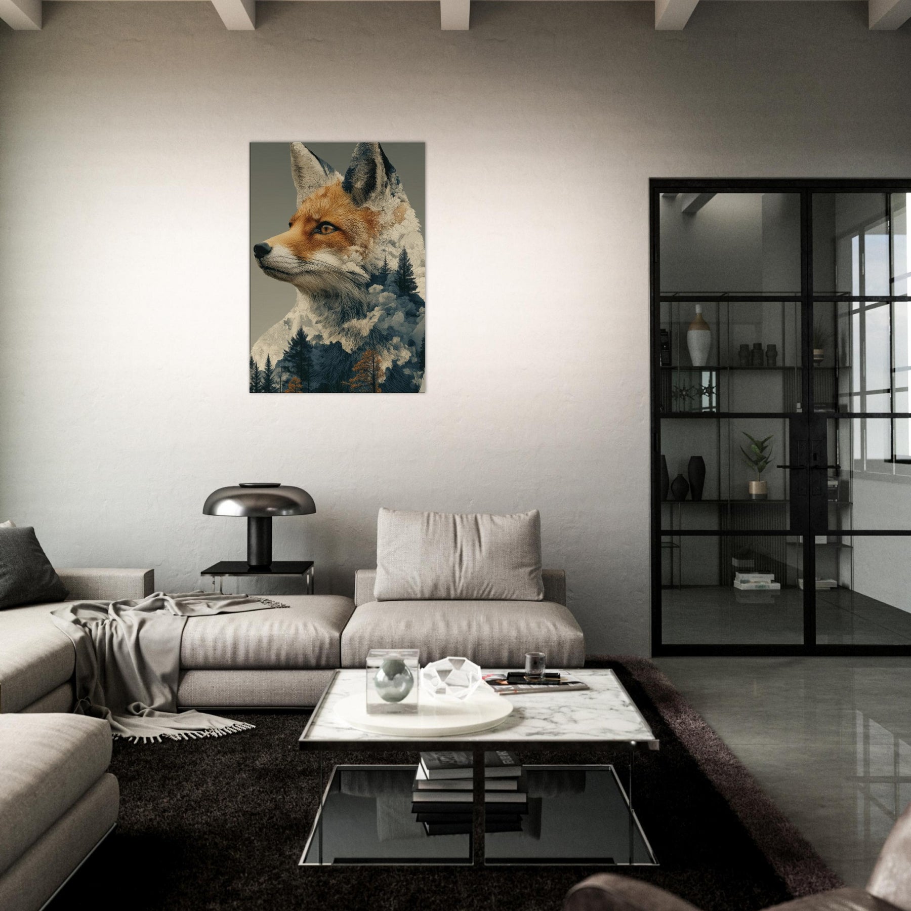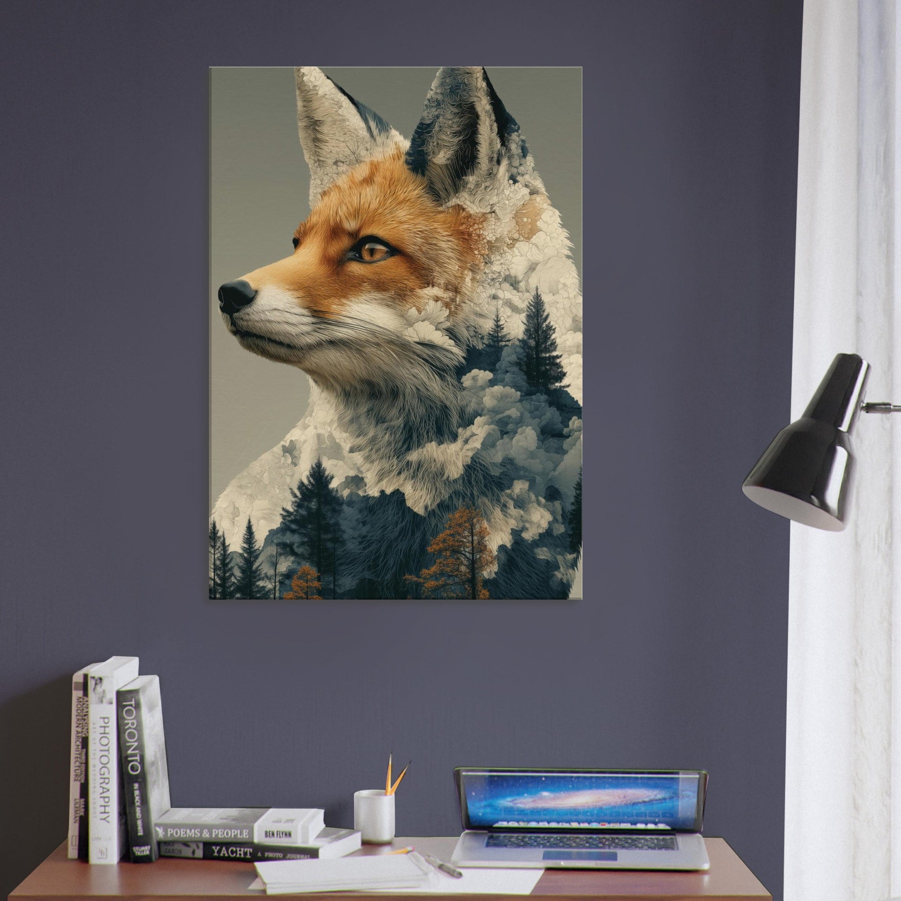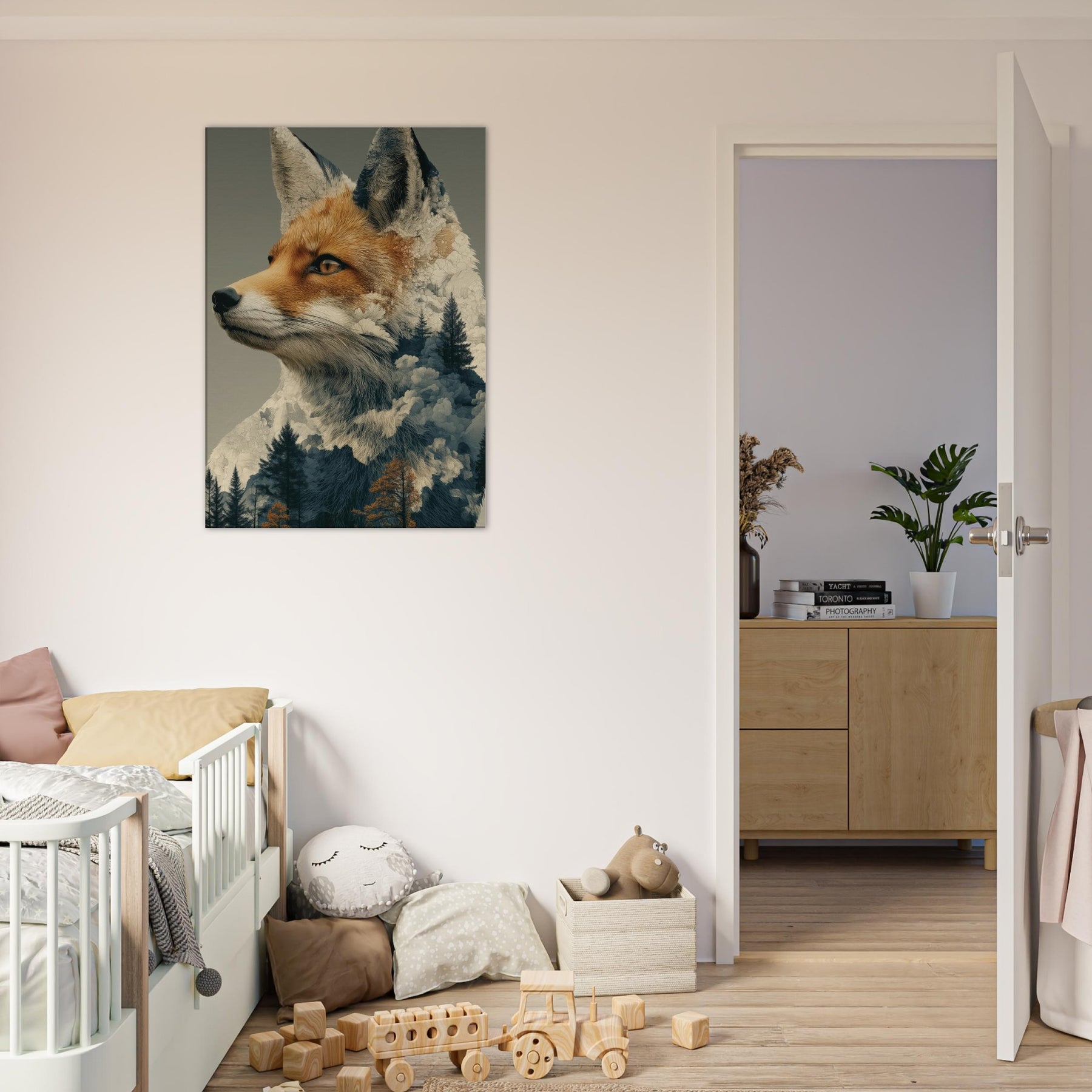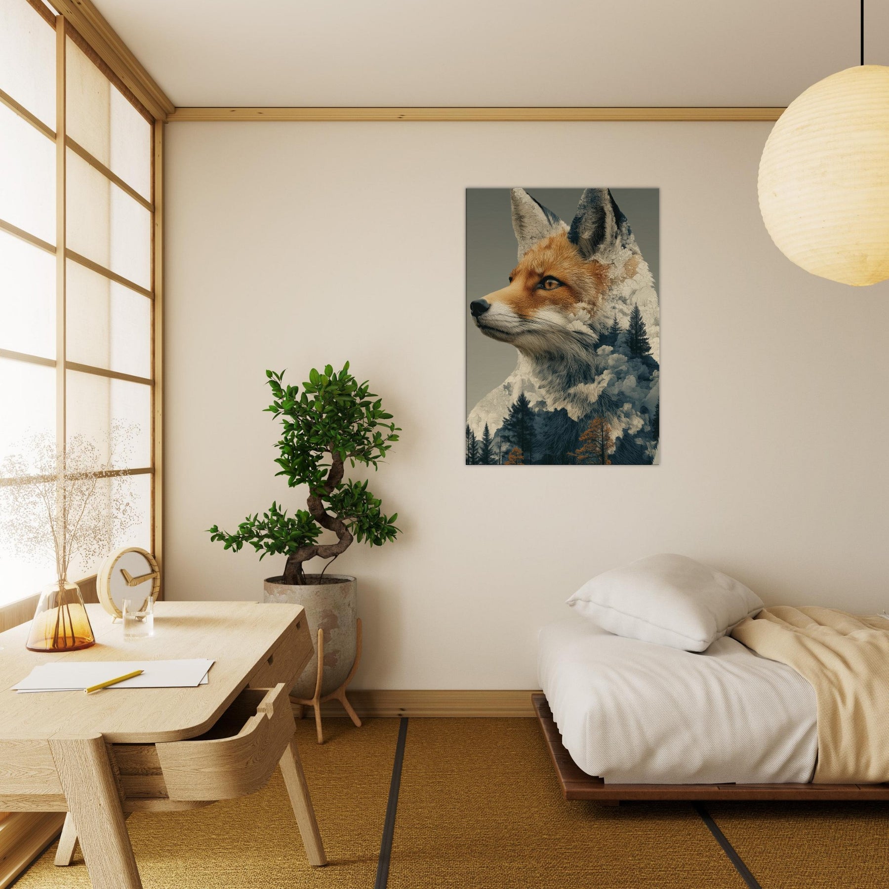 Fox Between Moon and Meadow captures a poised fox whose amber gaze threads the room with quiet resolve. Wrapped in a billowing veil of clouds and evergreen silhouettes, the creature becomes both guardian and guide, inviting contemplation as twilight settles in. The surreal breathes with tactile texture a smoky mist on warm fur, frost blue pines, and a hush of color that shifts with light. Hang this in a living space to soften corners, spark imagination, and fold a forest of memory into everyday life.