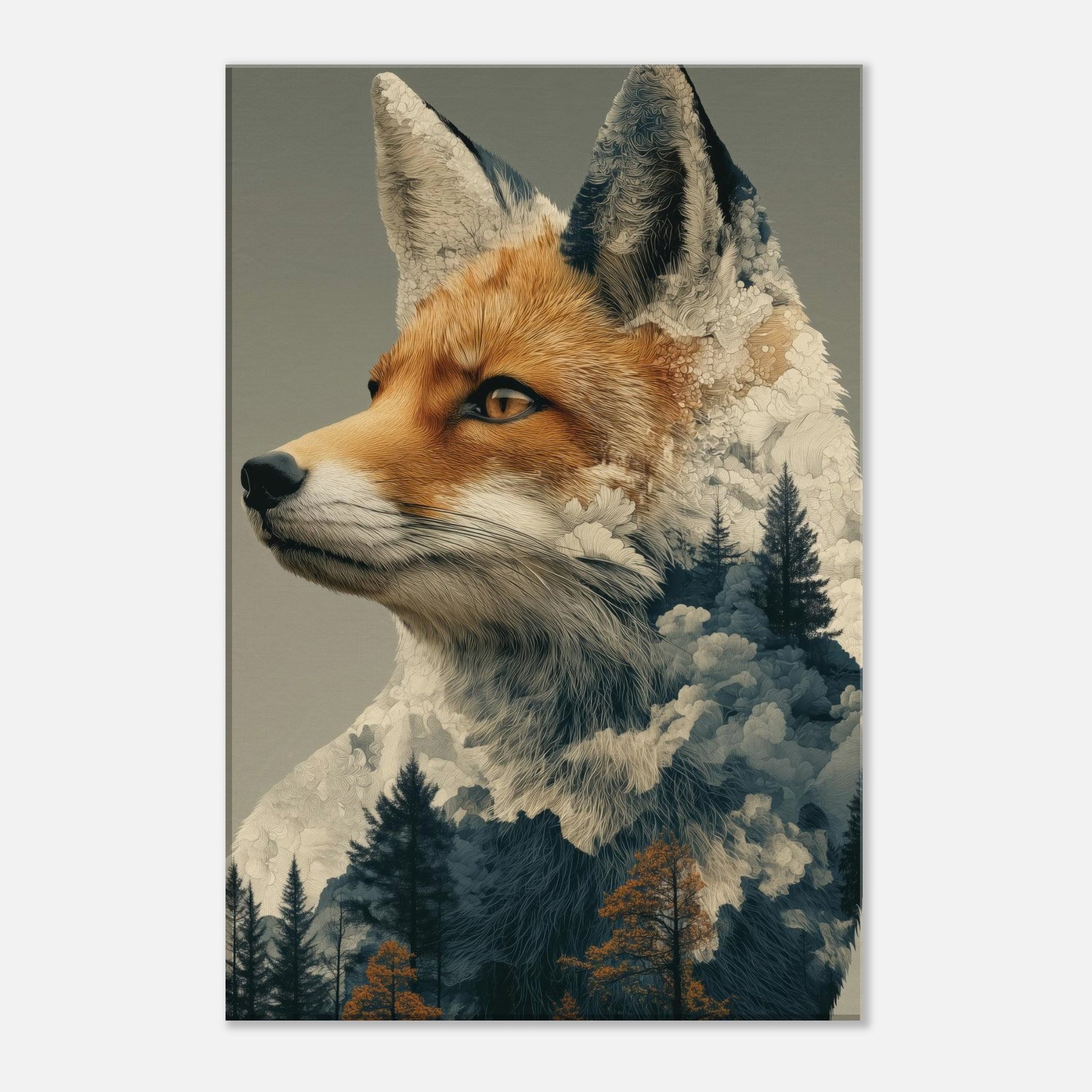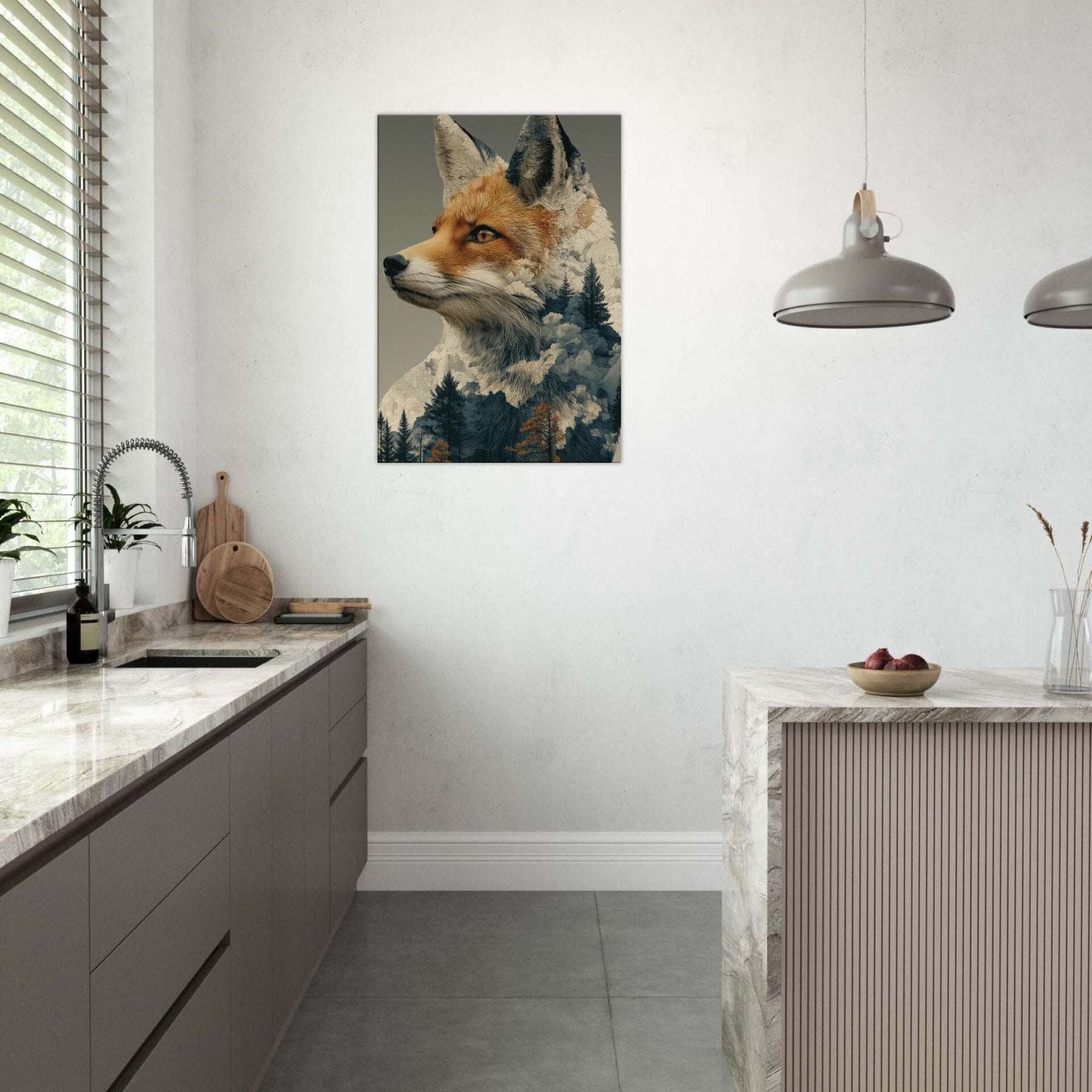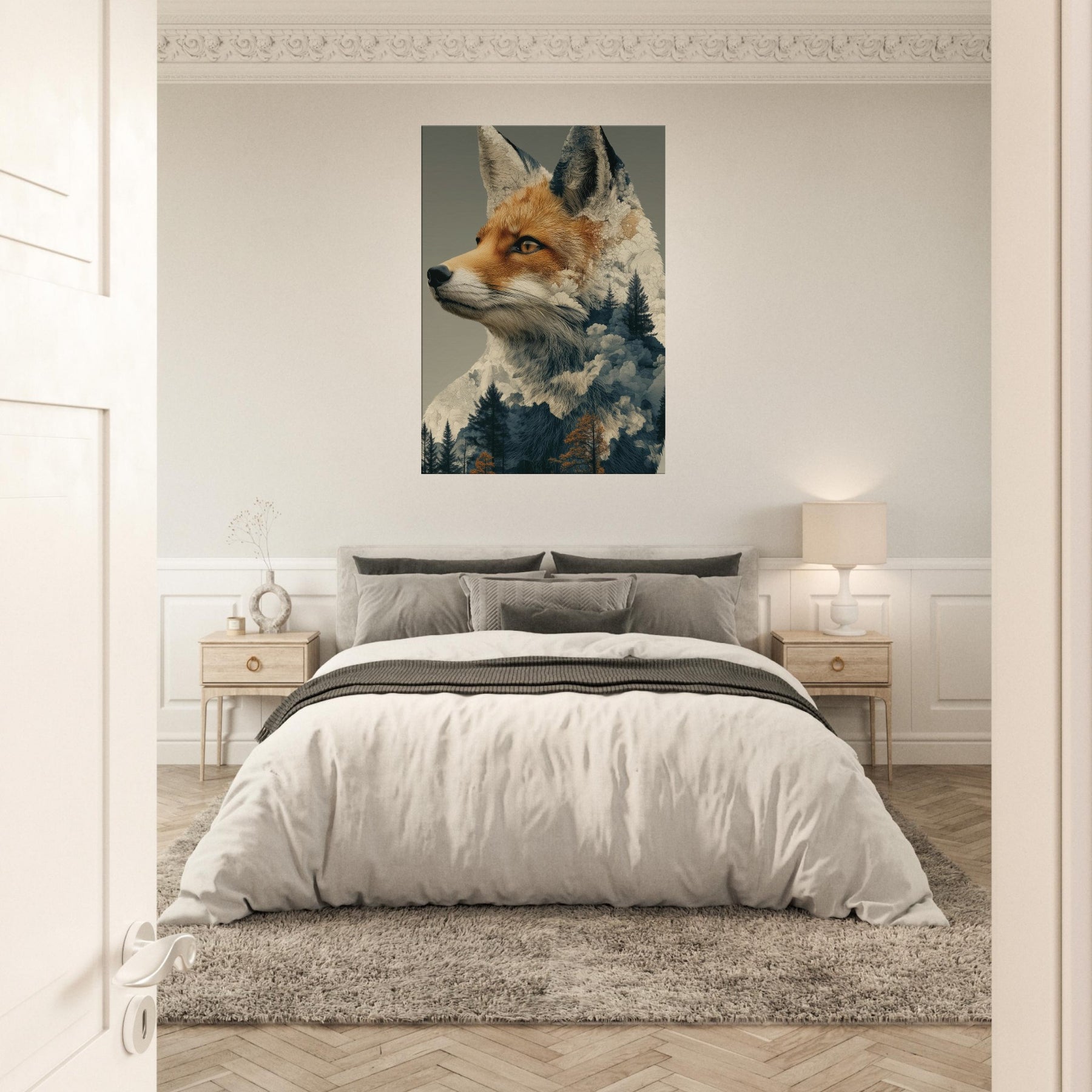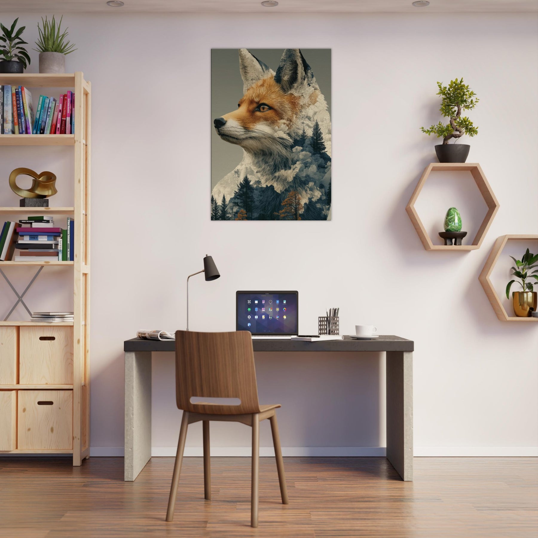 Fox Between Moon and Meadow captures a poised fox whose amber gaze threads the room with quiet resolve. Wrapped in a billowing veil of clouds and evergreen silhouettes, the creature becomes both guardian and guide, inviting contemplation as twilight settles in. The surreal breathes with tactile texture a smoky mist on warm fur, frost blue pines, and a hush of color that shifts with light. Hang this in a living space to soften corners, spark imagination, and fold a forest of memory into everyday life.