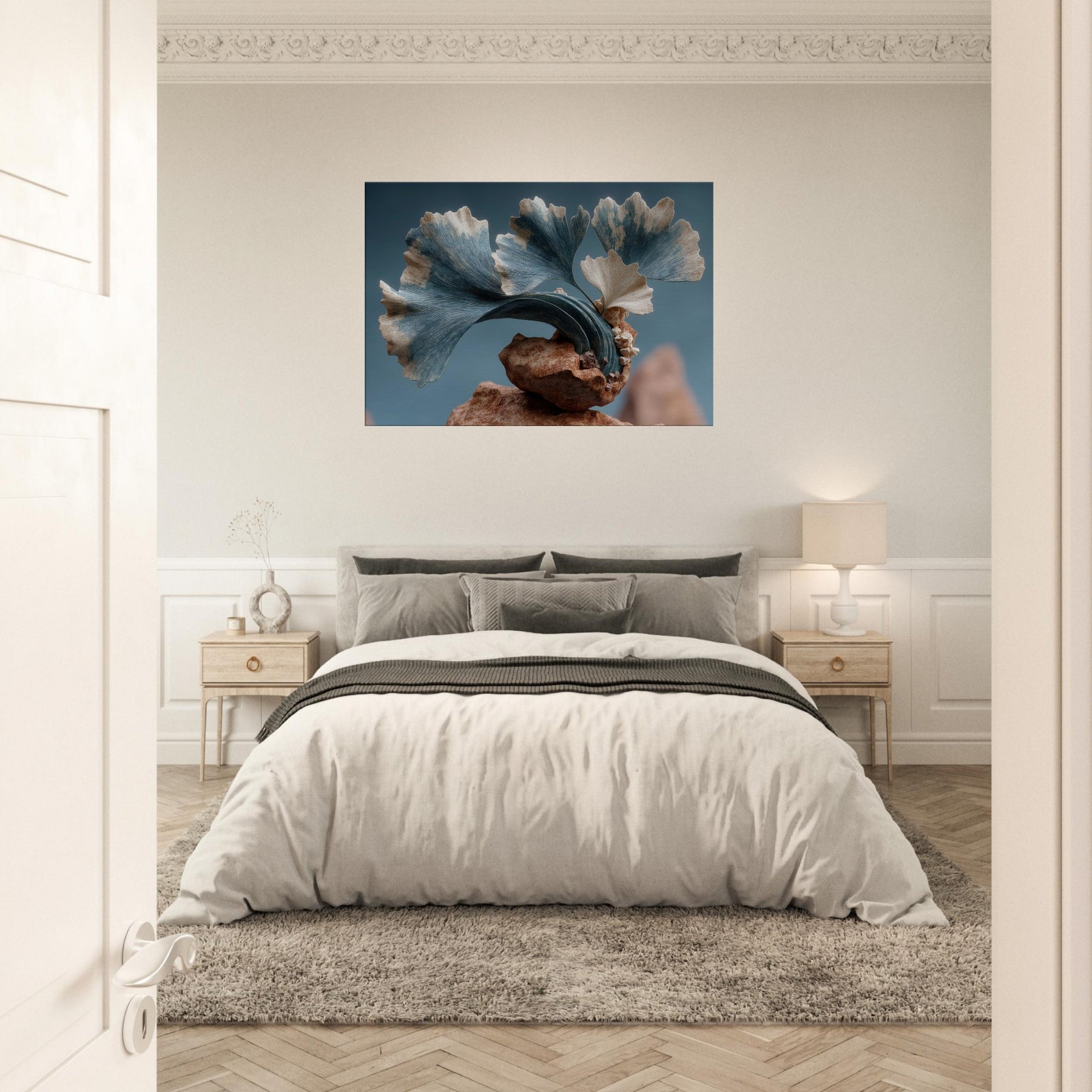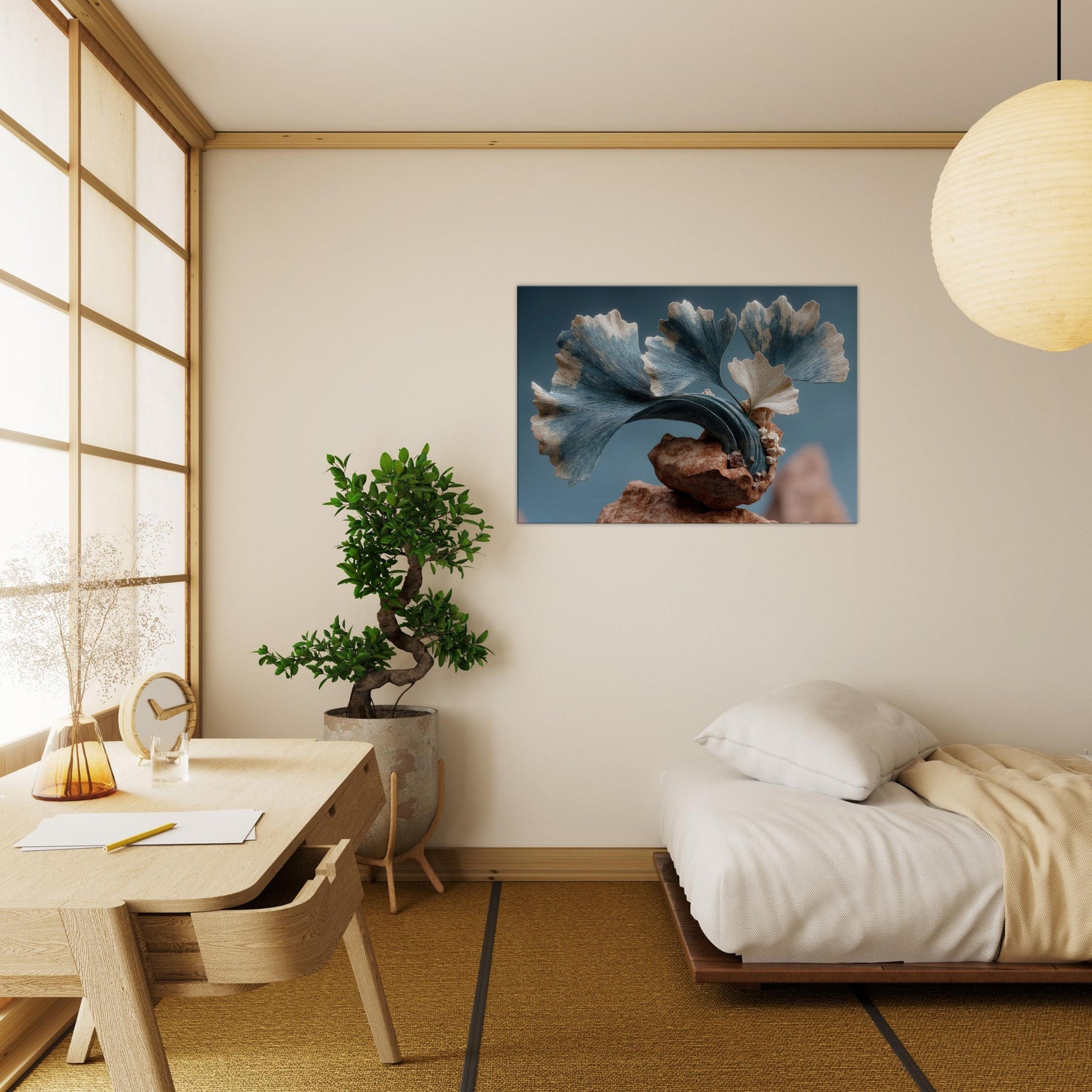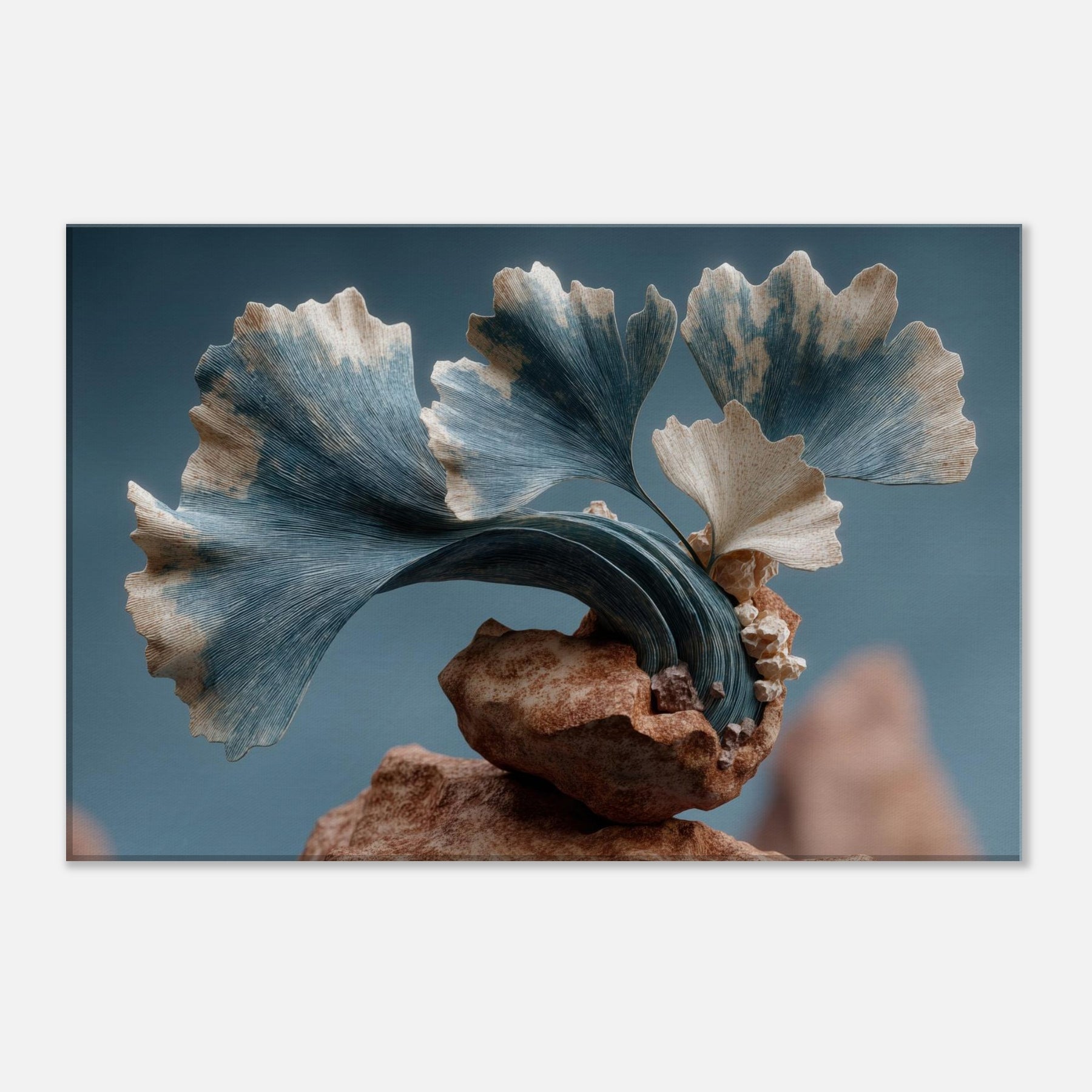 Let the Ginkgo Leaf drift through your room as a doorway to dream logic. This surreal composition threads delicate foliage into a kinetic sculpture of stone and air, where pale blues meet warm ochres and the rind of time peels back. The texture of each leaf feels tactile, the curves echoing a distant sea. In a living space, it invites quiet focus, turning walls into a studio of memory and wonder, a calm anchor for everyday moments.