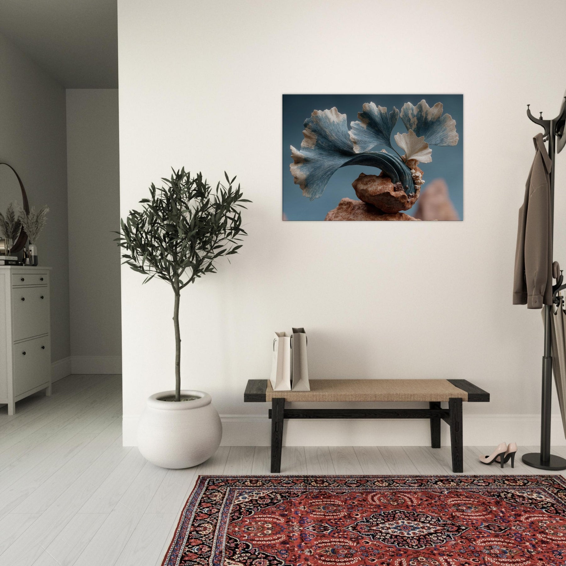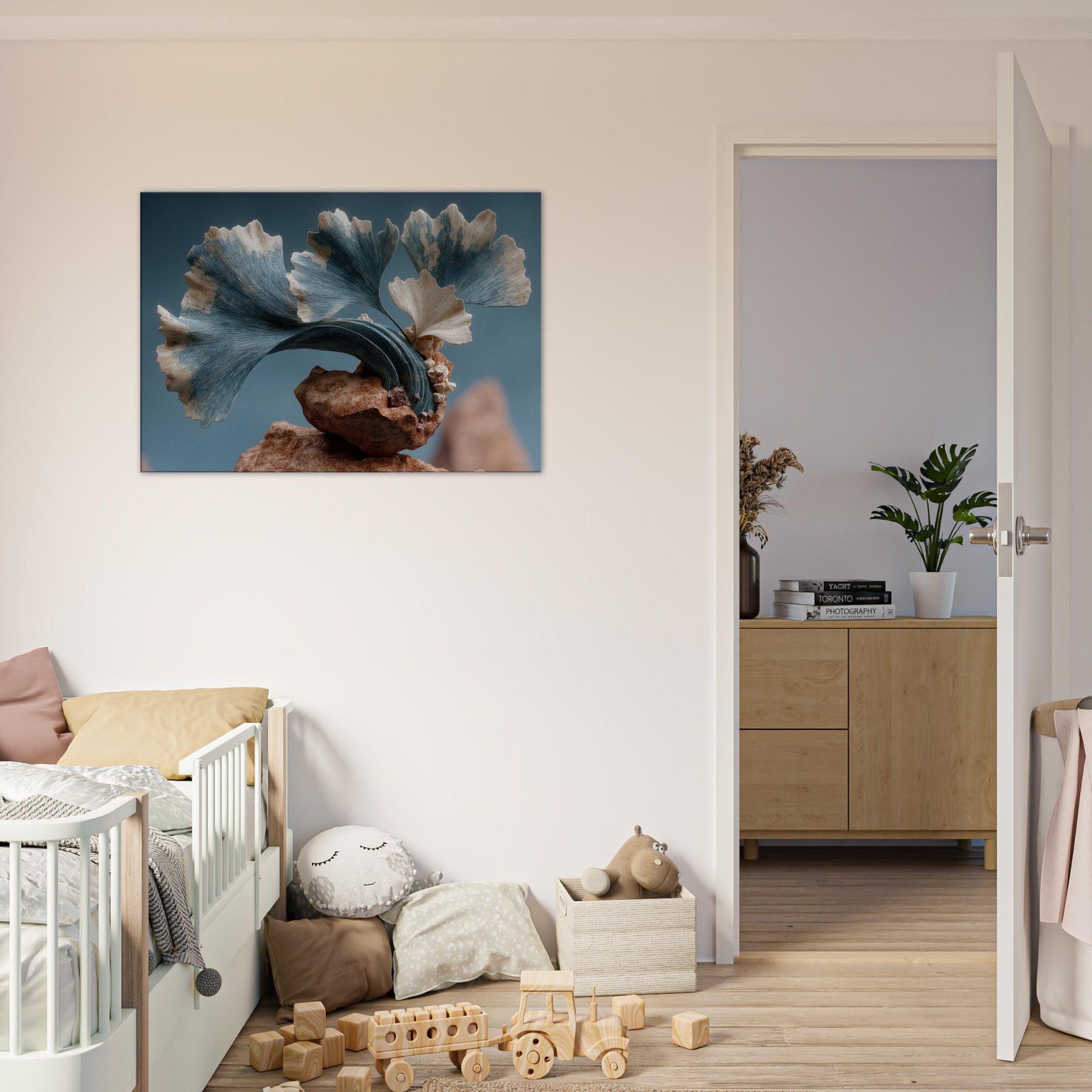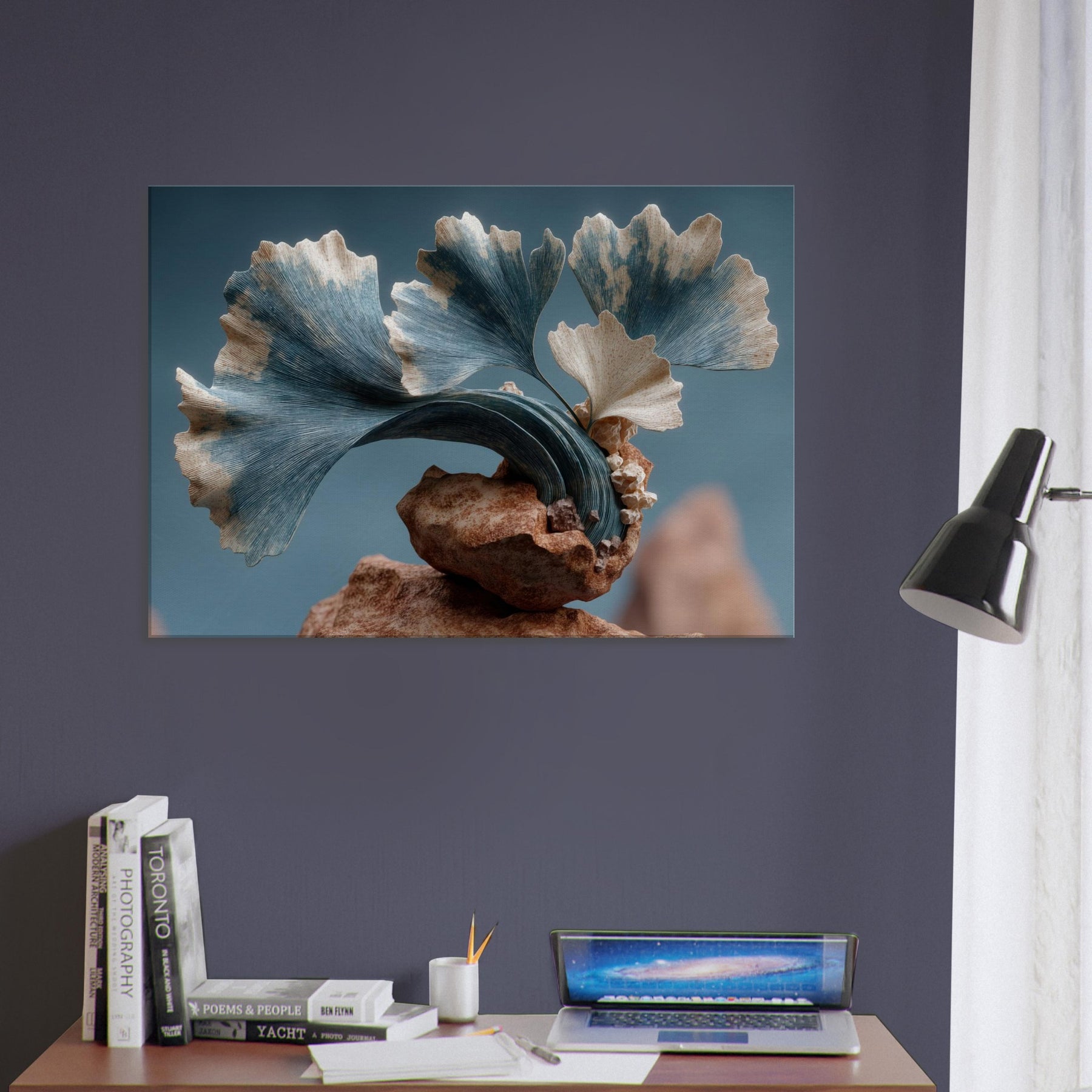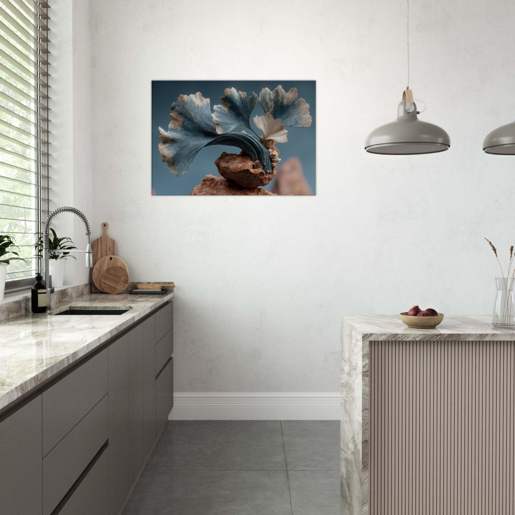 Let the Ginkgo Leaf drift through your room as a doorway to dream logic. This surreal composition threads delicate foliage into a kinetic sculpture of stone and air, where pale blues meet warm ochres and the rind of time peels back. The texture of each leaf feels tactile, the curves echoing a distant sea. In a living space, it invites quiet focus, turning walls into a studio of memory and wonder, a calm anchor for everyday moments.