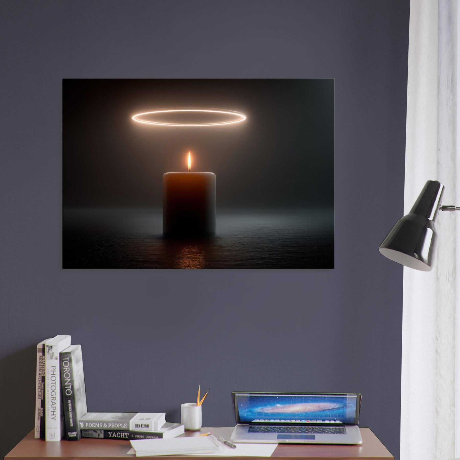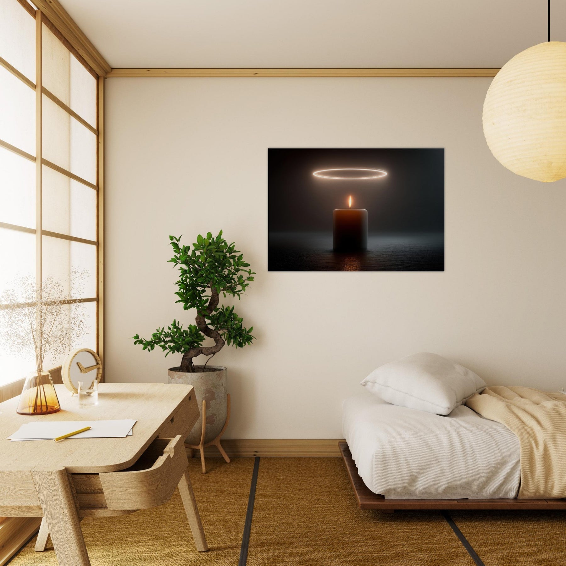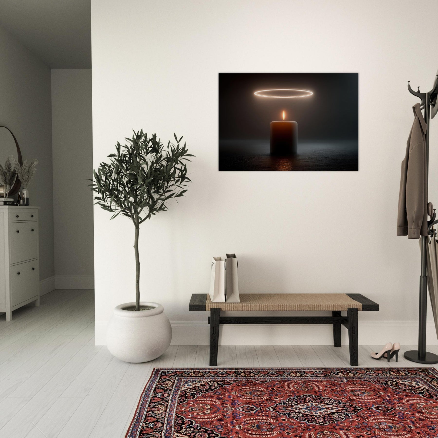 Through Surrealist poise, the Candle with Halo floats above a humble wick, casting a halo like glow that breathes warmth into a room. The soft gradient of shadow and light channels quiet contemplation, turning margins into a stage for reflection. This artwork invites candlelit evenings, minimal drama, and a hush of reverence in a living room or study. Crafted with smooth surfaces and a luminous ring, it elevates everyday rituals into a moment of still wonder.