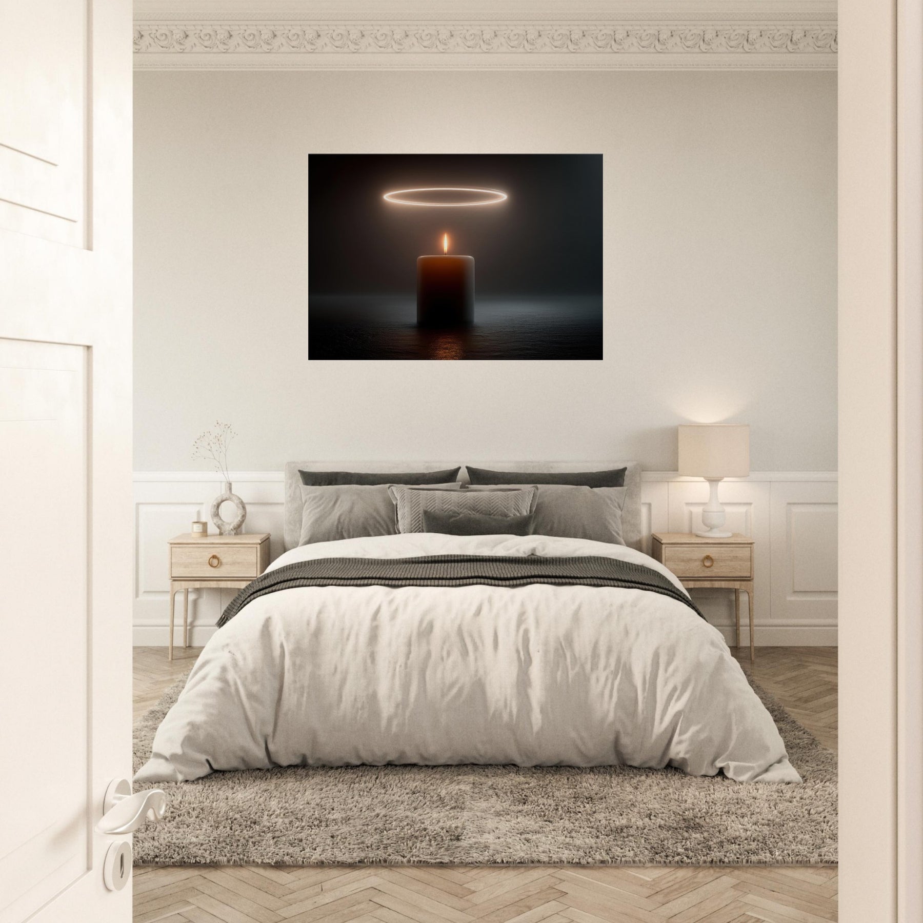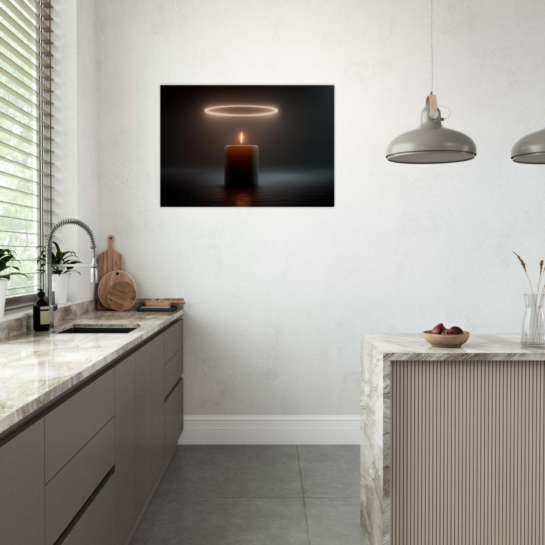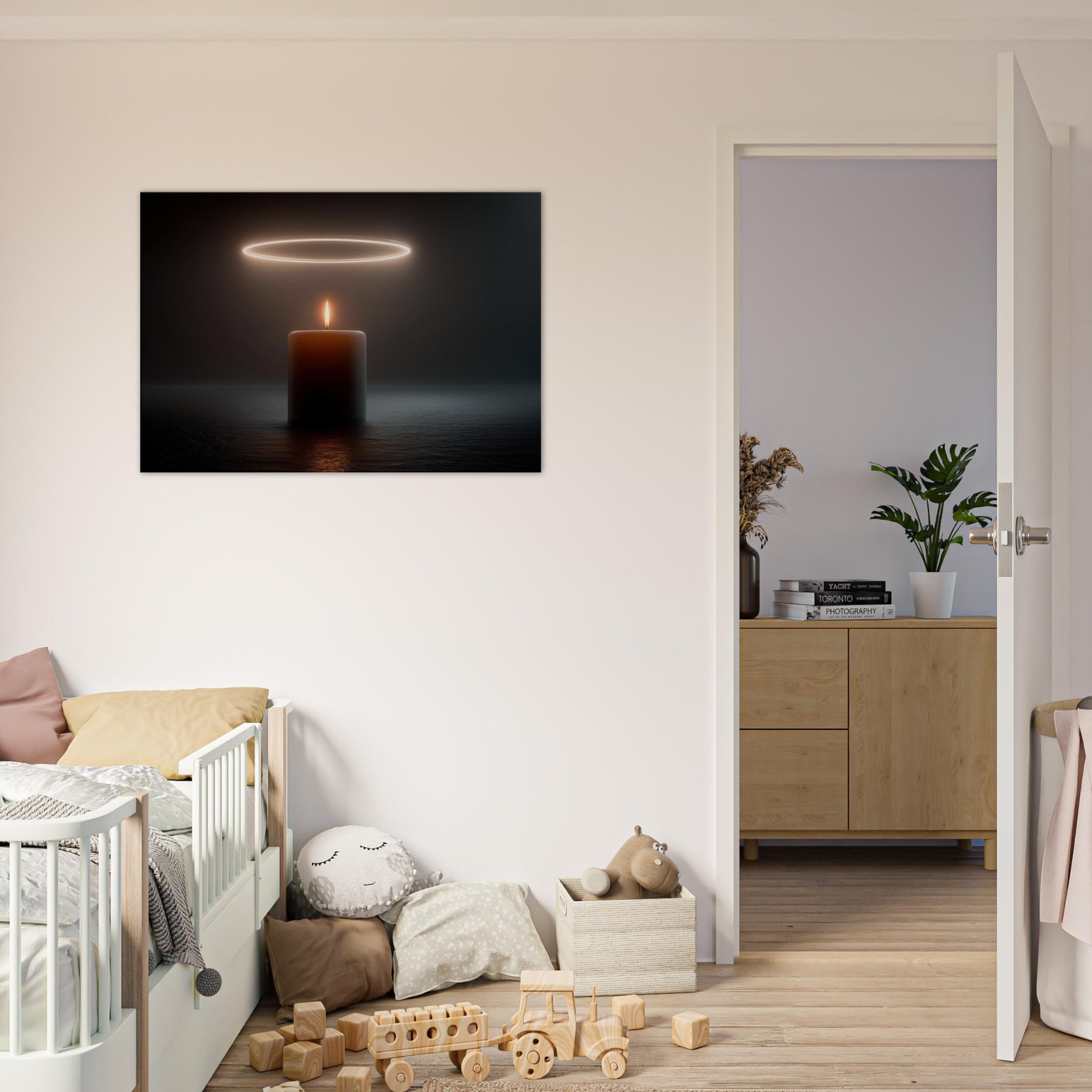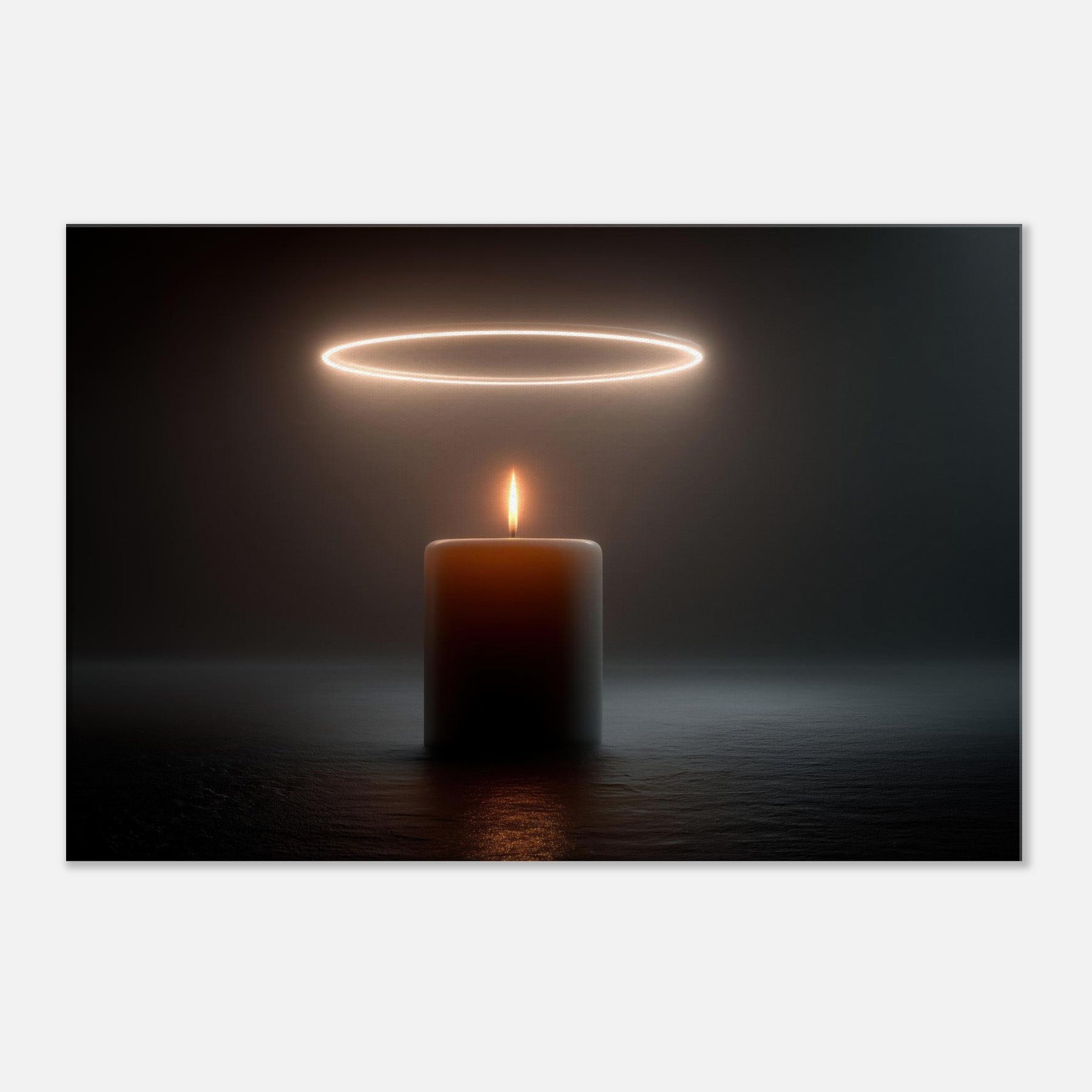 Through Surrealist poise, the Candle with Halo floats above a humble wick, casting a halo like glow that breathes warmth into a room. The soft gradient of shadow and light channels quiet contemplation, turning margins into a stage for reflection. This artwork invites candlelit evenings, minimal drama, and a hush of reverence in a living room or study. Crafted with smooth surfaces and a luminous ring, it elevates everyday rituals into a moment of still wonder.