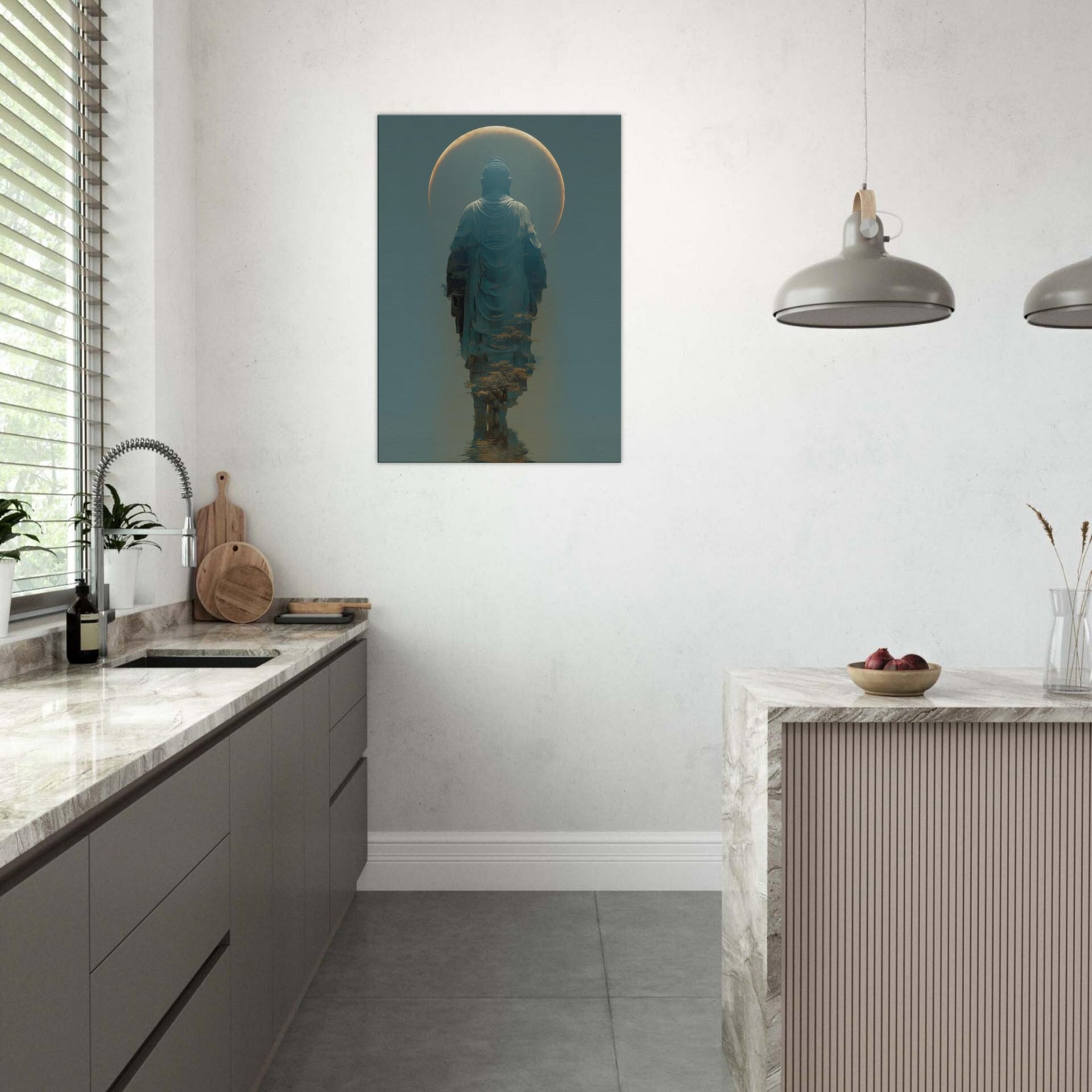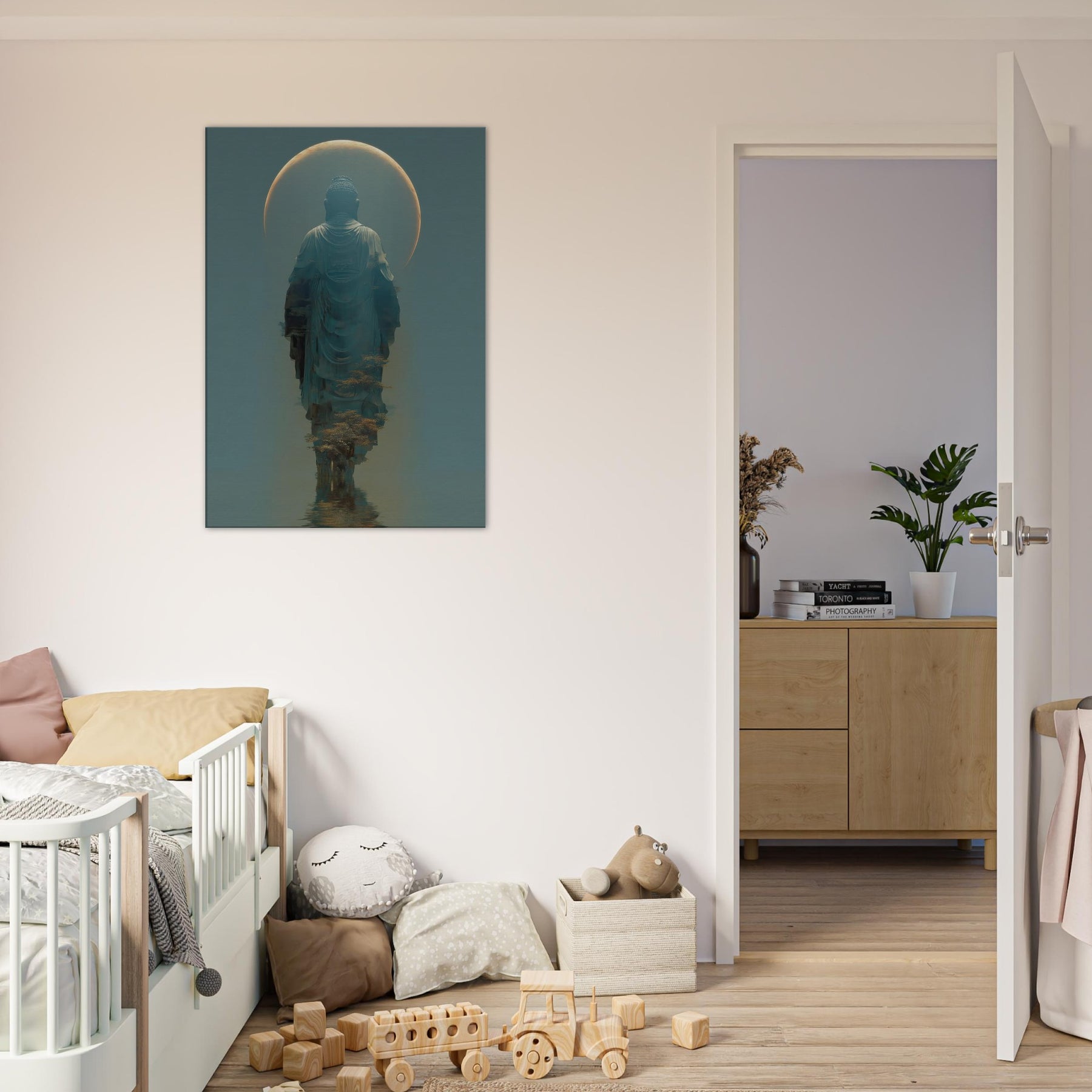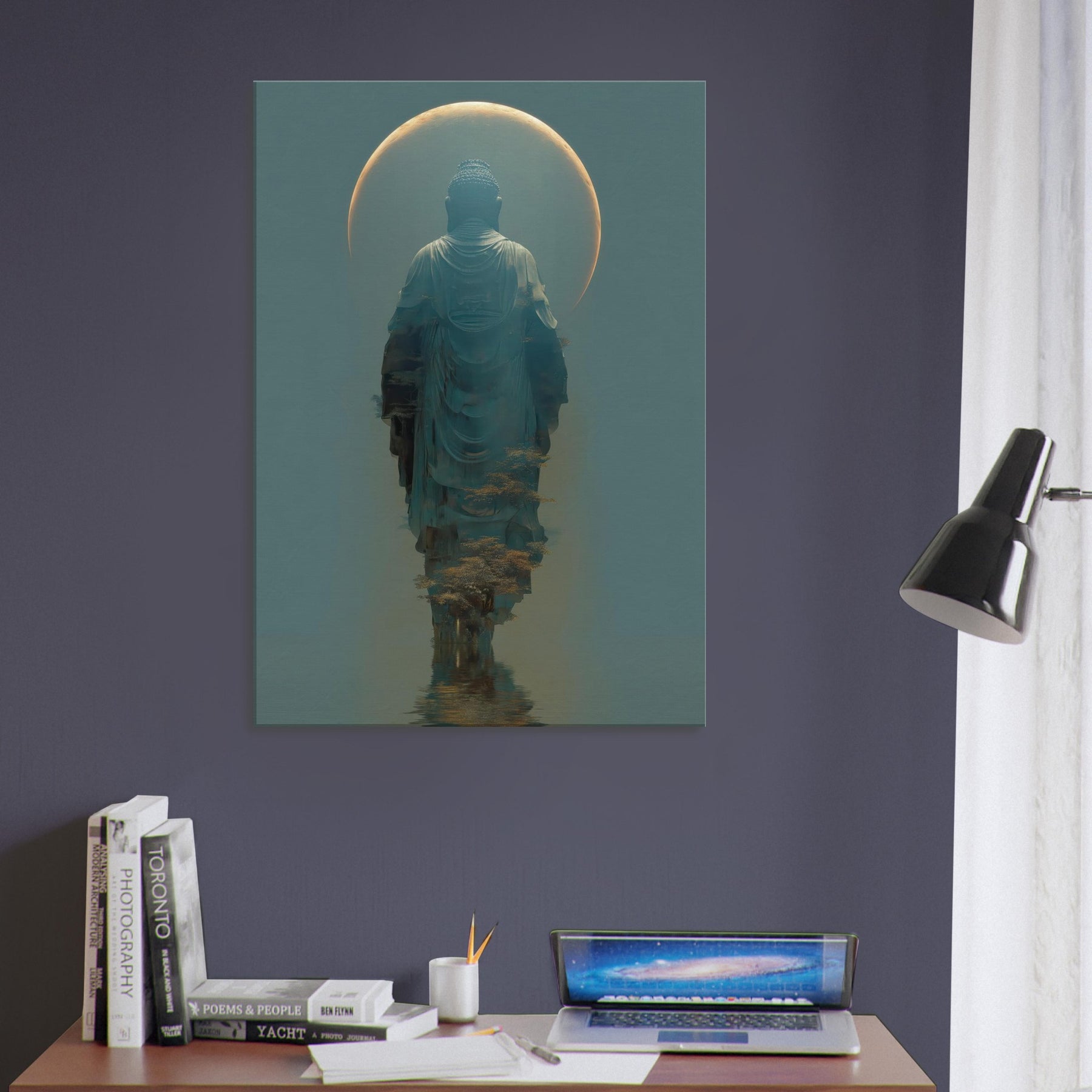 Shrouded in a celestial mist, this depiction of Kuan Yin rises with a serene, spectral presence. The halo, like a delicate crescent of molten moonlight, frames the figure as if a doorway to another realm has opened in your living space. Surreal folds of robes ripple with unseen currents, while a quiet shoreline of gold and teal glimmers at its base. Hang this in a living room to invite calm, imagination, and an intimate, mystical atmosphere that lingers long after dark. The central subject is Kuan Yin (Guanyin).