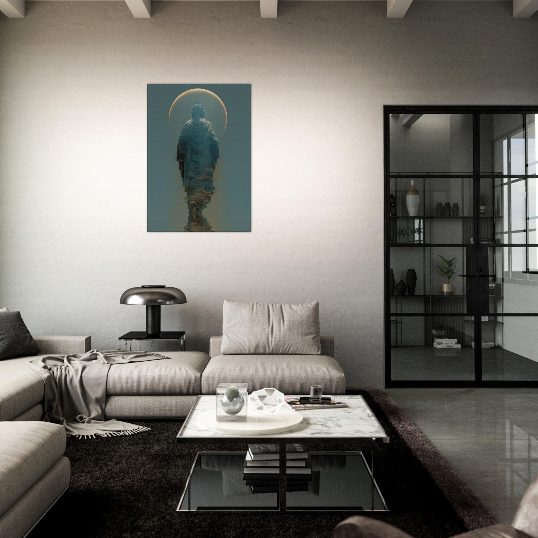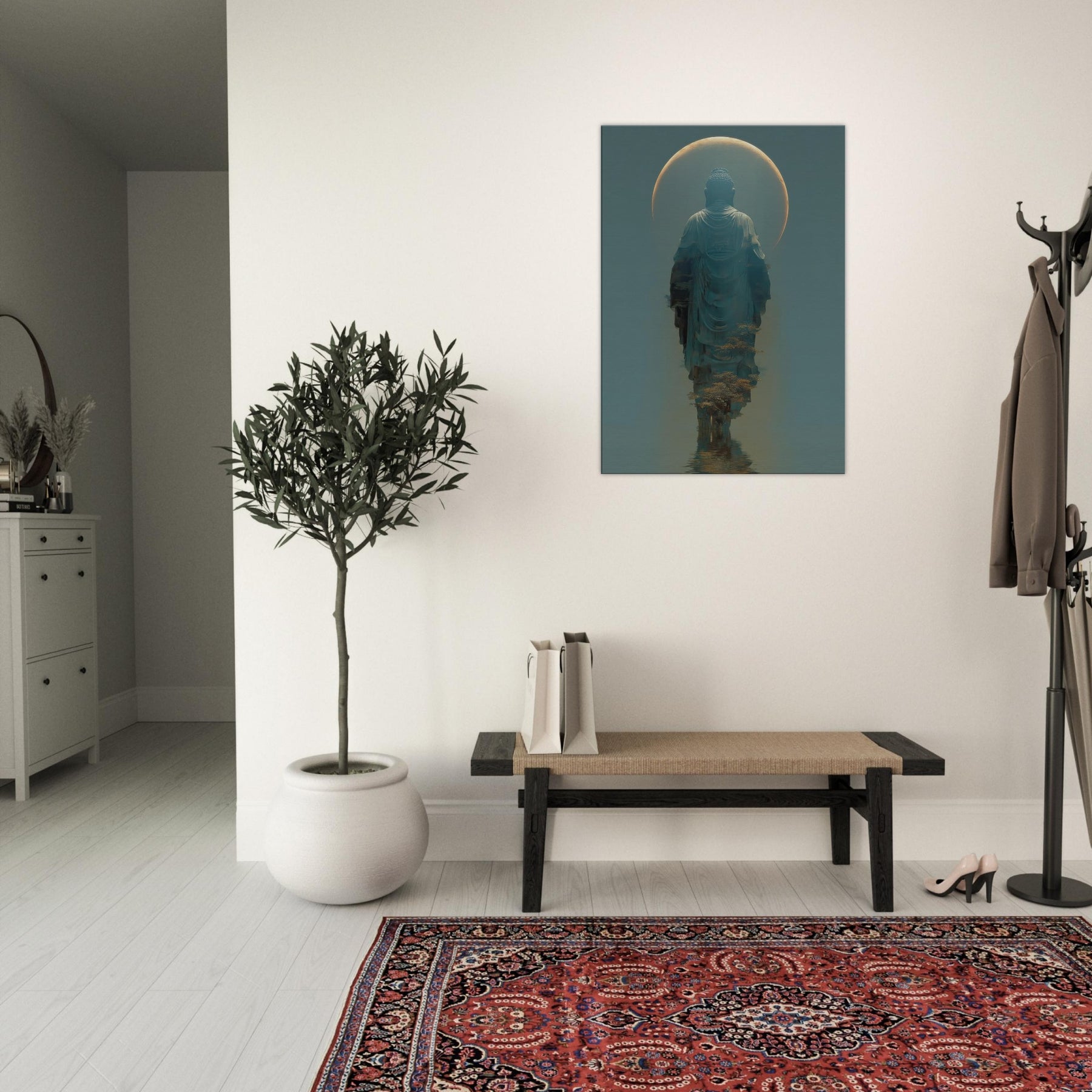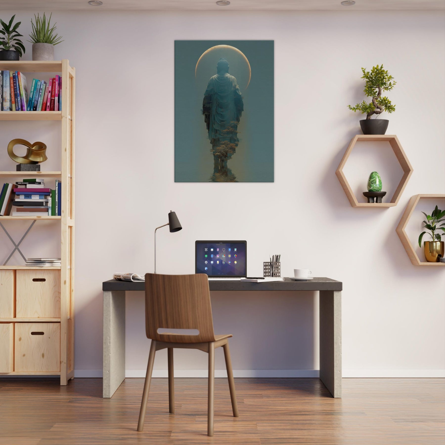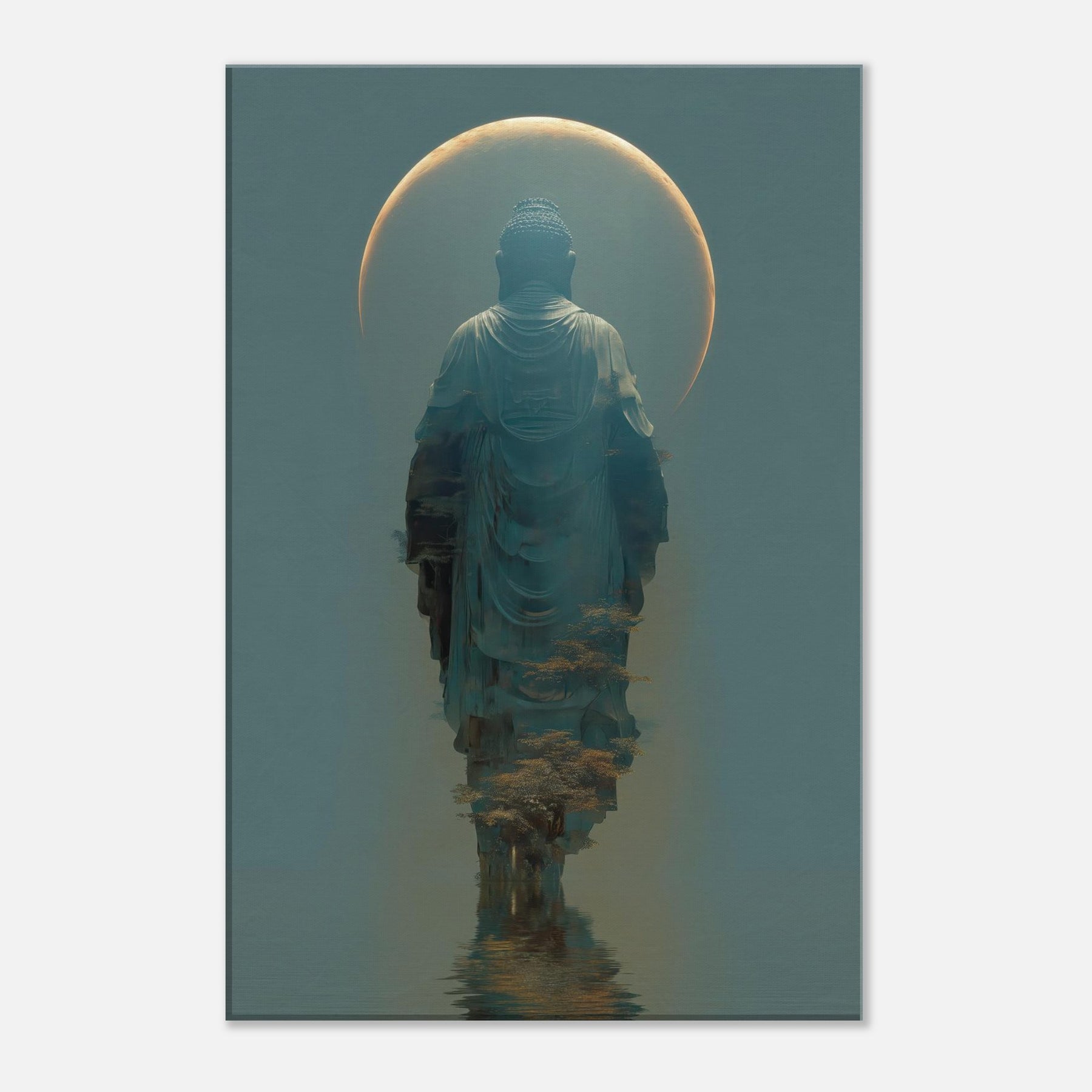 Shrouded in a celestial mist, this depiction of Kuan Yin rises with a serene, spectral presence. The halo, like a delicate crescent of molten moonlight, frames the figure as if a doorway to another realm has opened in your living space. Surreal folds of robes ripple with unseen currents, while a quiet shoreline of gold and teal glimmers at its base. Hang this in a living room to invite calm, imagination, and an intimate, mystical atmosphere that lingers long after dark. The central subject is Kuan Yin (Guanyin).