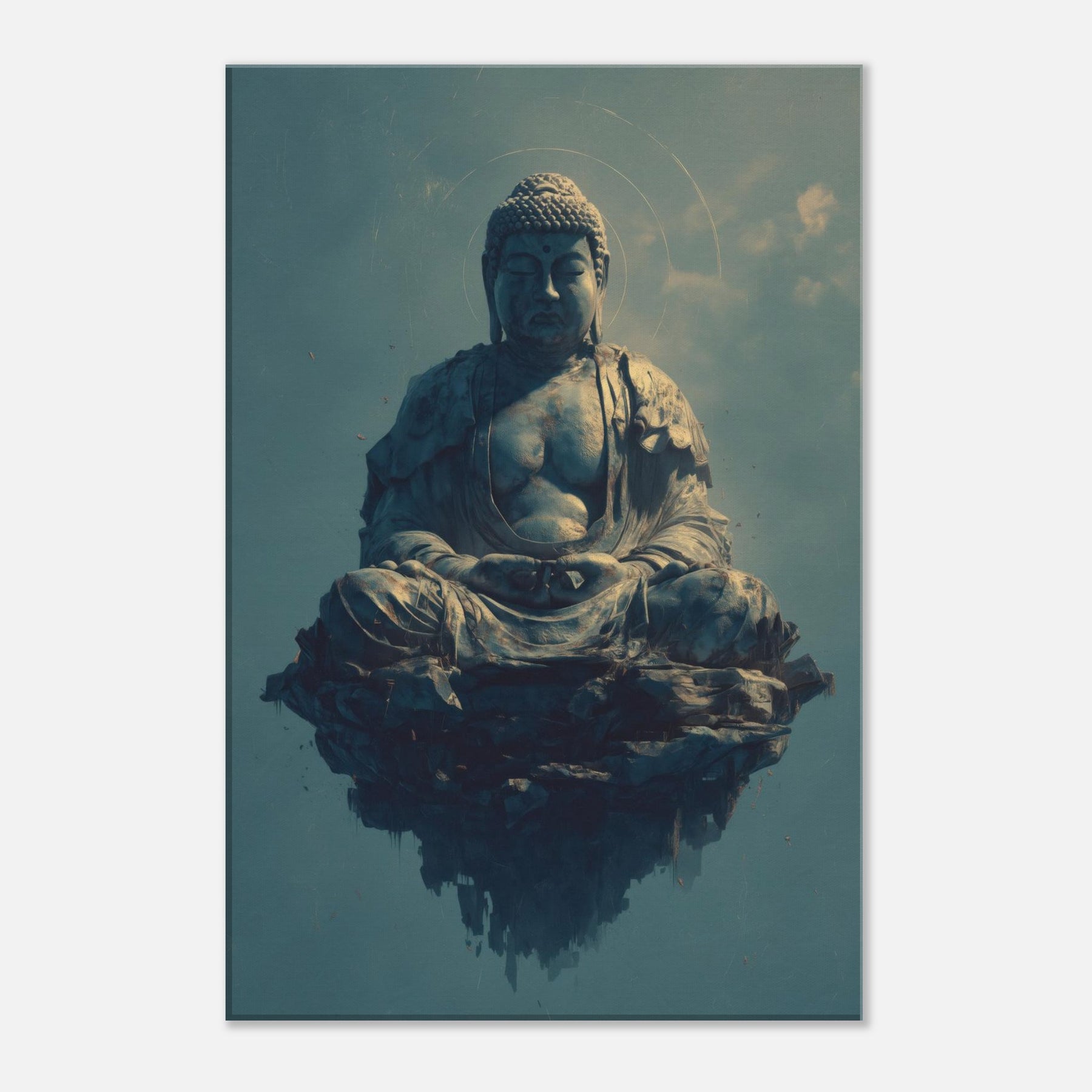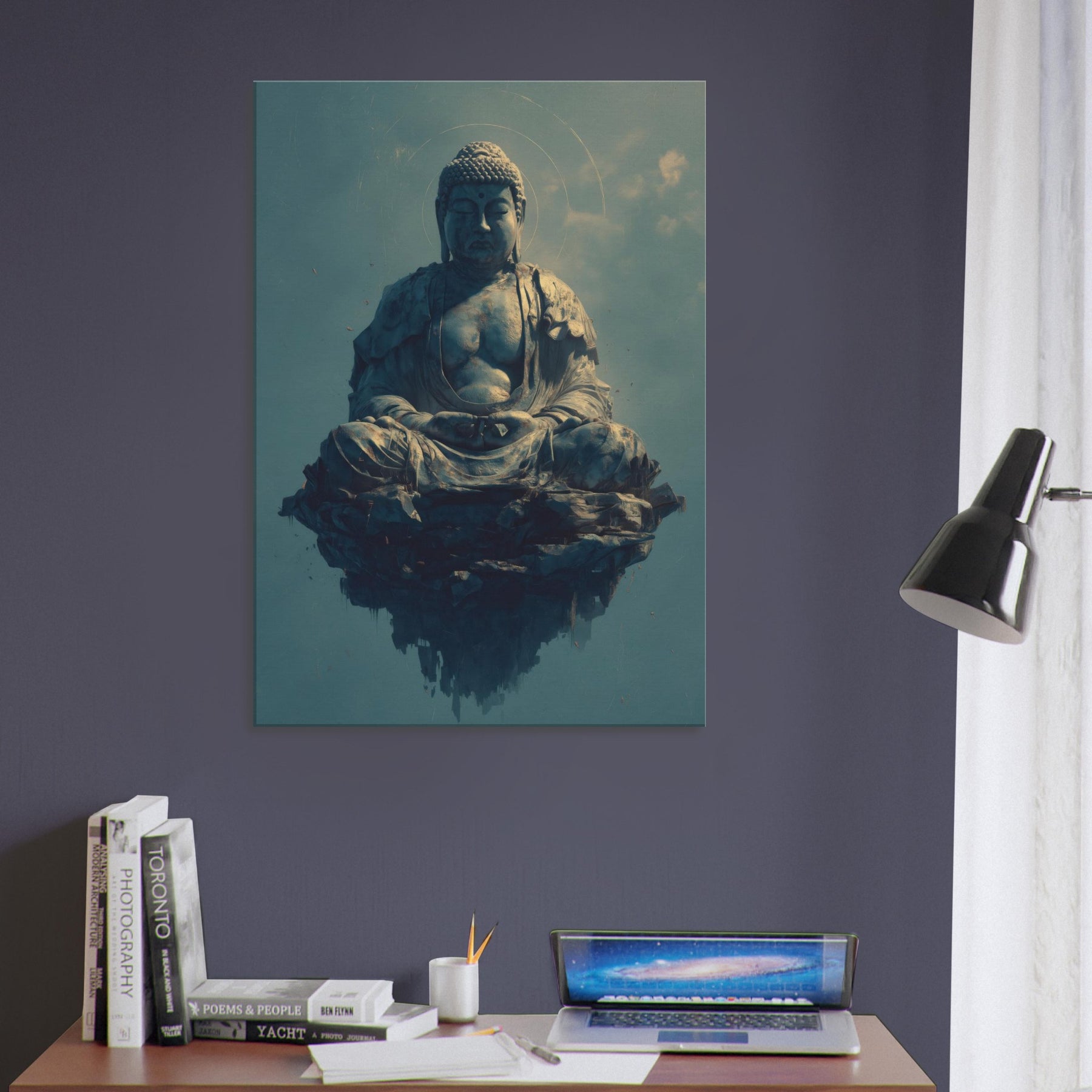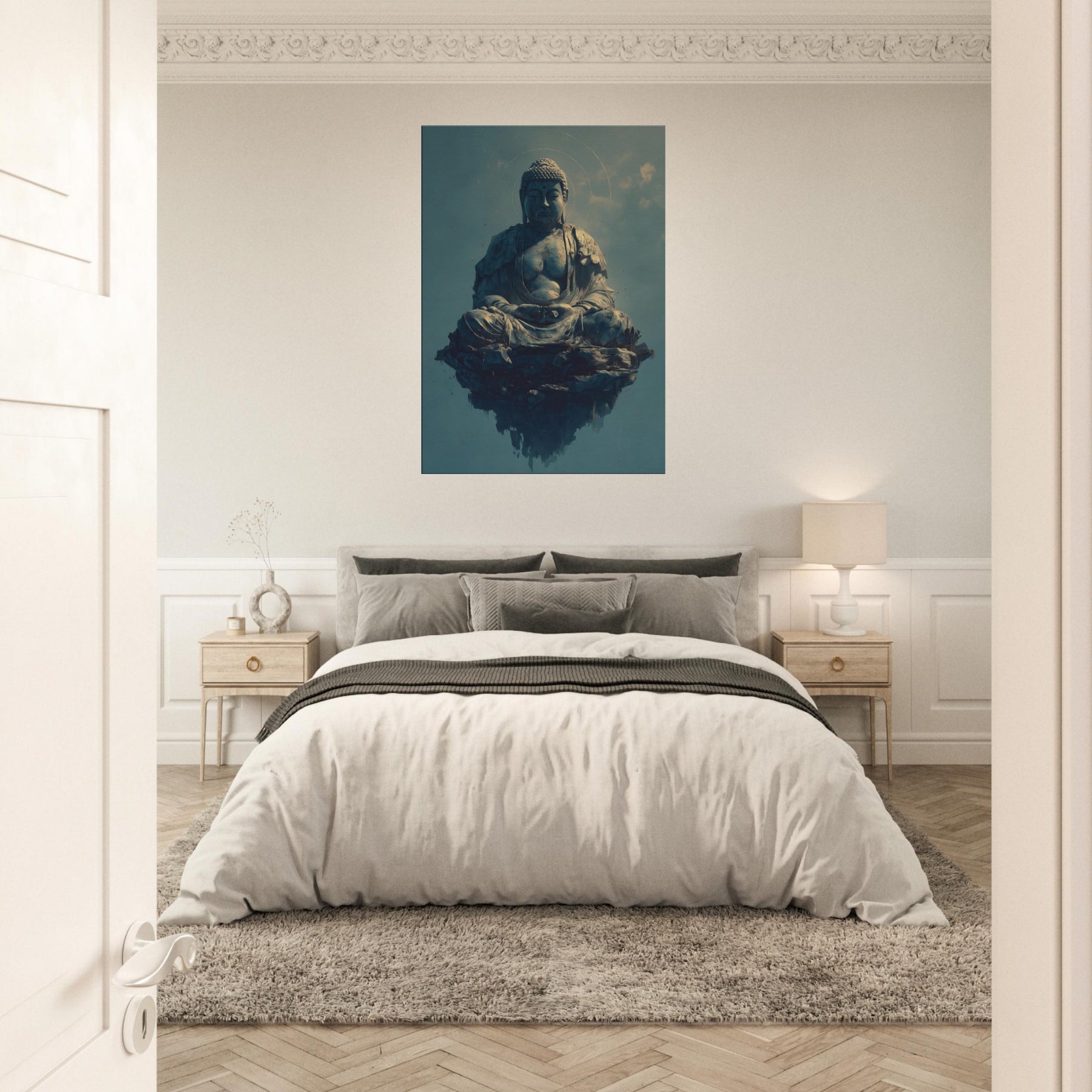 Suspended above a jagged pedestal, the Buddha rests in a velvet hush, radiating a serene halo as if the air itself were listening. This surreal tableau blends stillness with dream, inviting a moment of breath at the center of any room. The cool blue tones and weathered textures evoke ancient temples and otherworldly skies, turning a wall into a quiet sanctuary. Place it in a living area or meditation corner to amplify calm, curiosity, and contemplation.