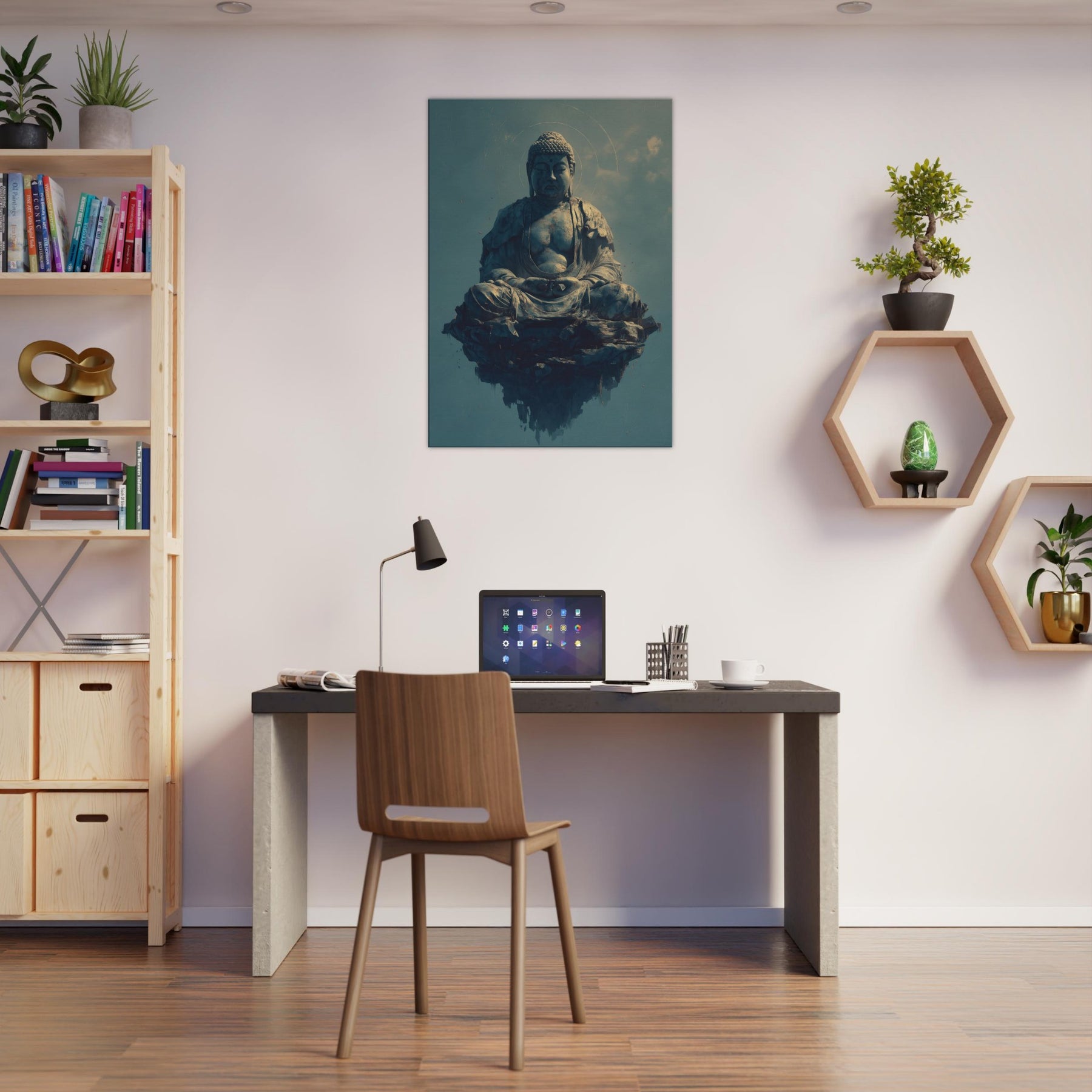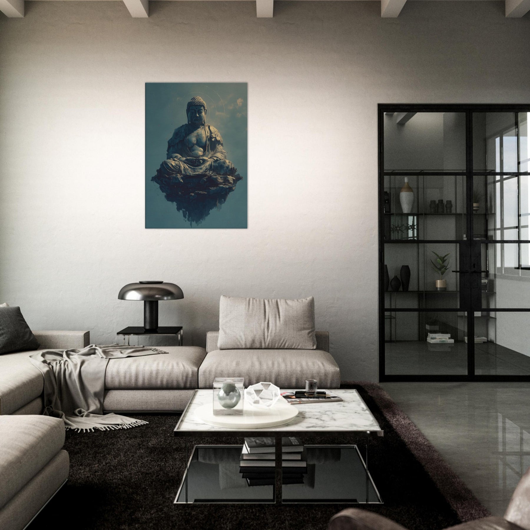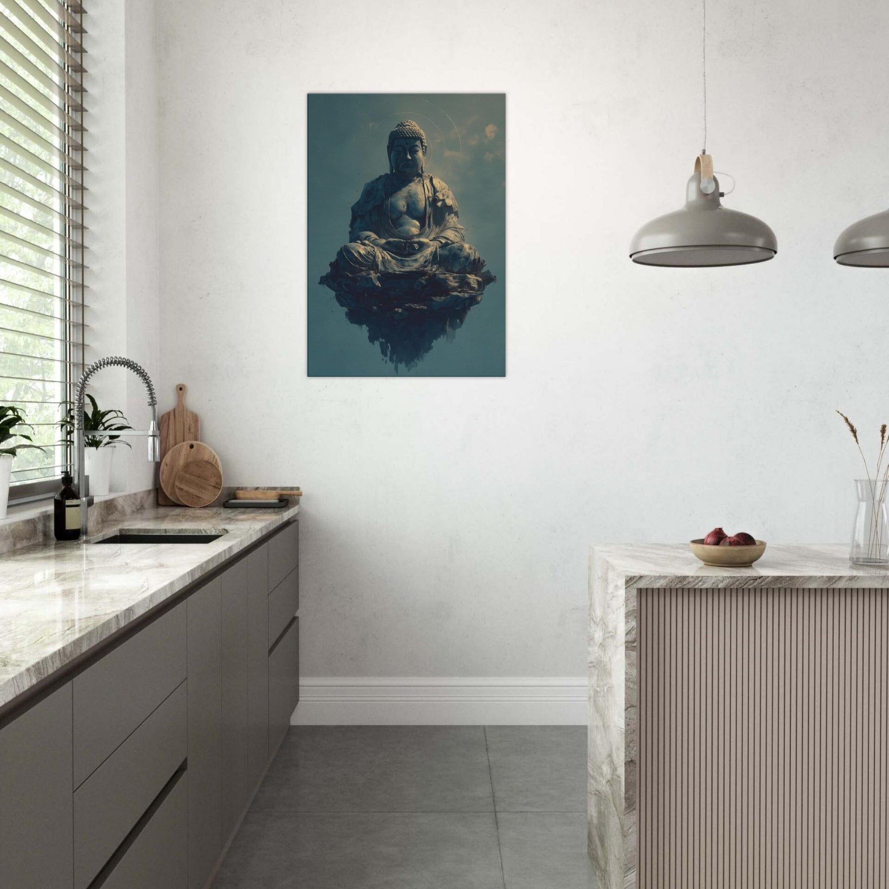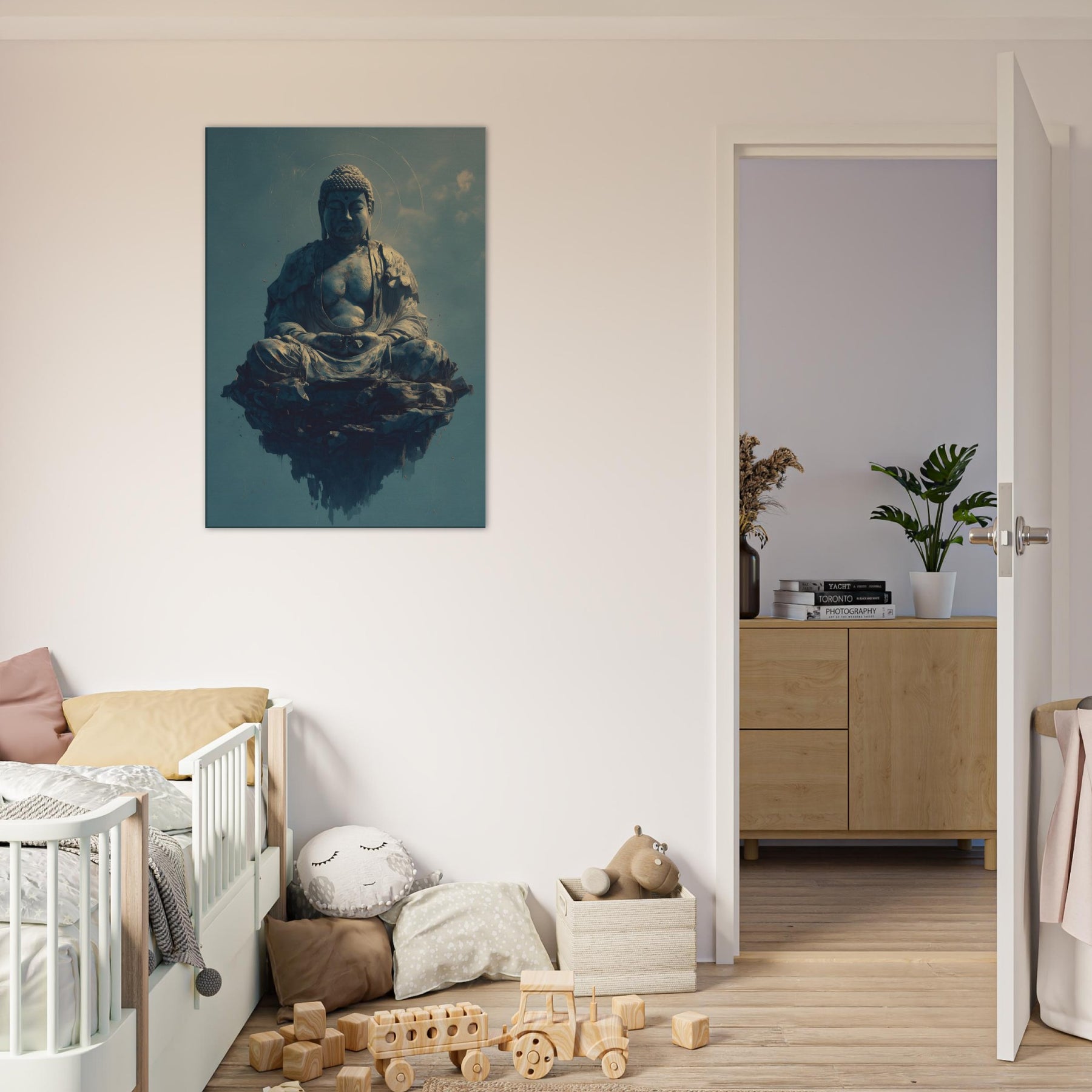 Suspended above a jagged pedestal, the Buddha rests in a velvet hush, radiating a serene halo as if the air itself were listening. This surreal tableau blends stillness with dream, inviting a moment of breath at the center of any room. The cool blue tones and weathered textures evoke ancient temples and otherworldly skies, turning a wall into a quiet sanctuary. Place it in a living area or meditation corner to amplify calm, curiosity, and contemplation.