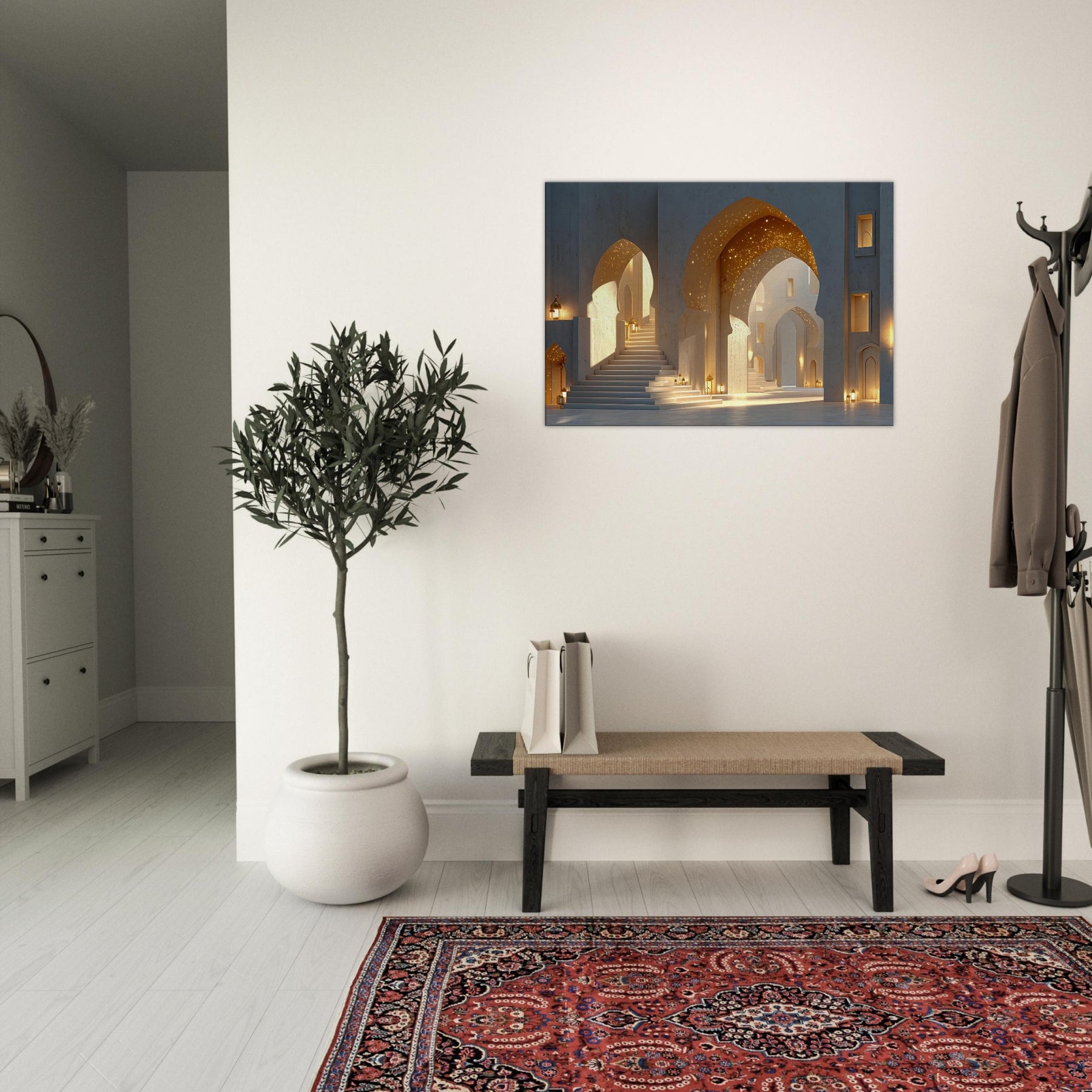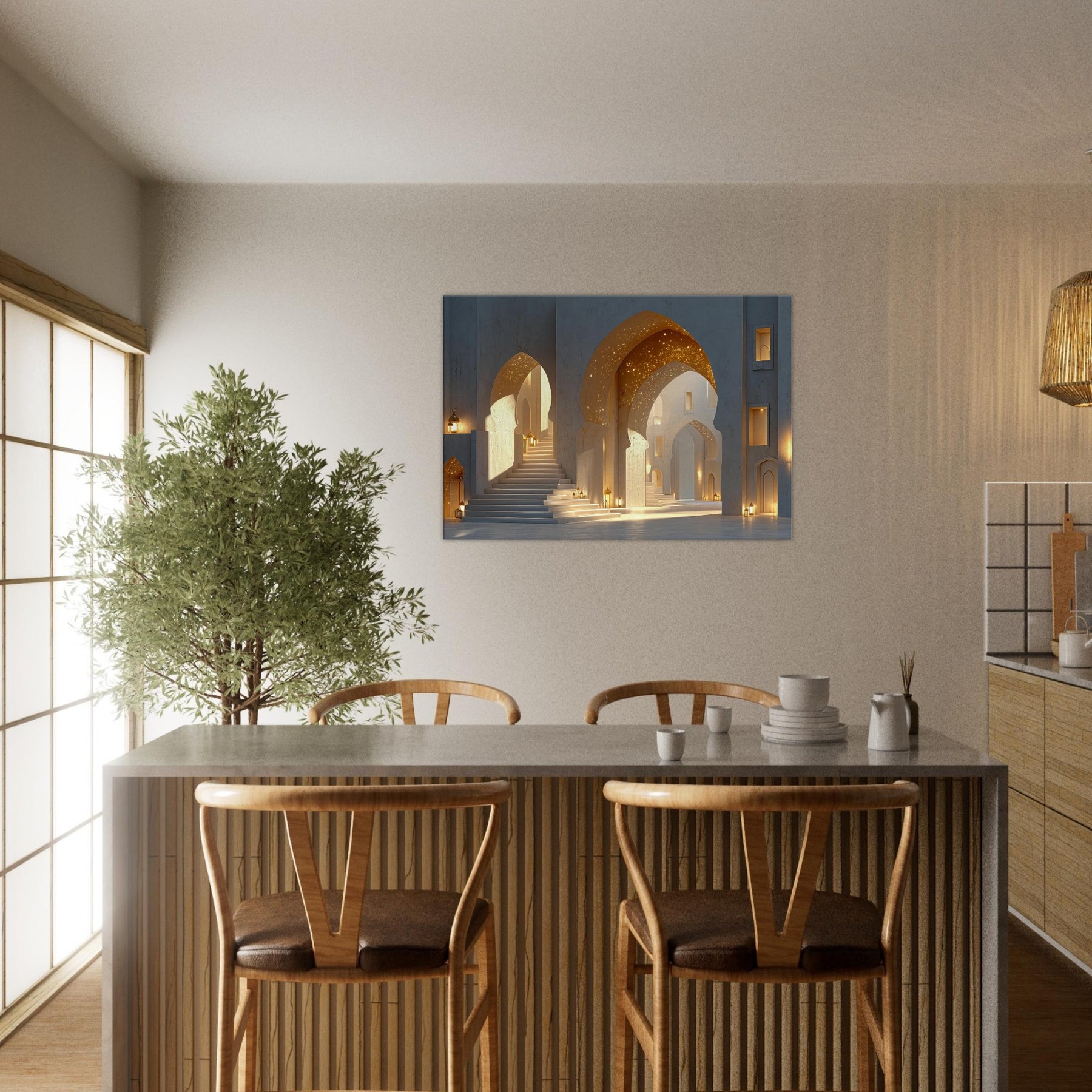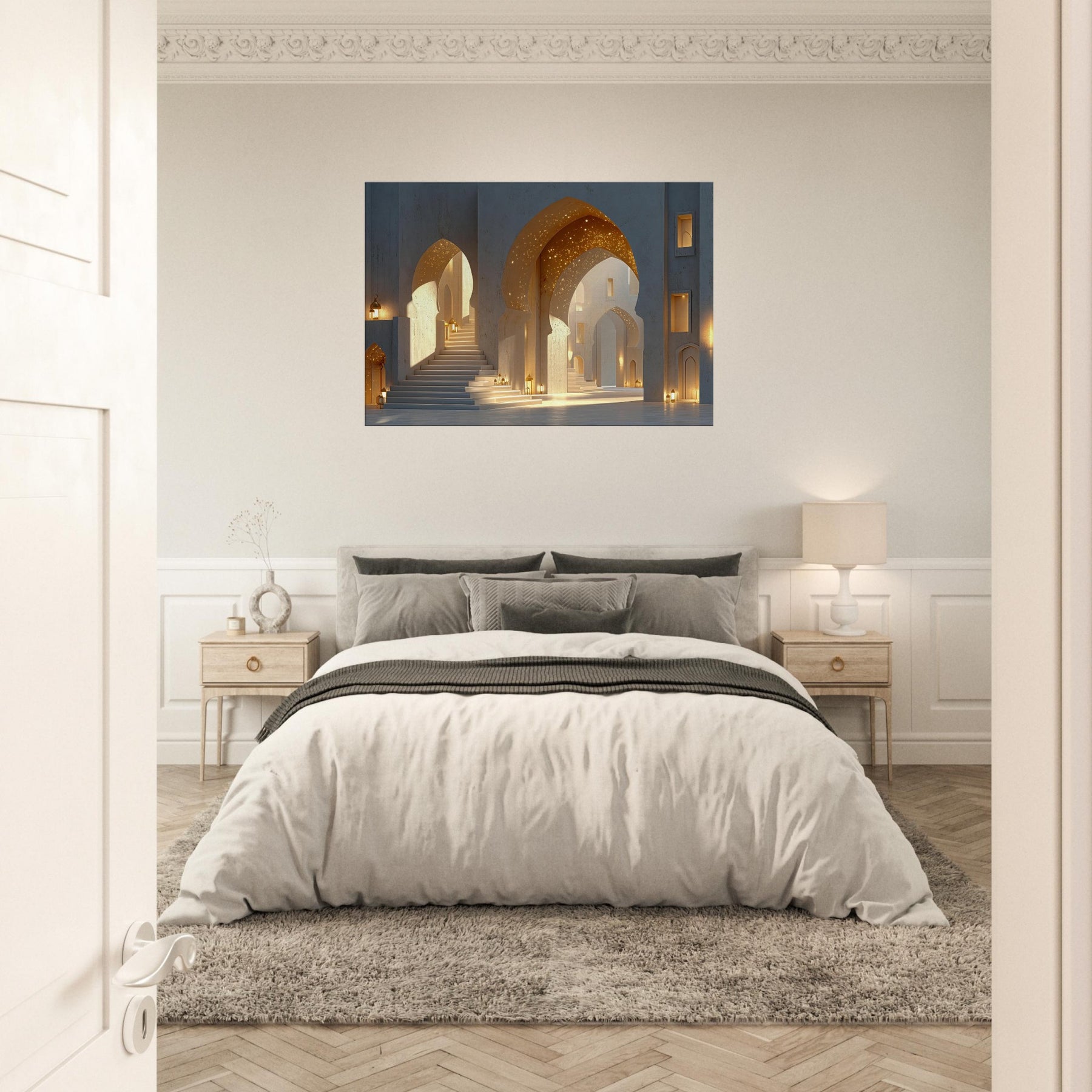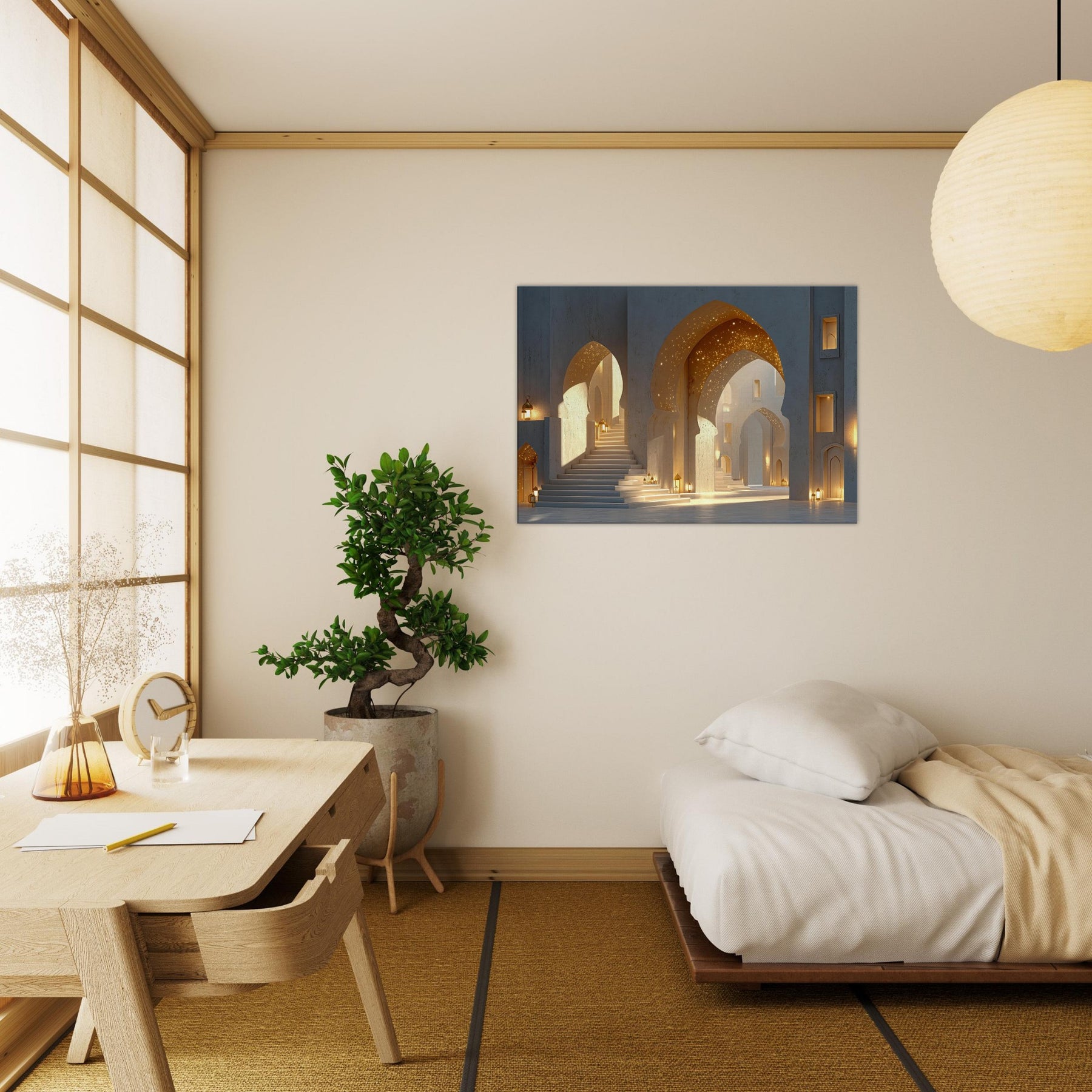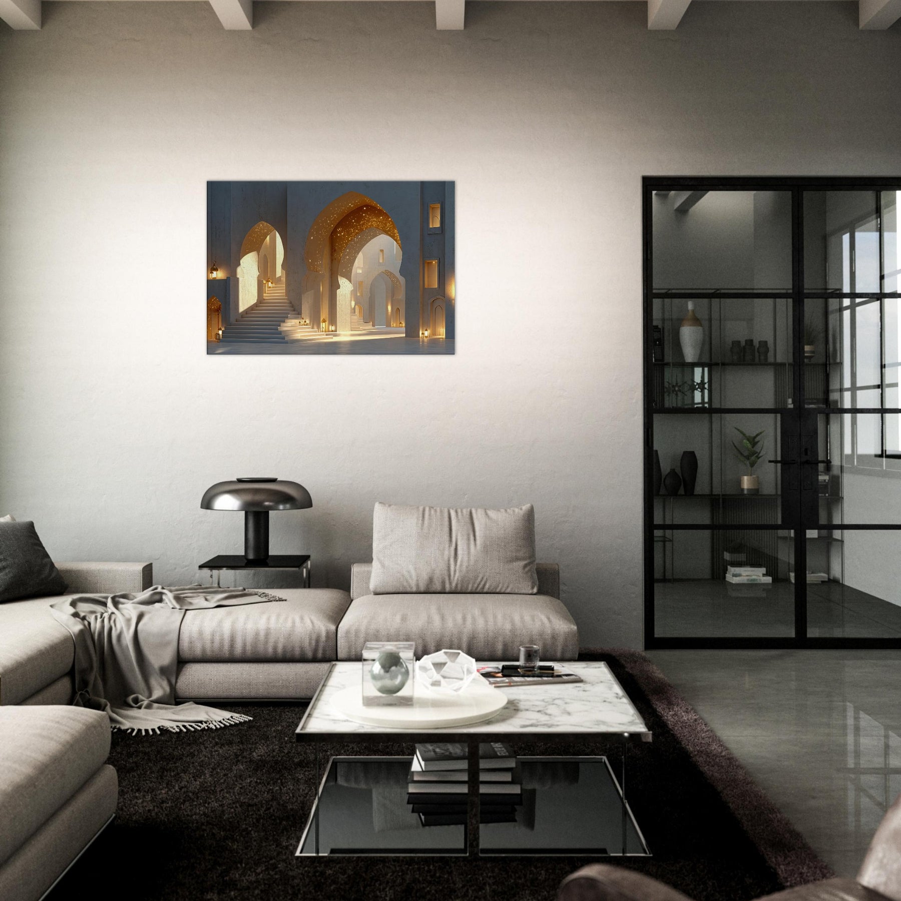 Step into an Arabian Bazaar rendered in a dreamlike procession of arches and lanterns, where light pours down stairways and dissolves into gold. This surreal architectural reverie invites quiet contemplation as warm, amber hues pool along smooth plaster and cast elongated shadows. A living room transformed by this piece feels sculpted by moonlight and memory, calm, generous, and endlessly inviting. Let the atmospheric glow cradle conversations and anchor your space with timeless, exotic wonder.