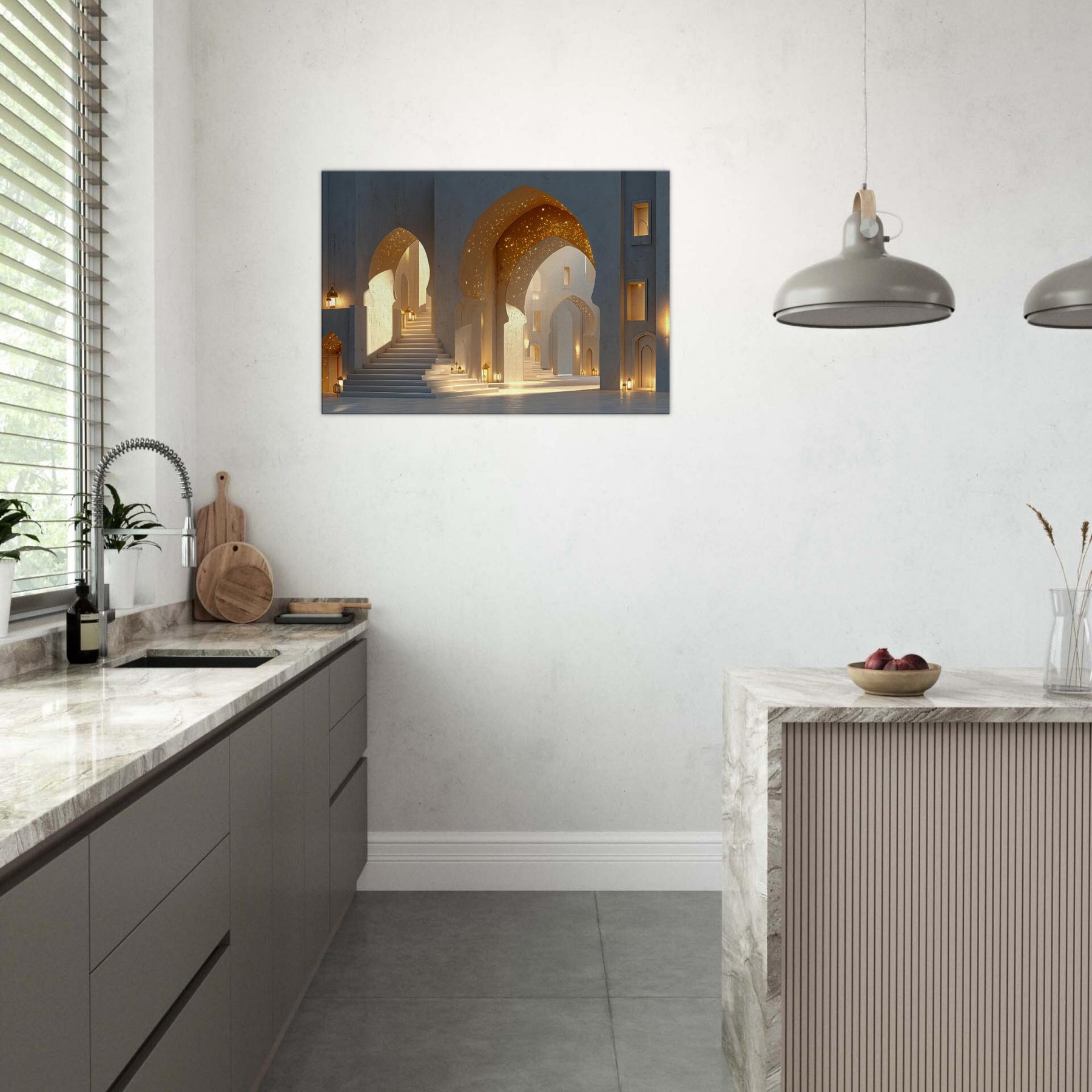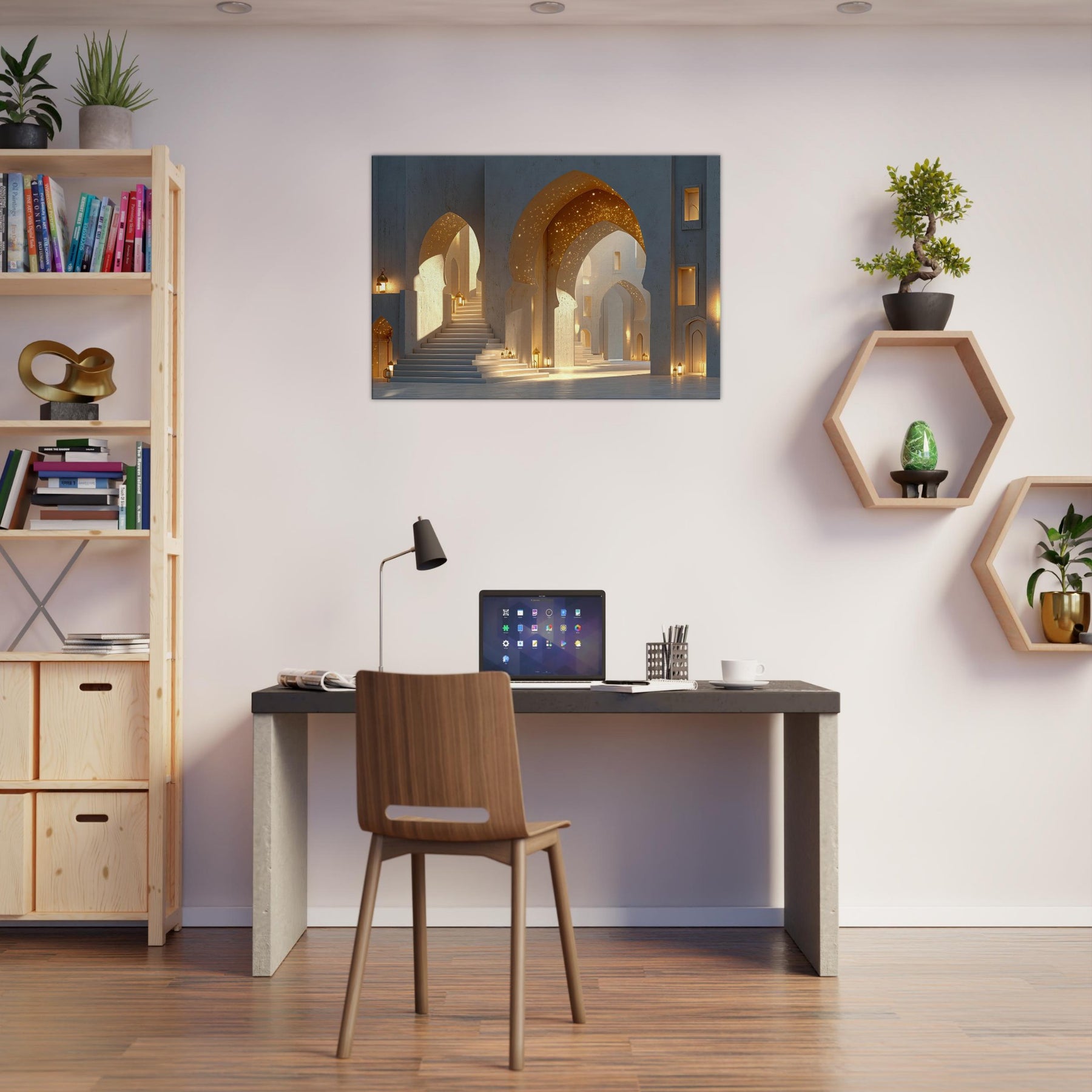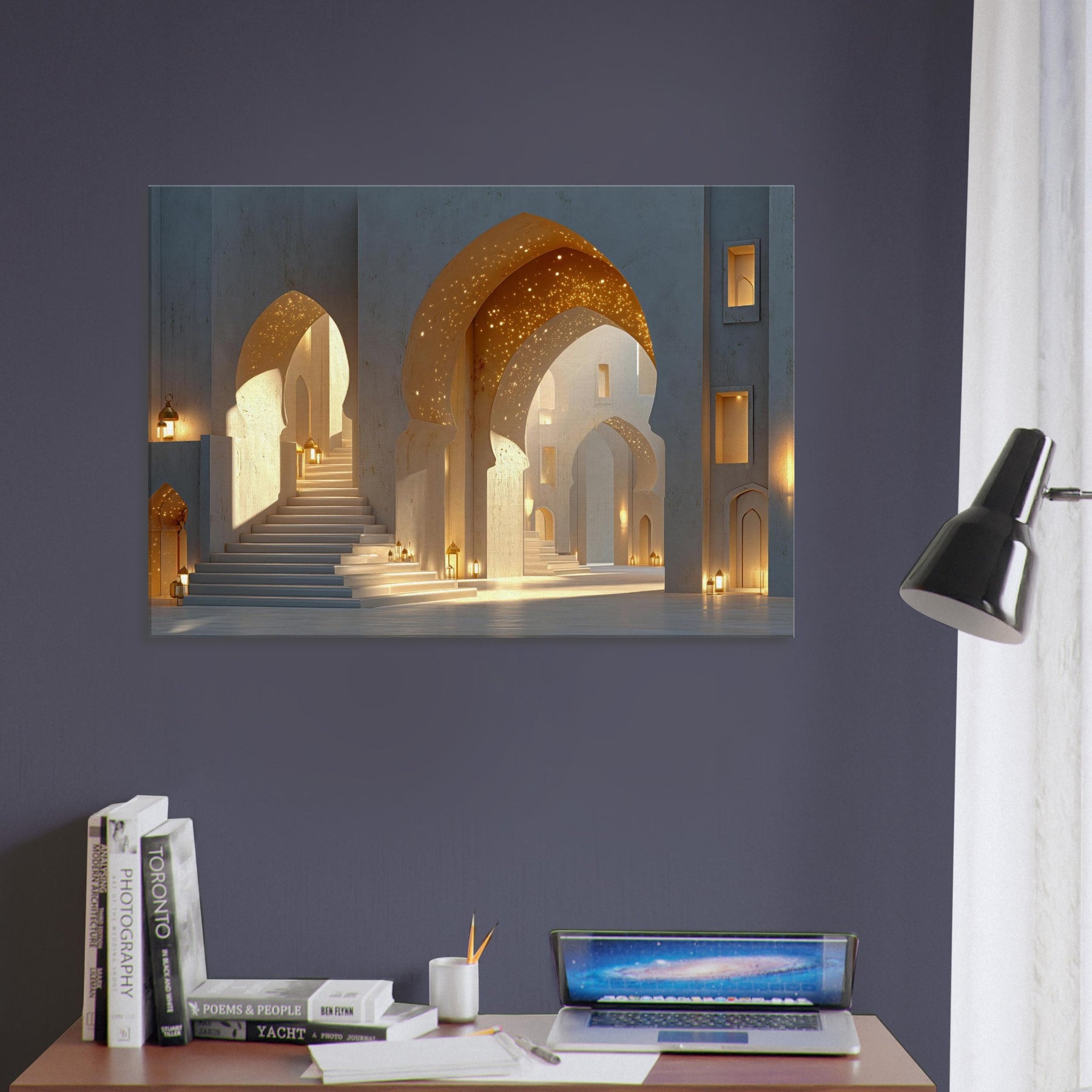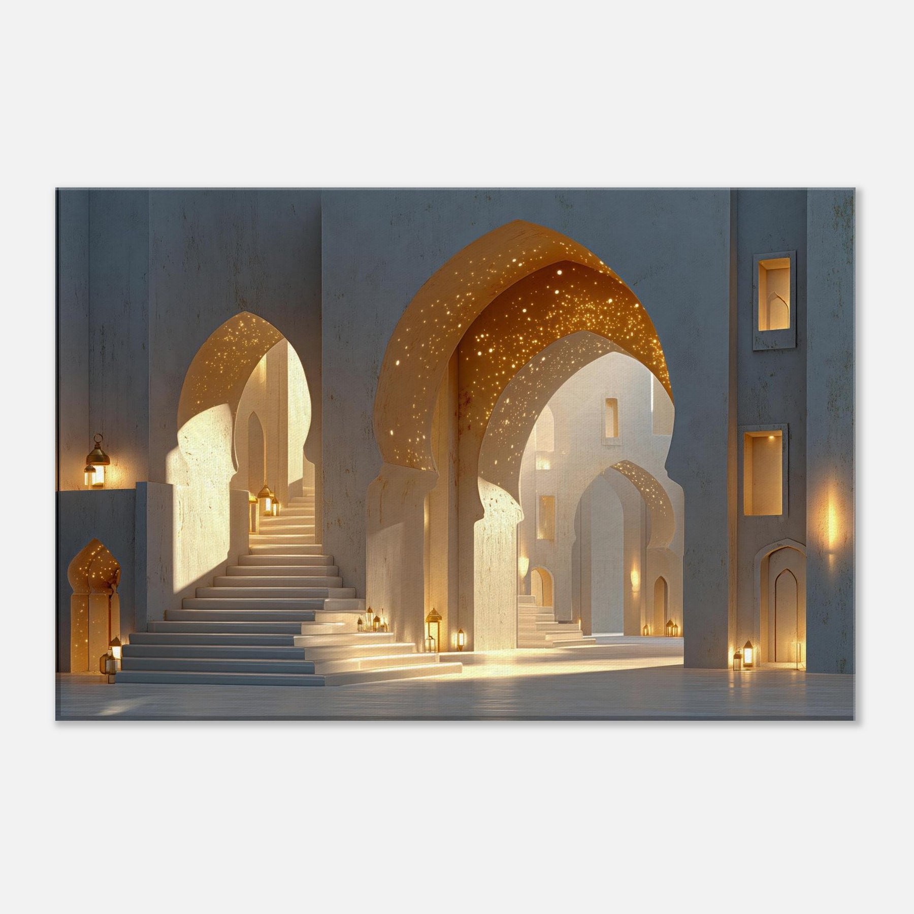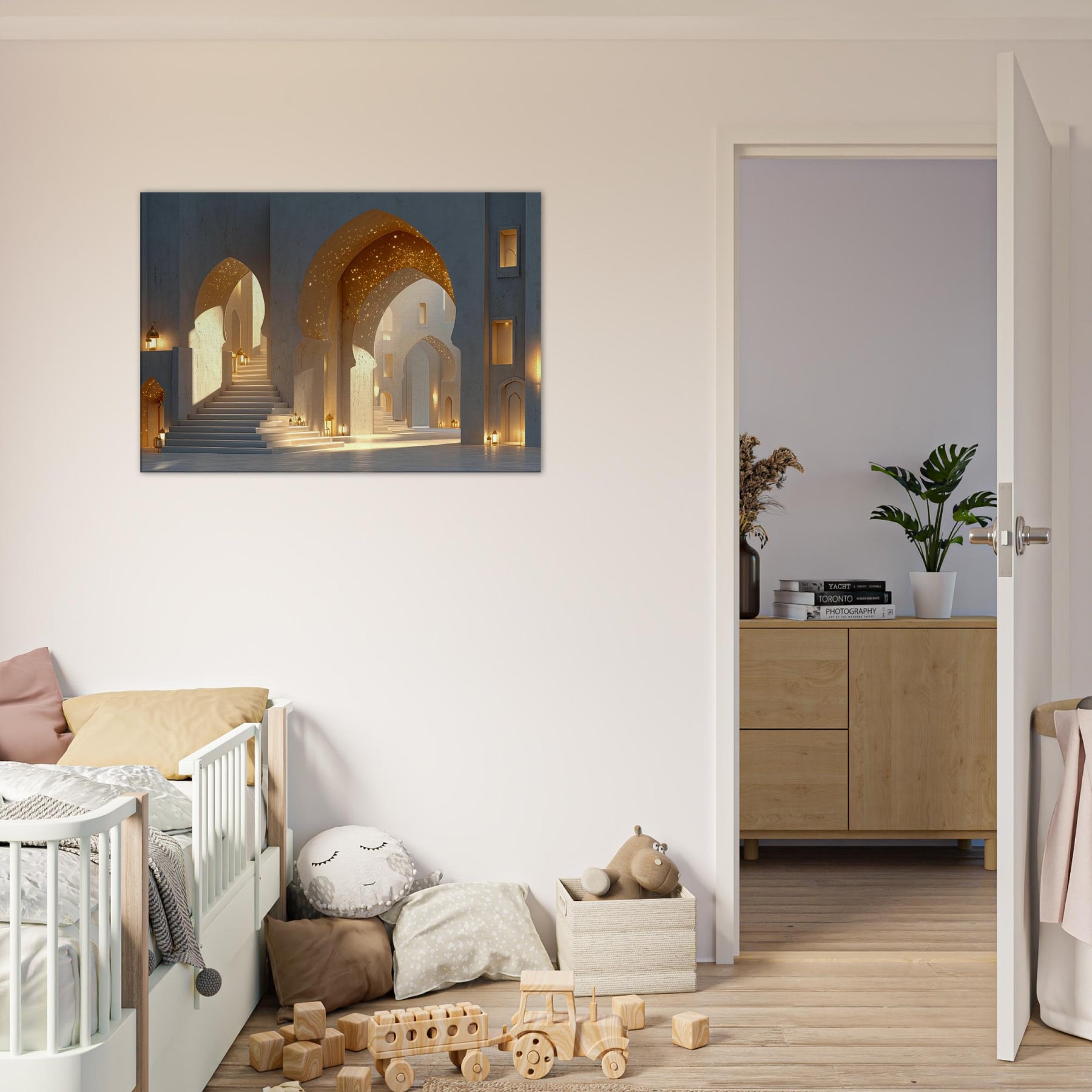 Step into an Arabian Bazaar rendered in a dreamlike procession of arches and lanterns, where light pours down stairways and dissolves into gold. This surreal architectural reverie invites quiet contemplation as warm, amber hues pool along smooth plaster and cast elongated shadows. A living room transformed by this piece feels sculpted by moonlight and memory, calm, generous, and endlessly inviting. Let the atmospheric glow cradle conversations and anchor your space with timeless, exotic wonder.