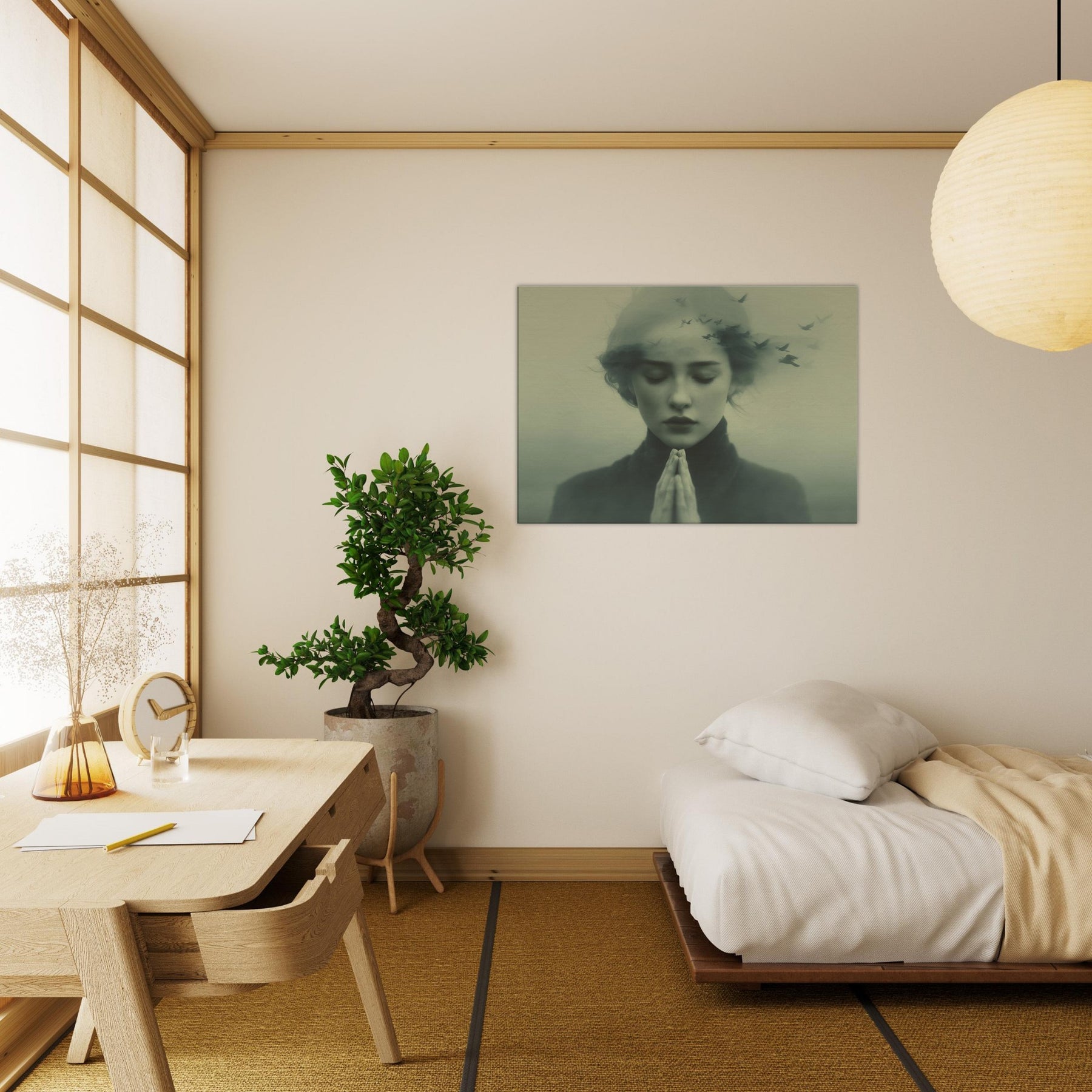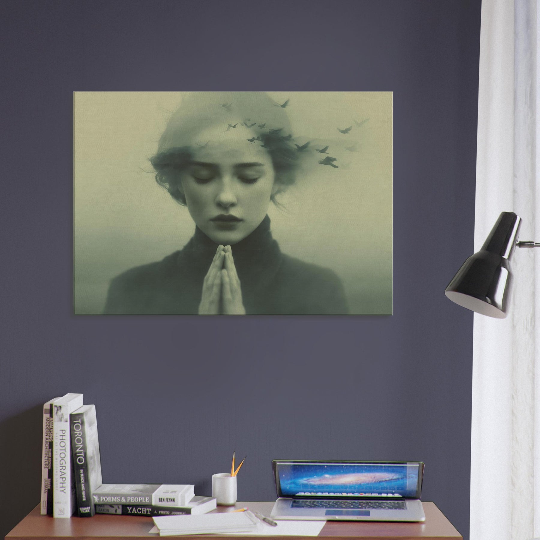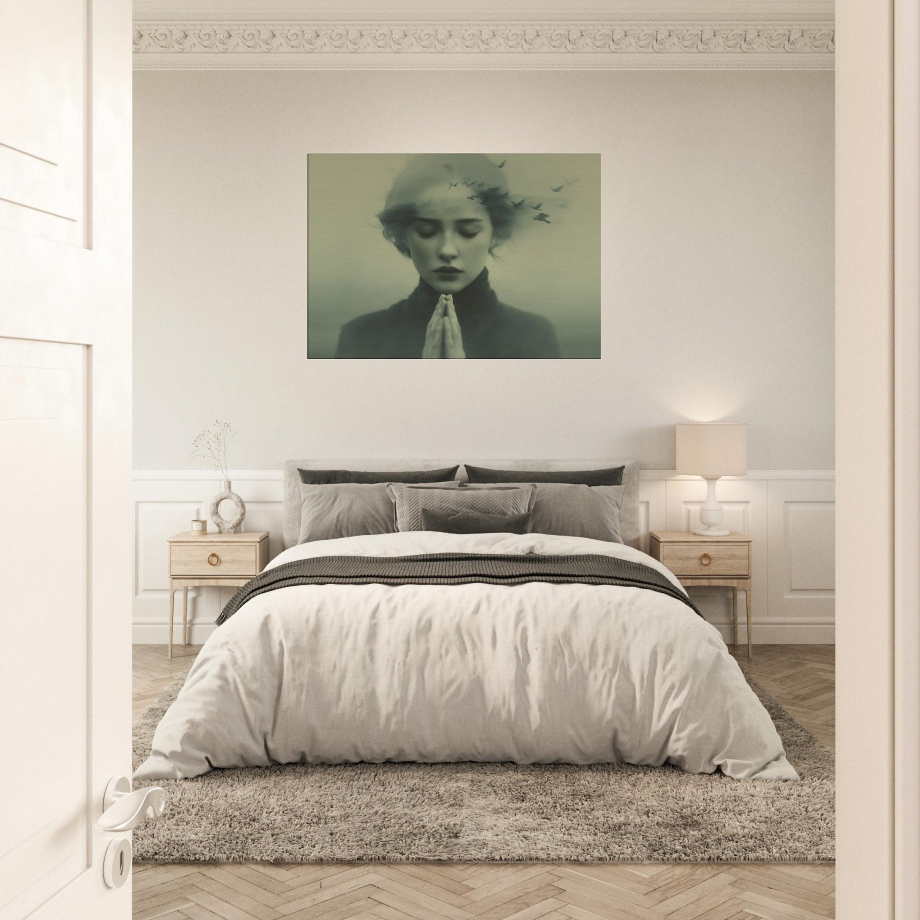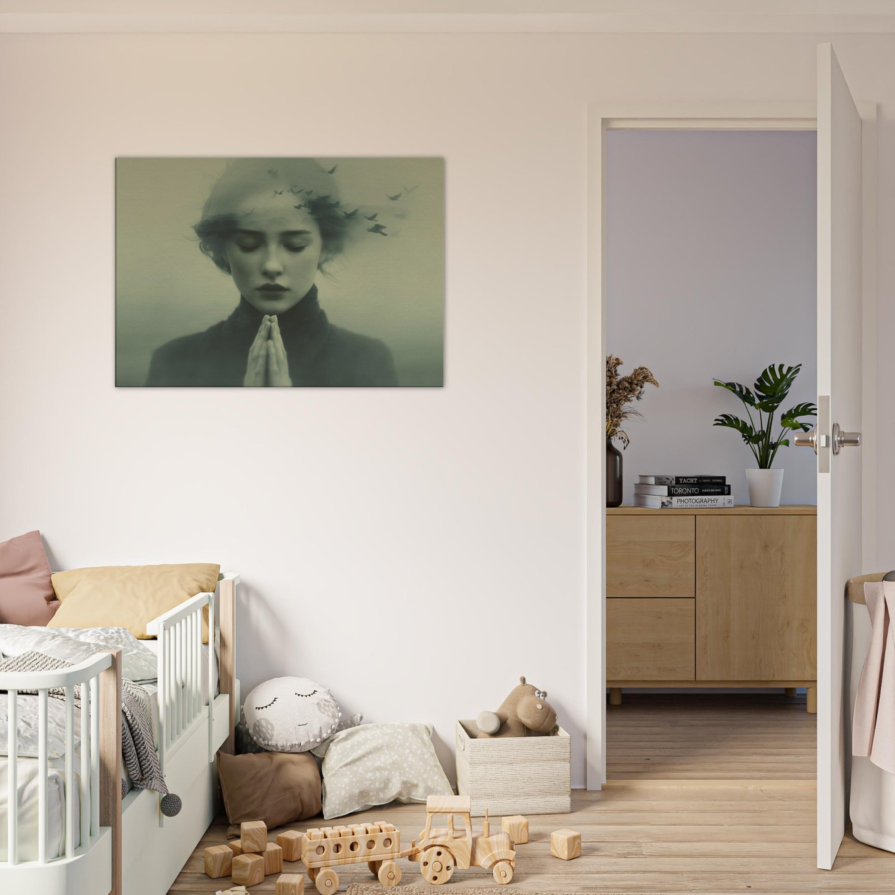 Hands in Prayer rises from a fog of memory and morning mist, a serene figure whose closed eyes hold a universe of quiet intention. Surreal seams of birds drift from the crown, like thoughts taking flight, inviting stillness into the room. The soft, desaturated palette wraps walls in calm, while the tender concentration of the hands anchors conversation with silence. Hang this piece beside a sofa or bedside, and let the room breathe with contemplative light, turning everyday space into a sanctuary of focus and grace.