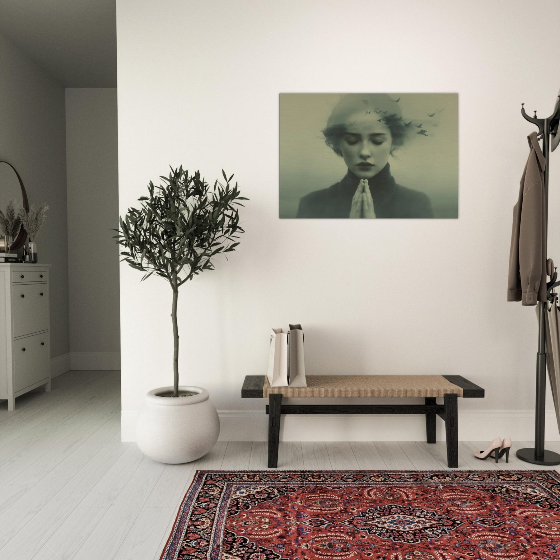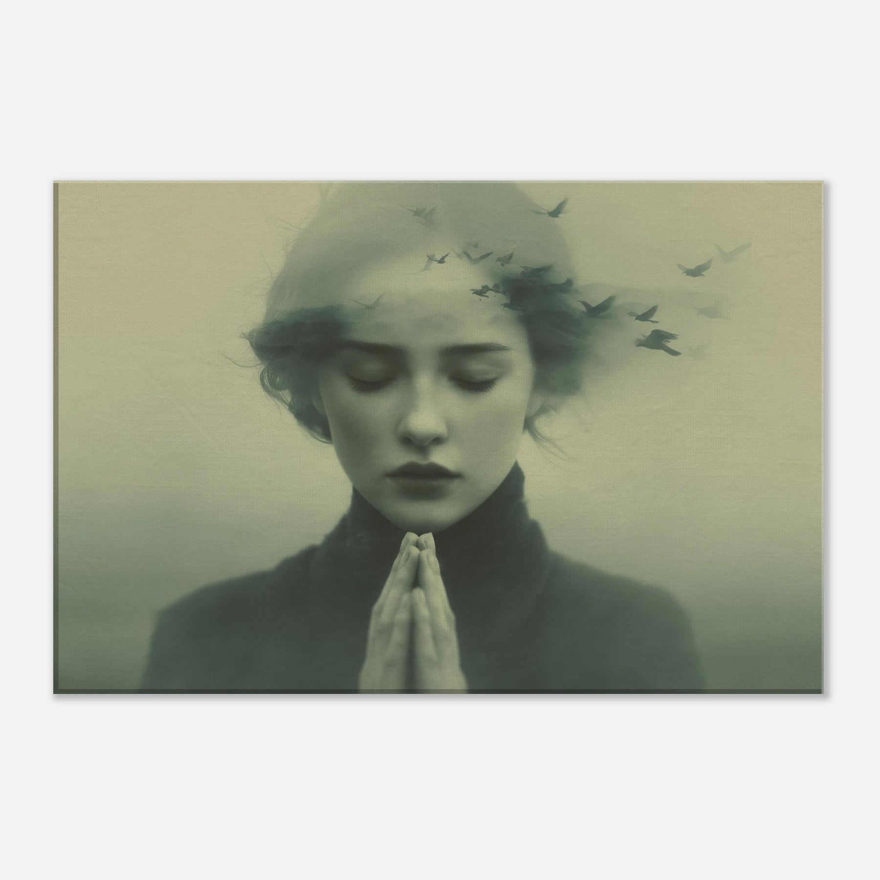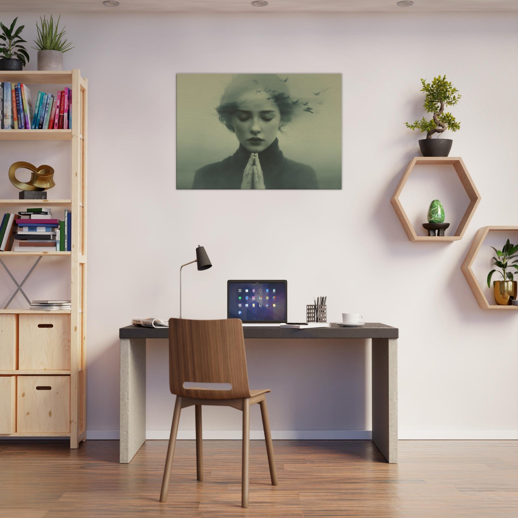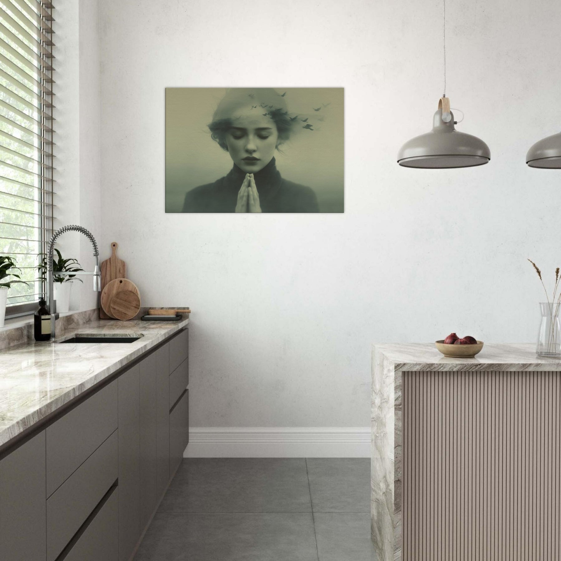 Hands in Prayer rises from a fog of memory and morning mist, a serene figure whose closed eyes hold a universe of quiet intention. Surreal seams of birds drift from the crown, like thoughts taking flight, inviting stillness into the room. The soft, desaturated palette wraps walls in calm, while the tender concentration of the hands anchors conversation with silence. Hang this piece beside a sofa or bedside, and let the room breathe with contemplative light, turning everyday space into a sanctuary of focus and grace.