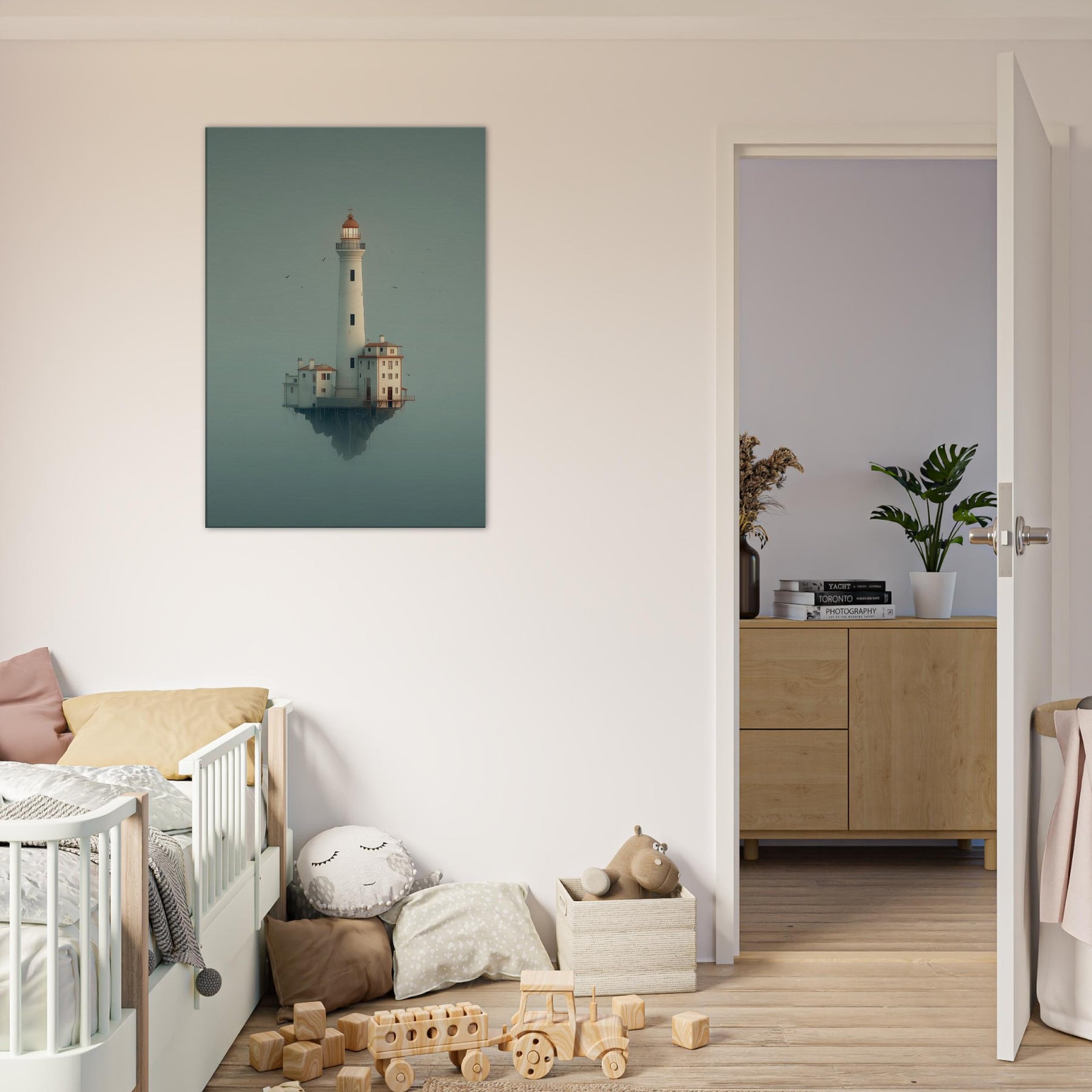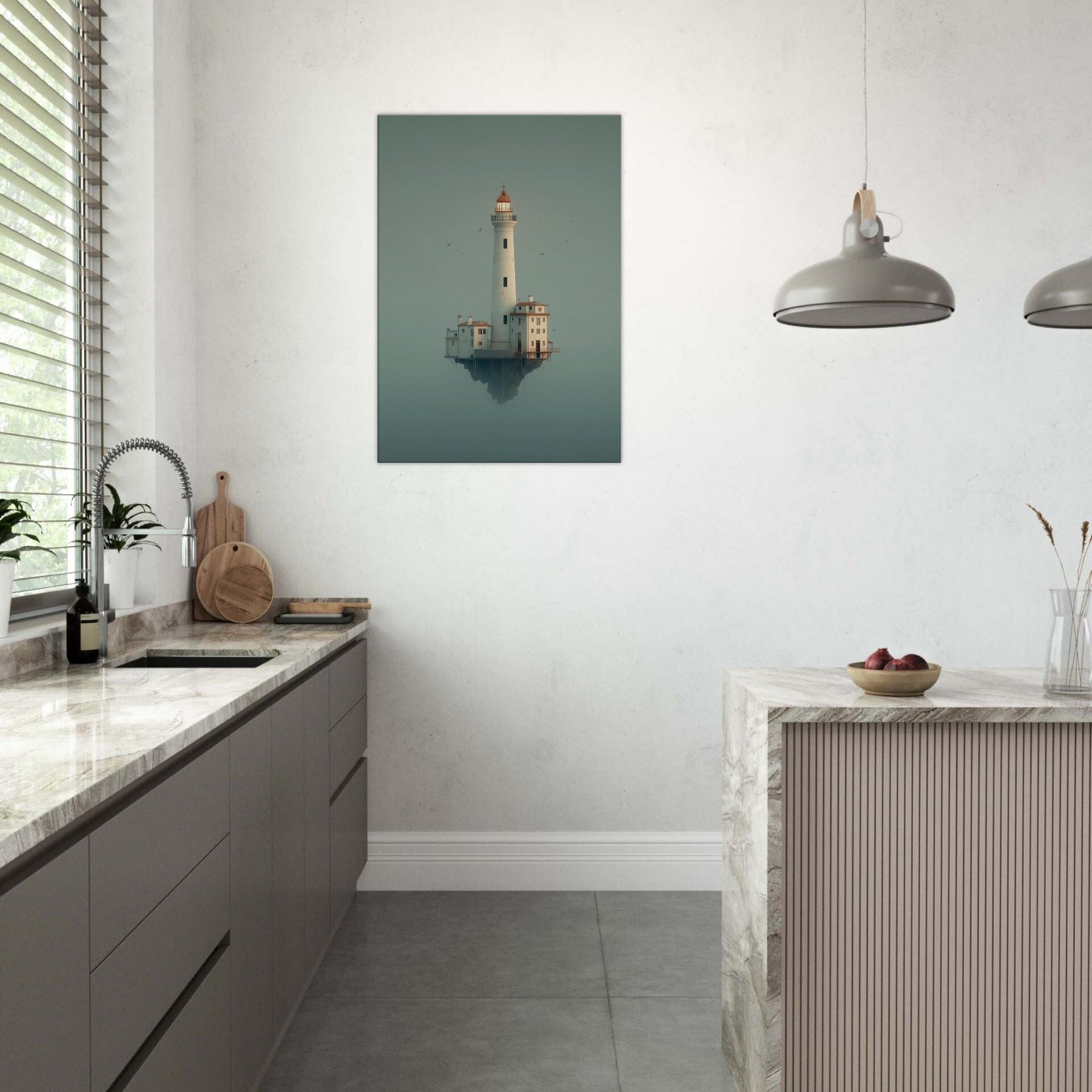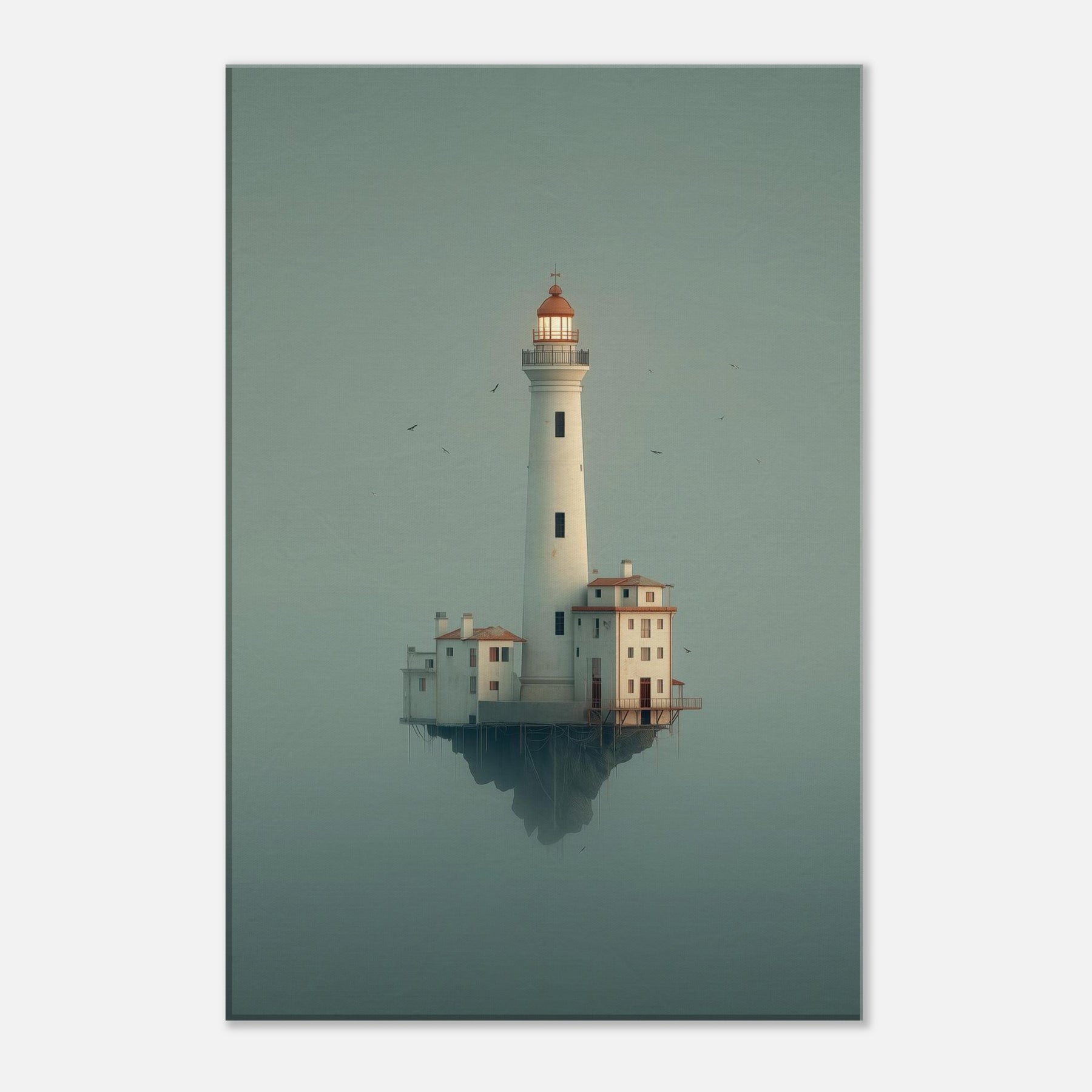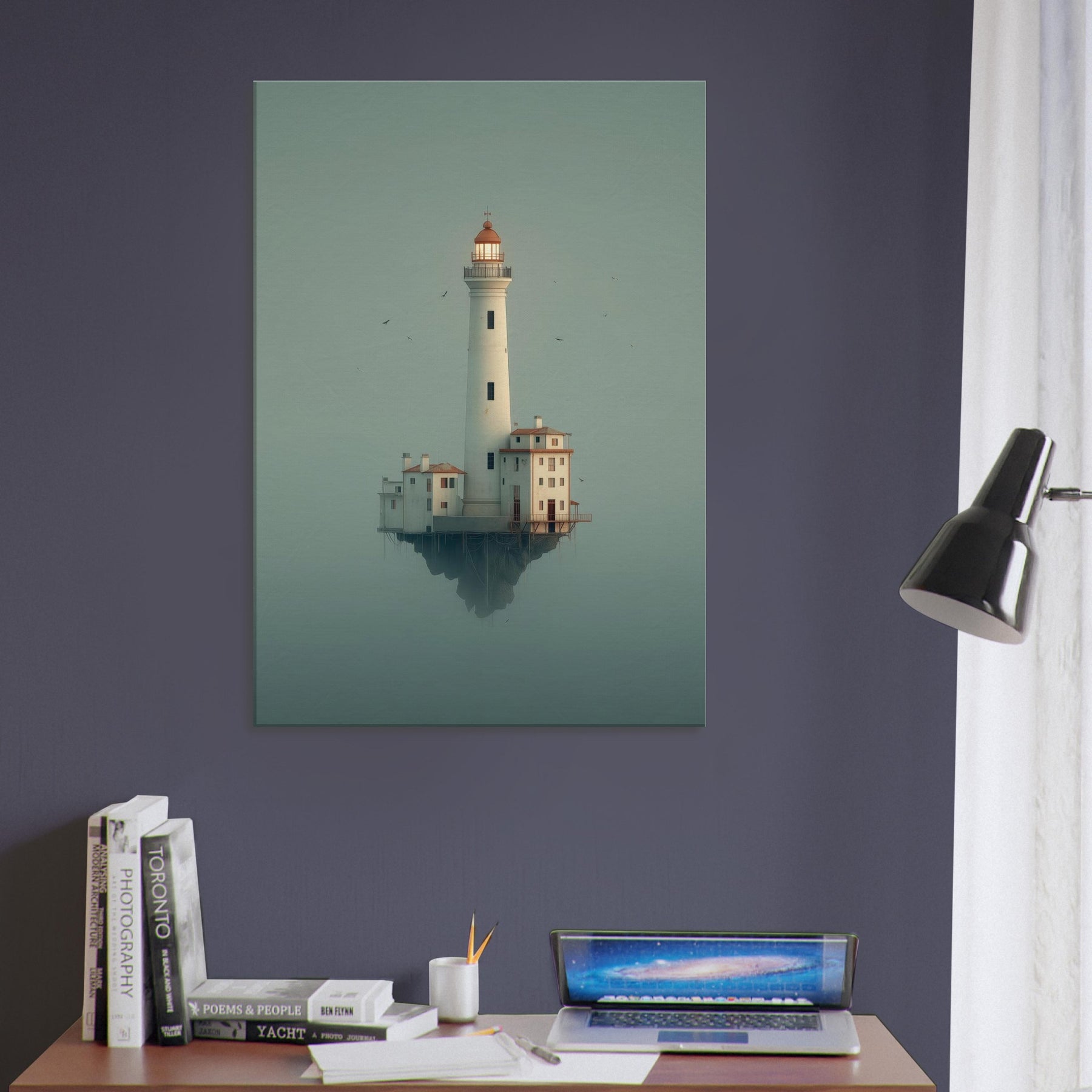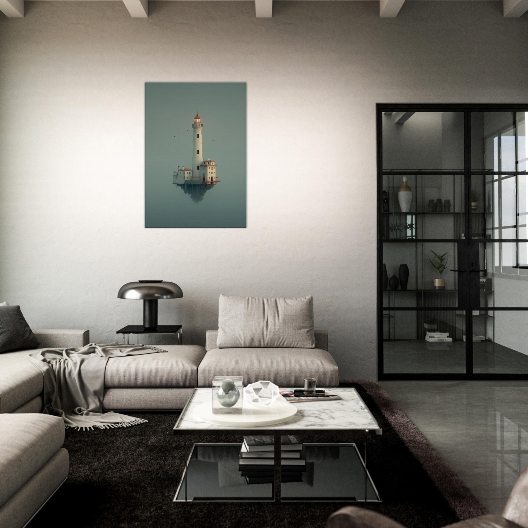 A solitary lighthouse hovers above a dreamlike island, its lantern softly scattering light across misty water and drifting city blocks. In this surreal scene, sea and skyline blend, inviting a calm, meditative mood that slows the pulse and expands the room. The Lighthouse becomes a quiet north star for living spaces, guiding conversations and quiet evenings alike. Printed with painterly detail and luminous tones, it adds a poetic focal point that pairs architectural irony with coastal serenity, perfect for a modern living space.