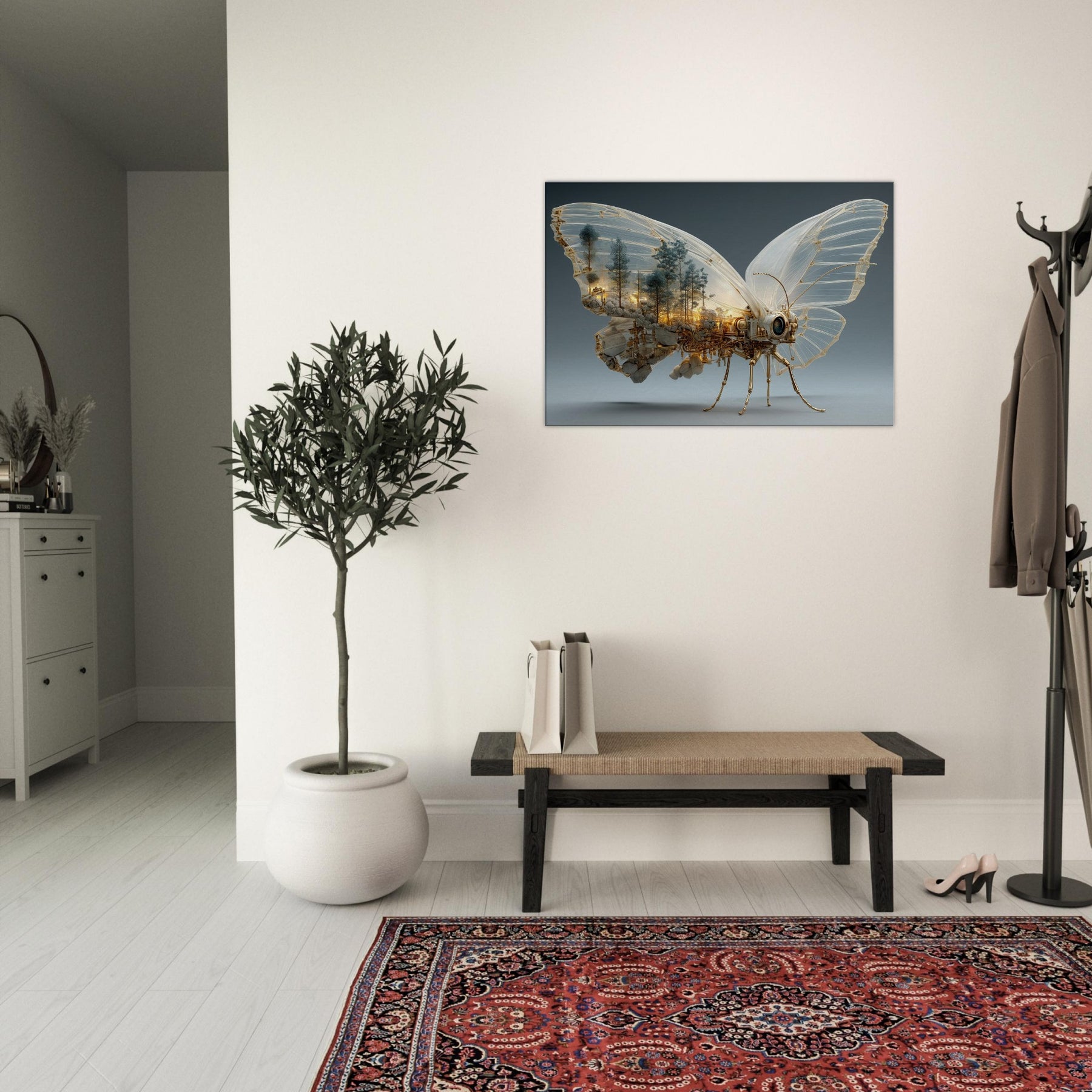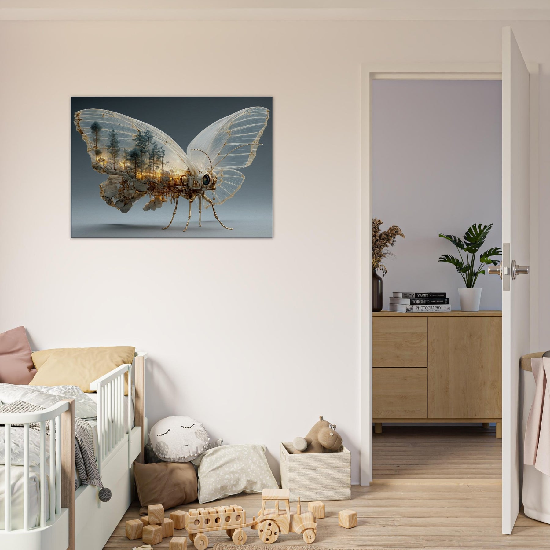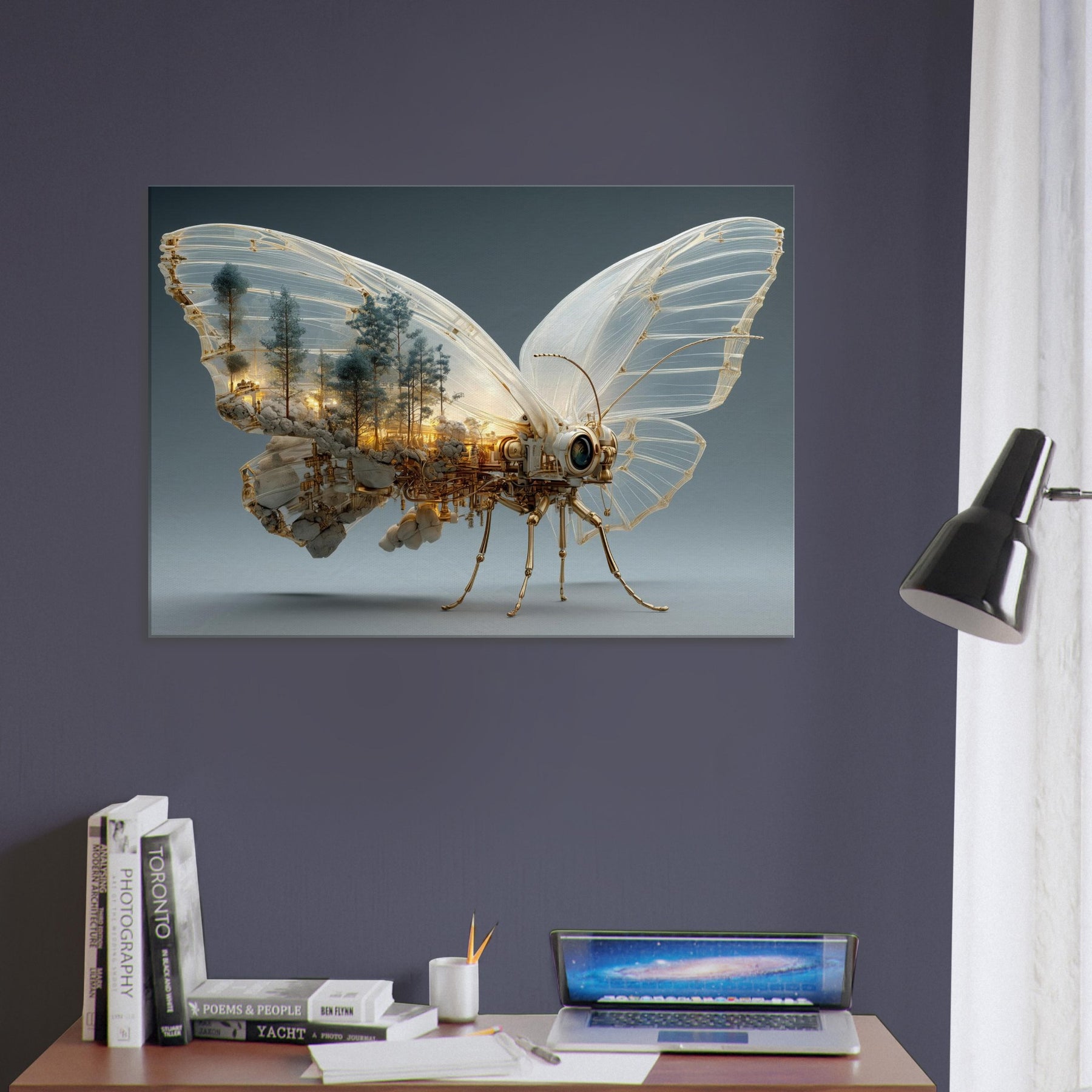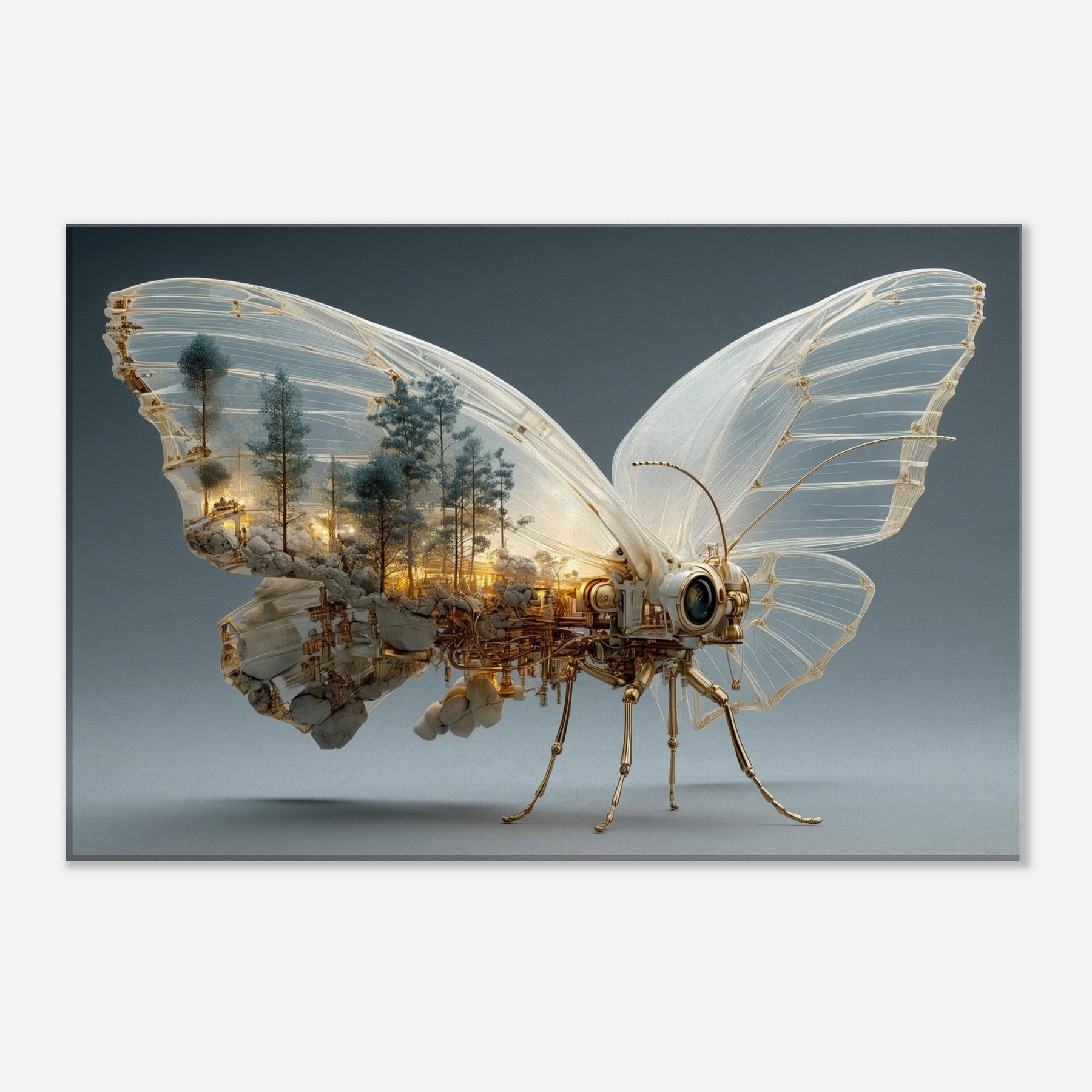 Within these glassy wings lies a city of amber light and pine, where nature and machinery entwine. This Butterfly unfurls a surreal body of copper filigree and steam the hush of trees becomes the hum of gears, and dawn glows through skylines carved from rock and light. Hang this piece to invite wonder and a gentle, cinematic mood, transforming a living room into a nocturne of balance between organic grace and industrial invention.