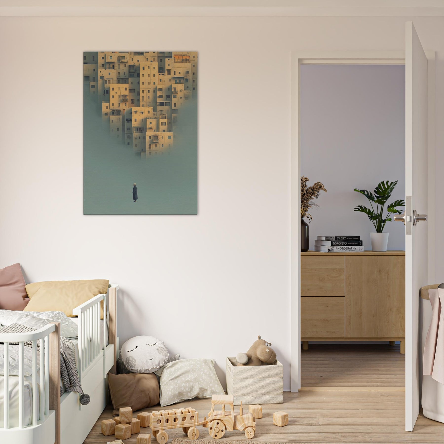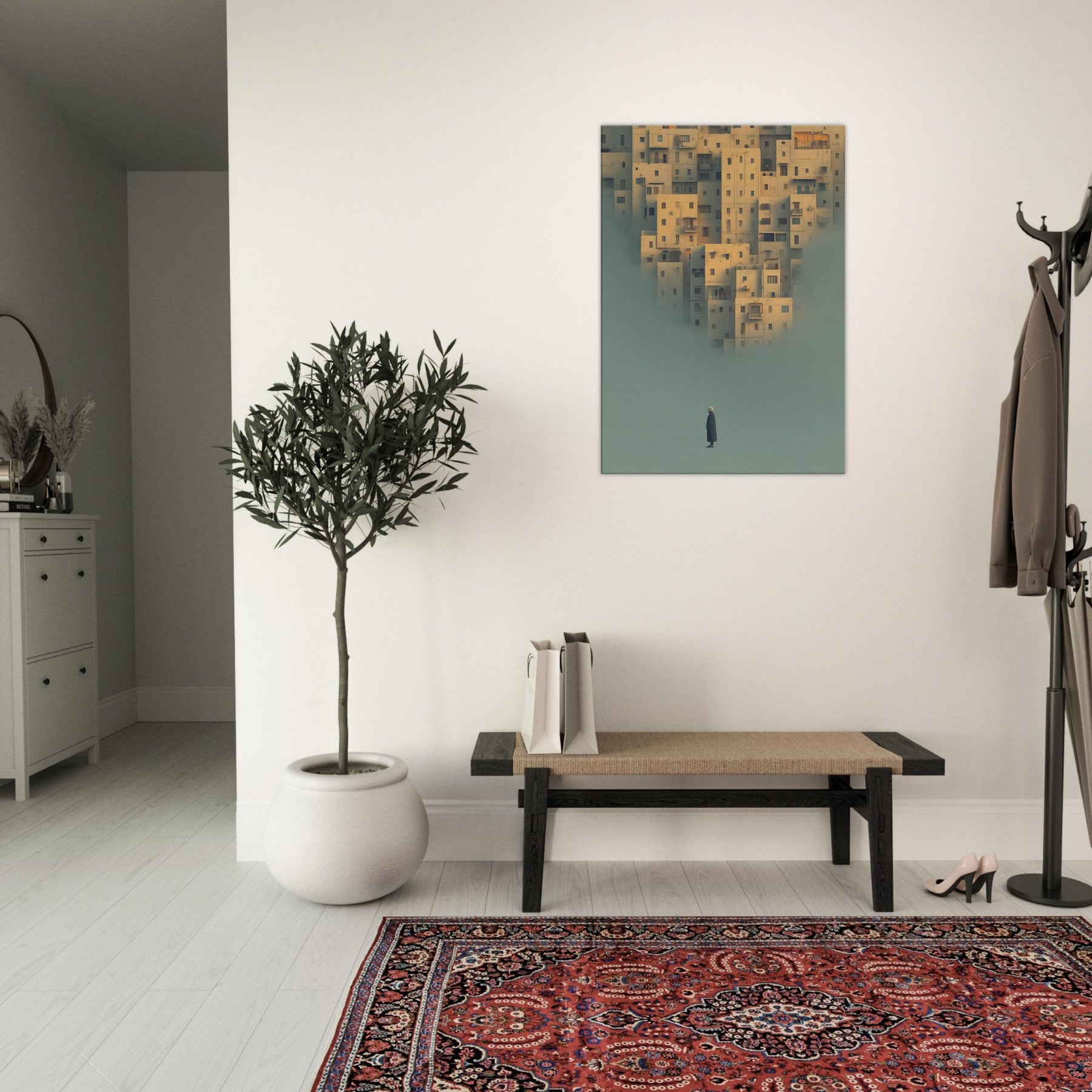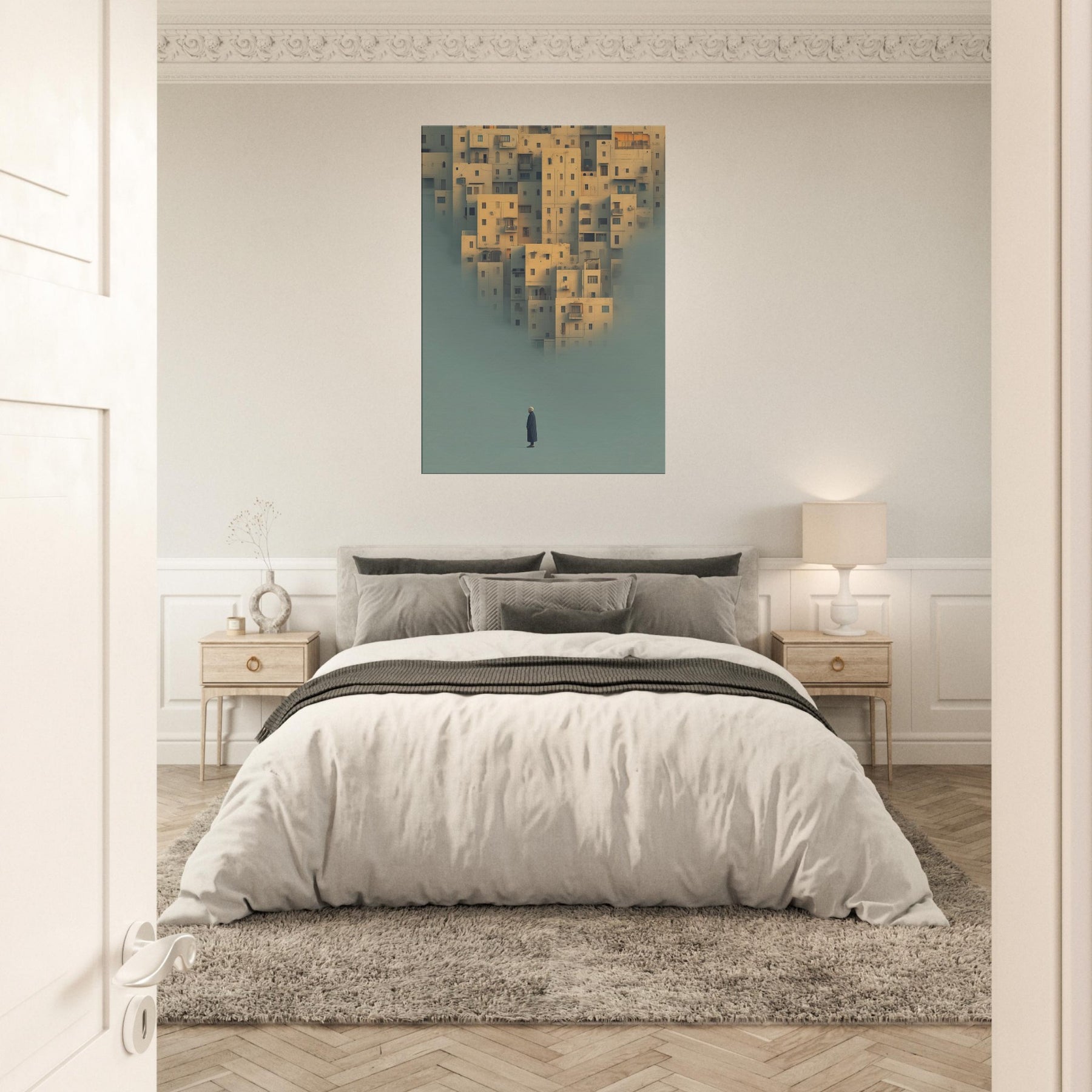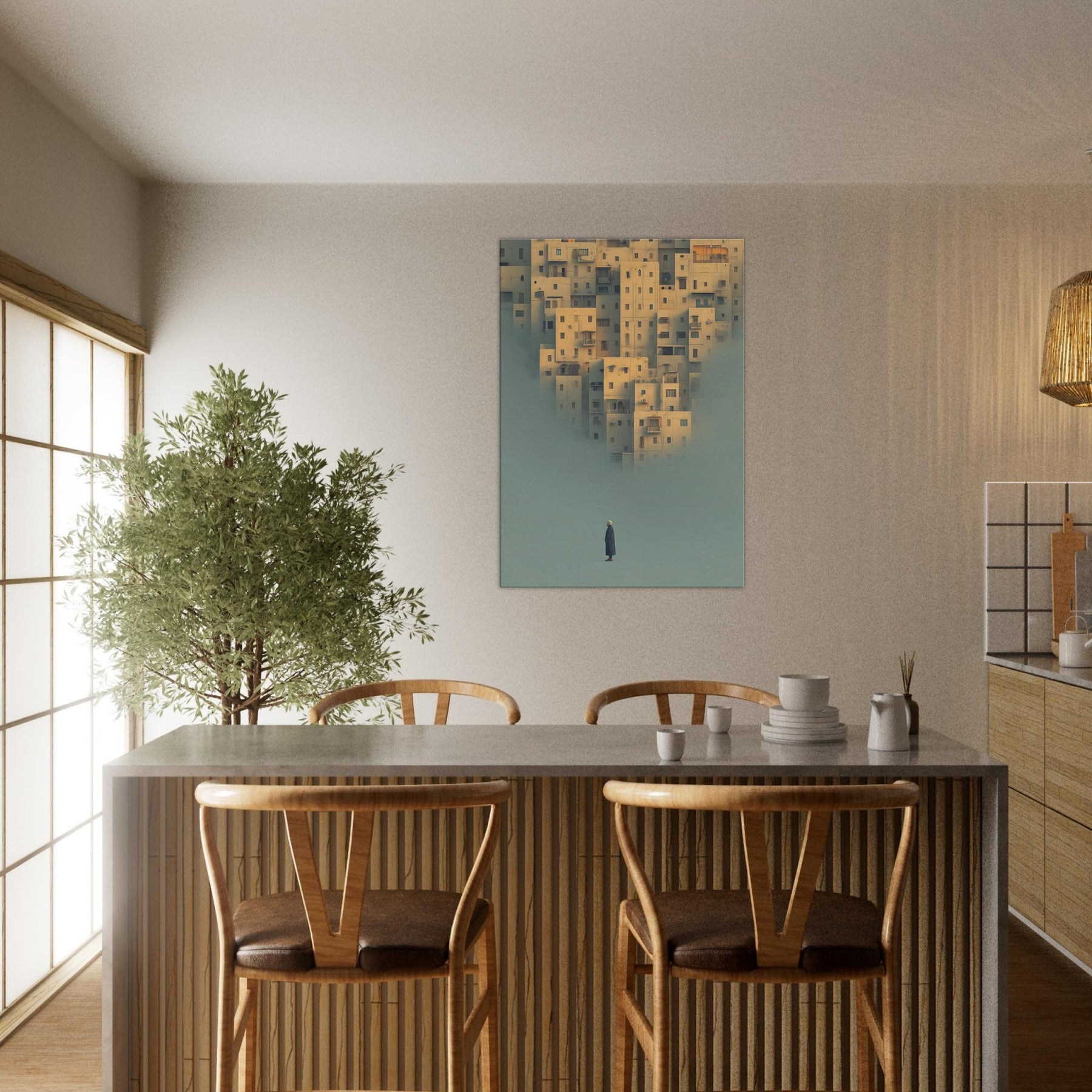 An ocean of sunlit facades rises like dream architecture, Marrakech unfolding in rhythm as pale fog pools at its base. Windows glow with memory, balconies drift, and stairways vanish into a quiet horizon. The scene threads surreal calm with urban texture, inviting you to linger in warmth and wonder. Hang this artwork in a living room or study to breathe drama and contemplative light into everyday life, turning walls into a doorway to wanderlust, memory, and the soft hum of distant markets.