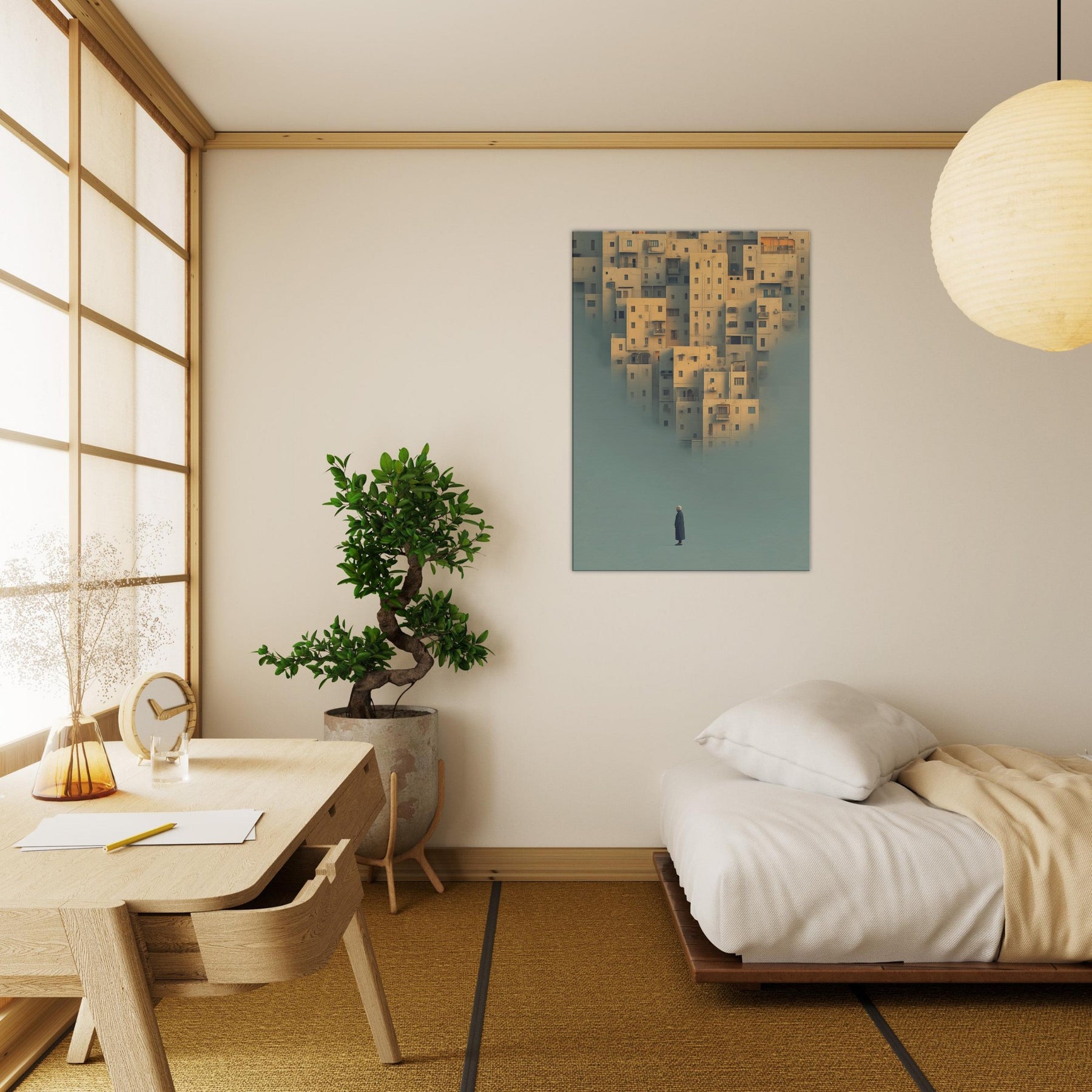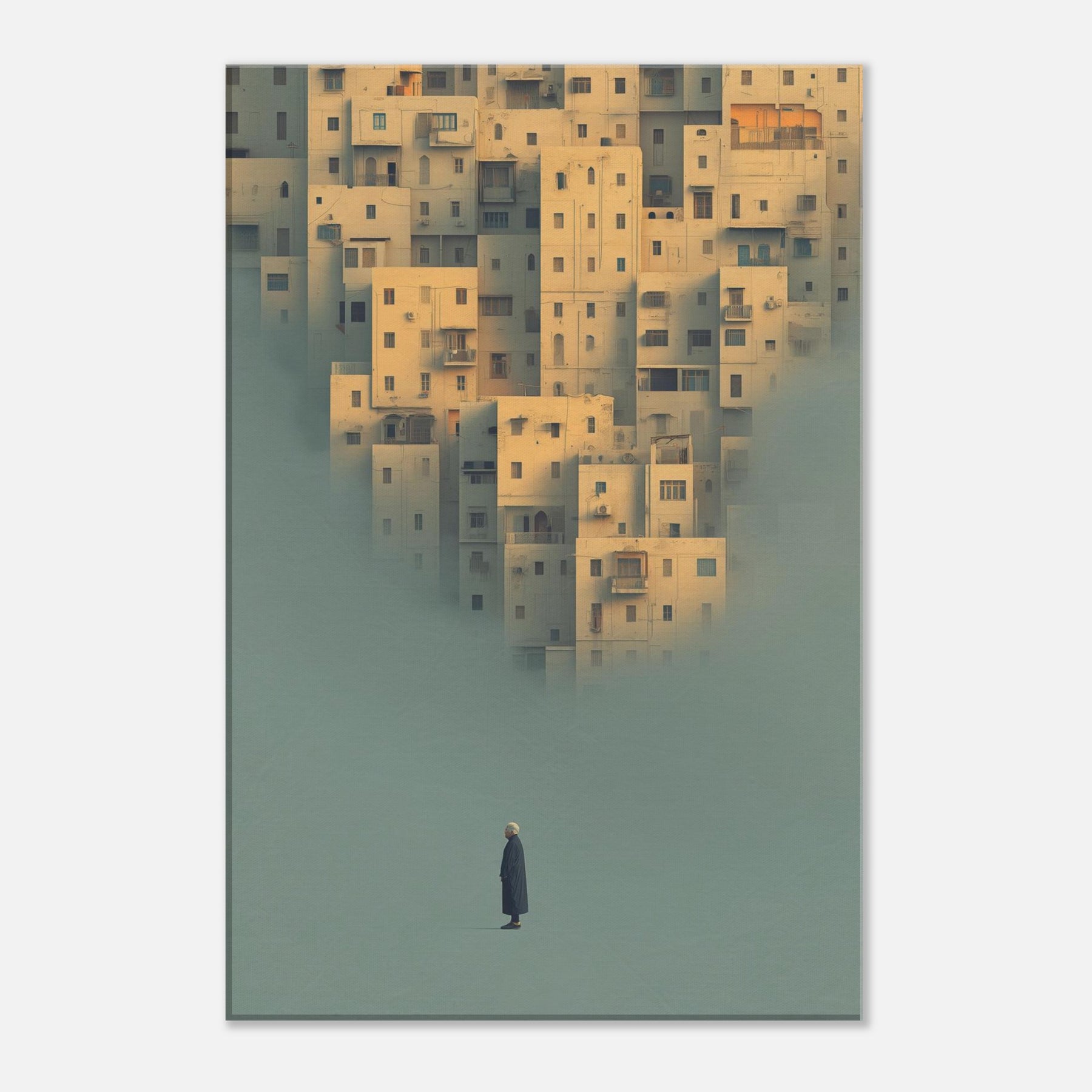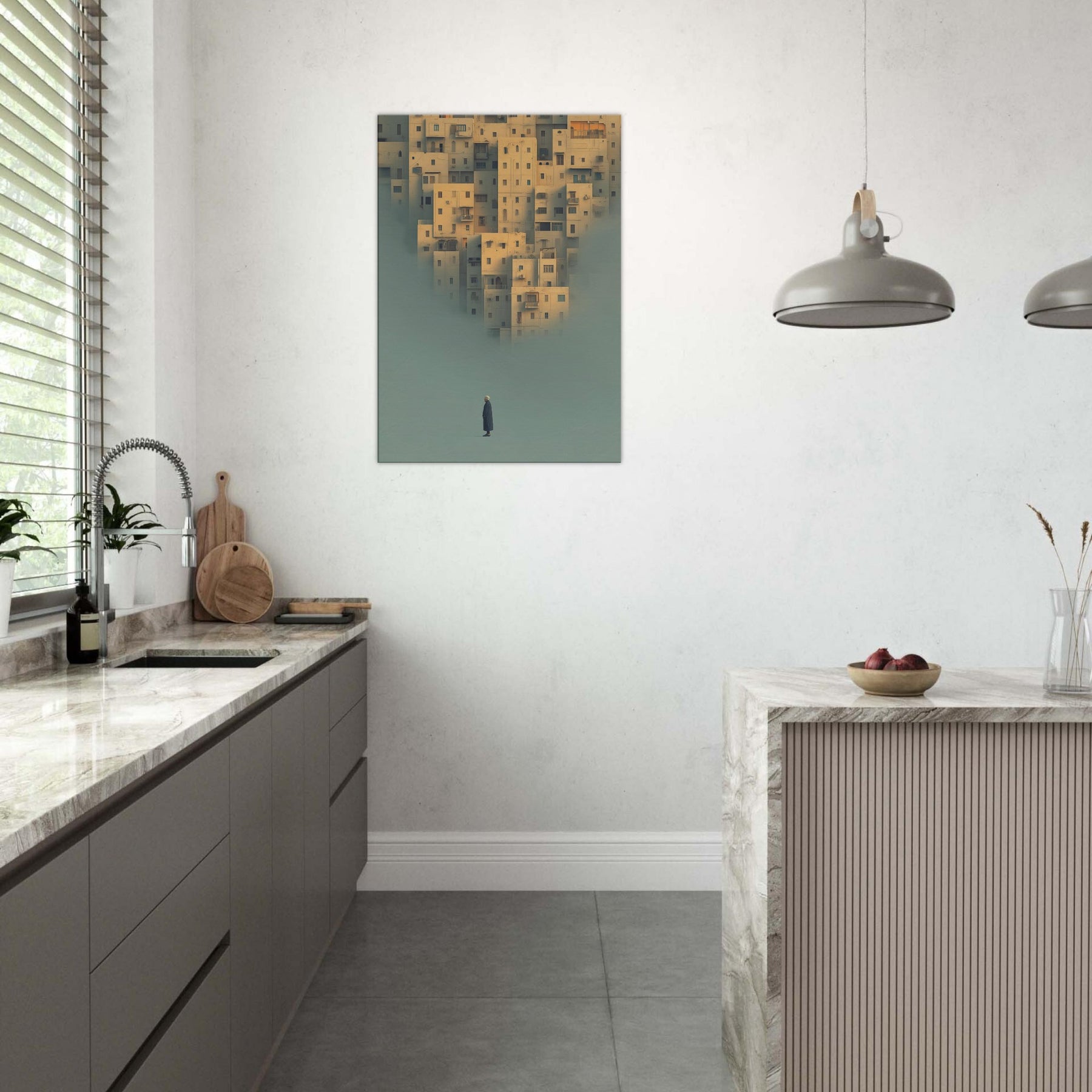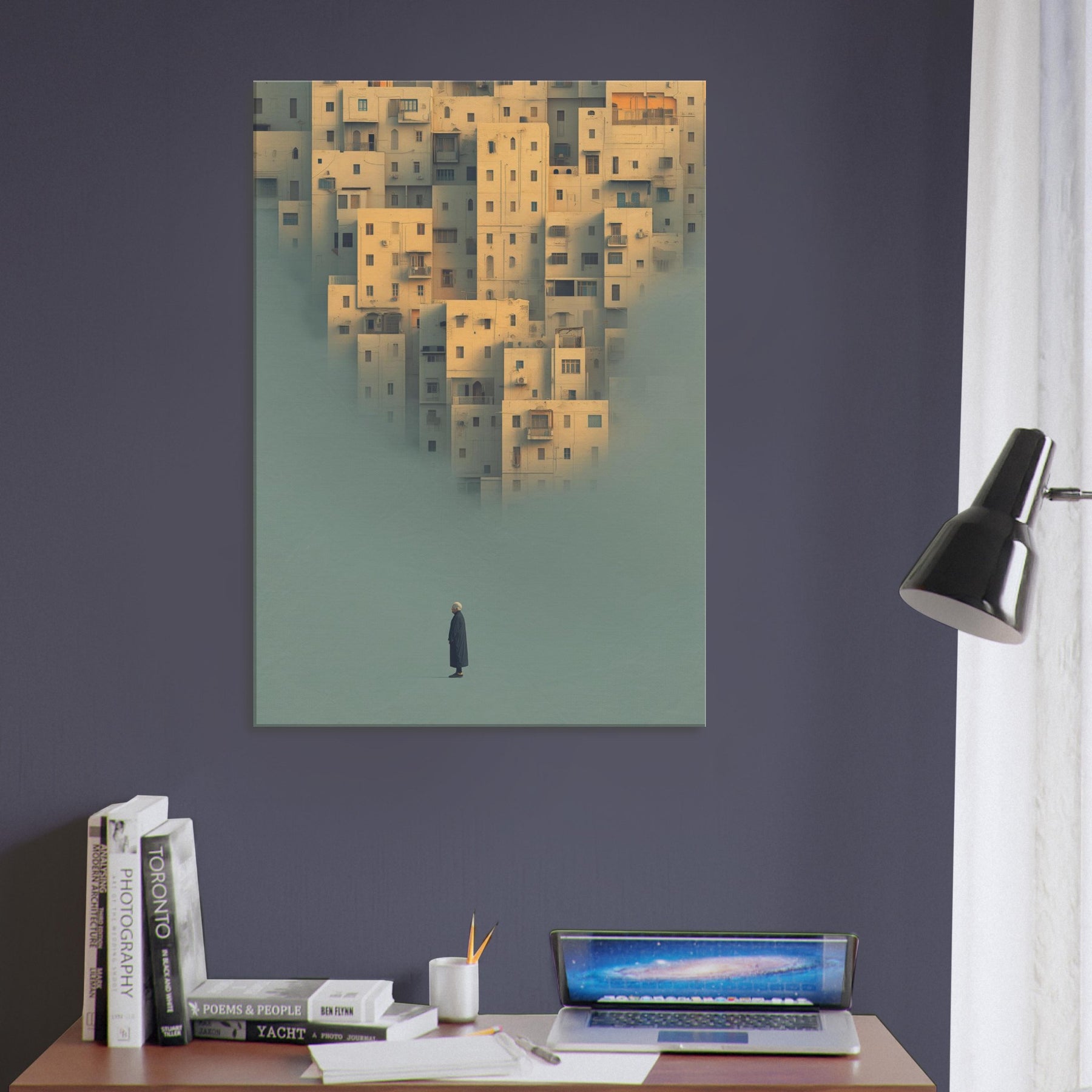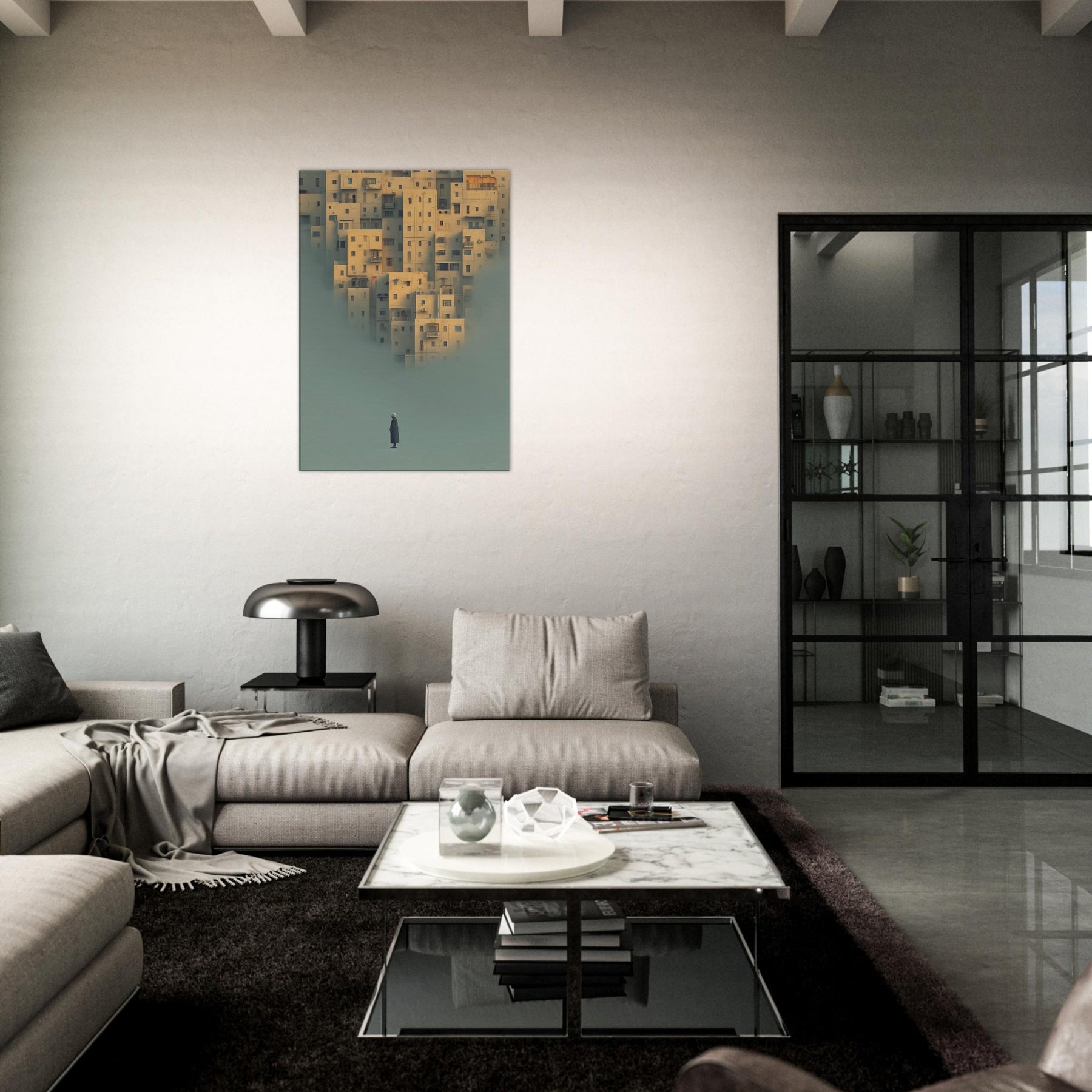 An ocean of sunlit facades rises like dream architecture, Marrakech unfolding in rhythm as pale fog pools at its base. Windows glow with memory, balconies drift, and stairways vanish into a quiet horizon. The scene threads surreal calm with urban texture, inviting you to linger in warmth and wonder. Hang this artwork in a living room or study to breathe drama and contemplative light into everyday life, turning walls into a doorway to wanderlust, memory, and the soft hum of distant markets.