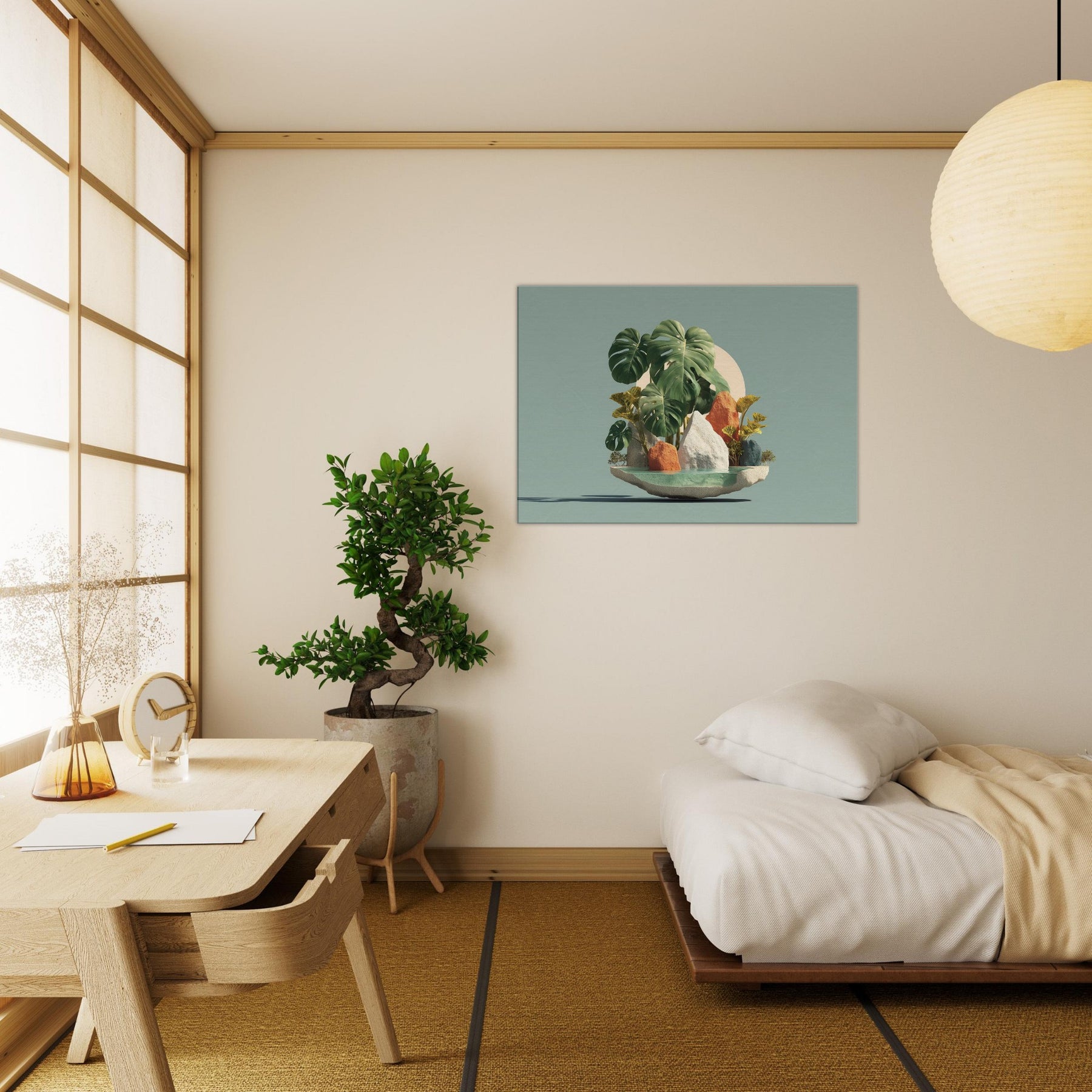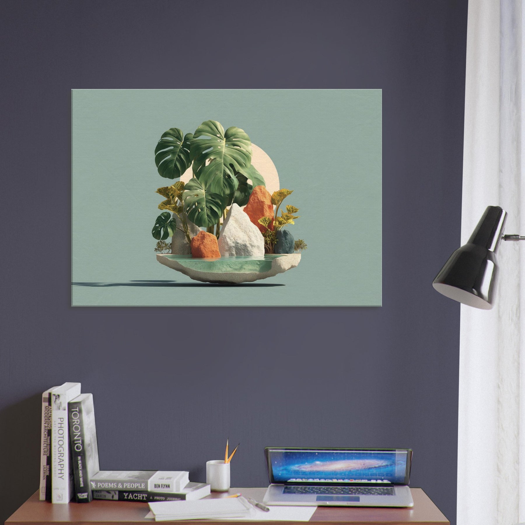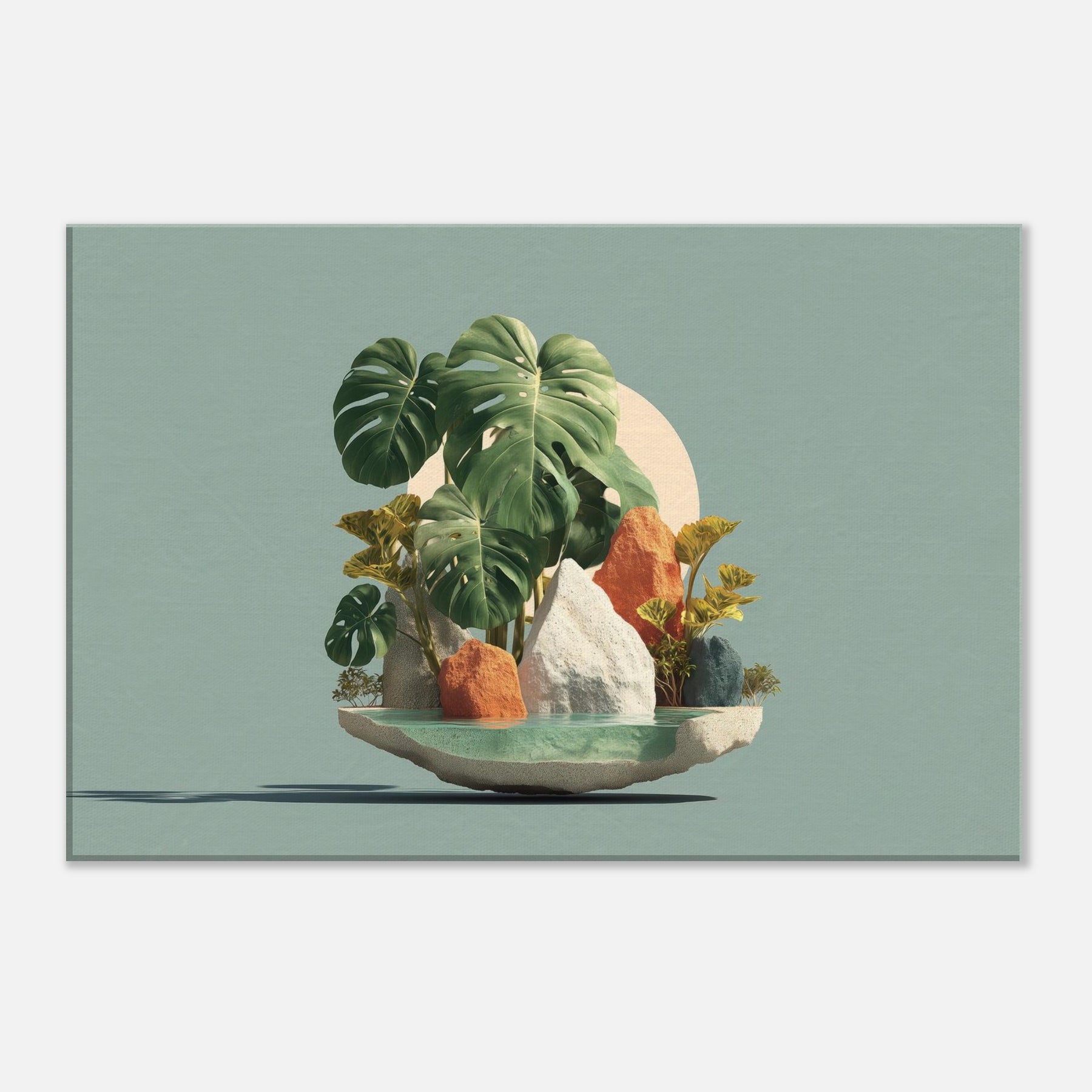 Monstera Between Sun and Stone invites the eye to drift into a dreamlike oasis where the leaves of a Monstera rise above carved boulders and a calm pool glints beneath a pale, setting sun. This surreal composition fuses tropical vitality with elemental quiet, turning any wall into a doorway to a private refuge. The palette verdant greens, warm ochres, and soft sands shimmers with a subtle glow, enriching living spaces with texture and breath. Let it anchor a room, guiding conversation and slow, luminous moments.