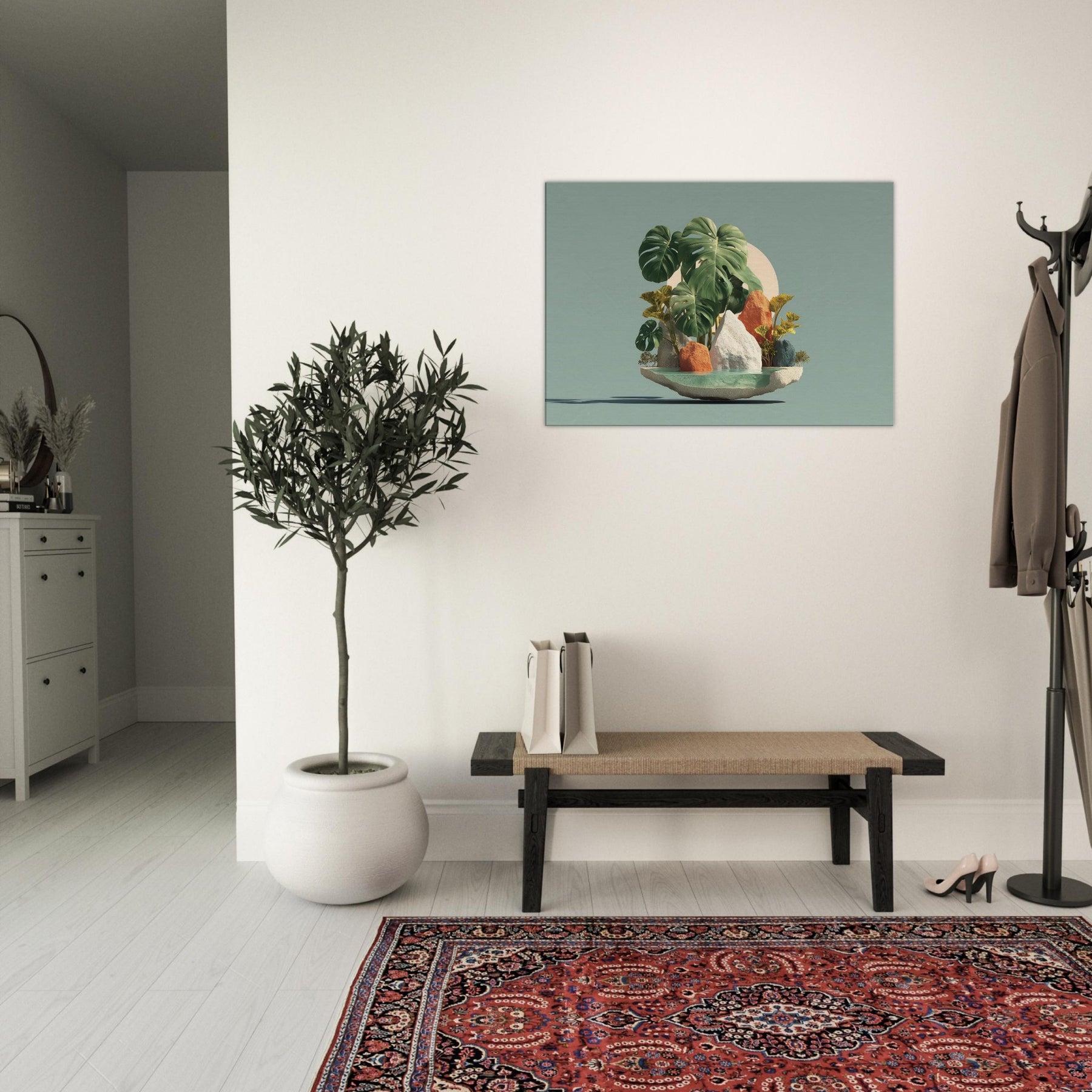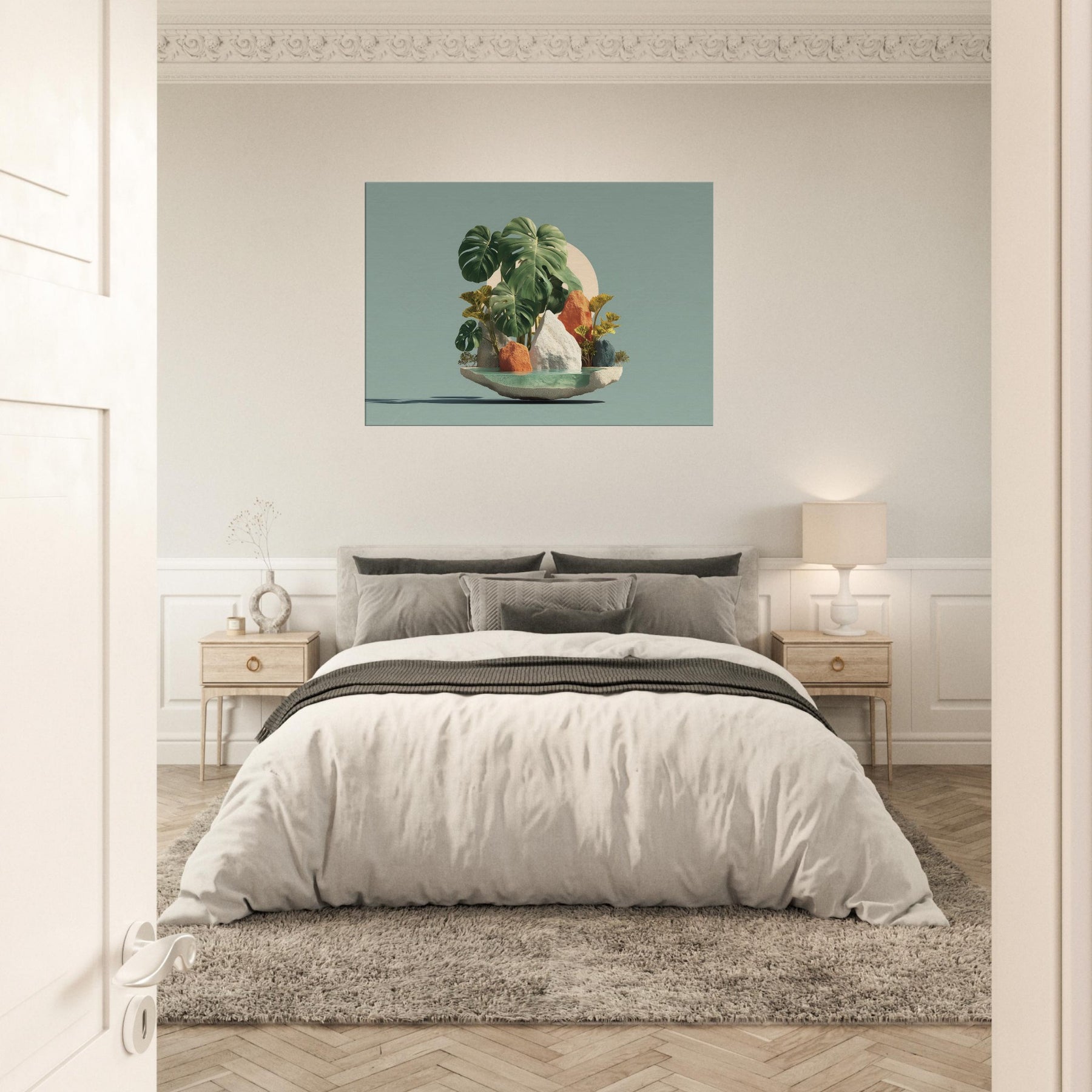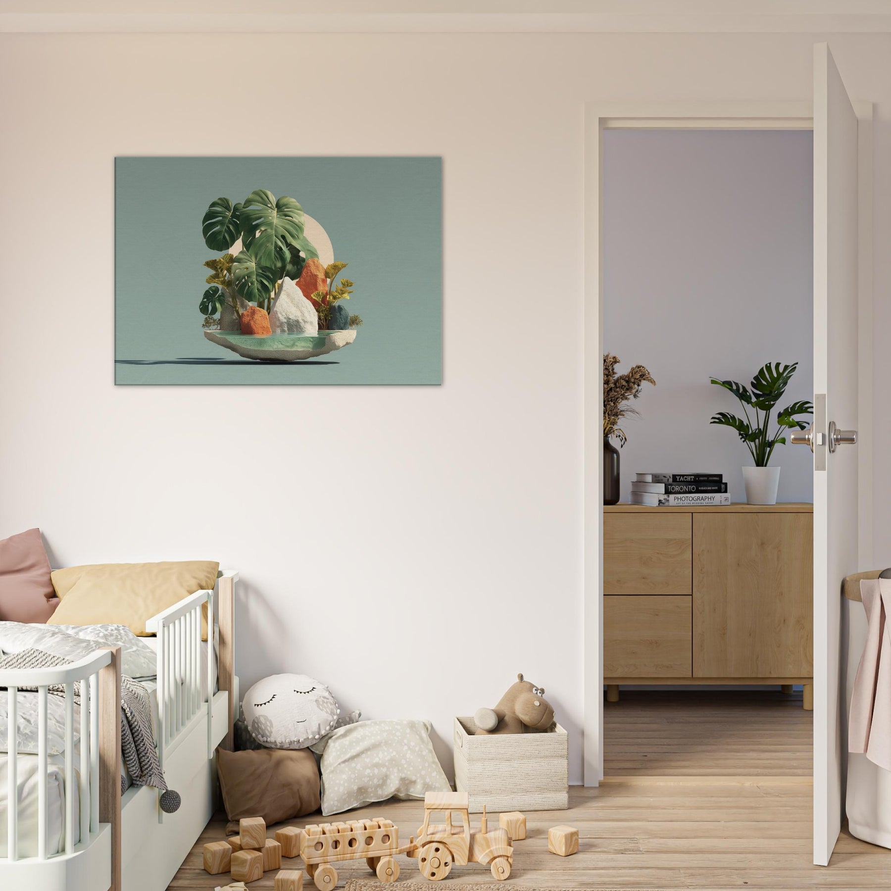 Monstera Between Sun and Stone invites the eye to drift into a dreamlike oasis where the leaves of a Monstera rise above carved boulders and a calm pool glints beneath a pale, setting sun. This surreal composition fuses tropical vitality with elemental quiet, turning any wall into a doorway to a private refuge. The palette verdant greens, warm ochres, and soft sands shimmers with a subtle glow, enriching living spaces with texture and breath. Let it anchor a room, guiding conversation and slow, luminous moments.