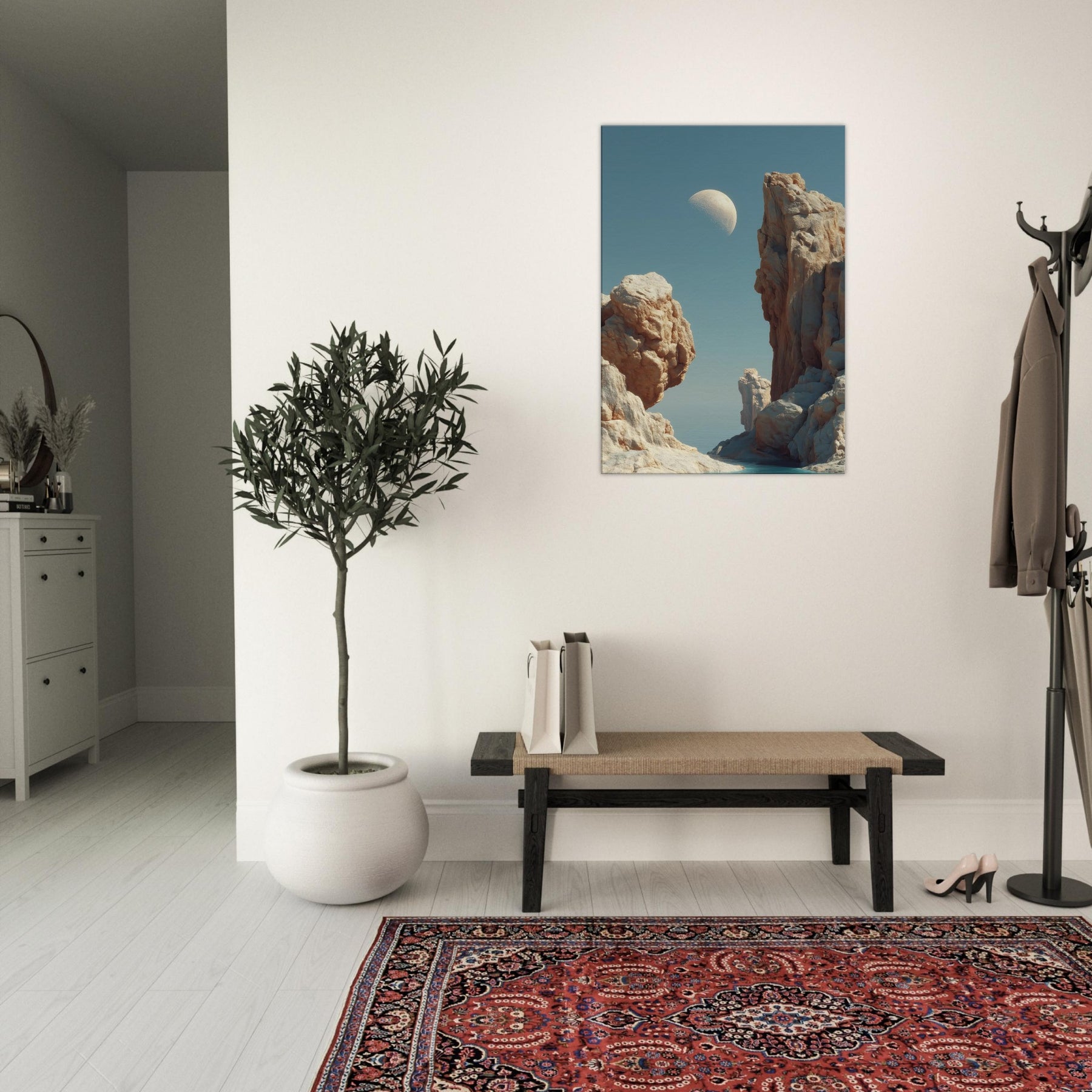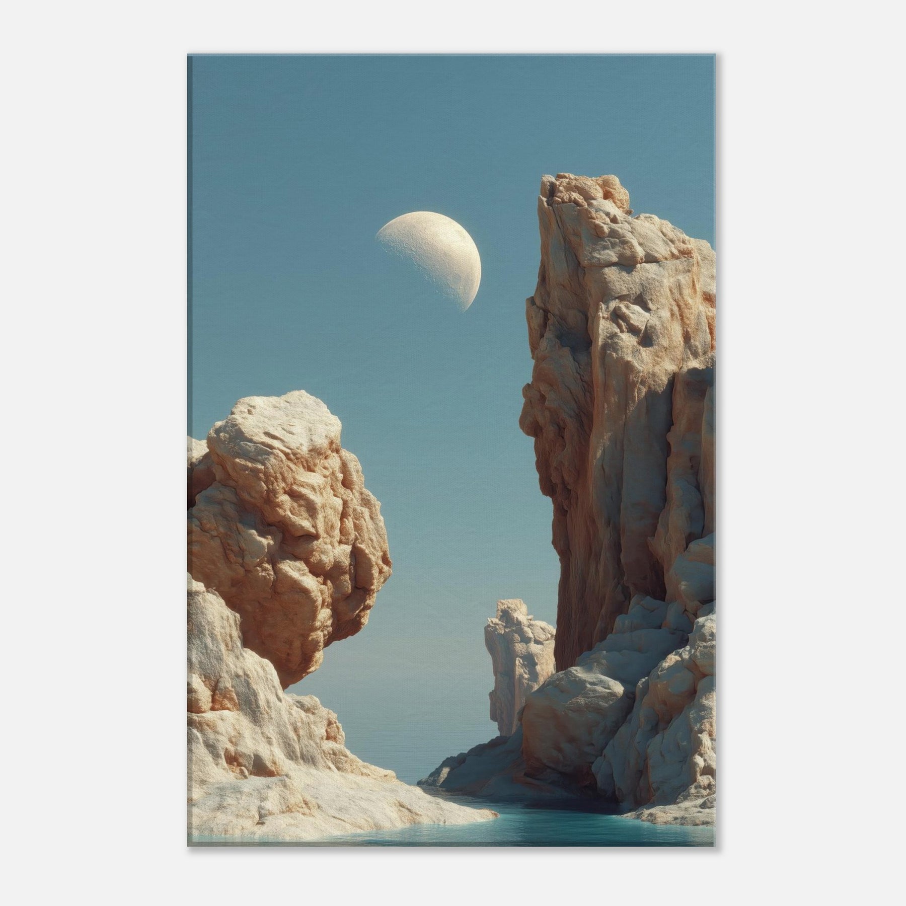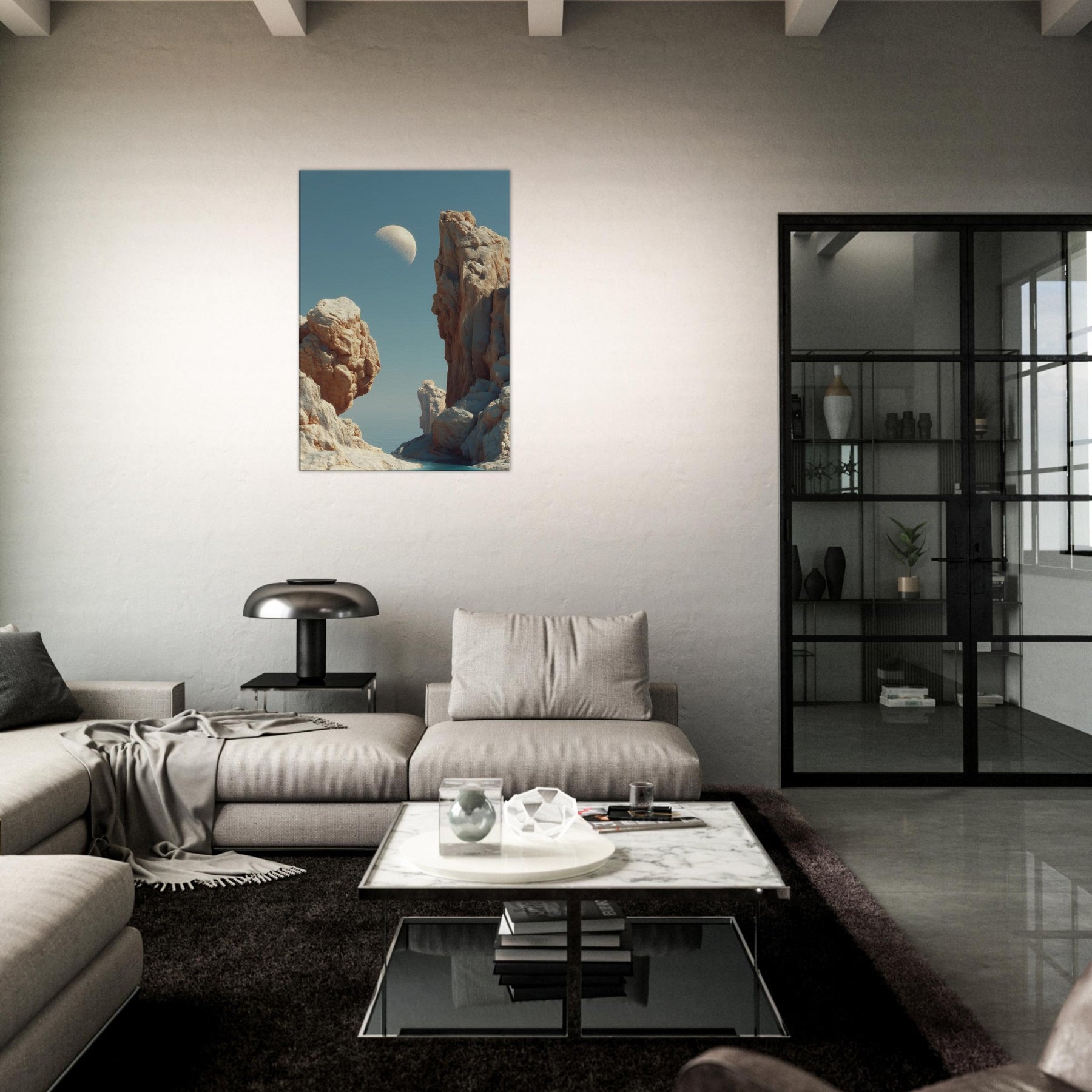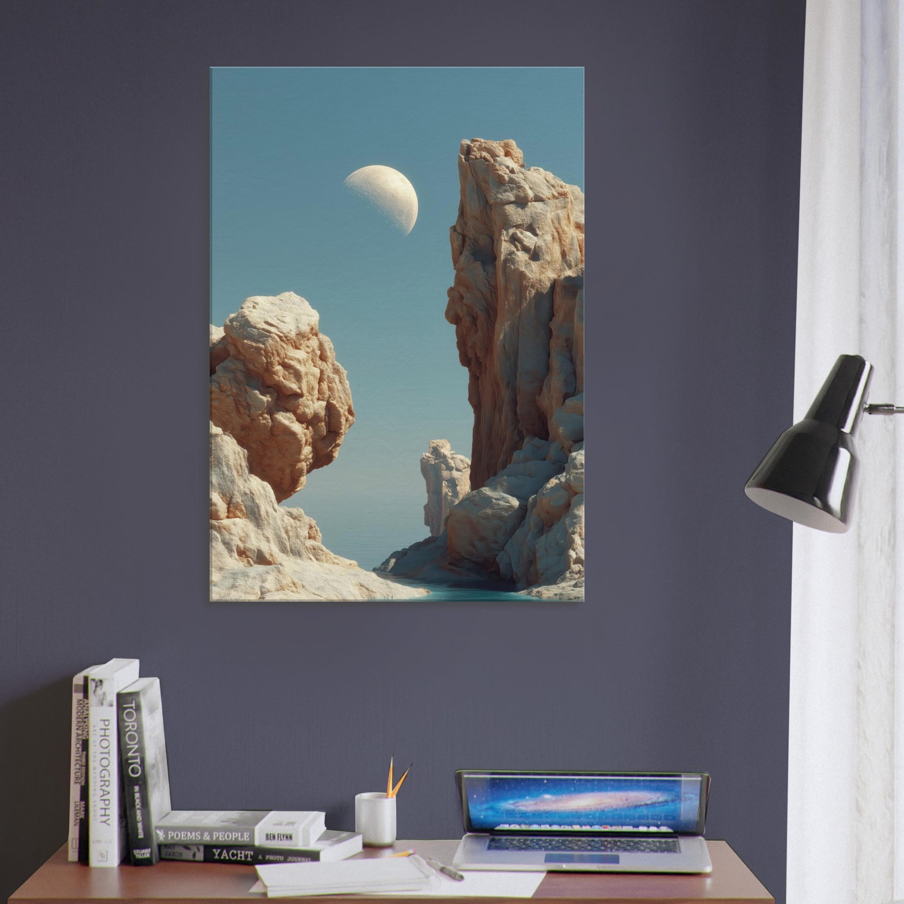 Let the quiet drama of the cliffs unfold in your room. This Surrealism inspired composition opens a window to a moonlit coastline where jagged sentinels cradle the pale sea. The atmosphere blends sharp, sun warmed stone with a dreamlike sky, inviting contemplation and conversation. A sense of scale and mystery drifts into any living space, turning everyday moments into a ritual of stillness. Hang it where you linger hallway light, above a sofa, or beside a reading chair and let the room breathe with awe.