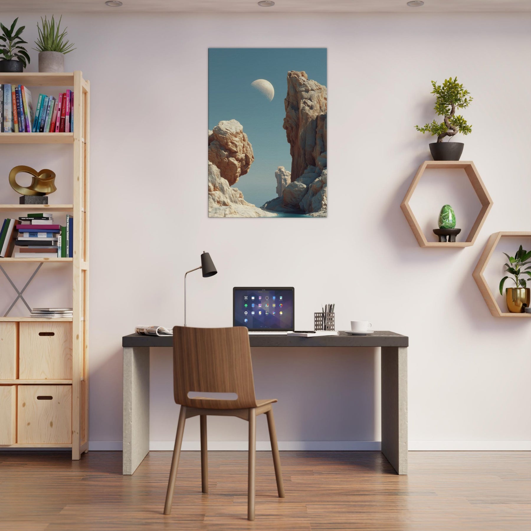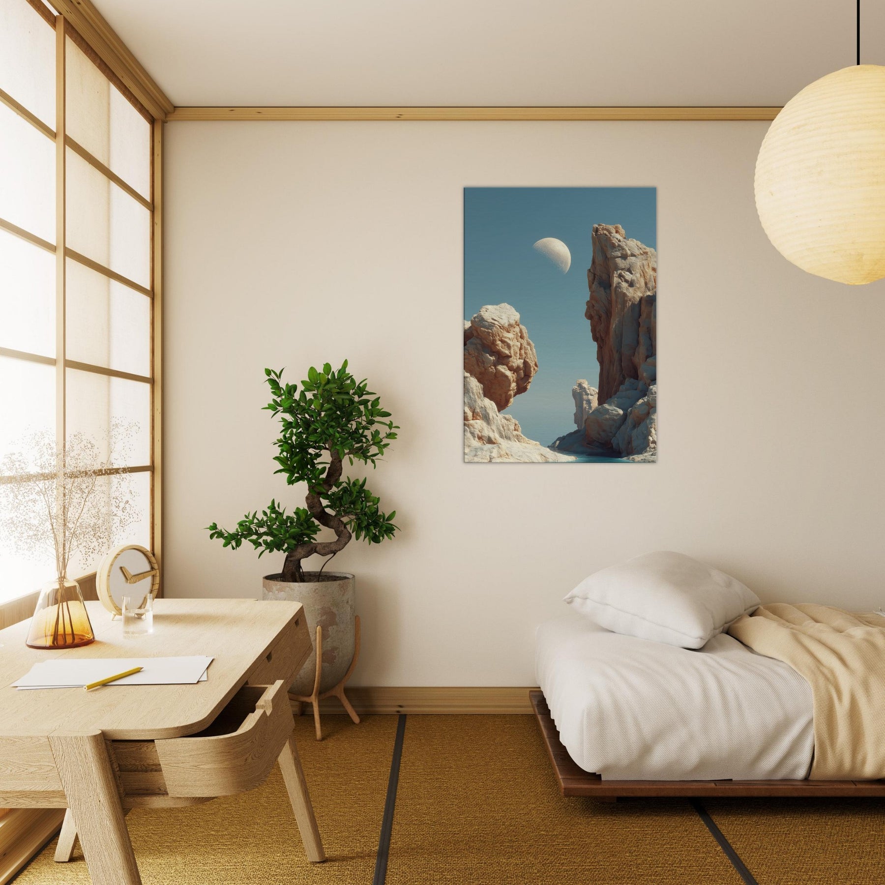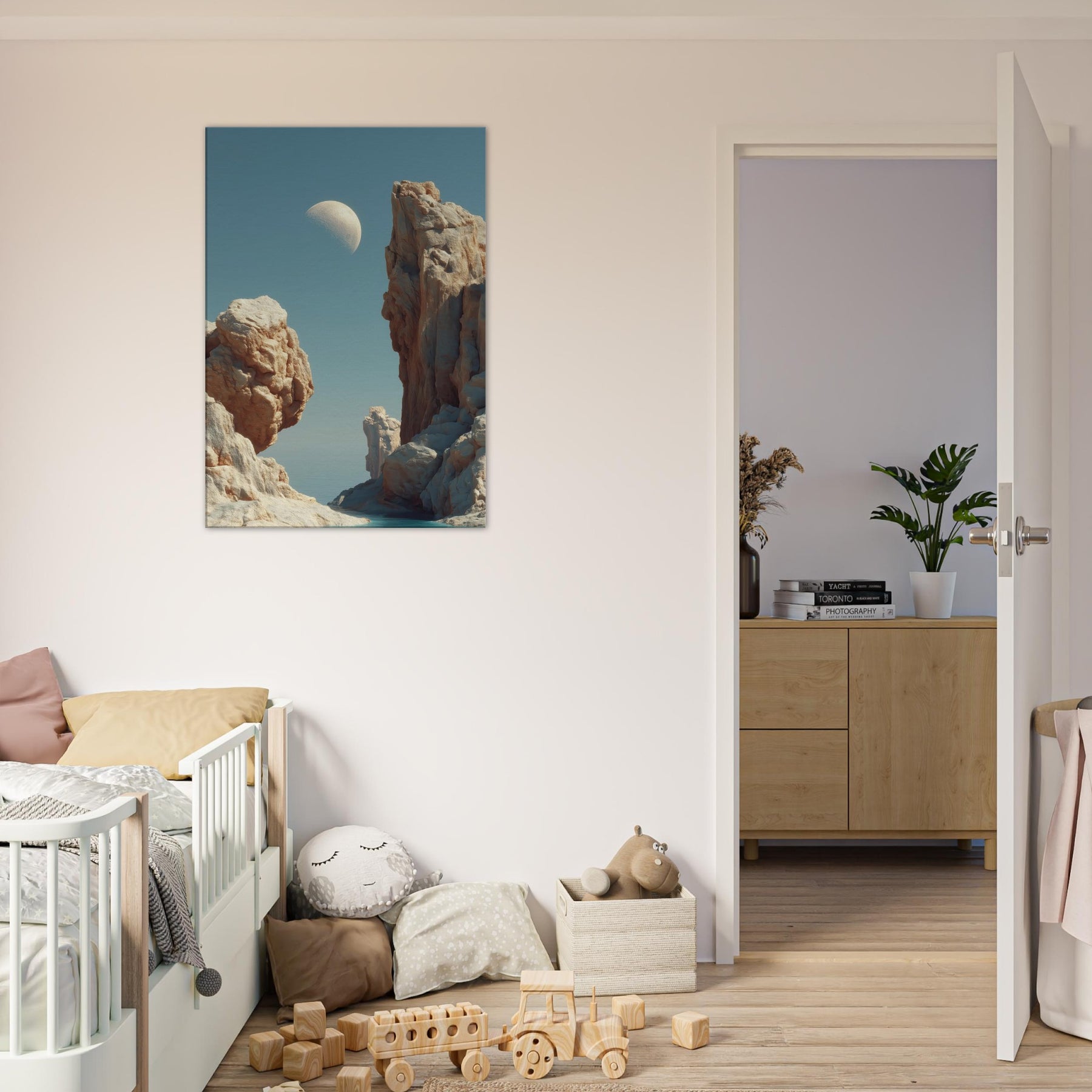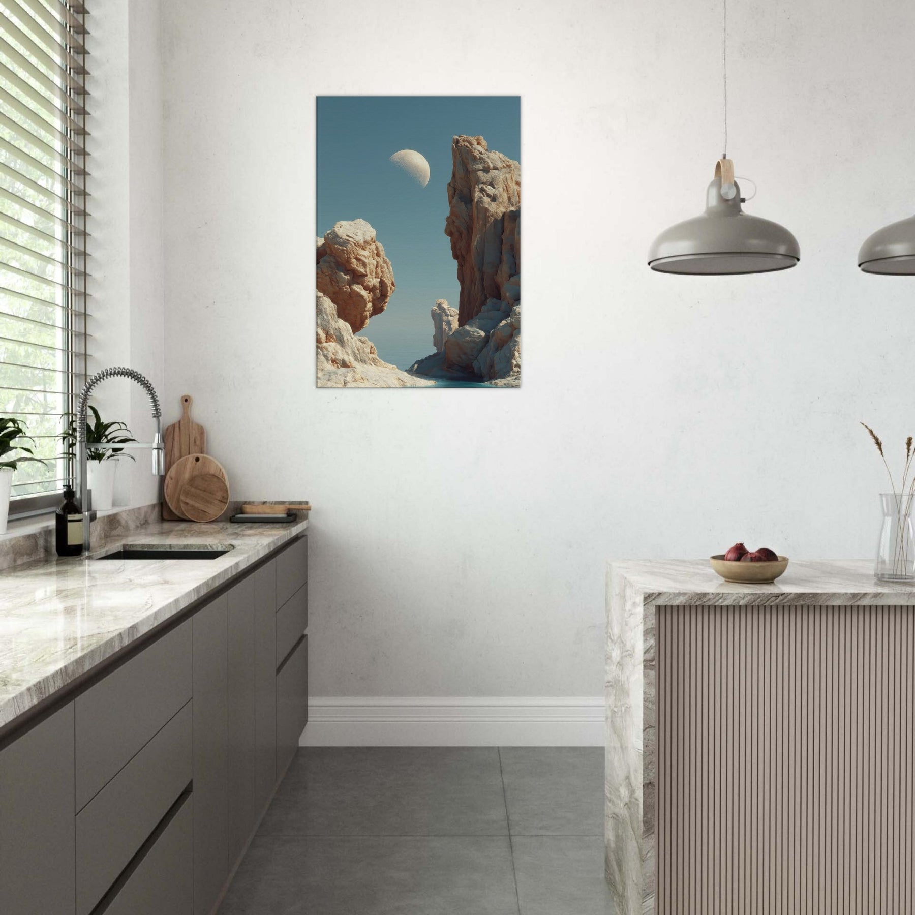 Let the quiet drama of the cliffs unfold in your room. This Surrealism inspired composition opens a window to a moonlit coastline where jagged sentinels cradle the pale sea. The atmosphere blends sharp, sun warmed stone with a dreamlike sky, inviting contemplation and conversation. A sense of scale and mystery drifts into any living space, turning everyday moments into a ritual of stillness. Hang it where you linger hallway light, above a sofa, or beside a reading chair and let the room breathe with awe.