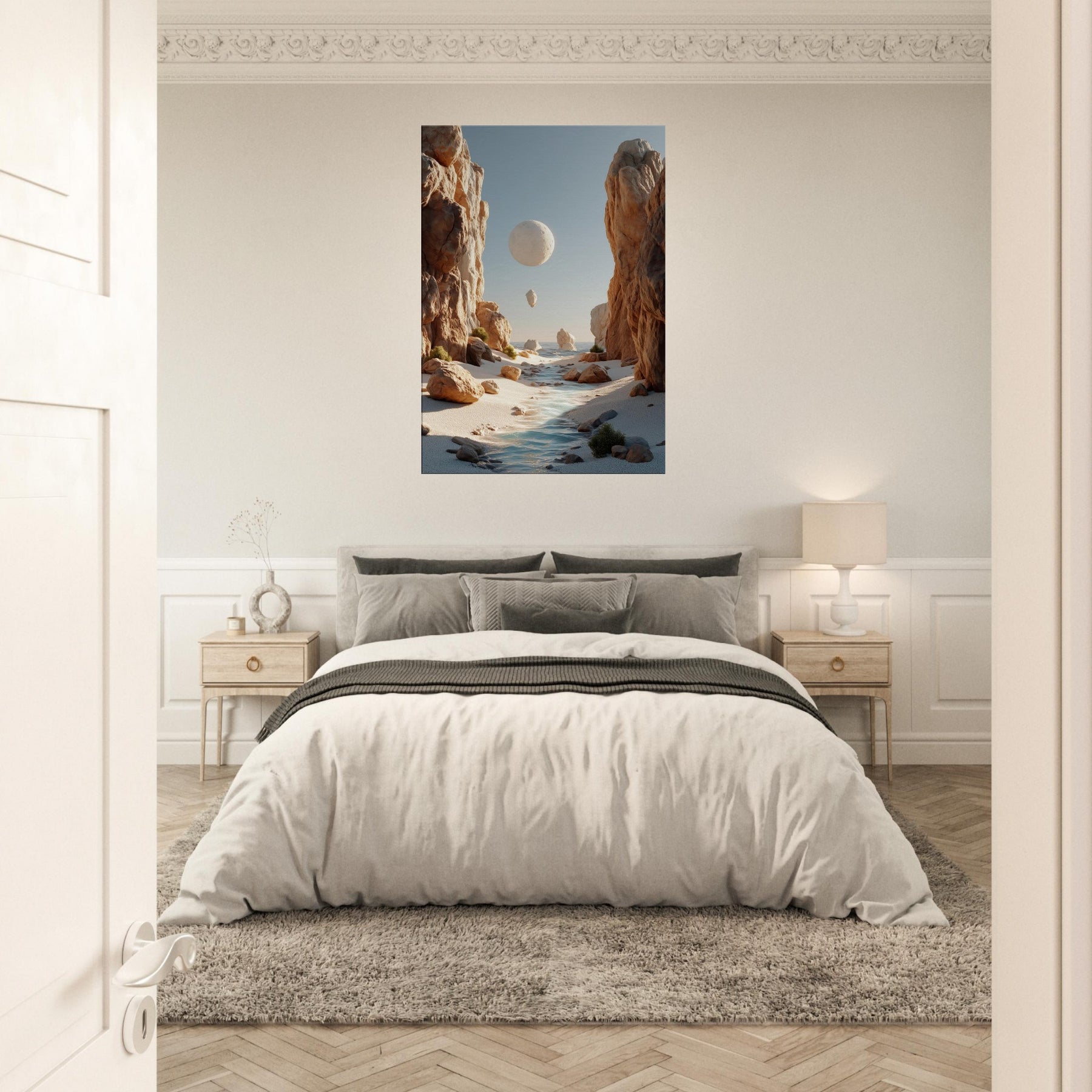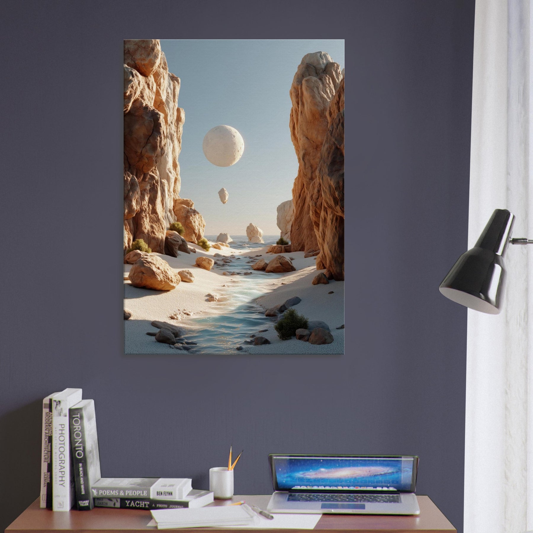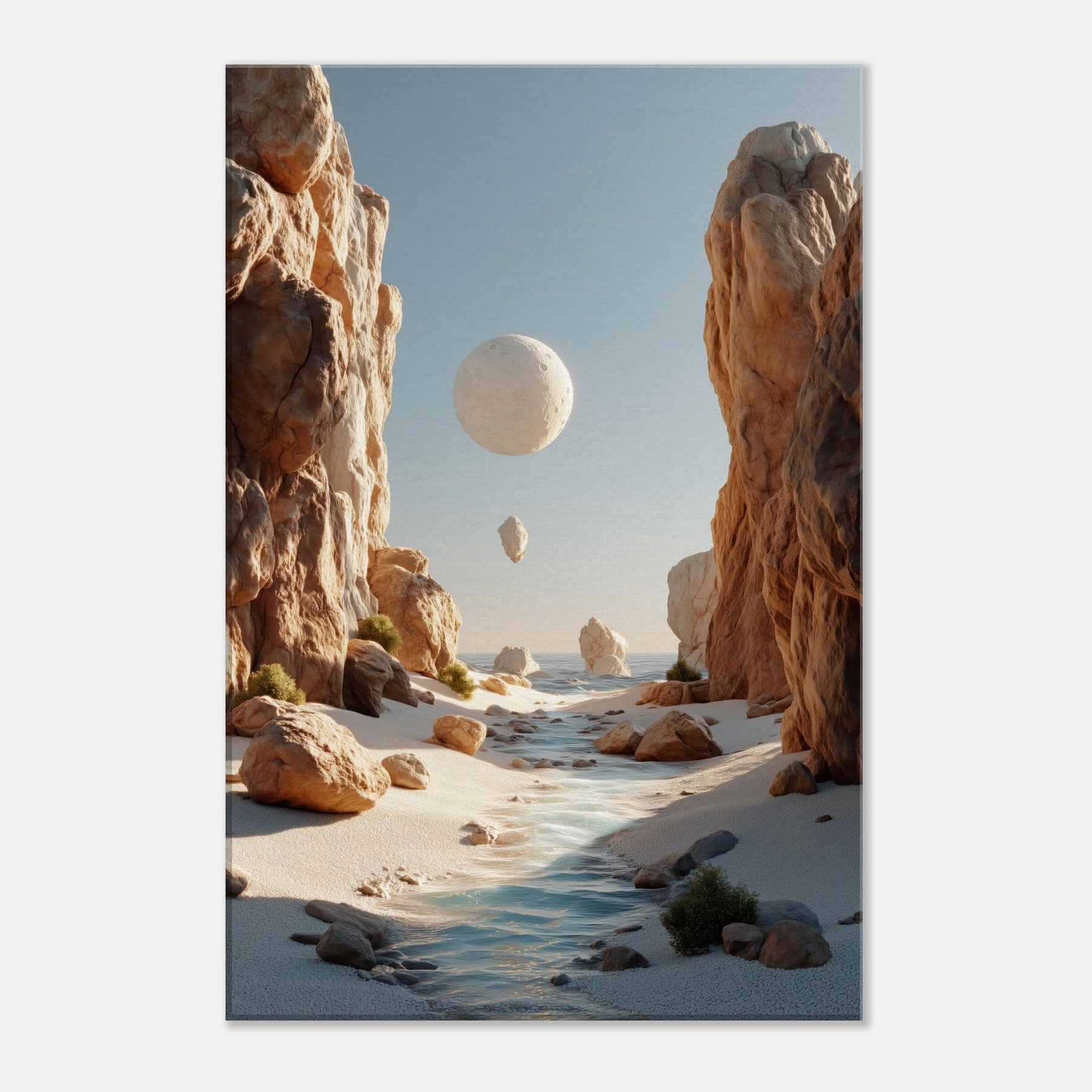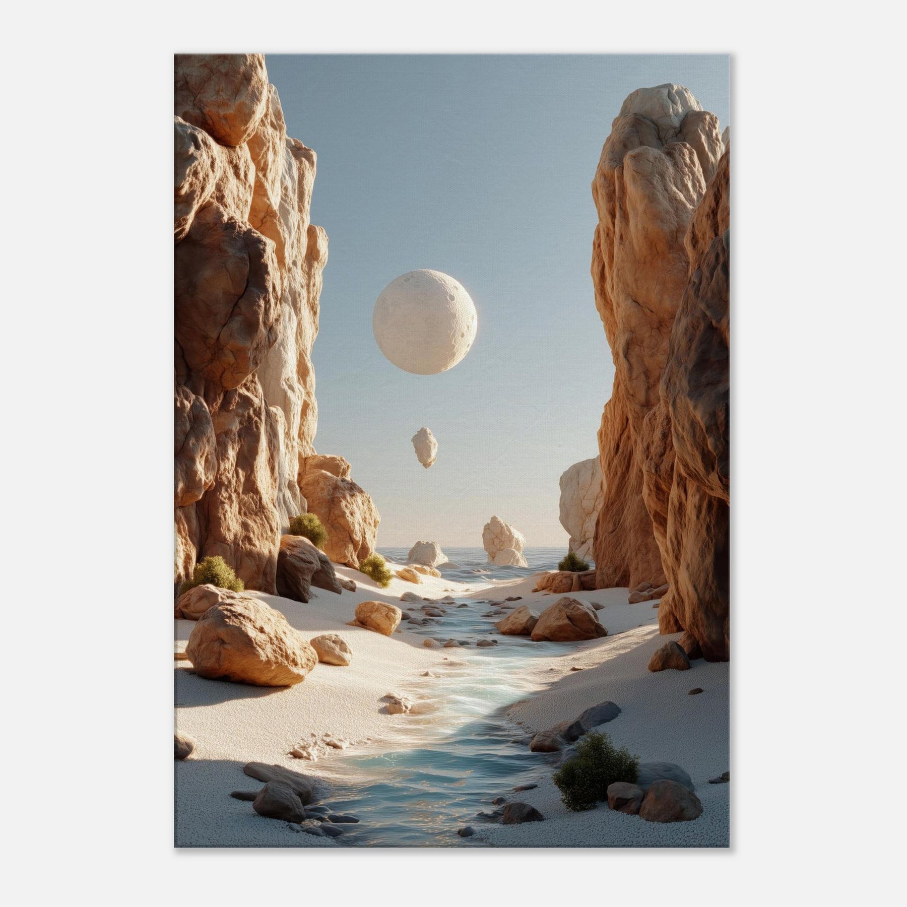 An otherworldly Canyon unfolds where cliffs cradle a pale moon, a river of light threading between warm boulders. This surreal invites quiet reflection, a momentary escape from the bustle of daily life. The soft palette of desert blush, ash, and sea kissed blues bathes your space in calm, encouraging slow pauses and conversations that drift like the floating orb above. Hang this piece to evoke spaciousness, wonder, and a daily reminder that beauty can tilt the world toward poetry.