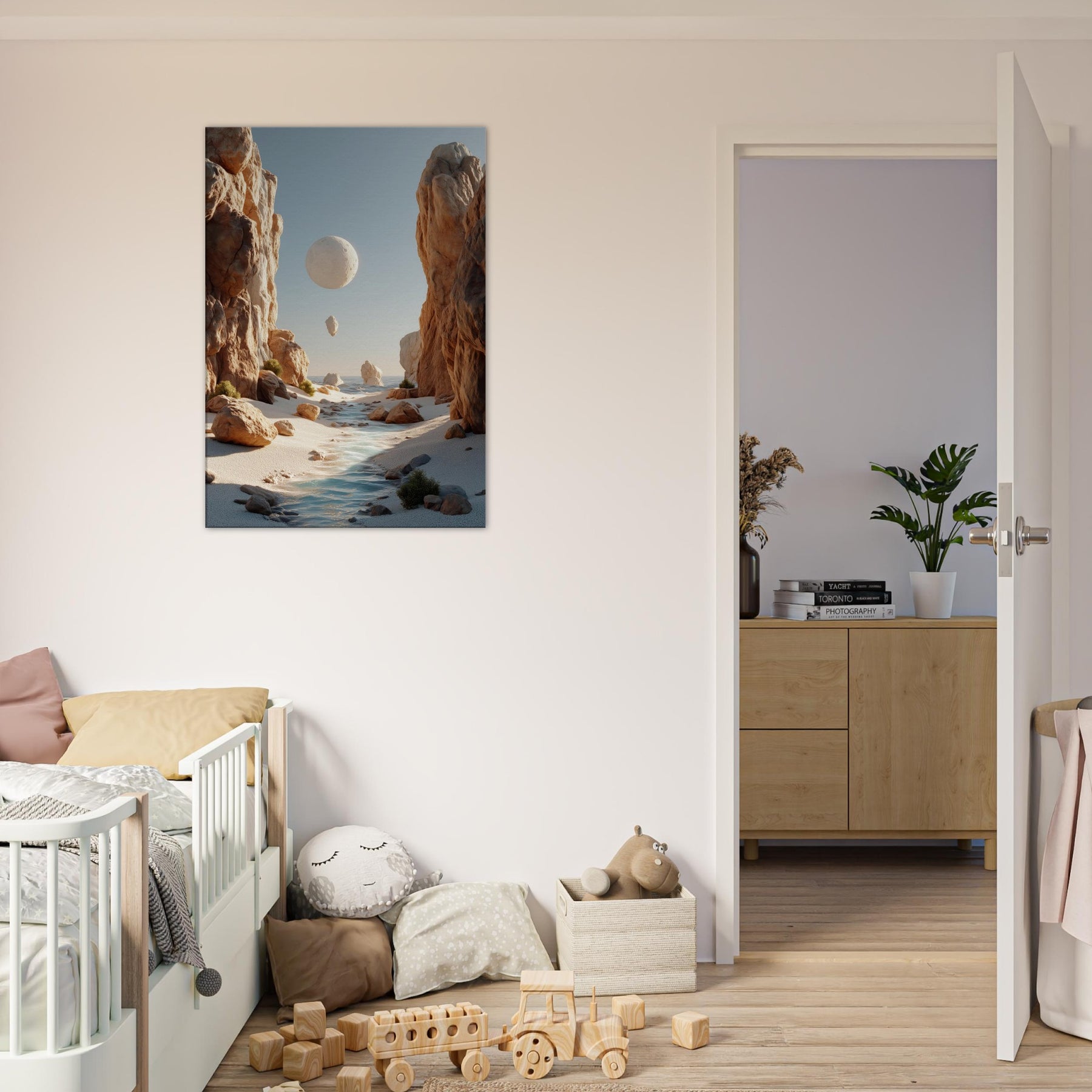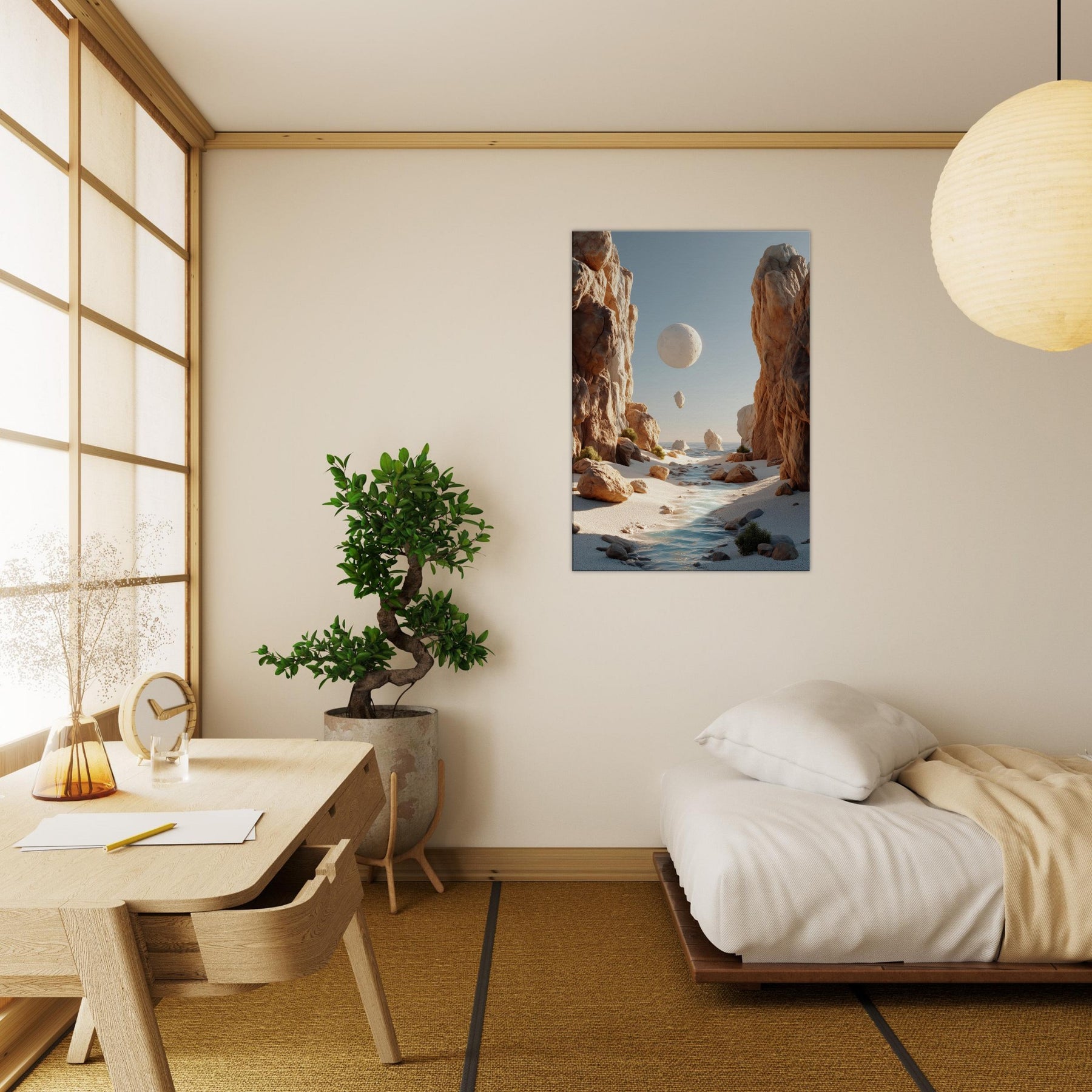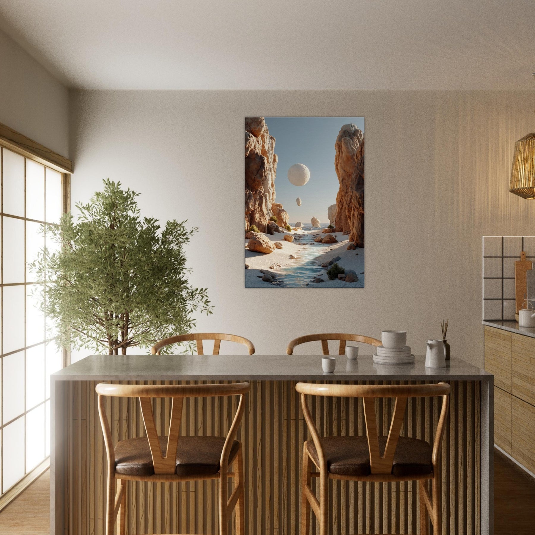 An otherworldly Canyon unfolds where cliffs cradle a pale moon, a river of light threading between warm boulders. This surreal invites quiet reflection, a momentary escape from the bustle of daily life. The soft palette of desert blush, ash, and sea kissed blues bathes your space in calm, encouraging slow pauses and conversations that drift like the floating orb above. Hang this piece to evoke spaciousness, wonder, and a daily reminder that beauty can tilt the world toward poetry.