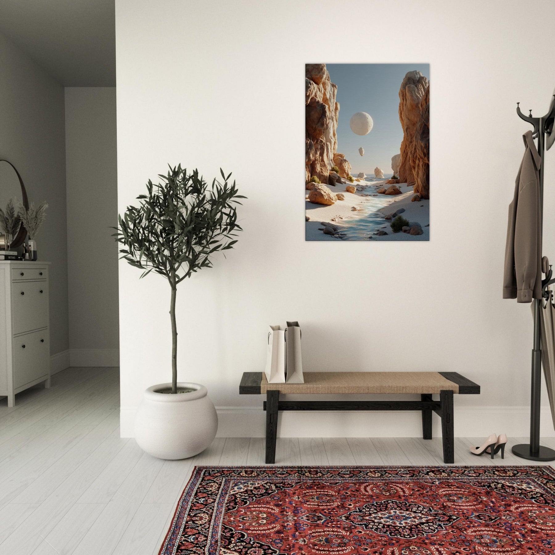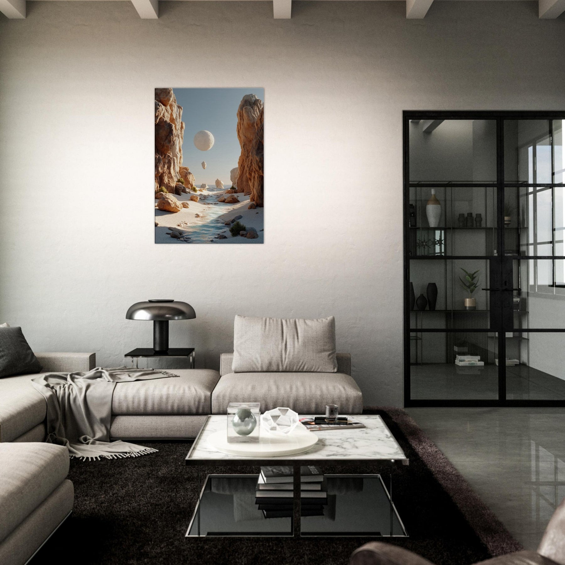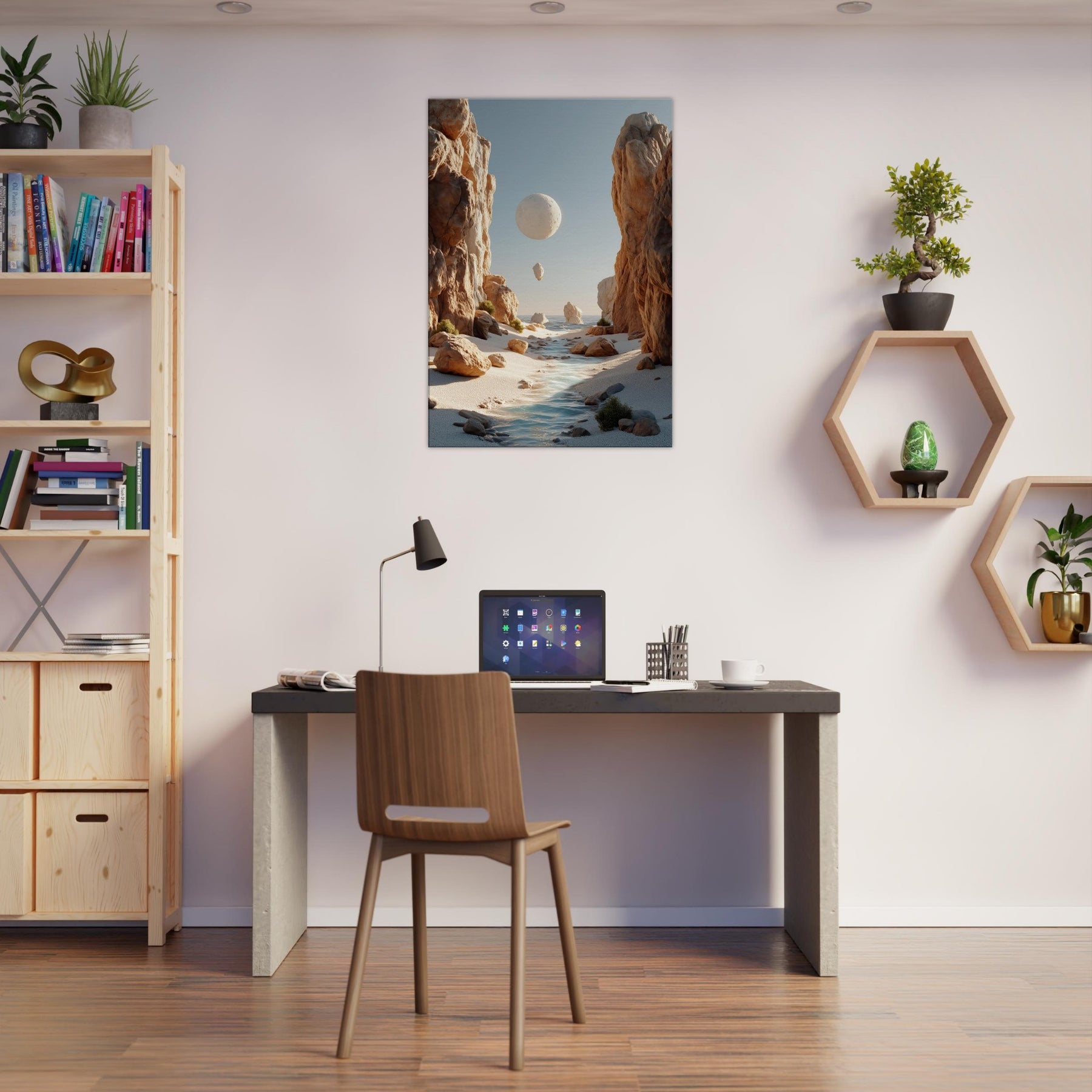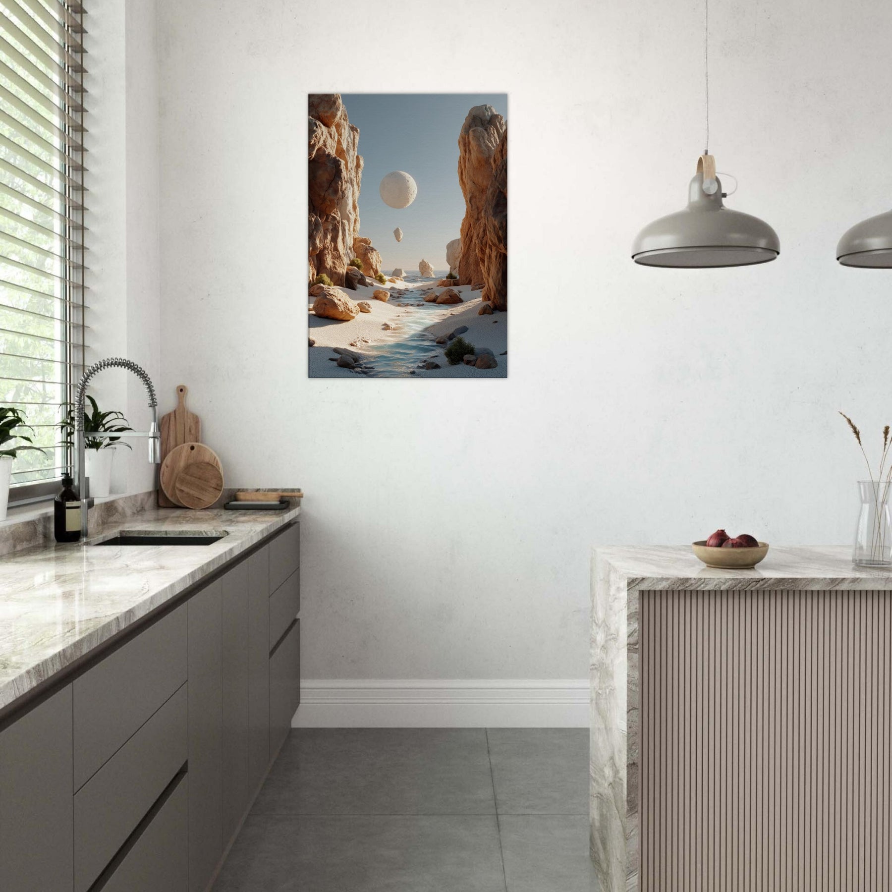 An otherworldly Canyon unfolds where cliffs cradle a pale moon, a river of light threading between warm boulders. This surreal invites quiet reflection, a momentary escape from the bustle of daily life. The soft palette of desert blush, ash, and sea kissed blues bathes your space in calm, encouraging slow pauses and conversations that drift like the floating orb above. Hang this piece to evoke spaciousness, wonder, and a daily reminder that beauty can tilt the world toward poetry.