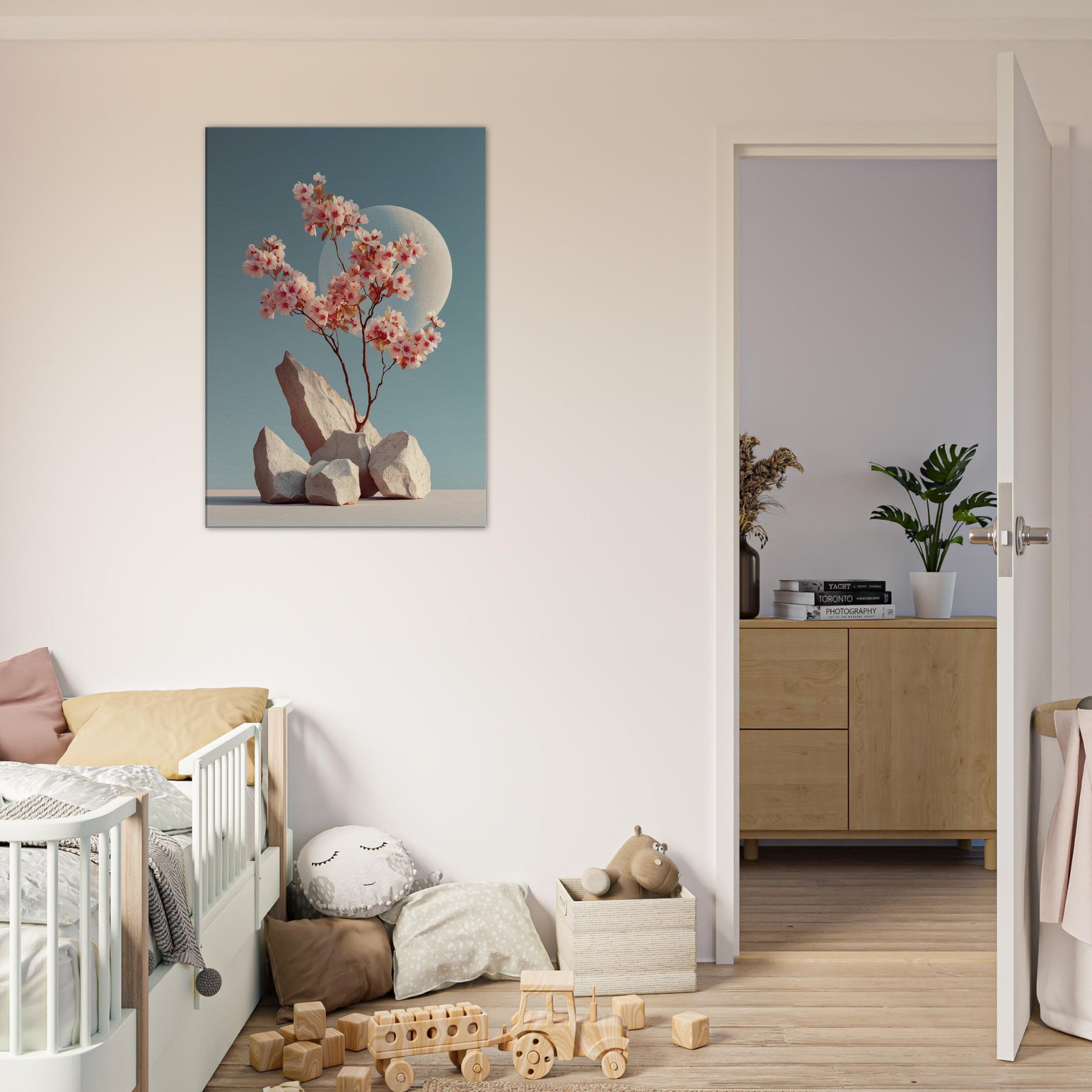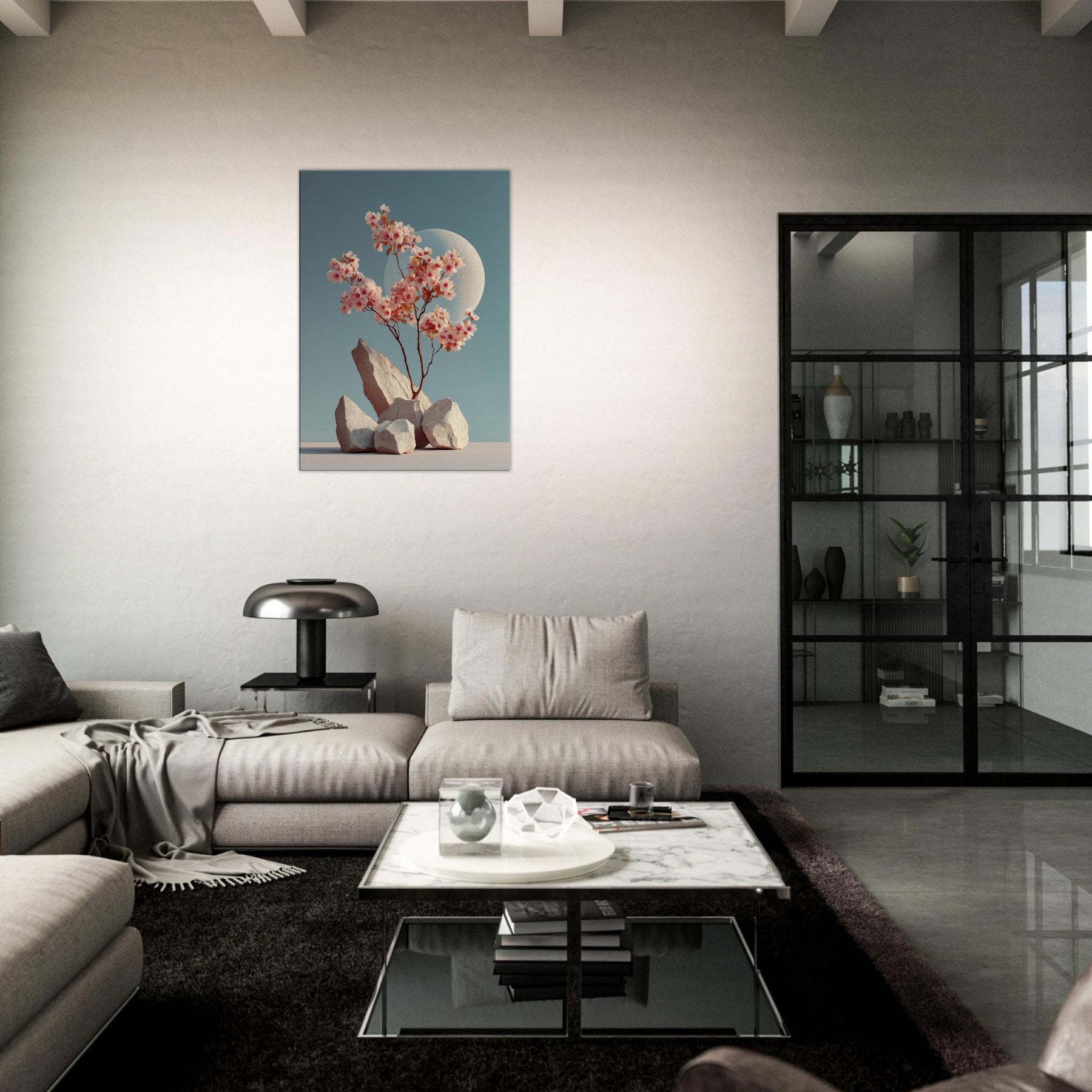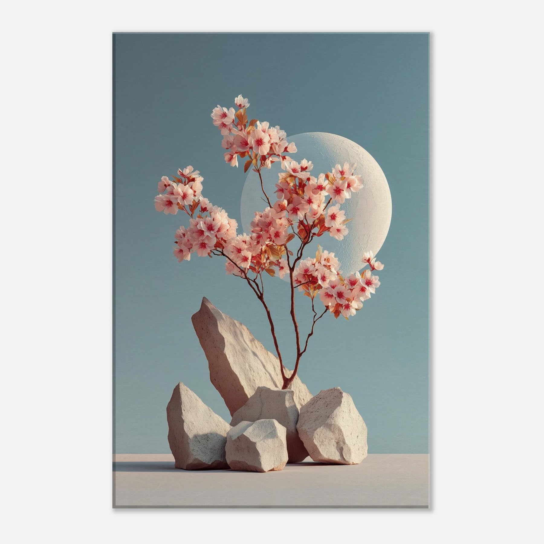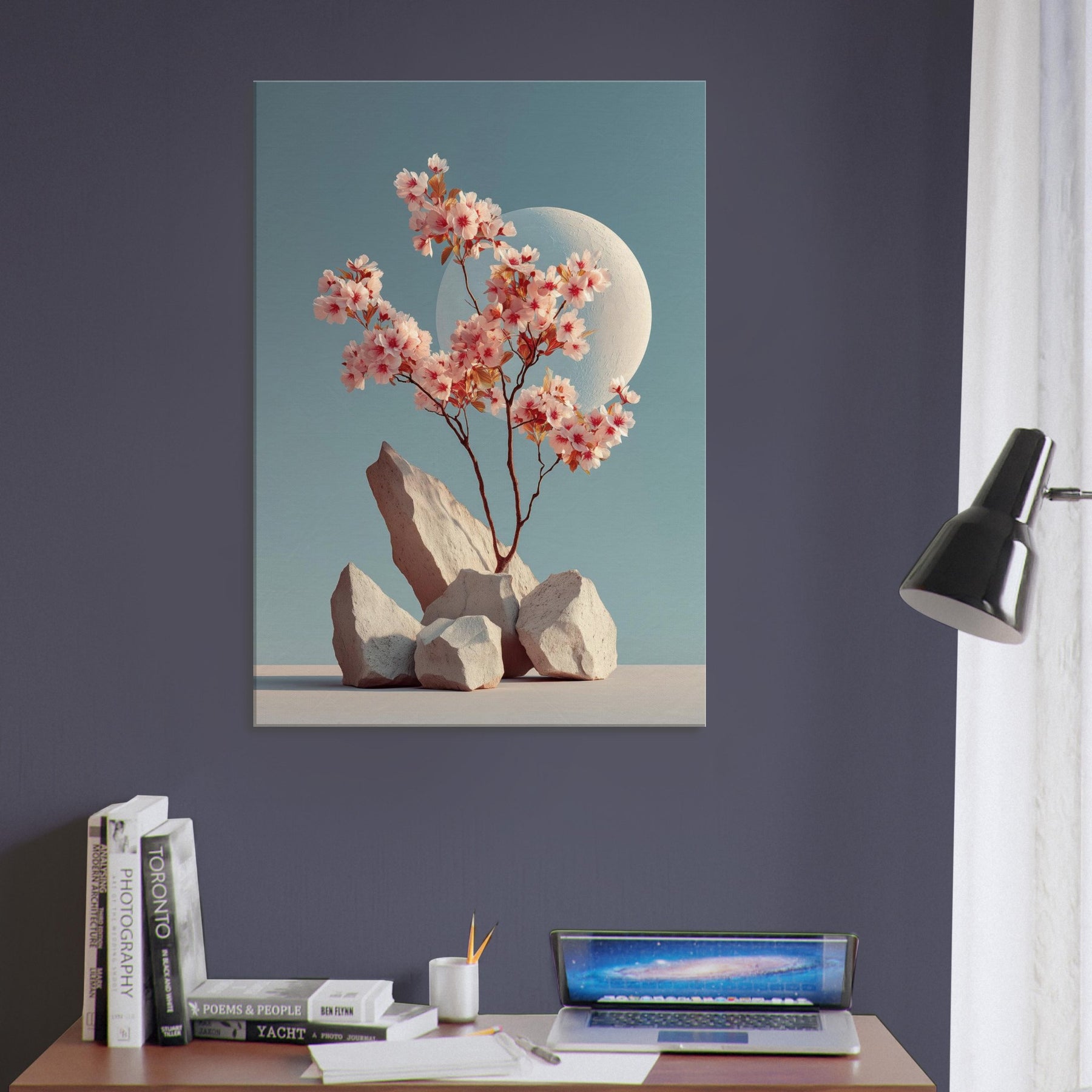 An otherworldly vision anchored by a Sakura Branch rising from weathered stones, this image pours a blush of pink into a pale, moonlit sky. Delicate petals glow against a cool blue backdrop, while the round celestial form lends a dreamlike rhythm. The scene radiates quiet resilience and gentle wonder, turning any wall into a space for pause and reflection. Hang it where morning light and evening shadows mingle, and let the imagery slow the pace of daily life with fragrance of blossoms and windless calm.