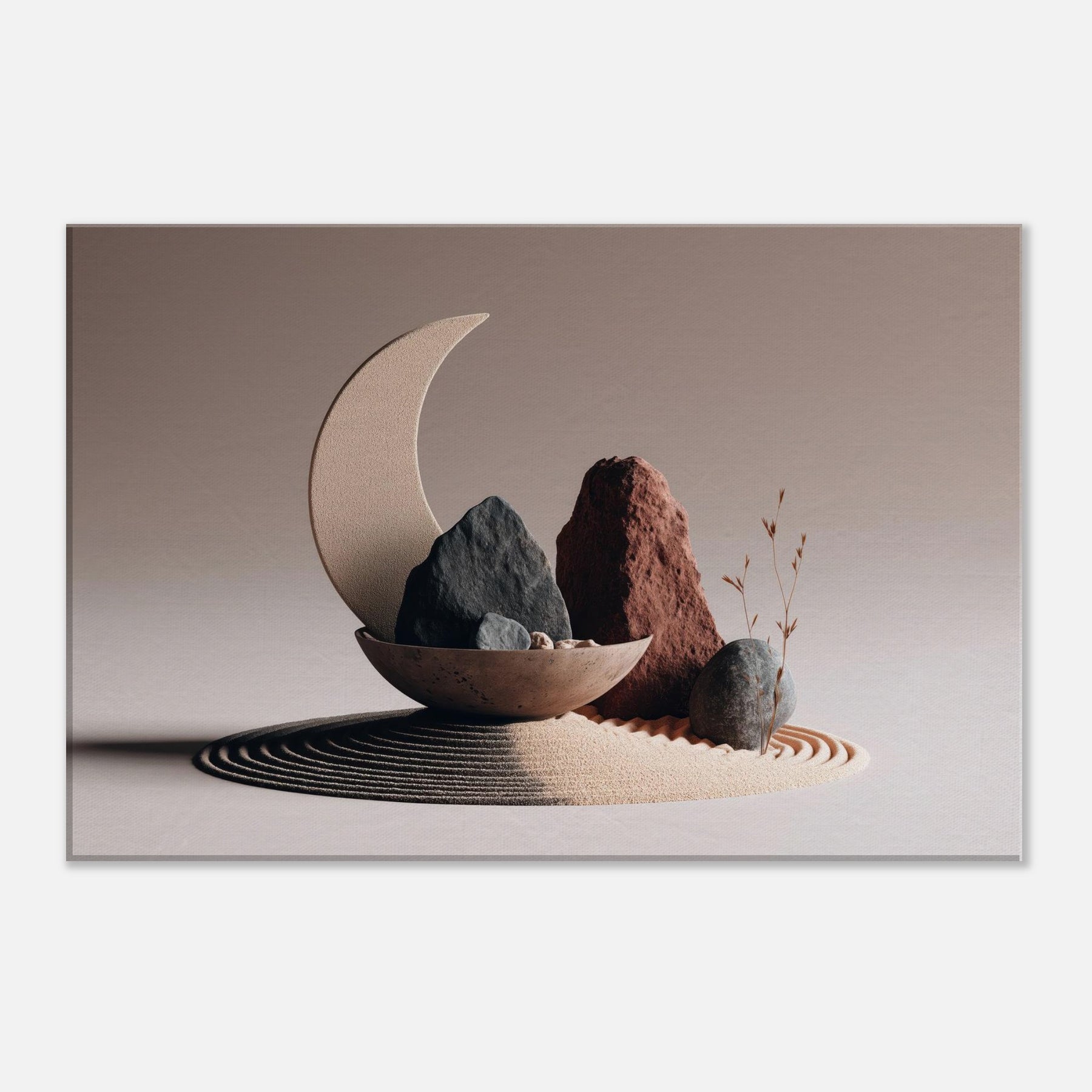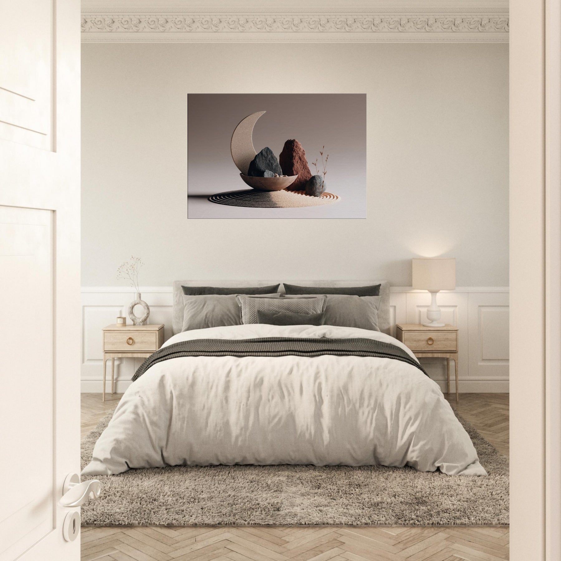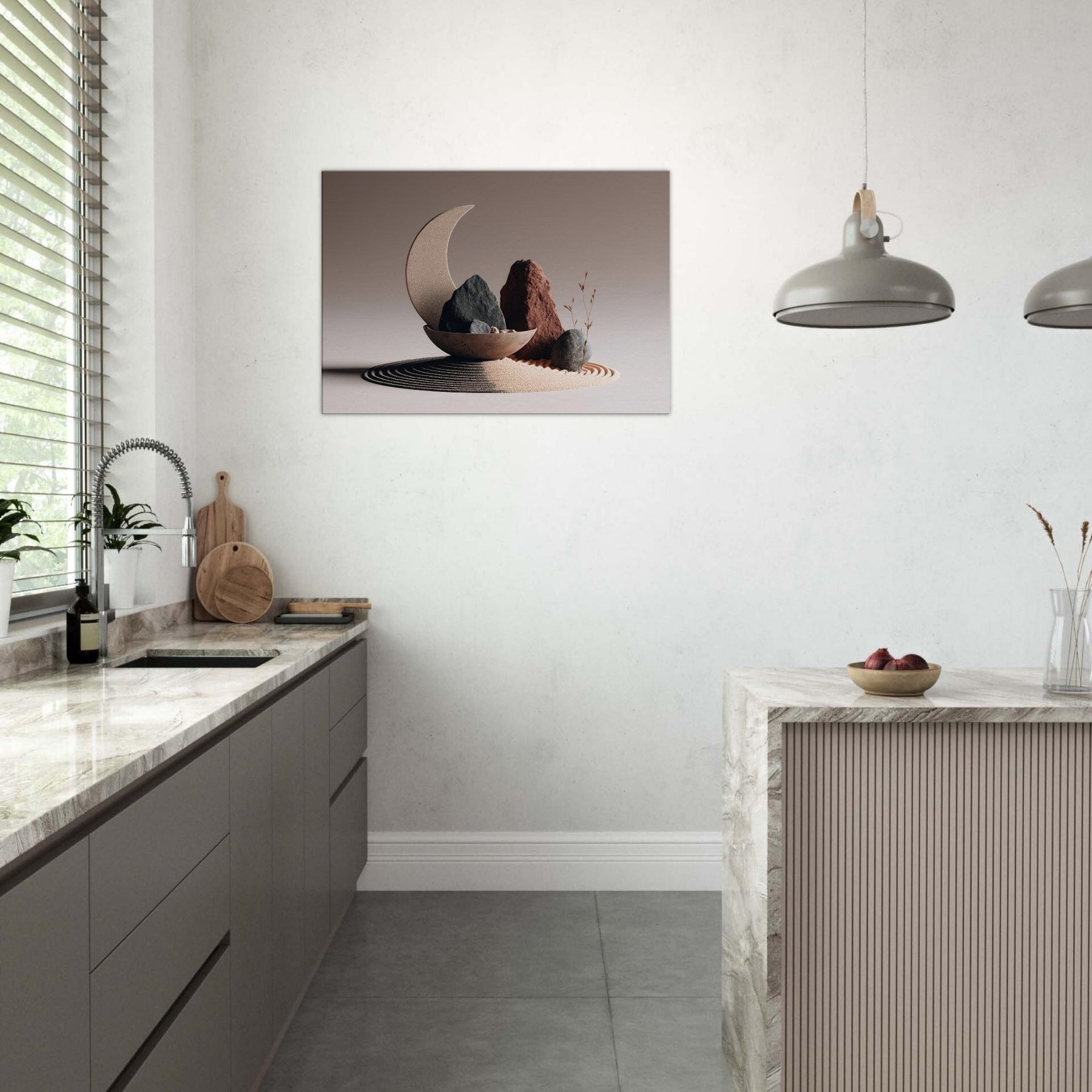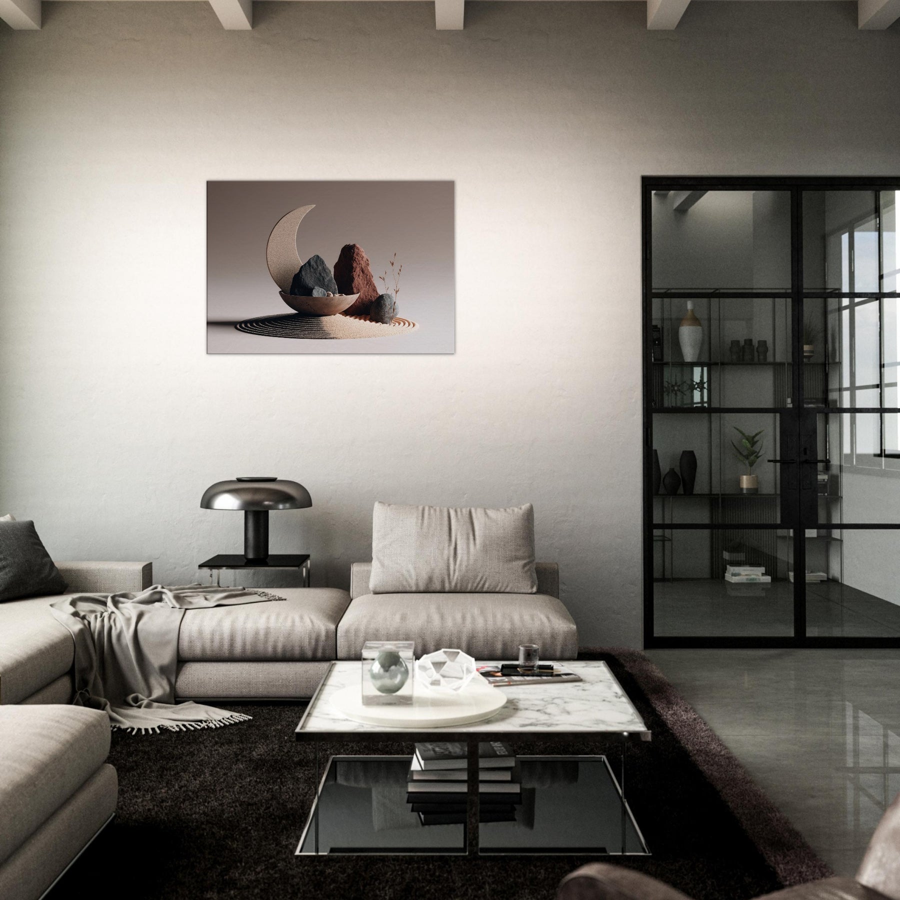In Zen Garden Rake Lines, a crescent forms a quiet horizon as a bowl cradles dark and red stones, while circles in the sand ripple like patient breath. This surreal composition threads earth textures stone, clay, fine grit into a meditative still life that invites slow, deliberate gazing. The piece enhances a living space with a warm, natural palette and sculptural rhythm, perfect for above a sofa or in a peaceful alcove. Let it slow your day and center your room.