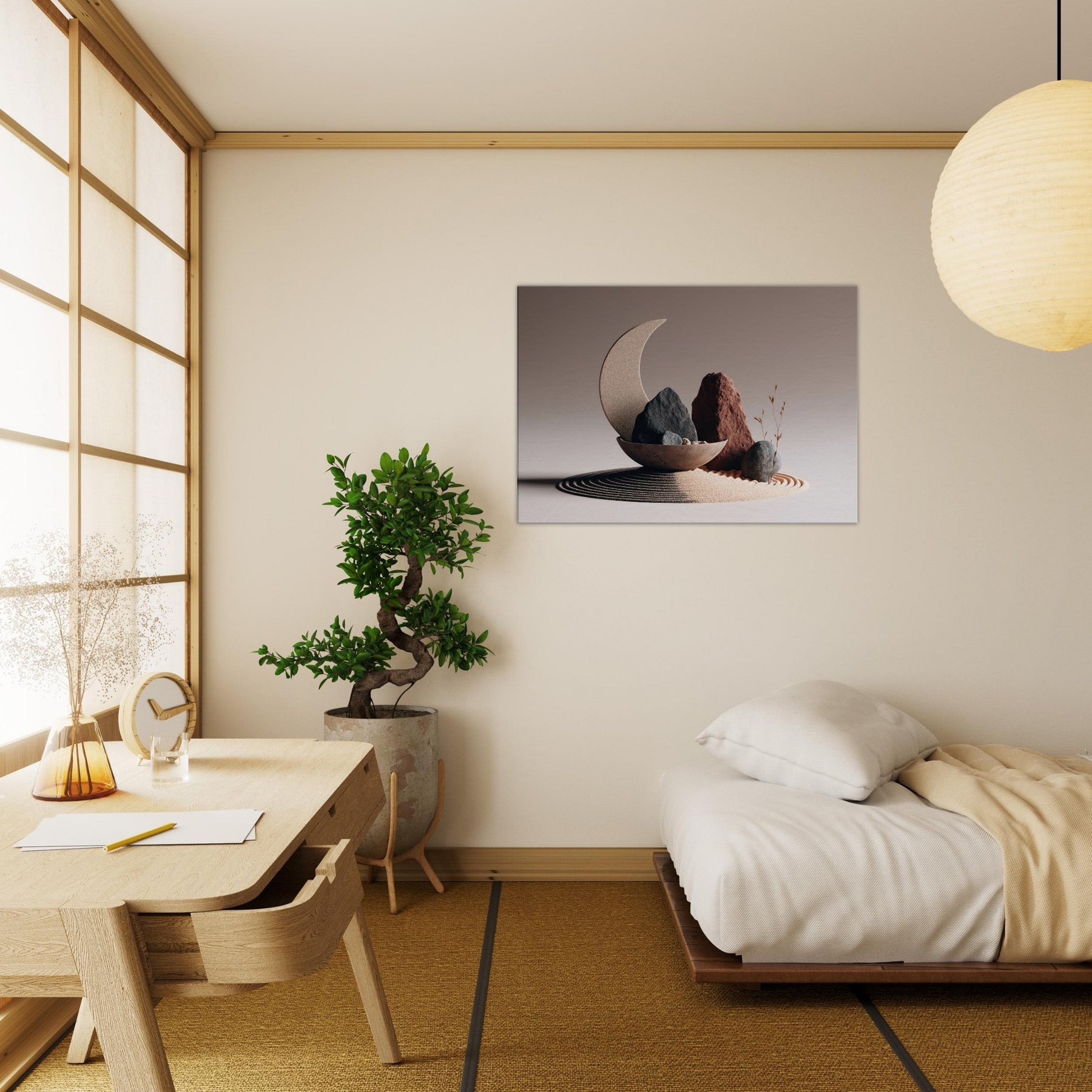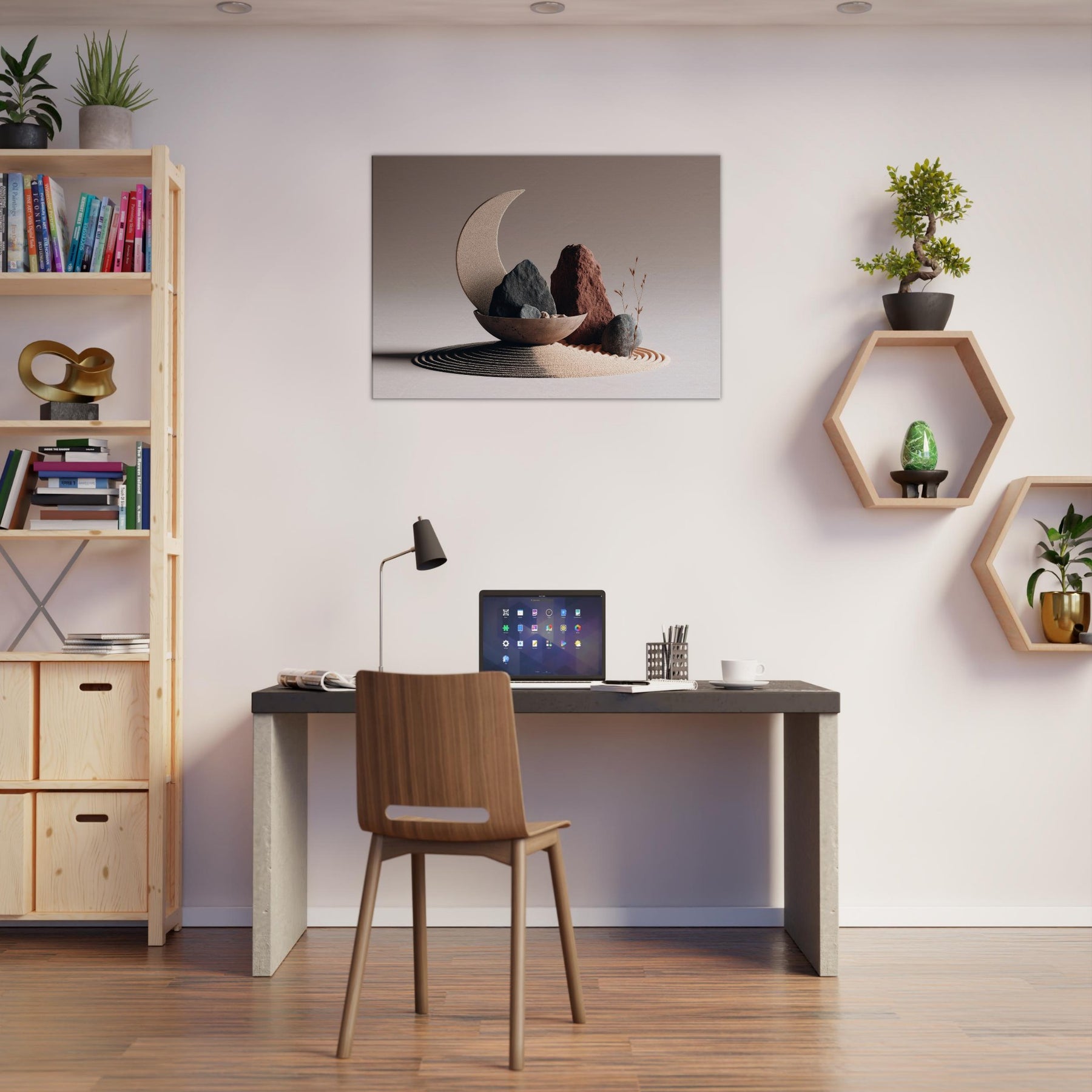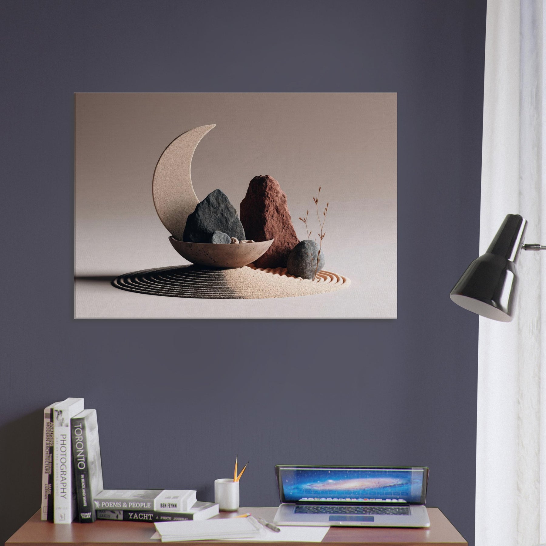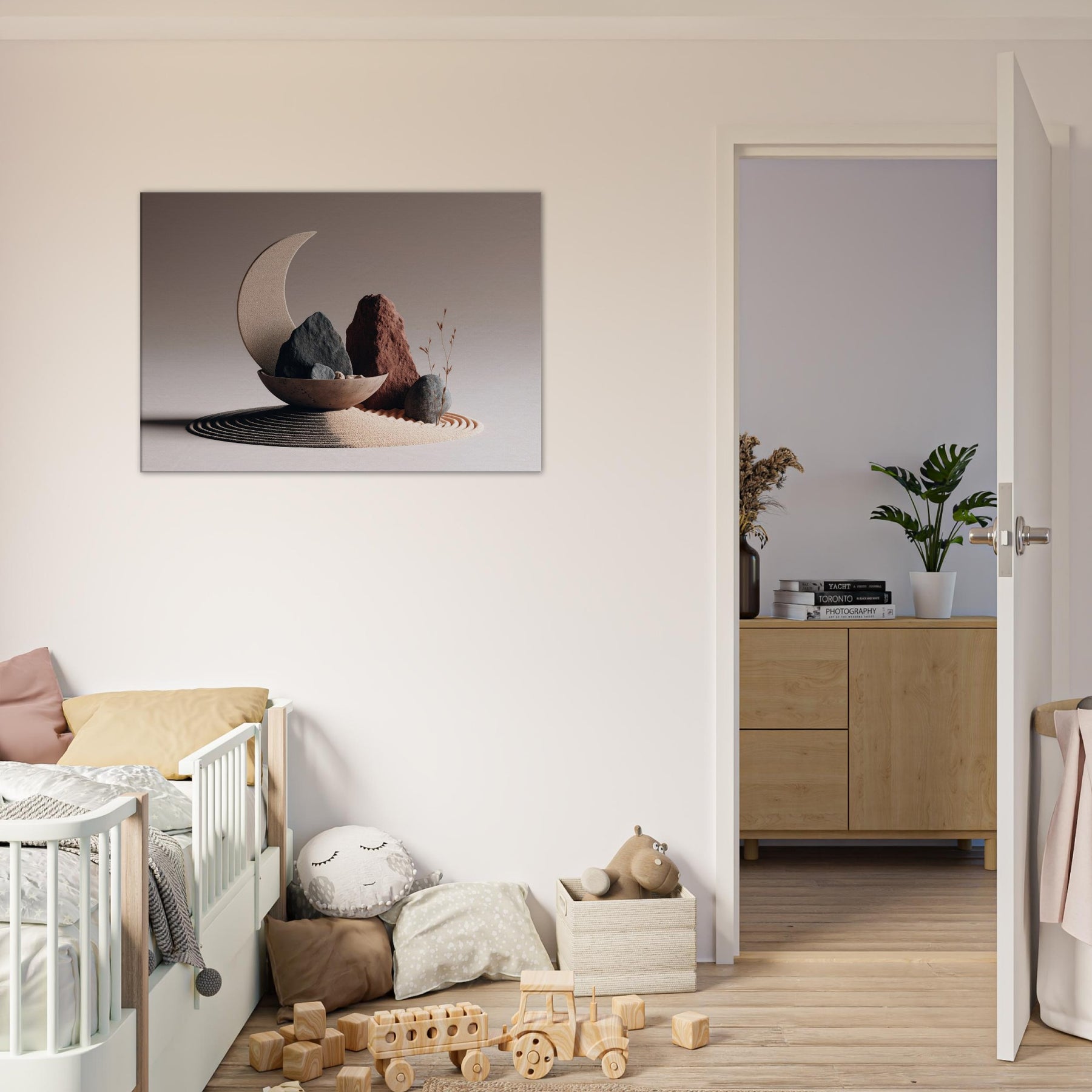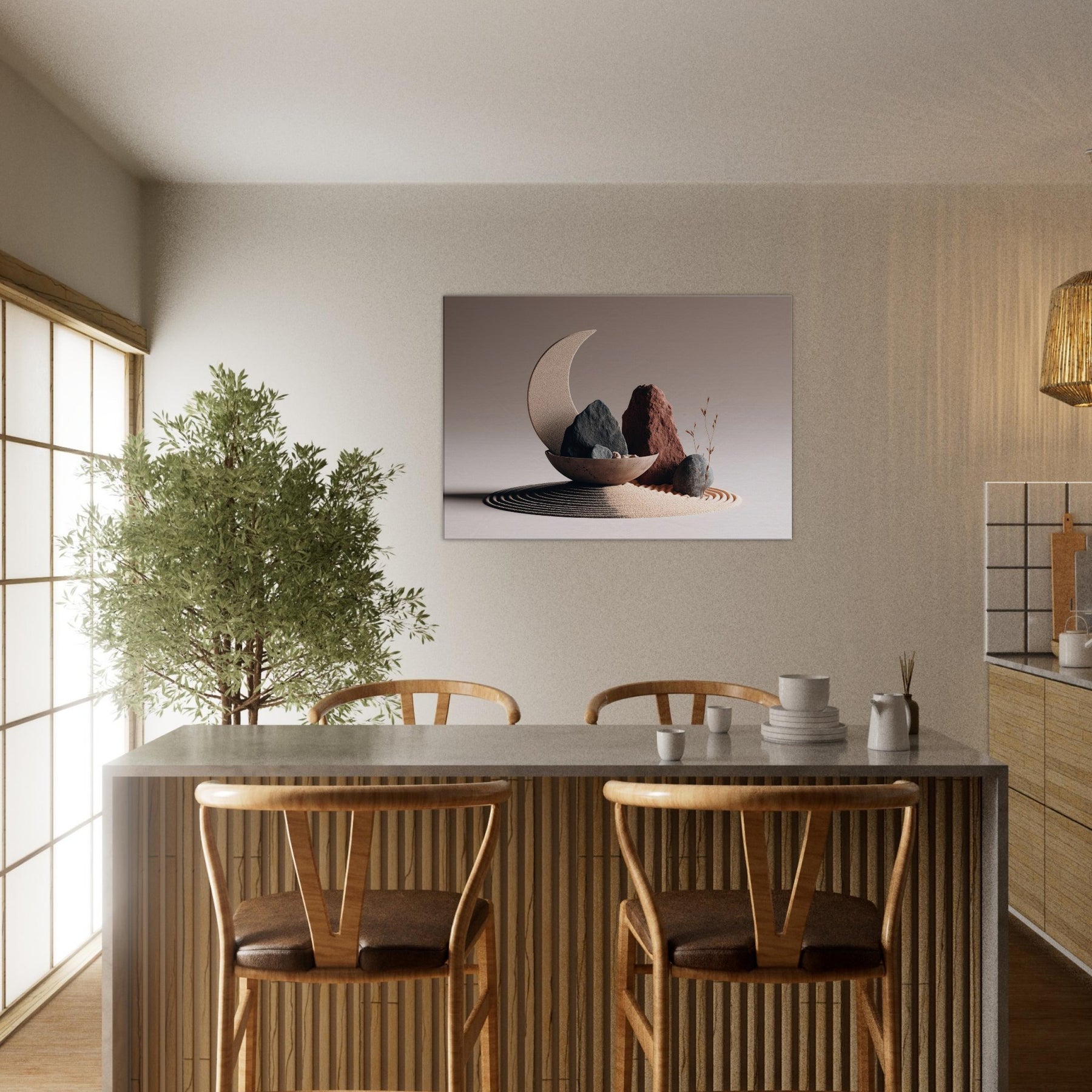 In Zen Garden Rake Lines, a crescent forms a quiet horizon as a bowl cradles dark and red stones, while circles in the sand ripple like patient breath. This surreal composition threads earth textures stone, clay, fine grit into a meditative still life that invites slow, deliberate gazing. The piece enhances a living space with a warm, natural palette and sculptural rhythm, perfect for above a sofa or in a peaceful alcove. Let it slow your day and center your room.