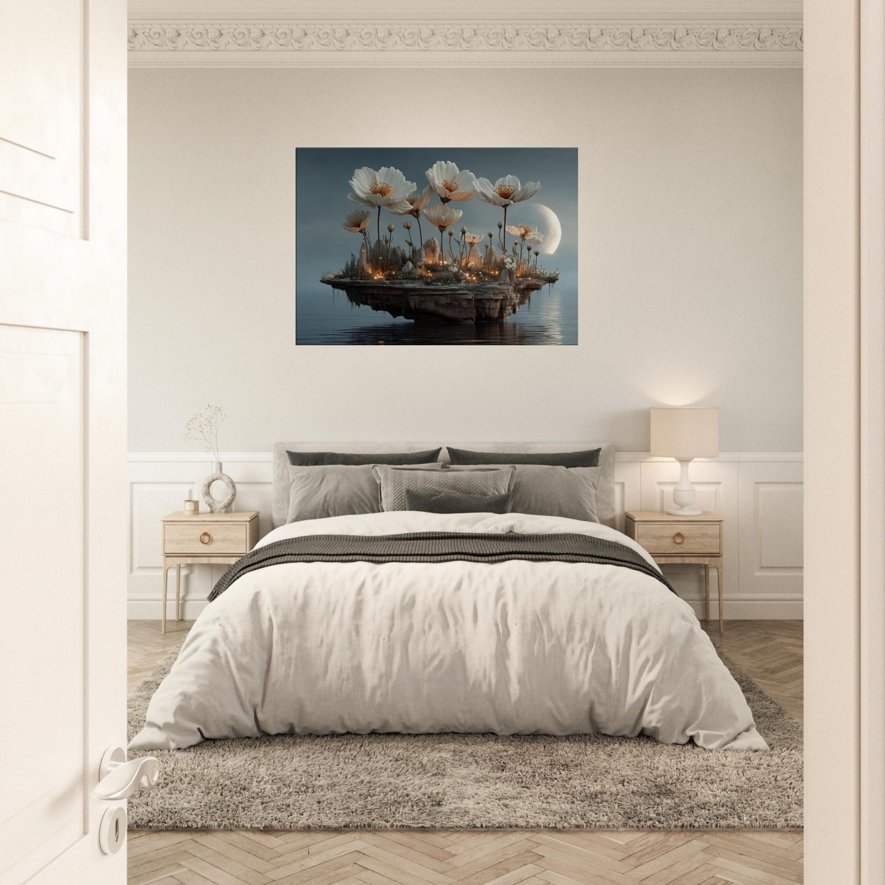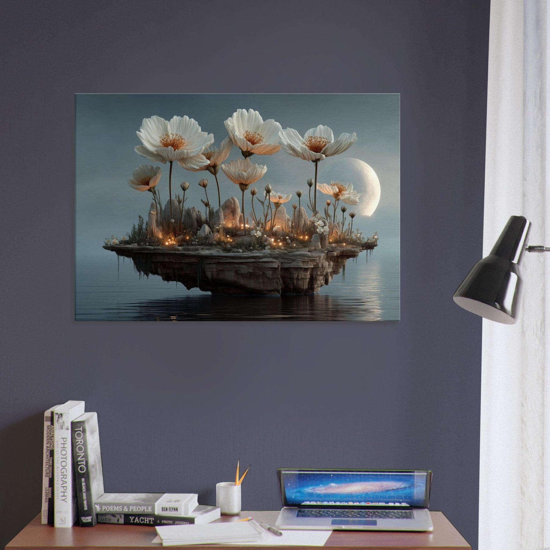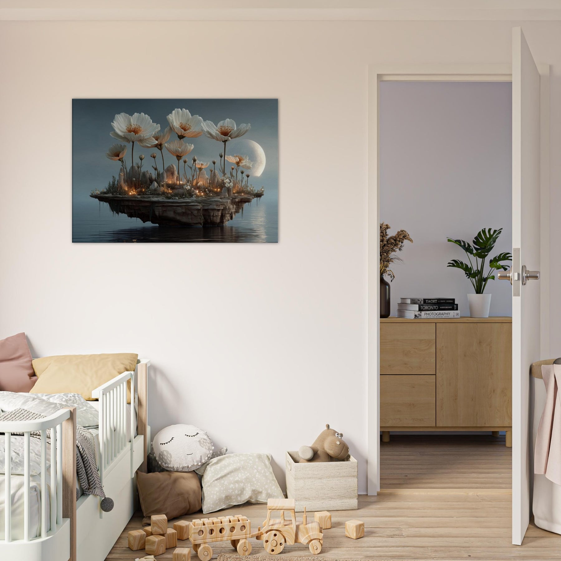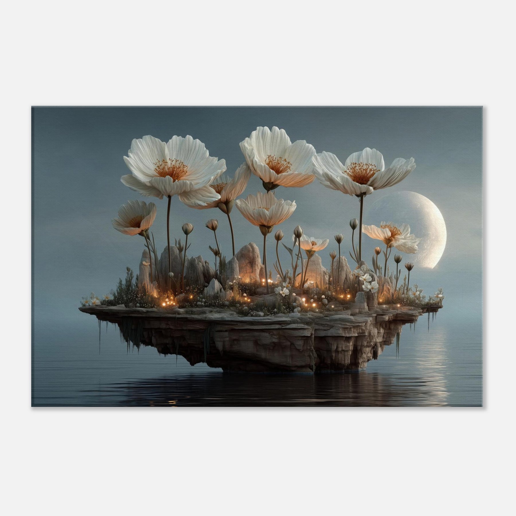 Under a pale moon, a Flower Field rises from a jagged island, where towering blooms sway above a bed of softly glowing pebbles. This surreal composition invites the eye to drift, the air charged with quiet wonder and the warm sparkle of tiny lights along the ground. It transforms any living space into a sanctuary of calm, memory, and possibility an otherworldly scene that pairs with minimal furnishings yet invites generous storytelling. Perfect for bedrooms, lounges, or entryways seeking poetry in stillness.
