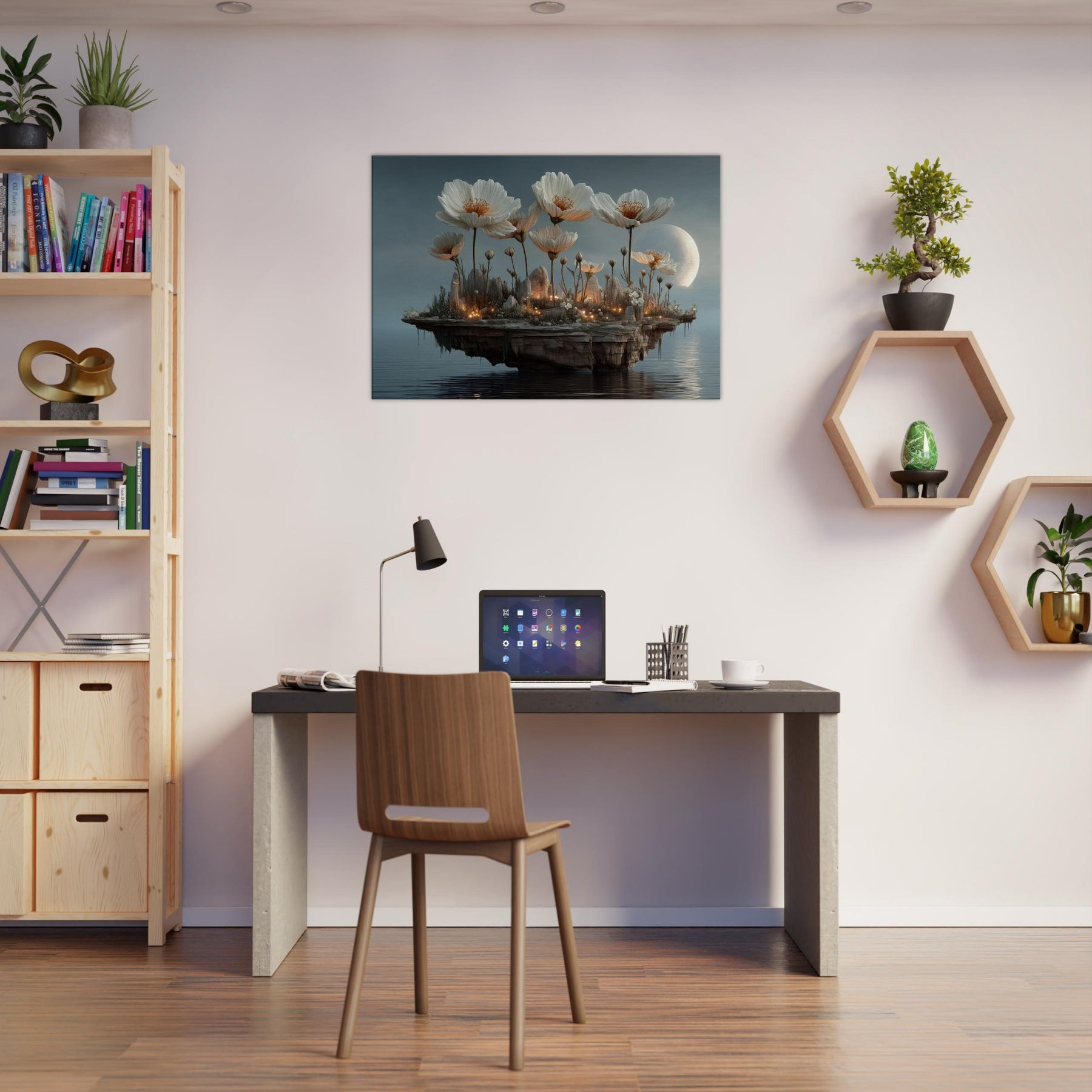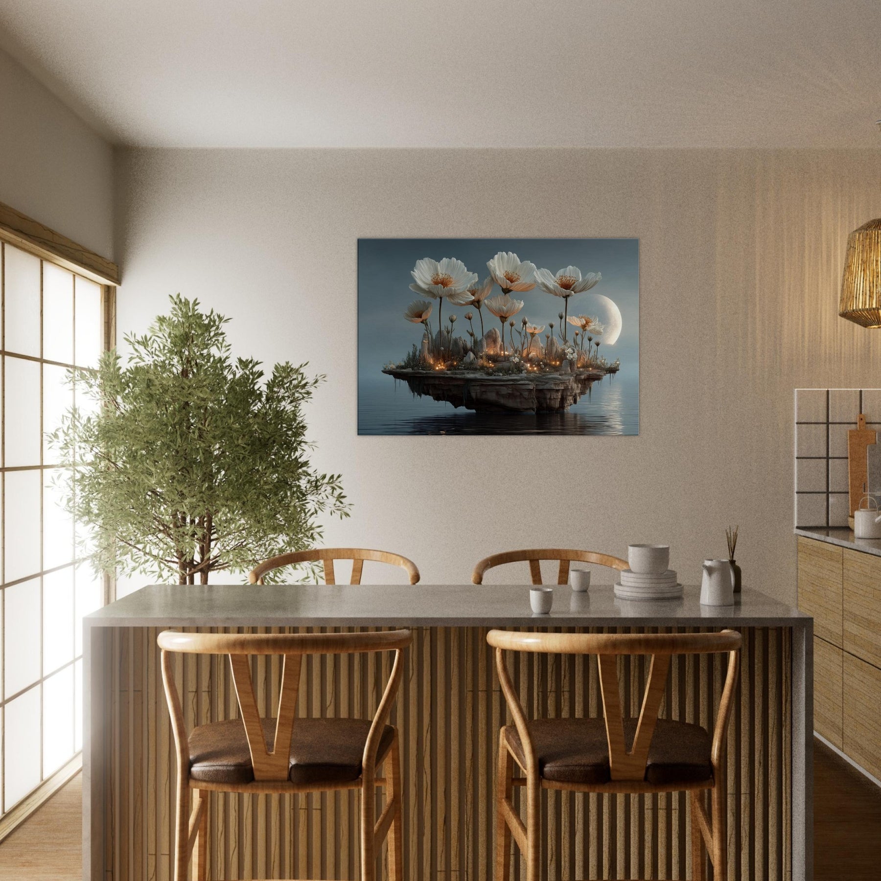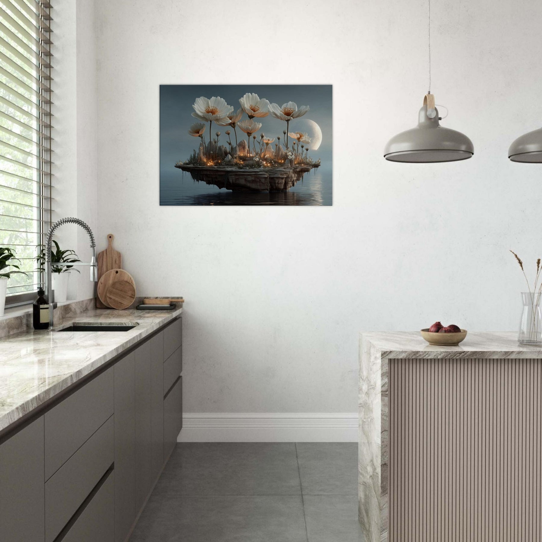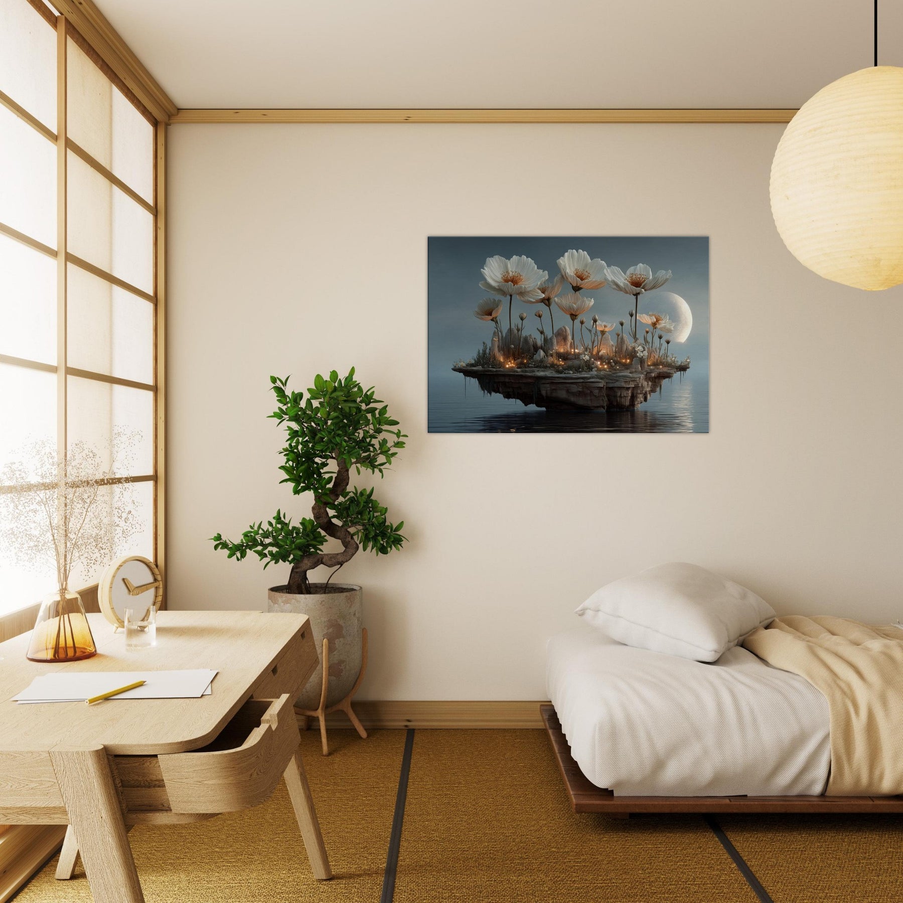 Under a pale moon, a Flower Field rises from a jagged island, where towering blooms sway above a bed of softly glowing pebbles. This surreal composition invites the eye to drift, the air charged with quiet wonder and the warm sparkle of tiny lights along the ground. It transforms any living space into a sanctuary of calm, memory, and possibility an otherworldly scene that pairs with minimal furnishings yet invites generous storytelling. Perfect for bedrooms, lounges, or entryways seeking poetry in stillness.