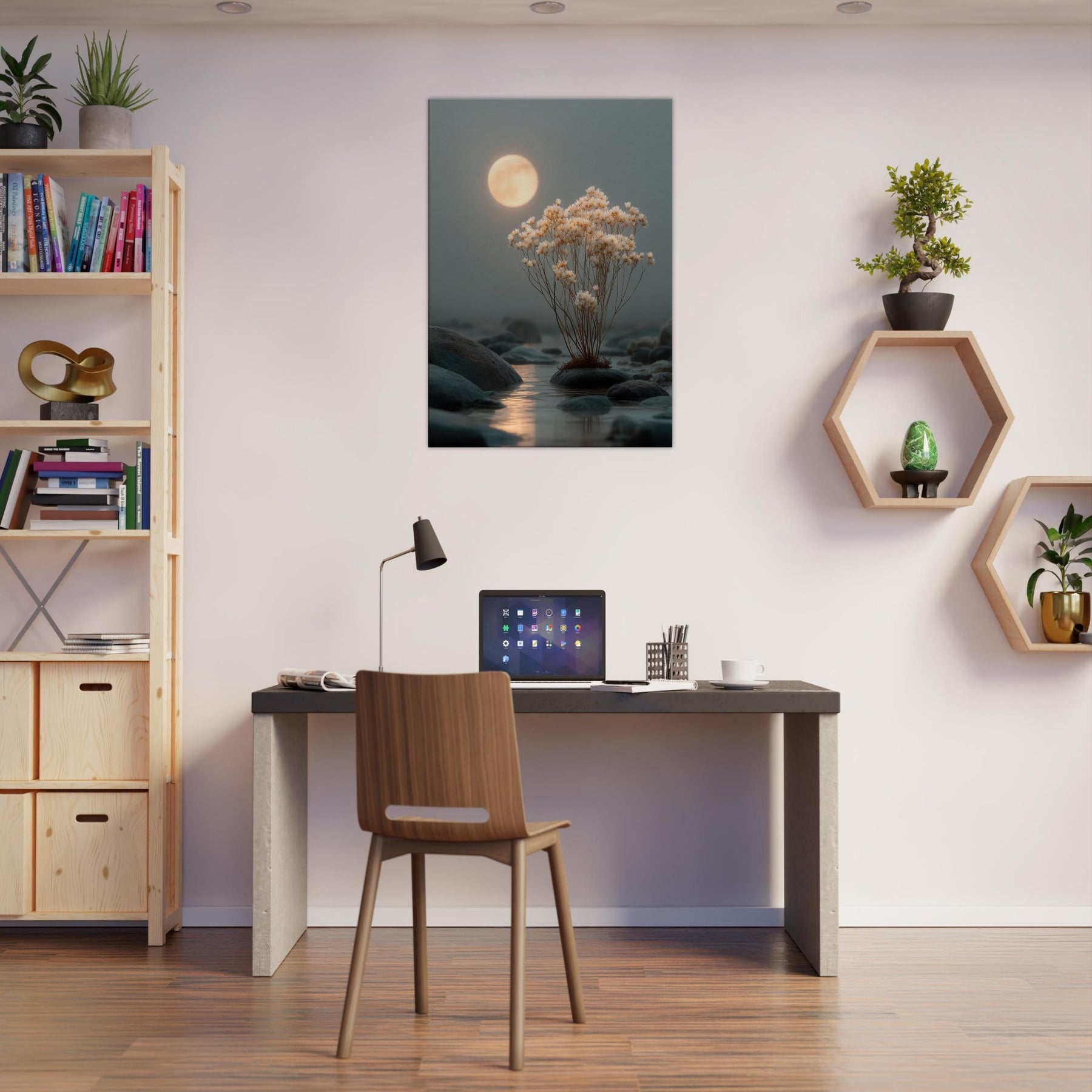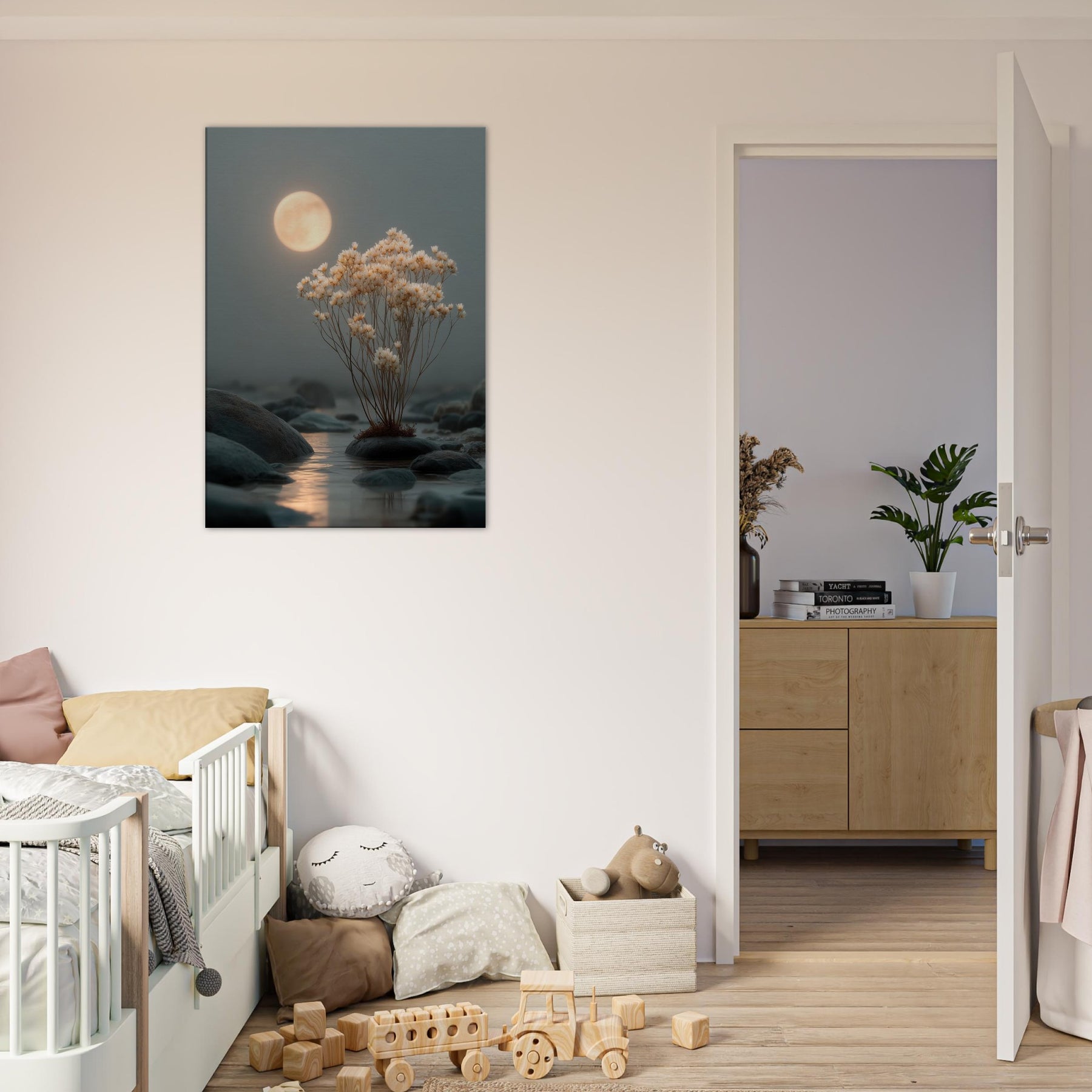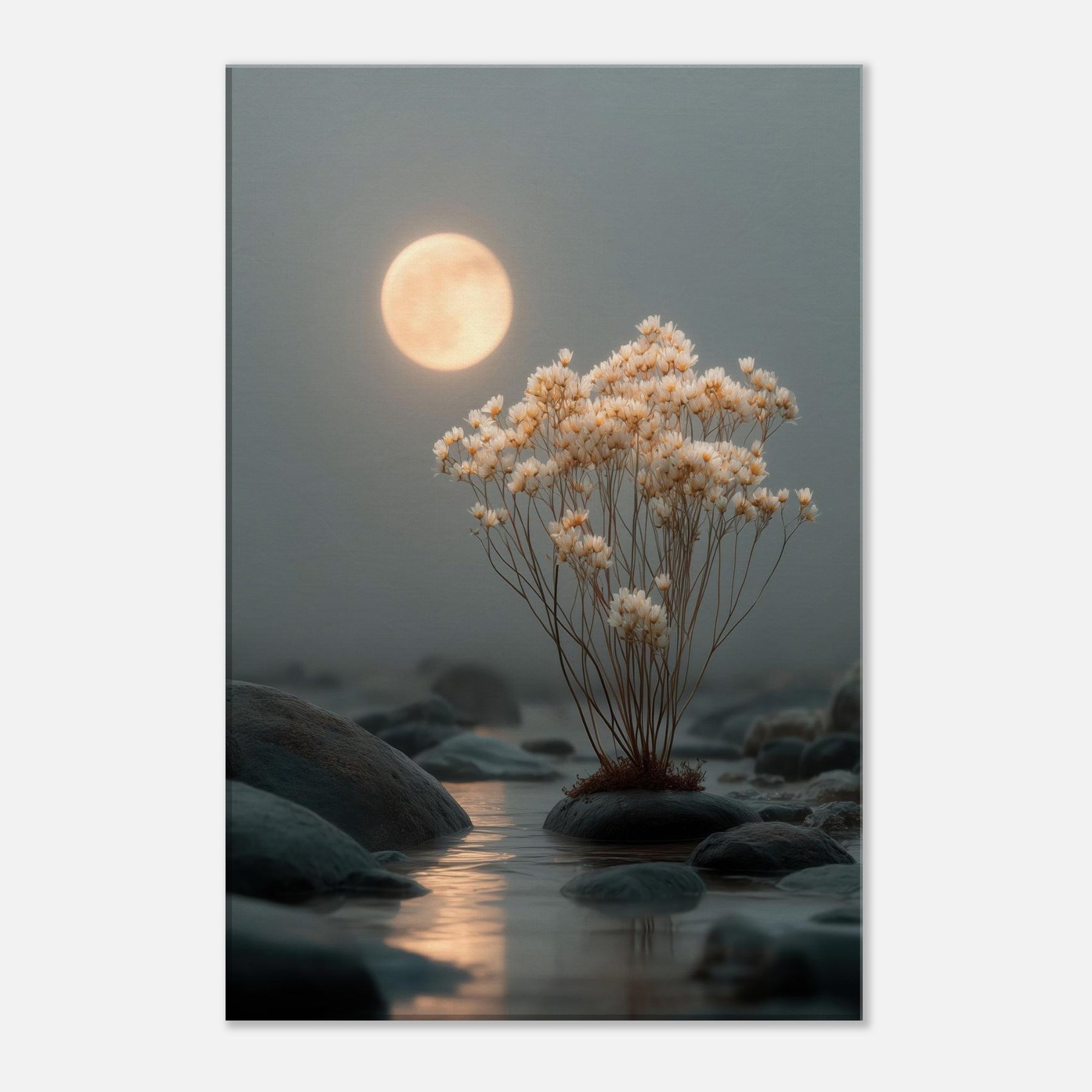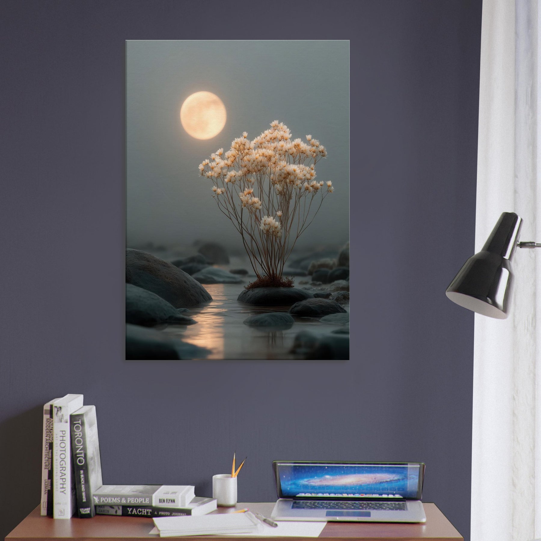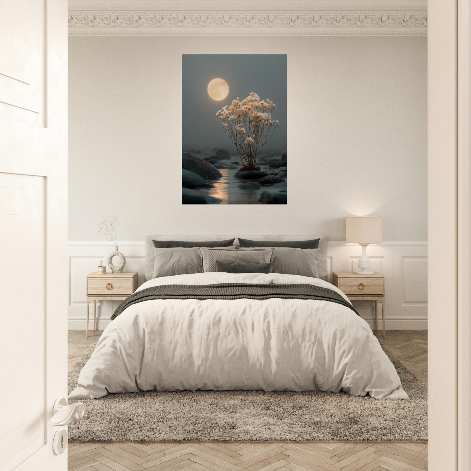 Desert nights bloom into a luminous stillness, as a delicate bouquet rises from smooth stones under a haloed moon. This surreal composition invites slow breath and quiet wonder, turning a wall into an intimate window to the hidden world where dunes, light, and memory meet. Its soft, velvety tones echo twilight and create a calming focal point, enriching a living space with a sense of endurance, resilience, and gentle, meditative beauty.