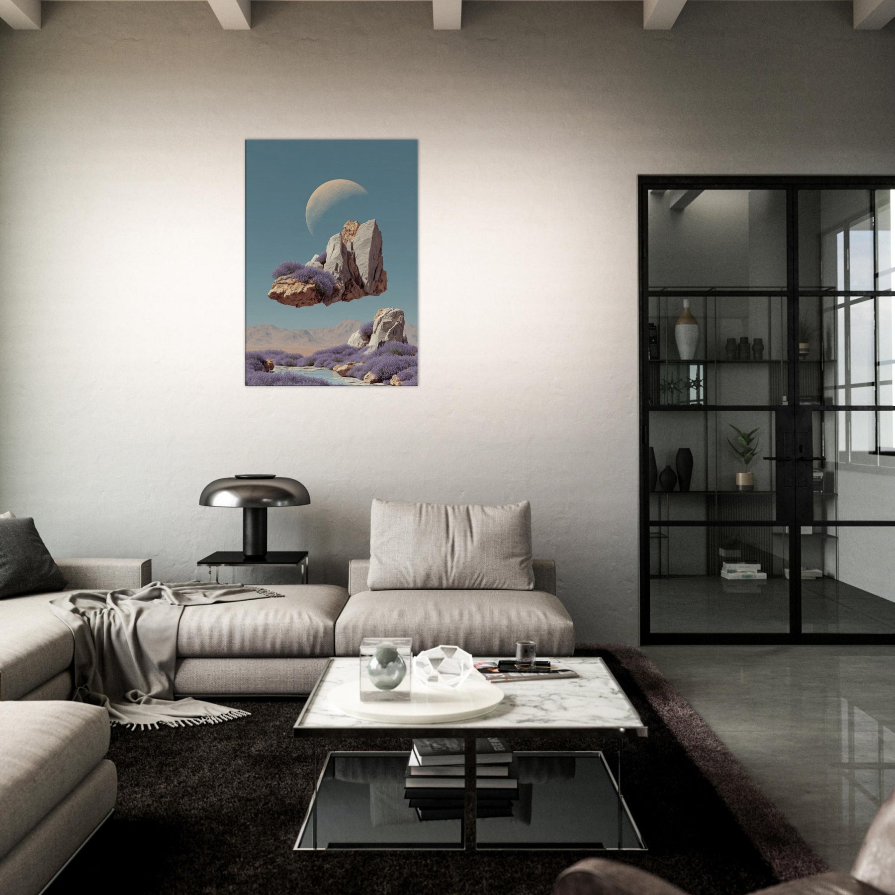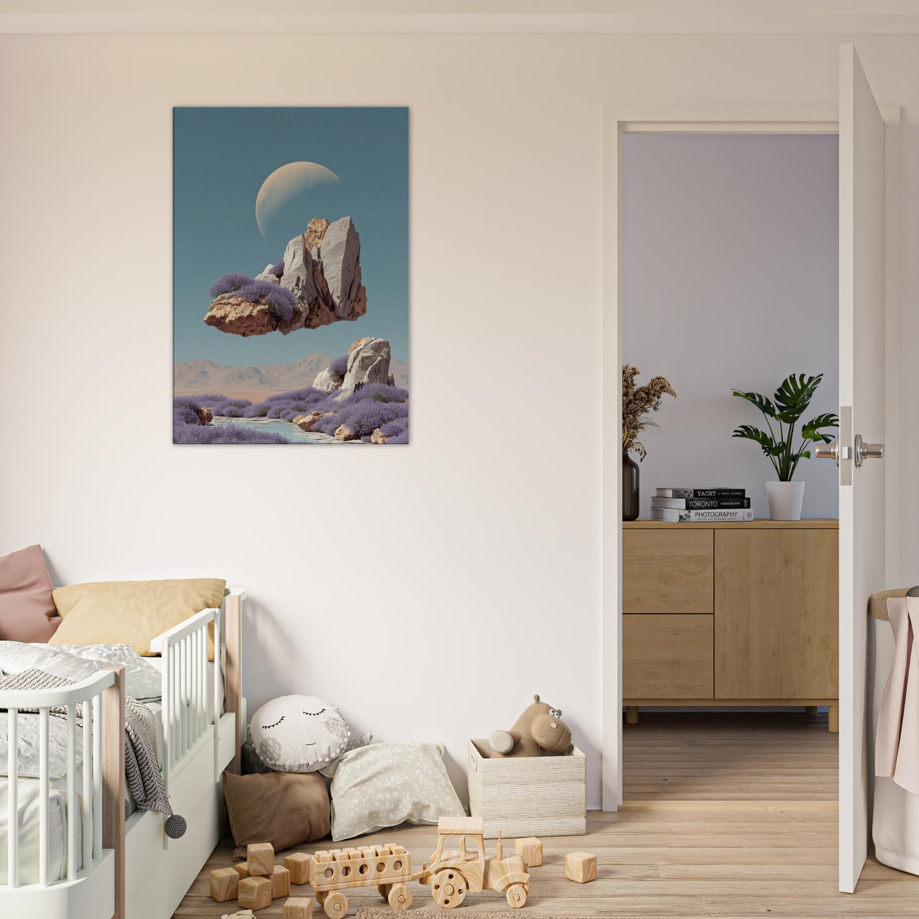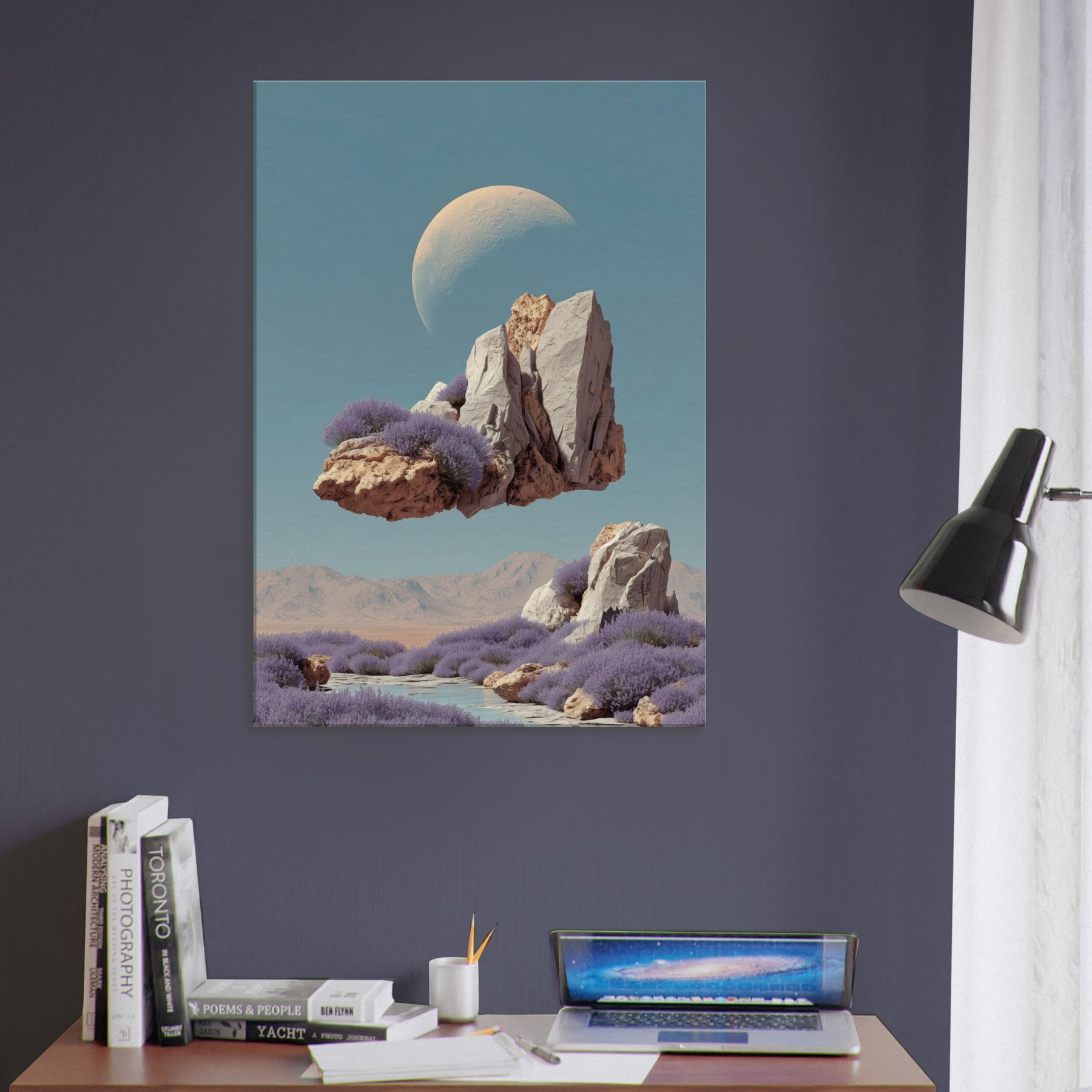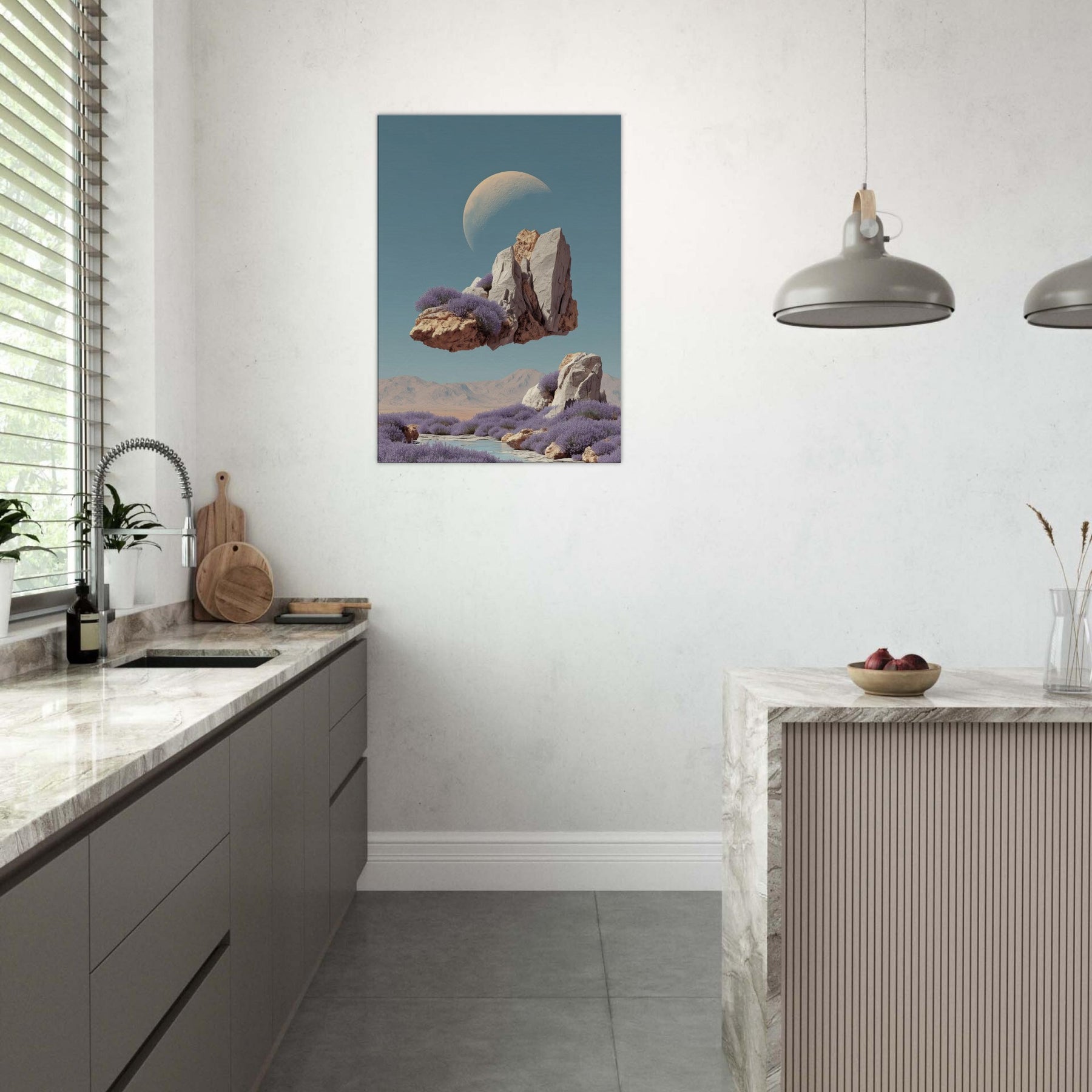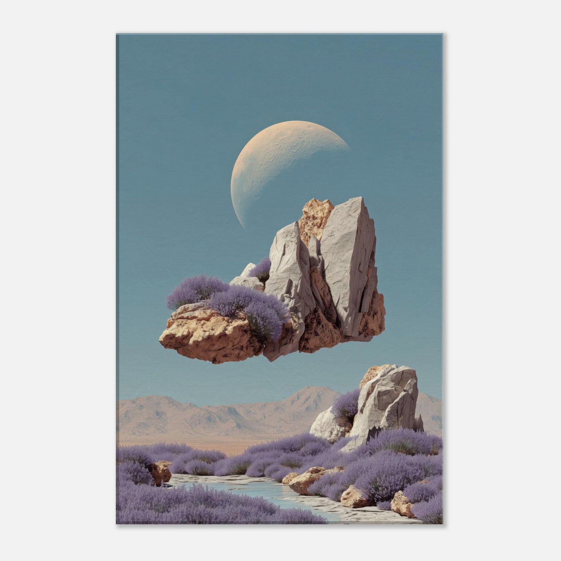 Lavender blooms cling to jagged rocks beneath a crescent moon, conjuring a dreamscape where calm and oddity coexist. This surreal composition blends arid desert textures with soft lavender hues, inviting slow breathing and reflection. The Lavender at the center of the scene grounds the otherworldly ascent, turning stone into poetry and silence into color. Perfect for a living room or bedroom, it creates a serene focal point that heightens mood, expands space, and invites conversation about memory, scale, and nature’s quiet surprises.