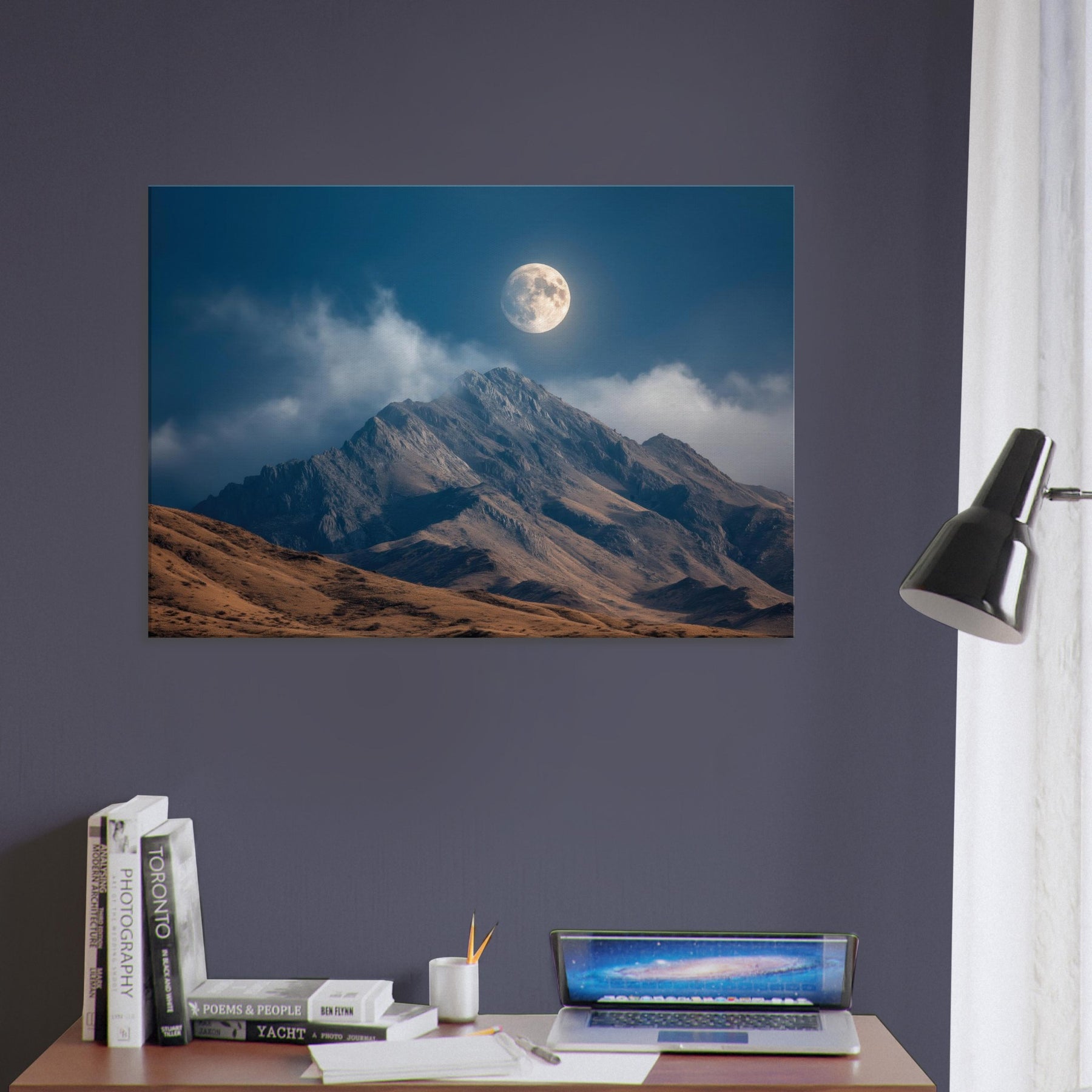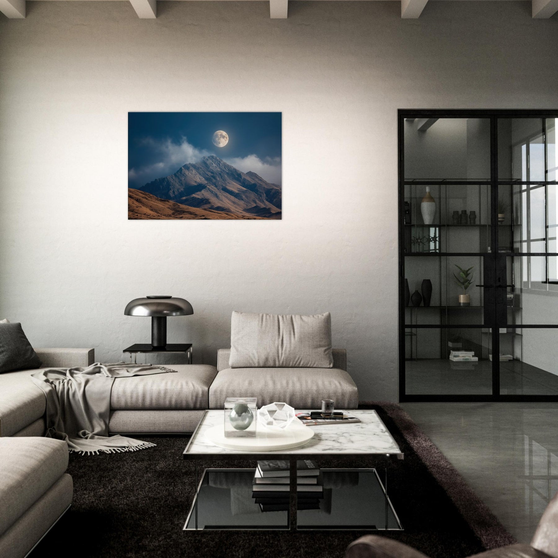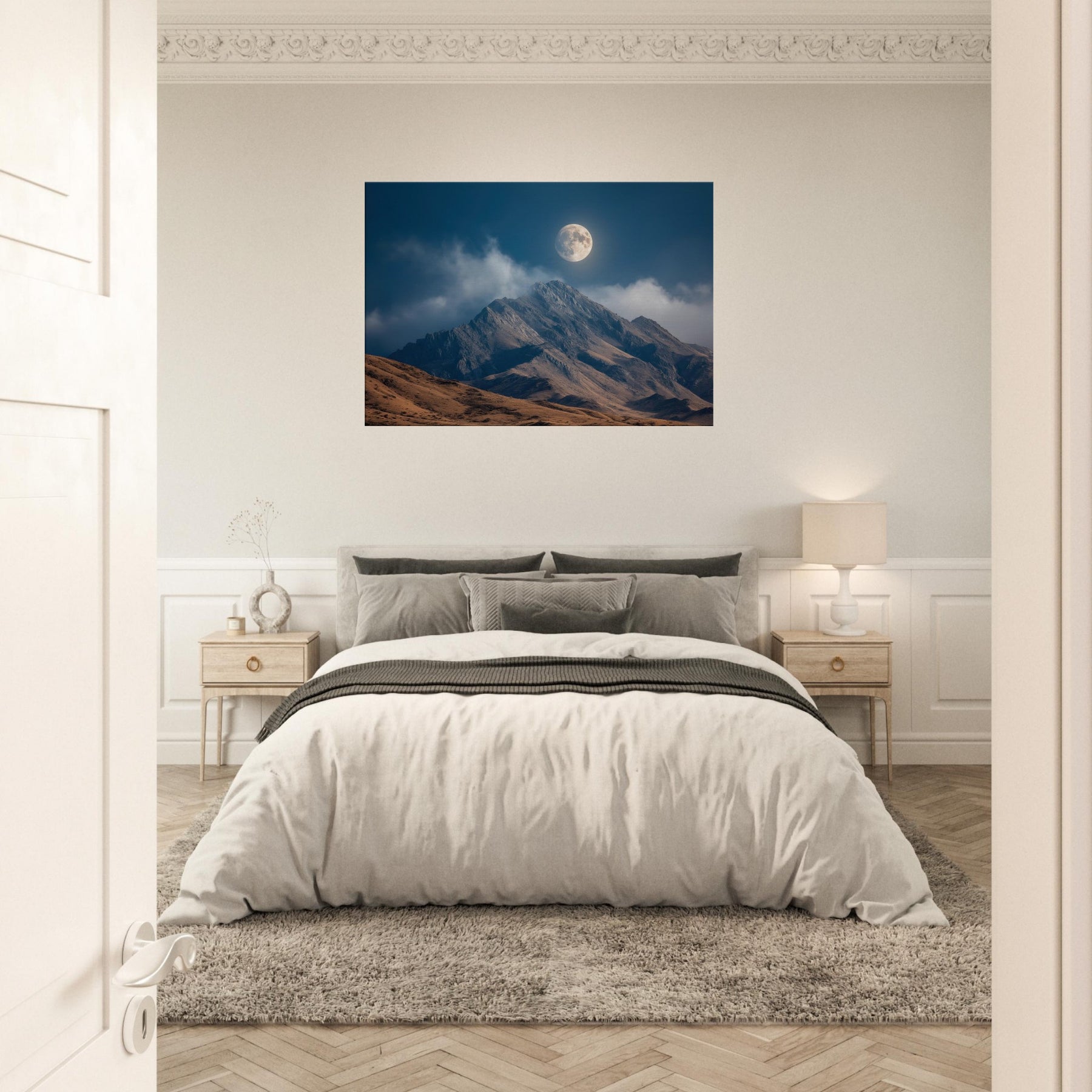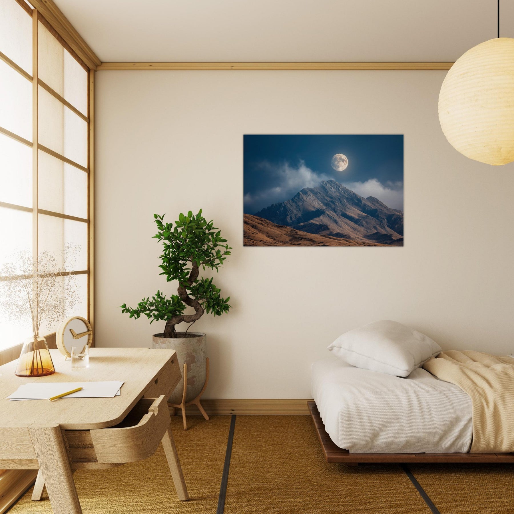 Moon over Mountains unfolds as a whisper of night that settles over your living space. The pale moon hovers above jagged ridges, bathing the scene in a cool, meditative glow that nourishes calm and focus. Like a dream captured in material form, the surreal composition elevates a room with a mystical hush, inviting quiet reflection and creative solitude. It becomes a daily reminder to pause, breathe, and imagine new possibilities each time you pass. The central subject is Moon over Mountains (Minimal).
