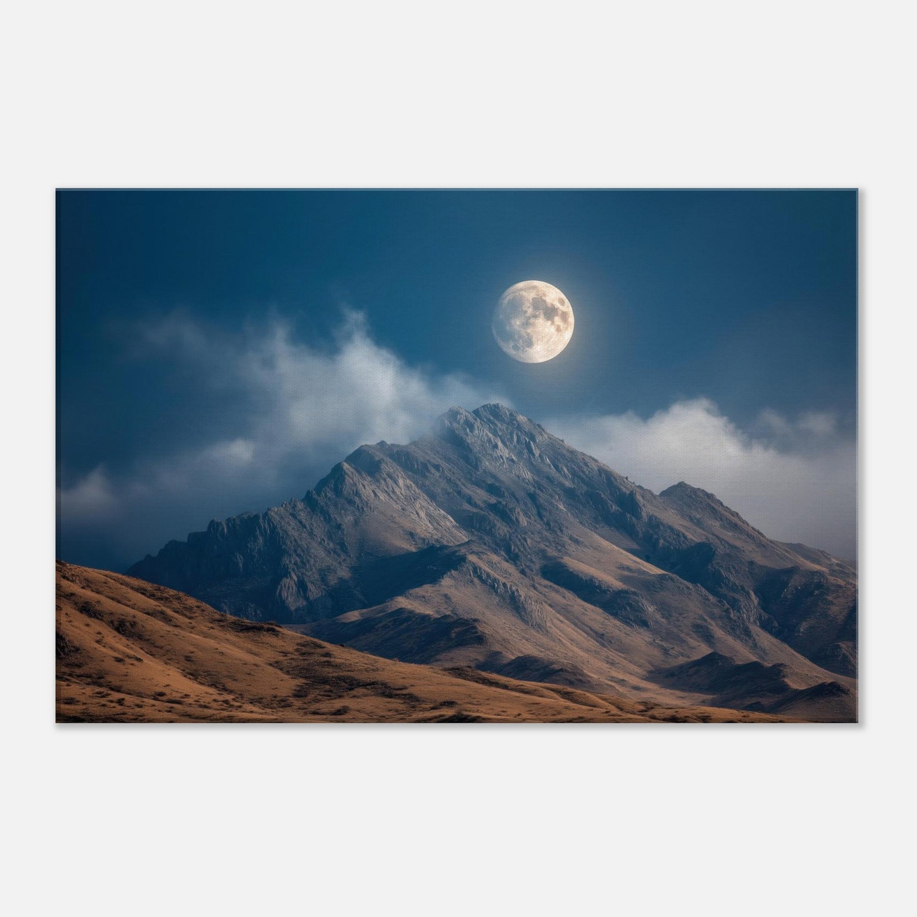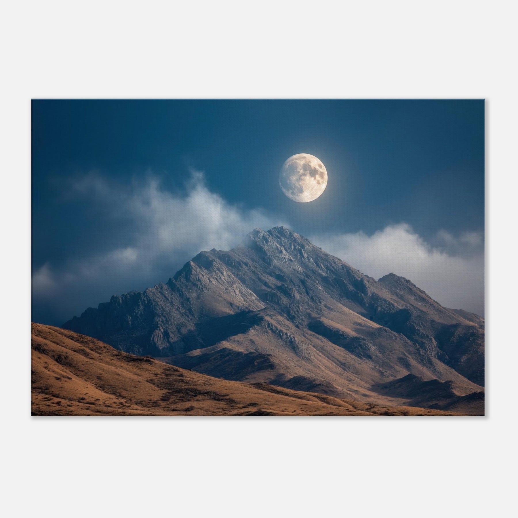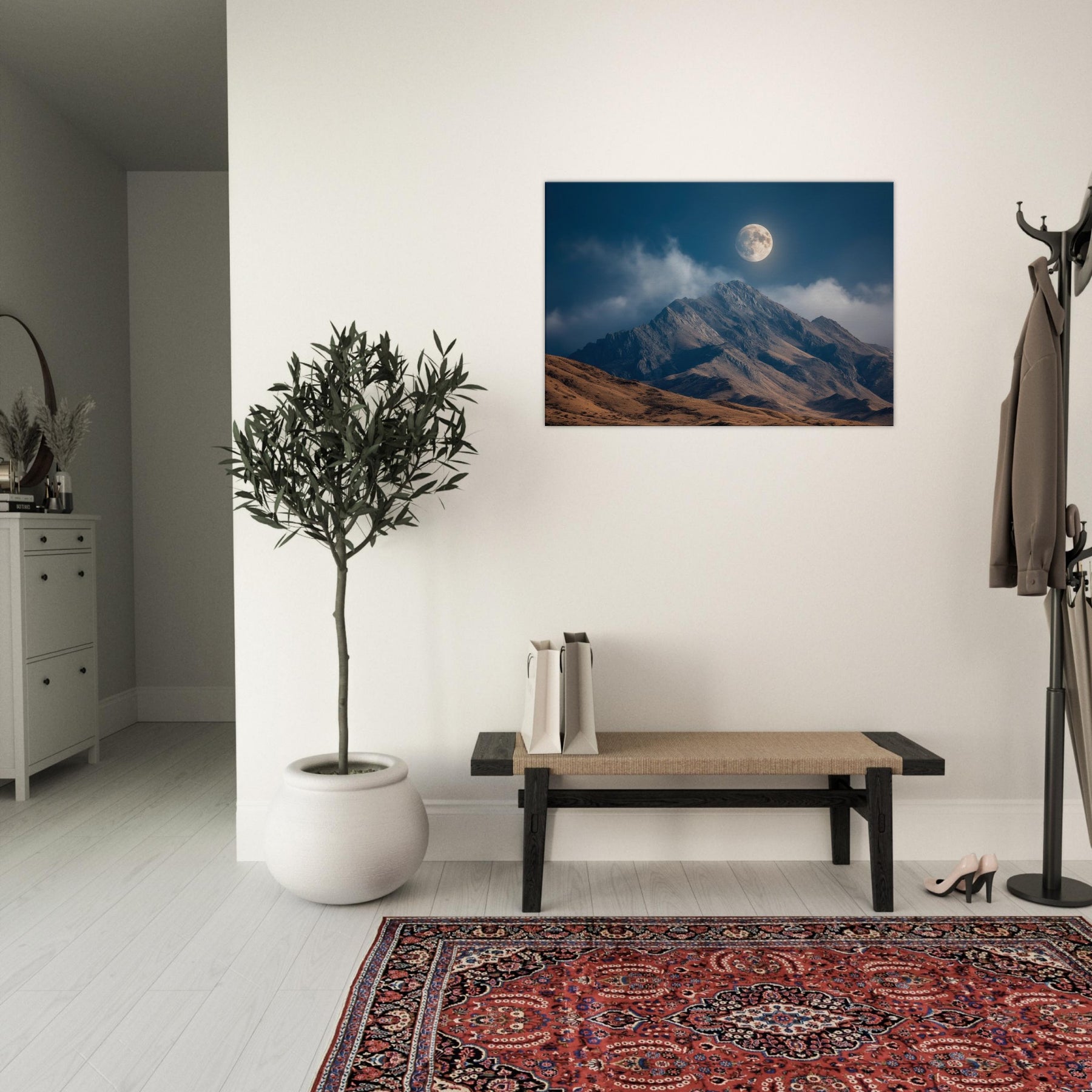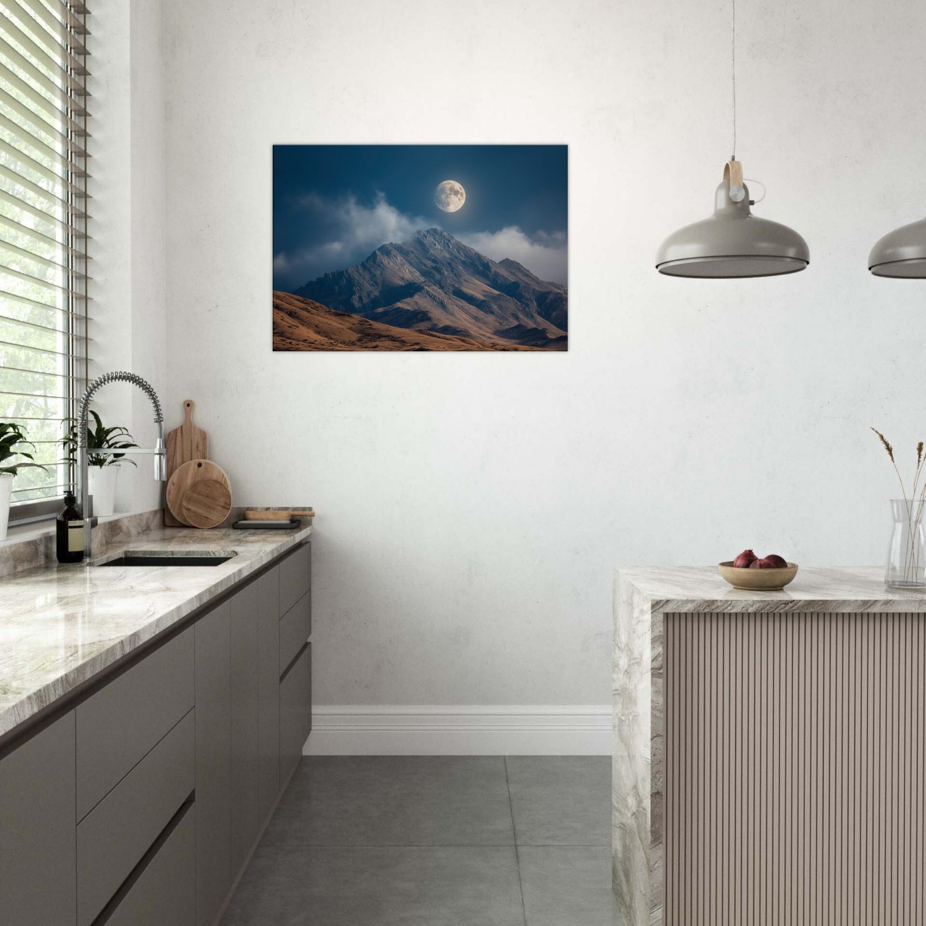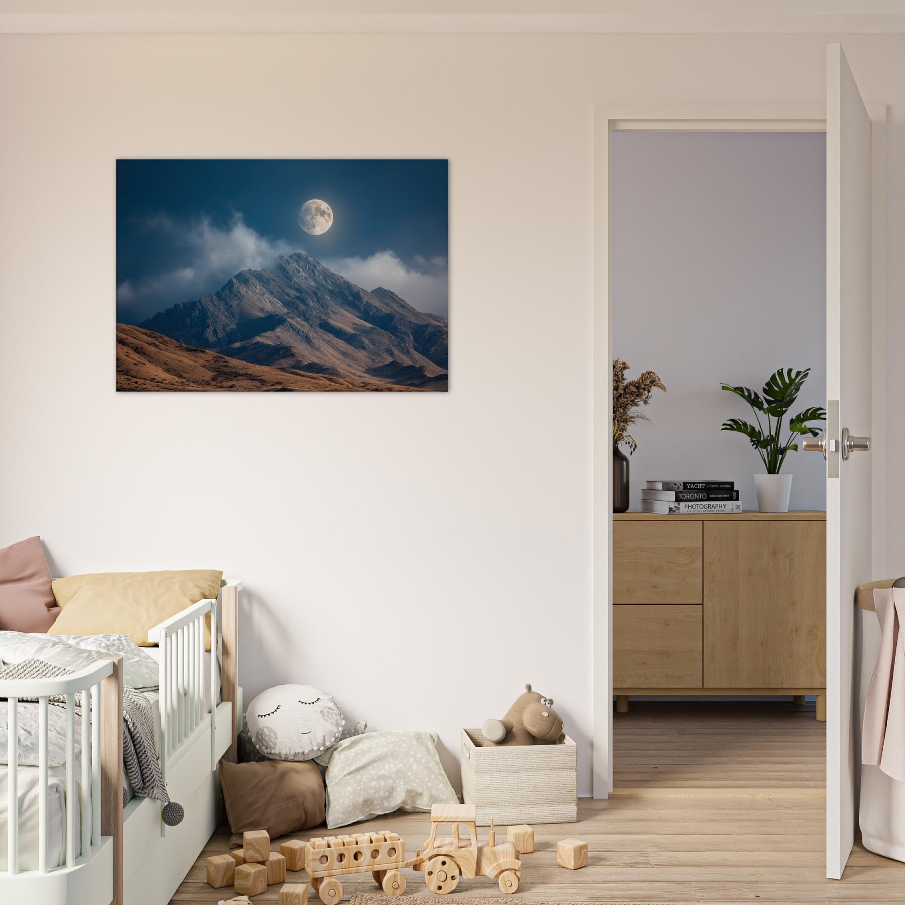 Moon over Mountains unfolds as a whisper of night that settles over your living space. The pale moon hovers above jagged ridges, bathing the scene in a cool, meditative glow that nourishes calm and focus. Like a dream captured in material form, the surreal composition elevates a room with a mystical hush, inviting quiet reflection and creative solitude. It becomes a daily reminder to pause, breathe, and imagine new possibilities each time you pass. The central subject is Moon over Mountains (Minimal).