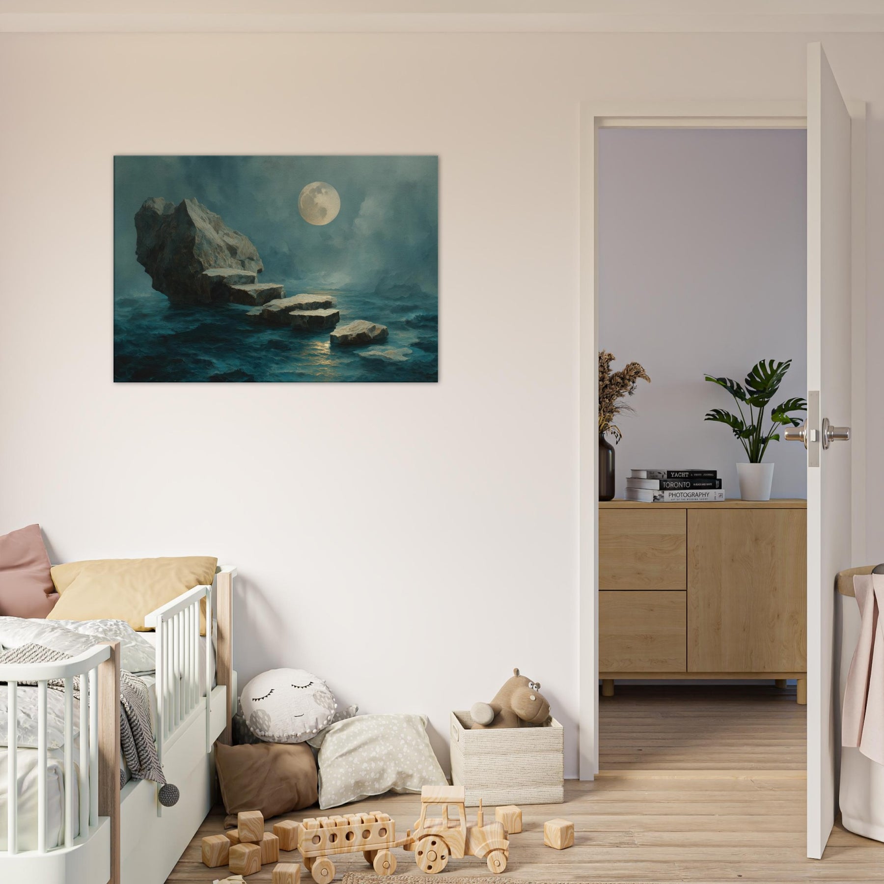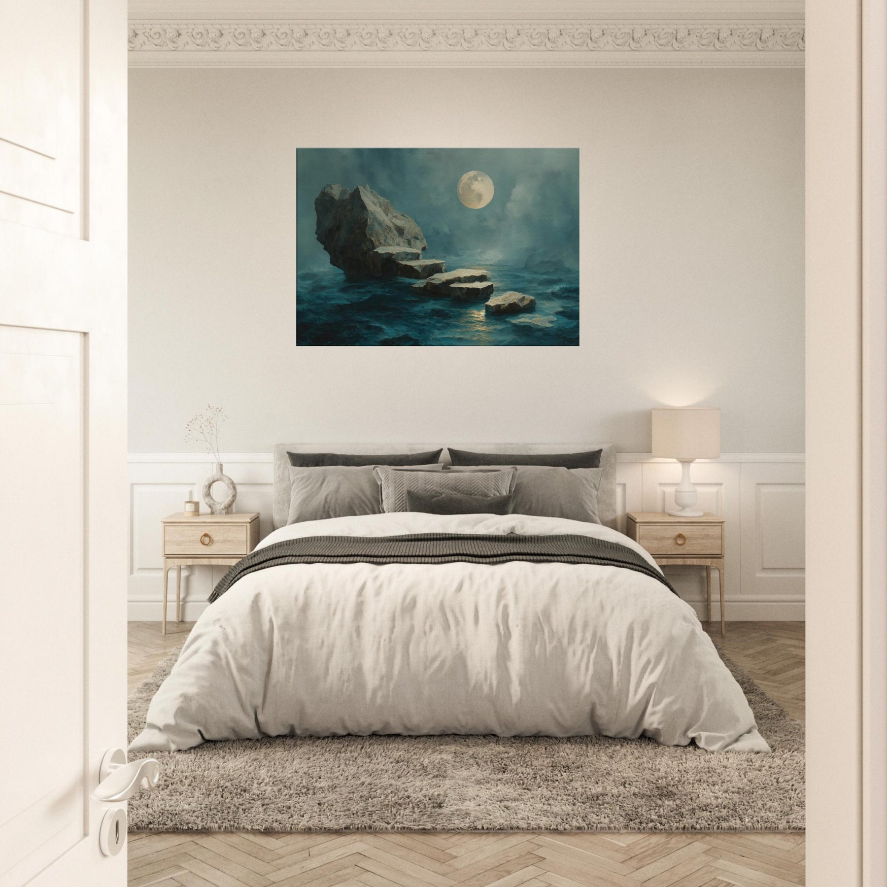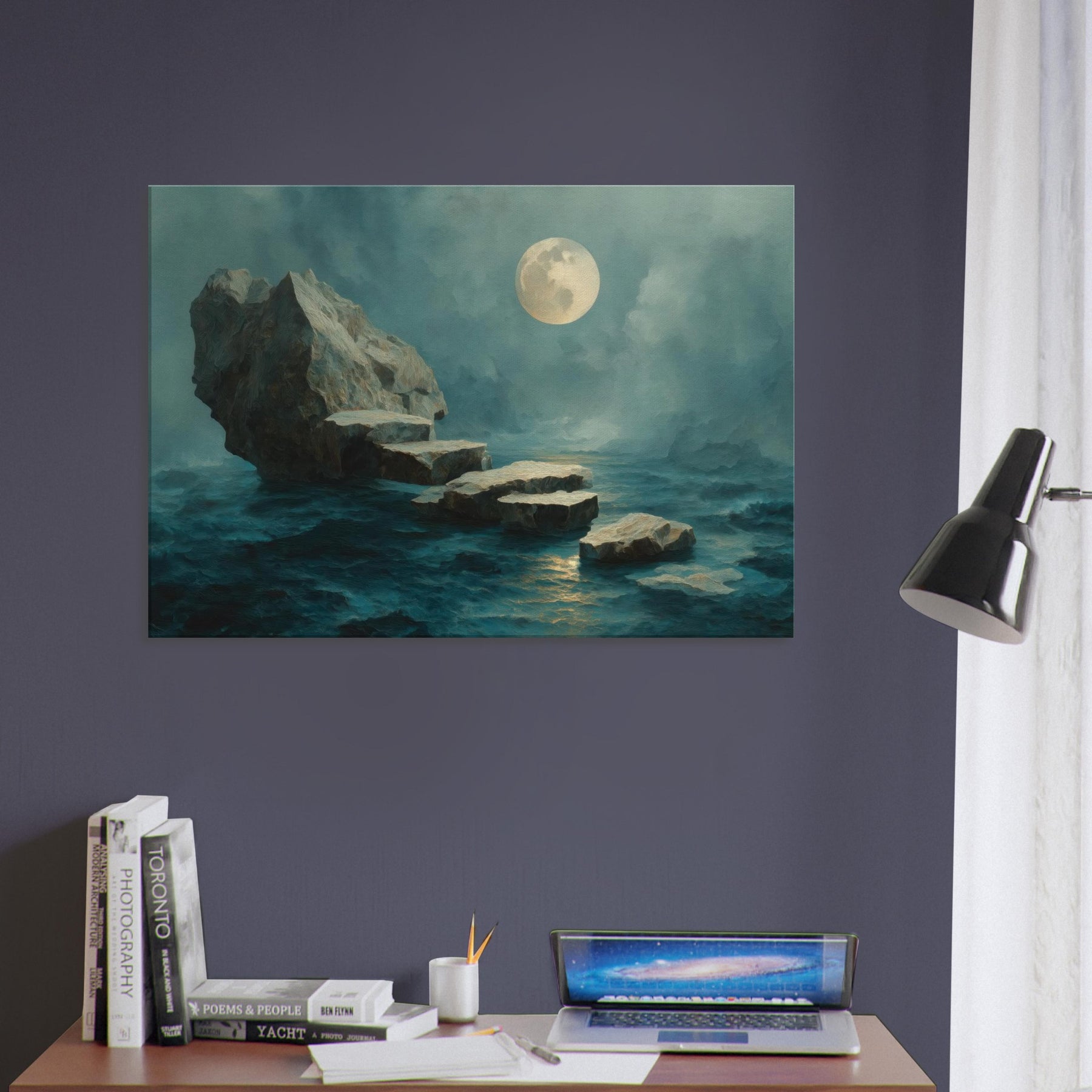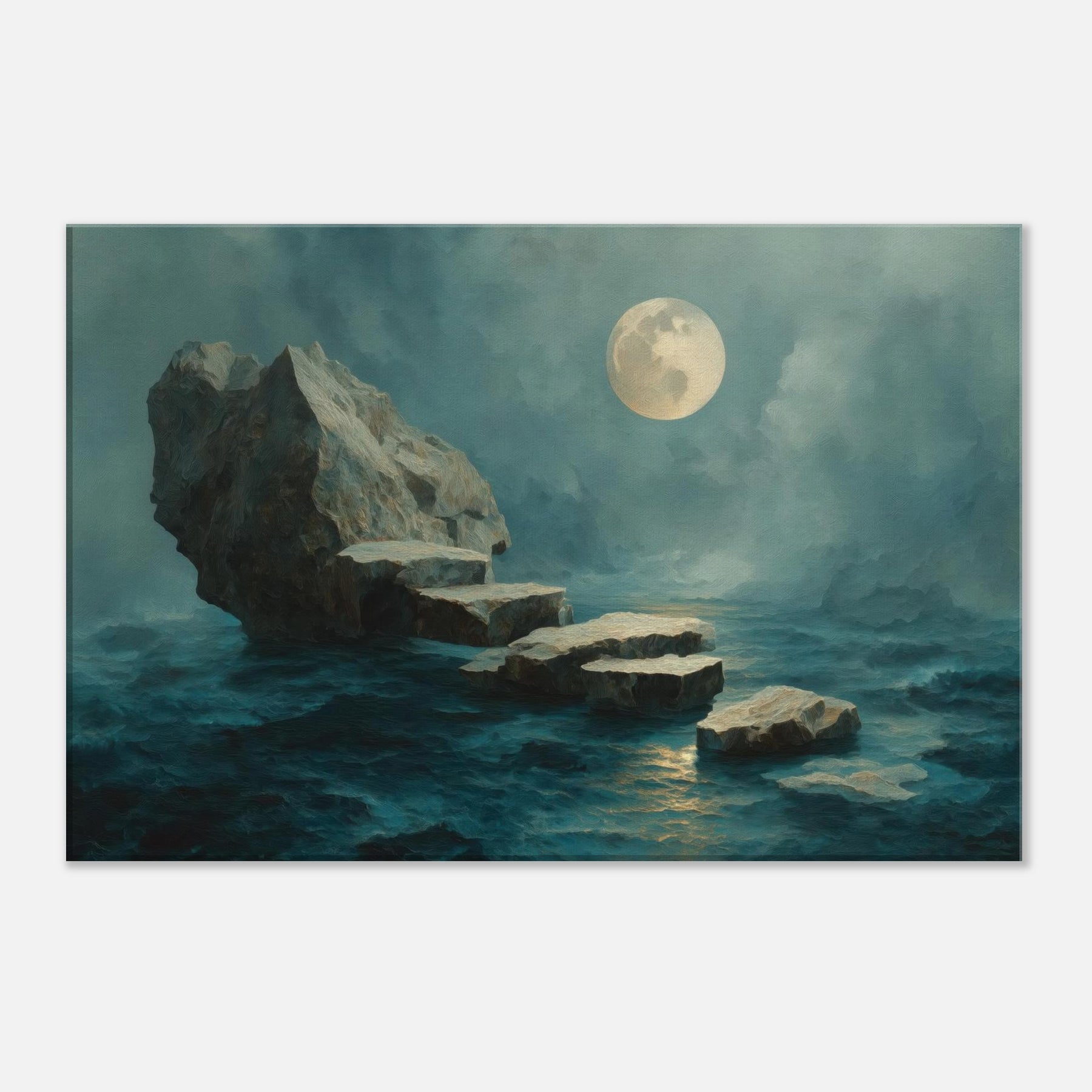 Stormy Sea returns us to a realm where water and rock braid into a single dream. In this surreal scene, a towering cliff of stone anchors the horizon while stepping stones drift toward the moonlit surface, inviting the eye to walk the impossible. The atmosphere is hiss of spray and quiet moonlight; cool blues and pale ochre glow with restrained intensity. Hang this work to soothe a living room, adding depth, mystery, and a generous breath of ocean air calm.