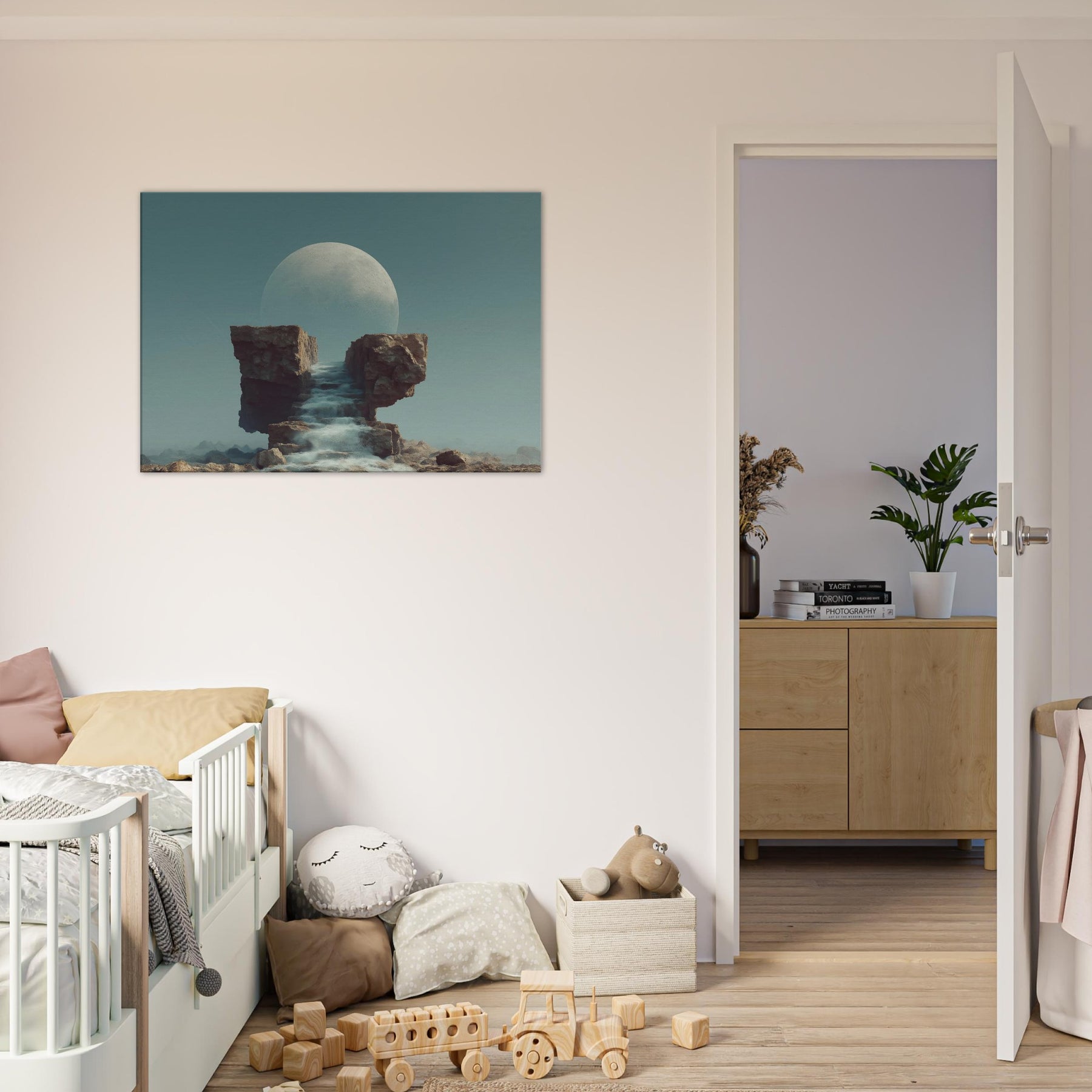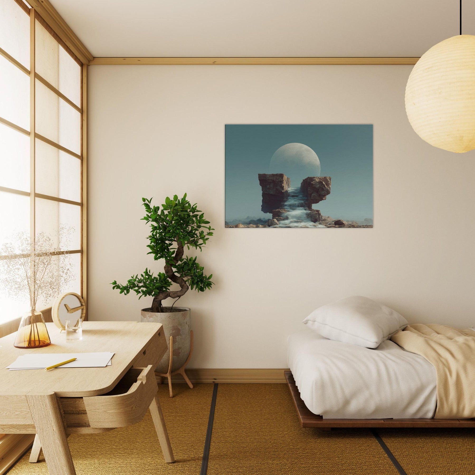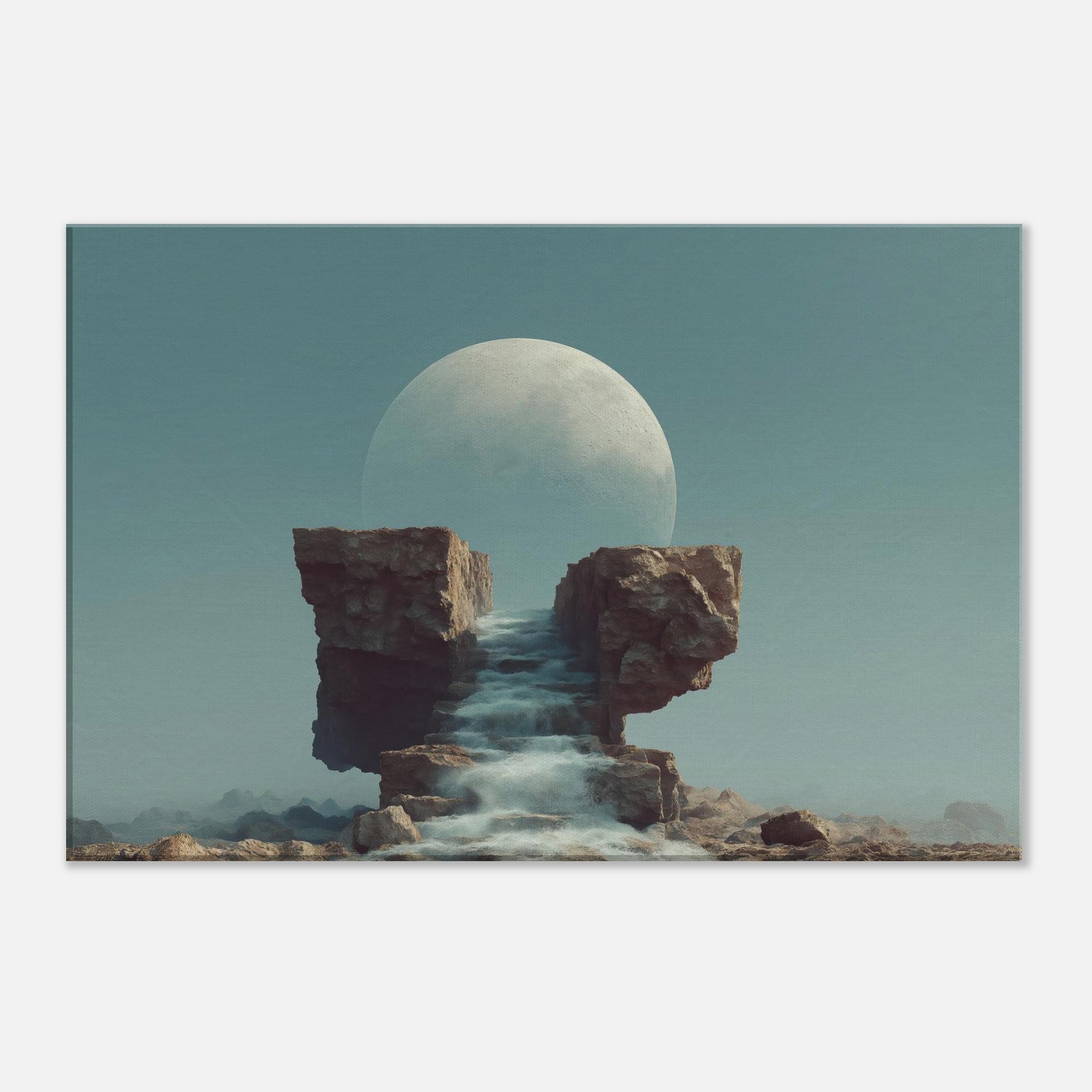 Coastlines blur into dream in this Coastal Cliffs composition, where surf becomes mist and time leans against impossible rock stairs. A moon looms behind the rugged gaps, bathing the scene in a cool, silver hush that slows the heartbeat. The framing invites contemplation, turning your wall into a portal to ocean air, salt scent, and the hush of distant tide. A sophisticated focal point for living rooms or studios, it delivers serenity, wonder, and a conversation starting sense of otherworldly space.