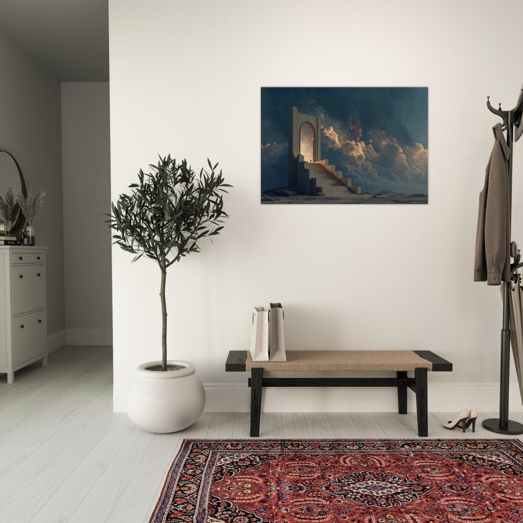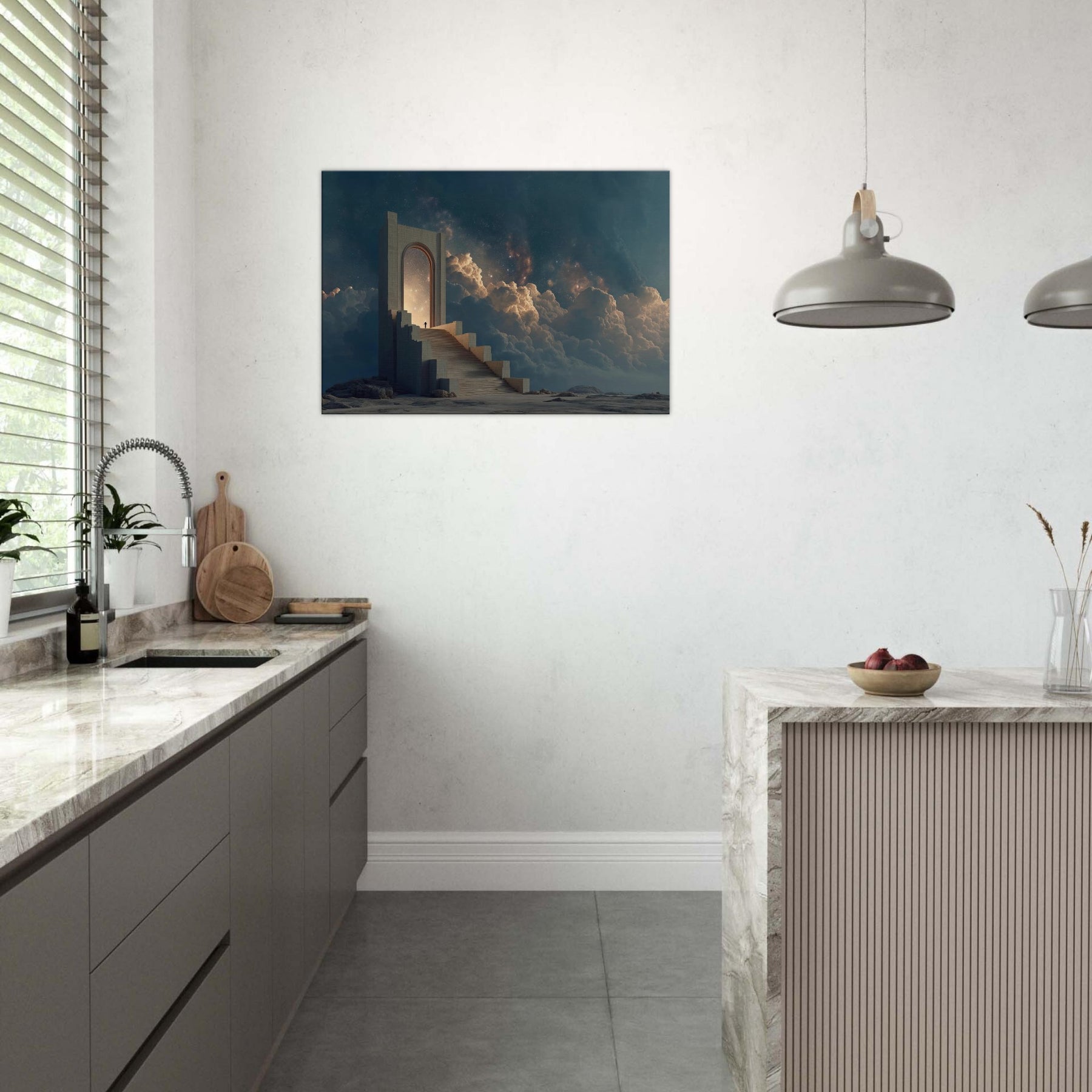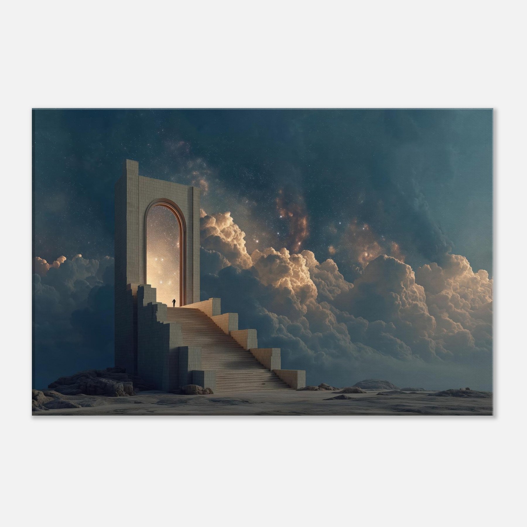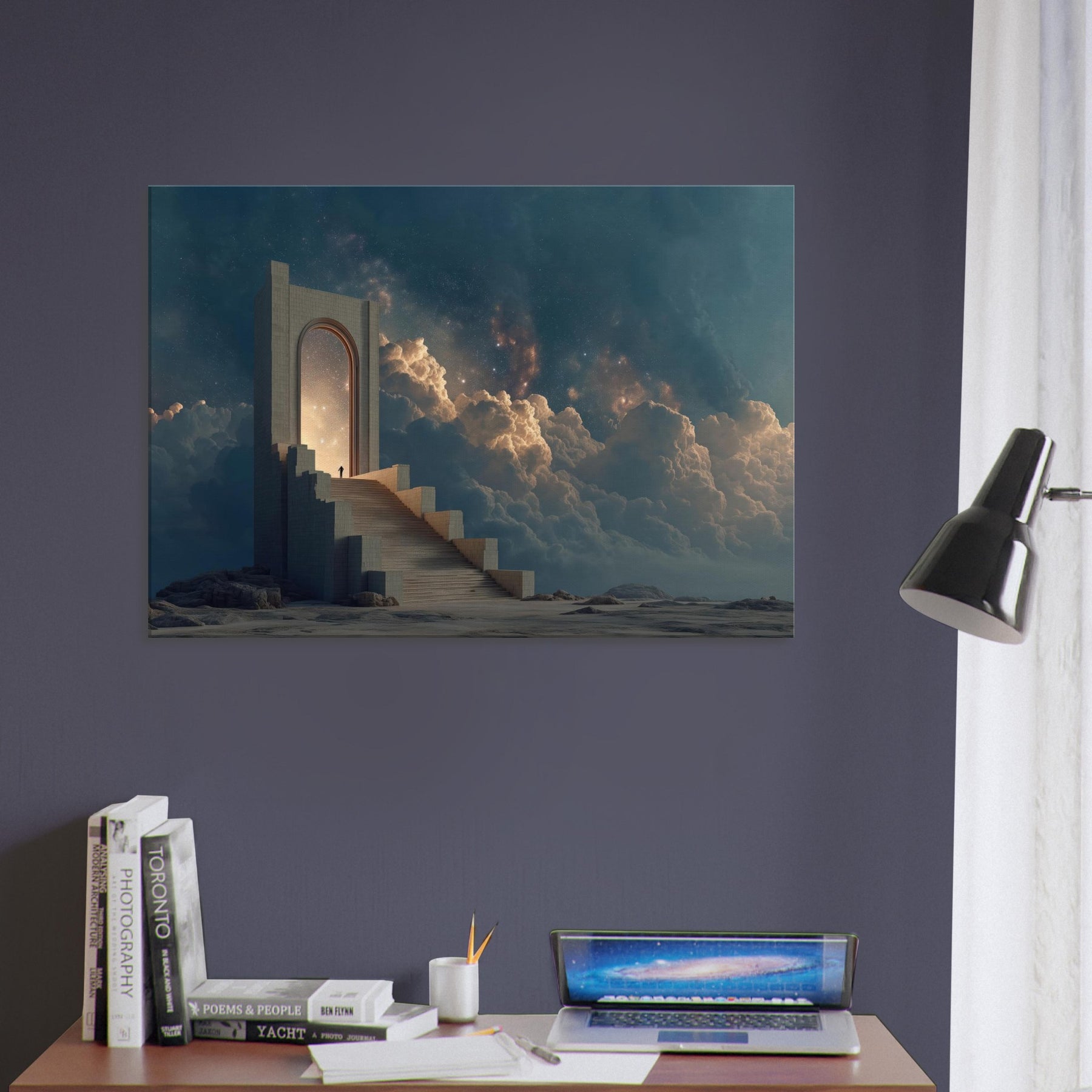 Mysteriously poised above a sea of clouds, this Miami inspired surreal doorway invites reflection as much as wonder. The monumental arch frames a glow of starlight and distant city hum, turning architecture into a hinge between dream and daylight. Steps ascend toward an unseen horizon, suggesting the city's vibrant pulse while offering a tranquil focal point for living rooms, bedrooms, or studios. Hang it to echo coastal winds, warm sunsets, and the fearless optimism of Miami's skyline, transforming walls into a portal of possibility.