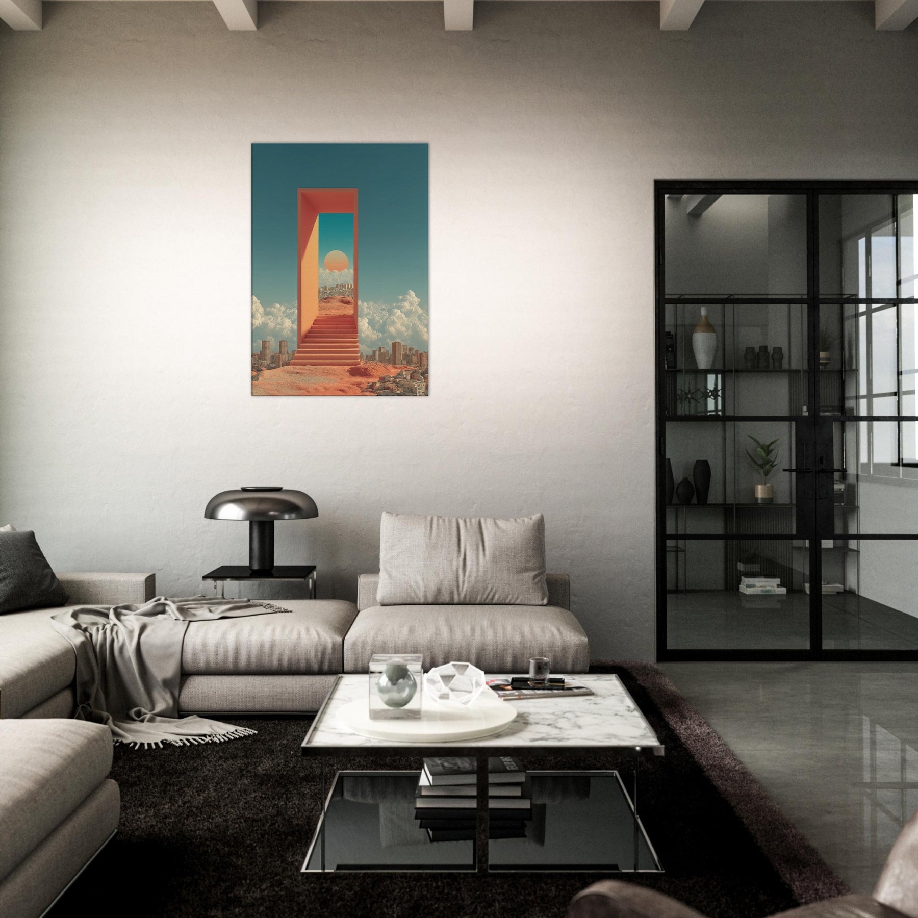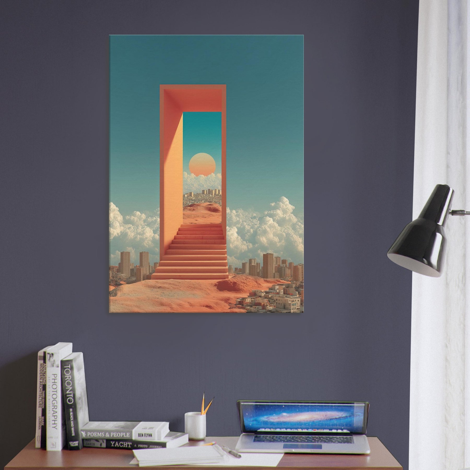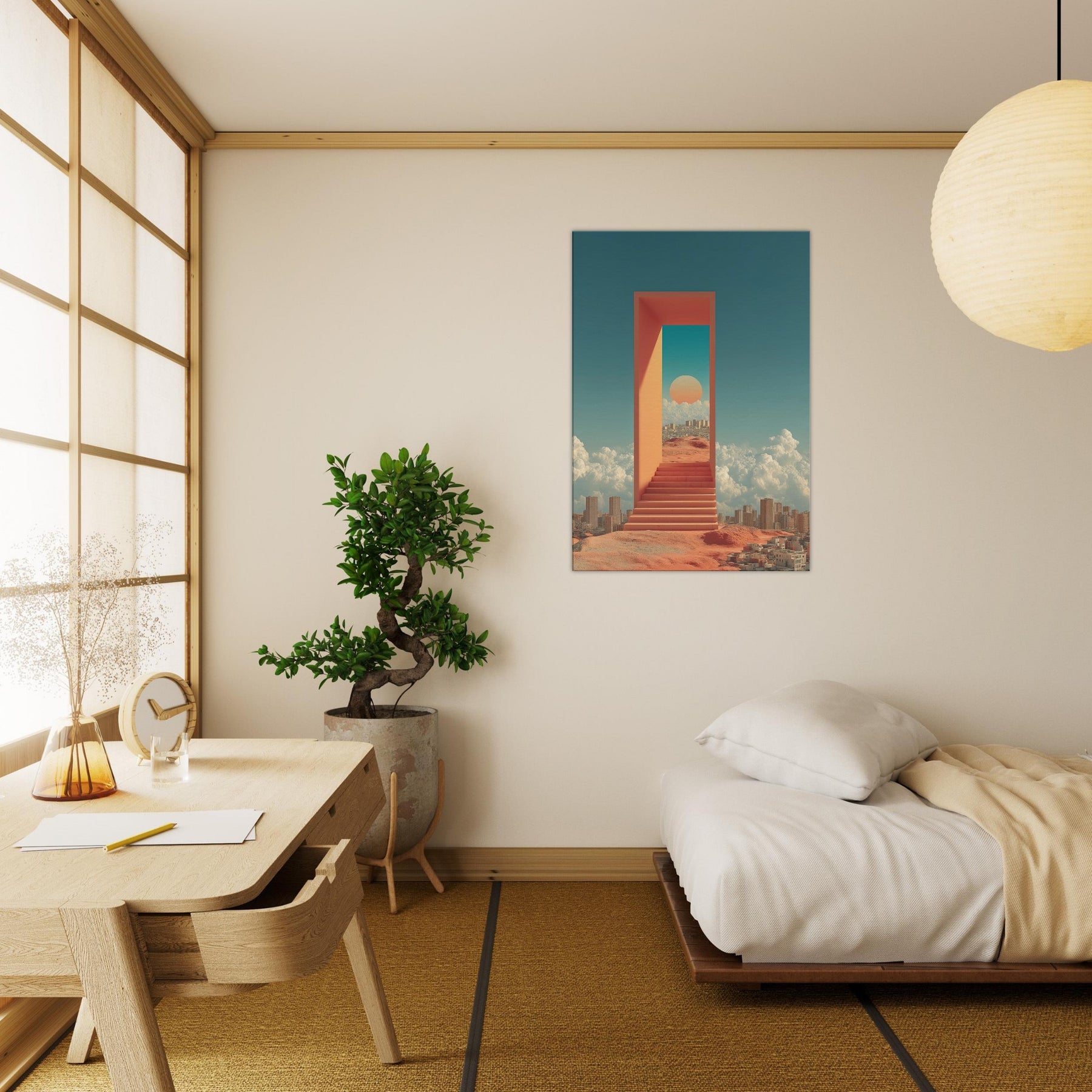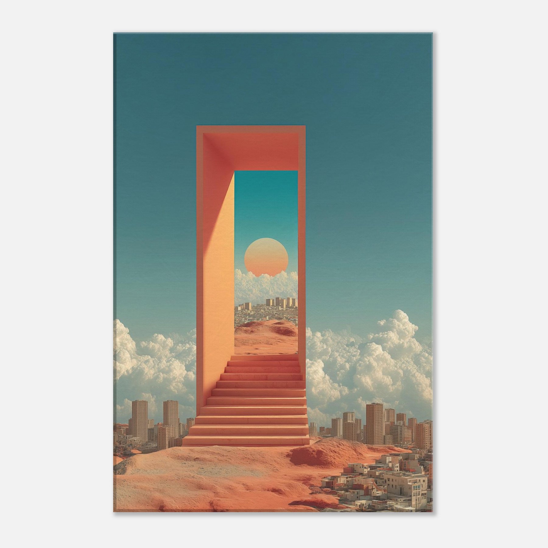 Seoul unfolds like a dream you can step through: a luminous corridor suspended above a busy desert city, where a warm sun sits within a turquoise portal and coral walls. The scent of rain on warm metal, the hush between metal stairs, and the distant murmur of a waking skyline mingle with clouds that cradle distant towers. This surreal composition turns a living room into a quiet sanctuary, inviting reflection, wonder, and a sense of limitless possibility perfect for contemporary spaces craving light and narrative.