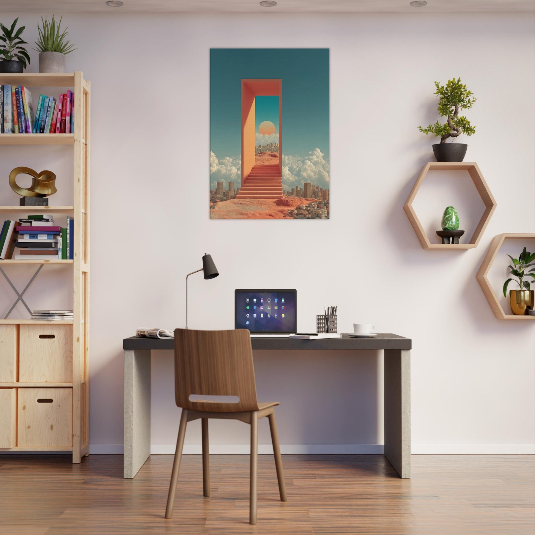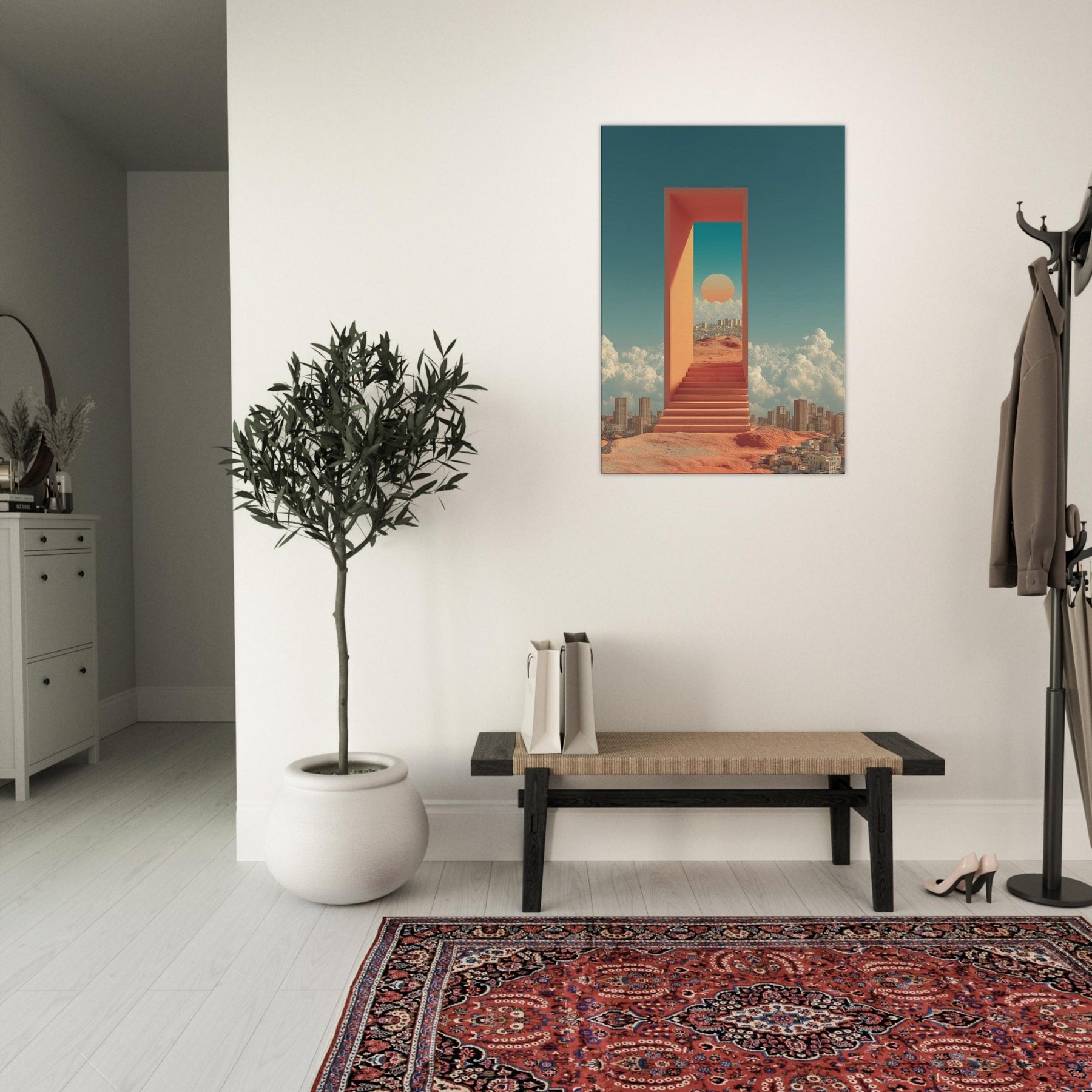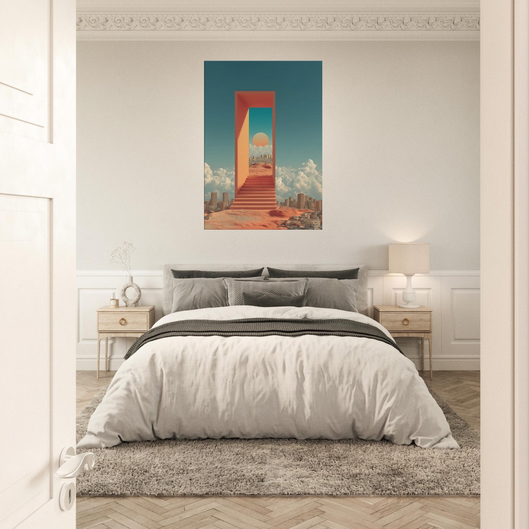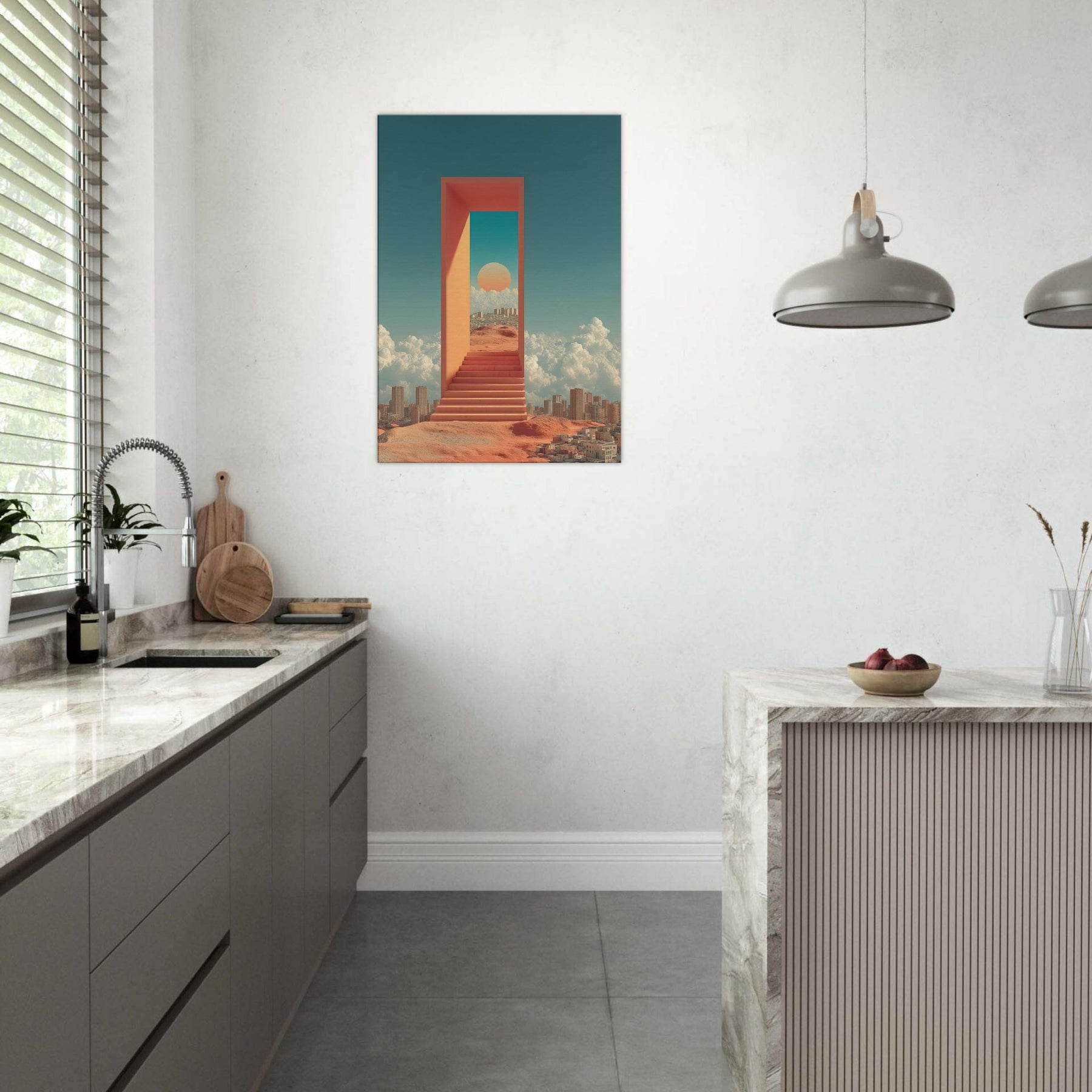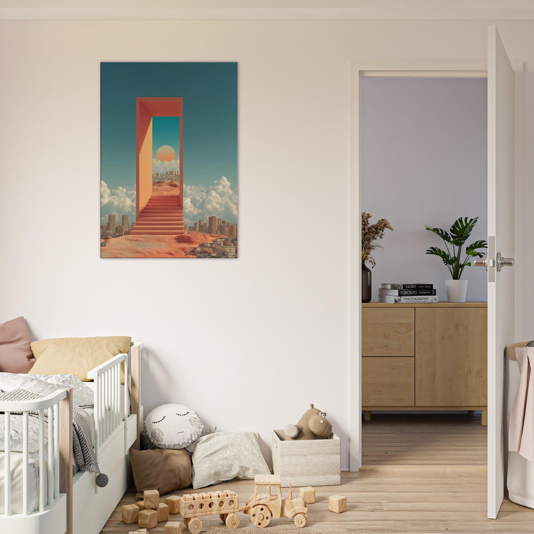 Seoul unfolds like a dream you can step through: a luminous corridor suspended above a busy desert city, where a warm sun sits within a turquoise portal and coral walls. The scent of rain on warm metal, the hush between metal stairs, and the distant murmur of a waking skyline mingle with clouds that cradle distant towers. This surreal composition turns a living room into a quiet sanctuary, inviting reflection, wonder, and a sense of limitless possibility perfect for contemporary spaces craving light and narrative.