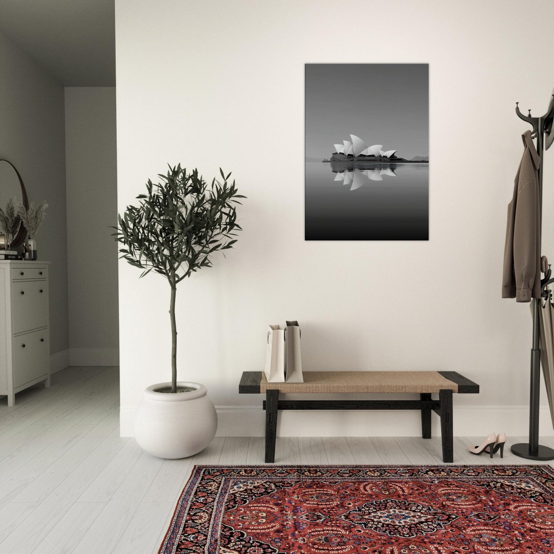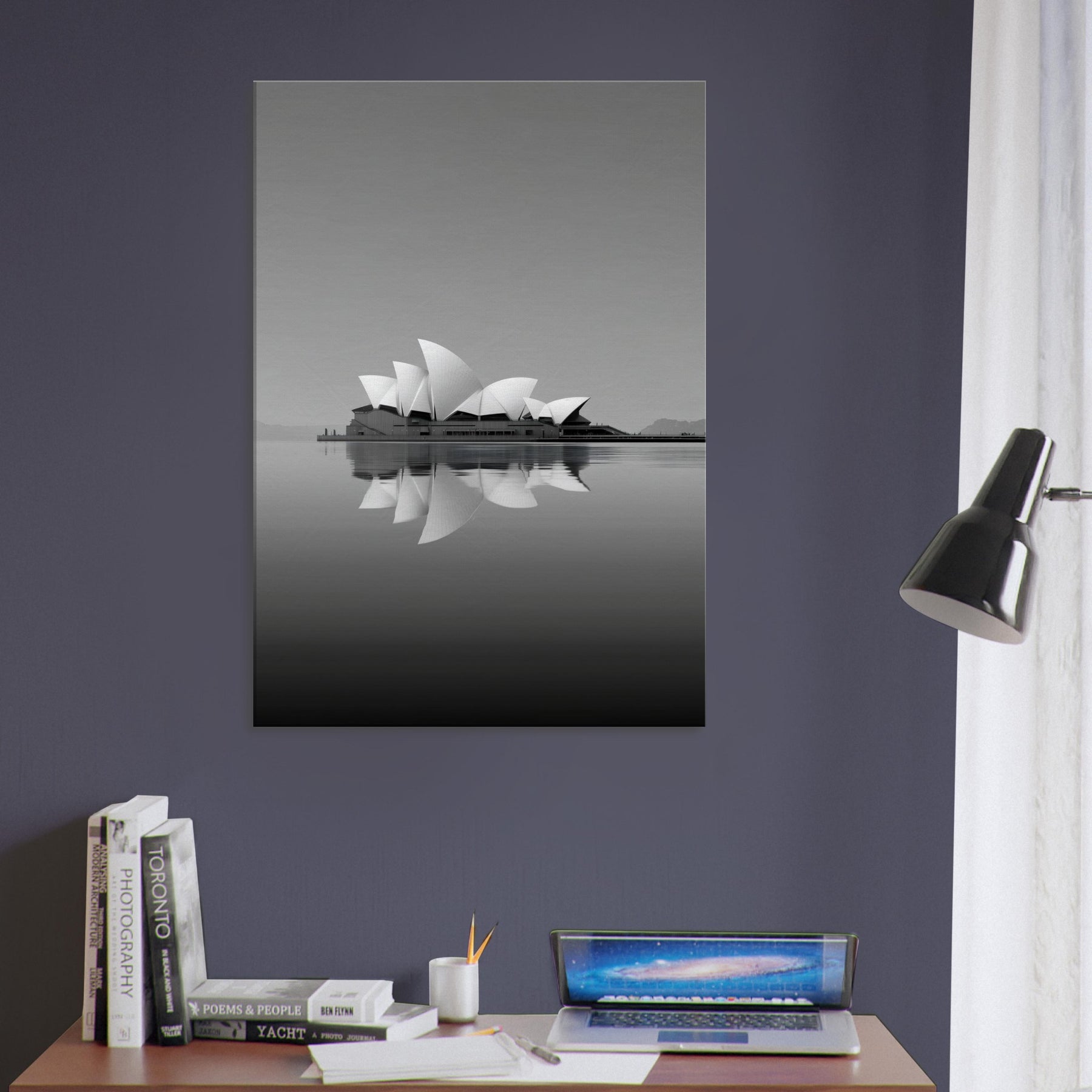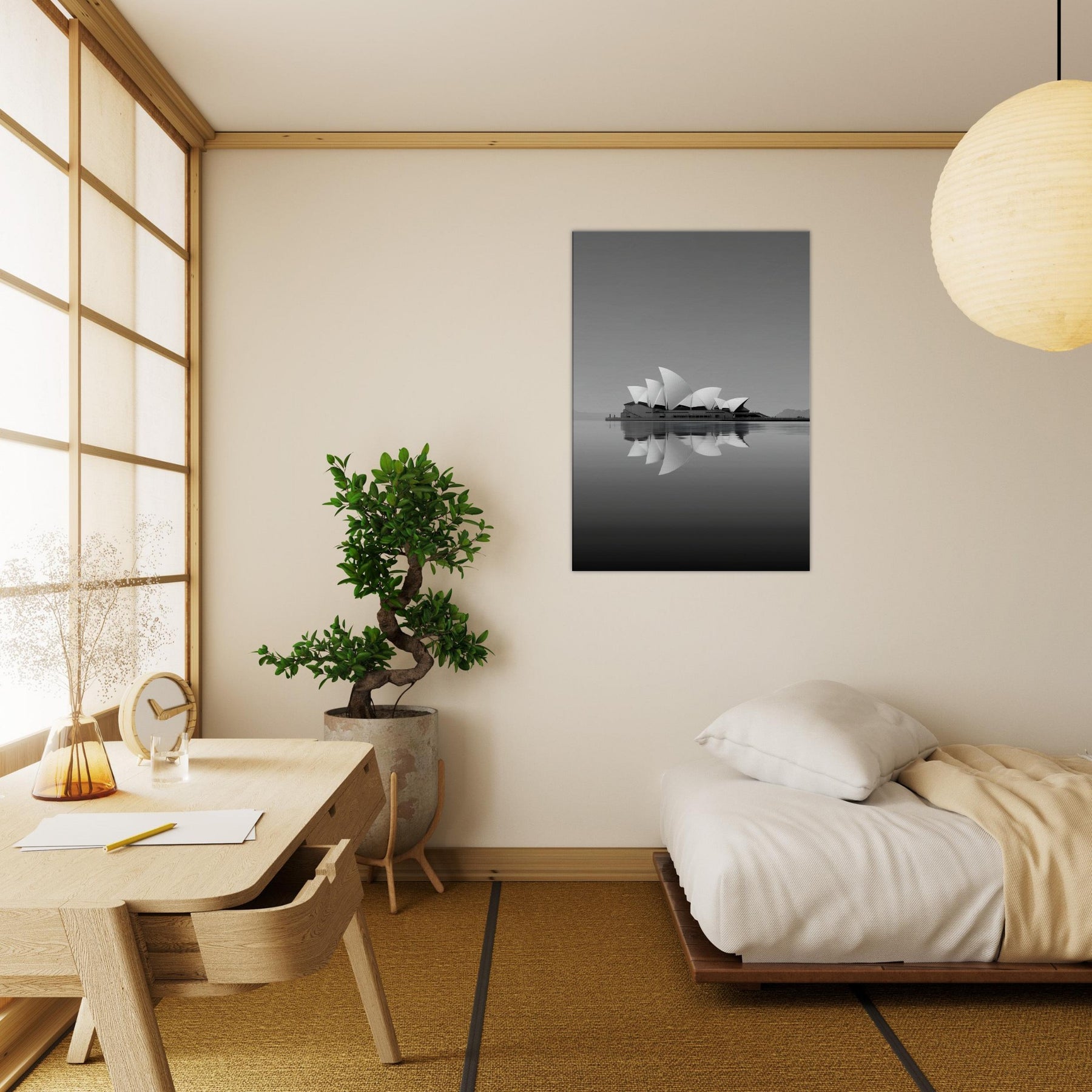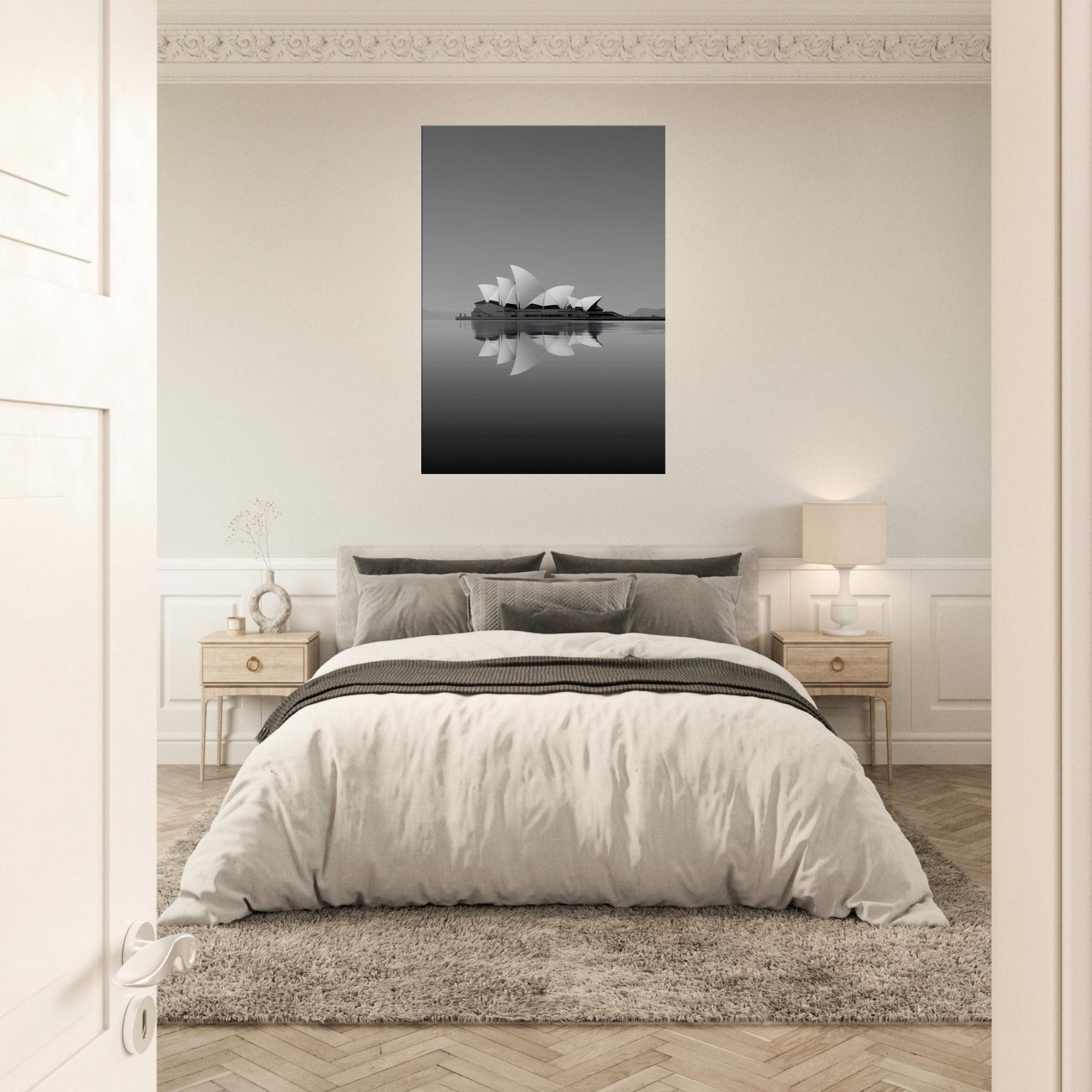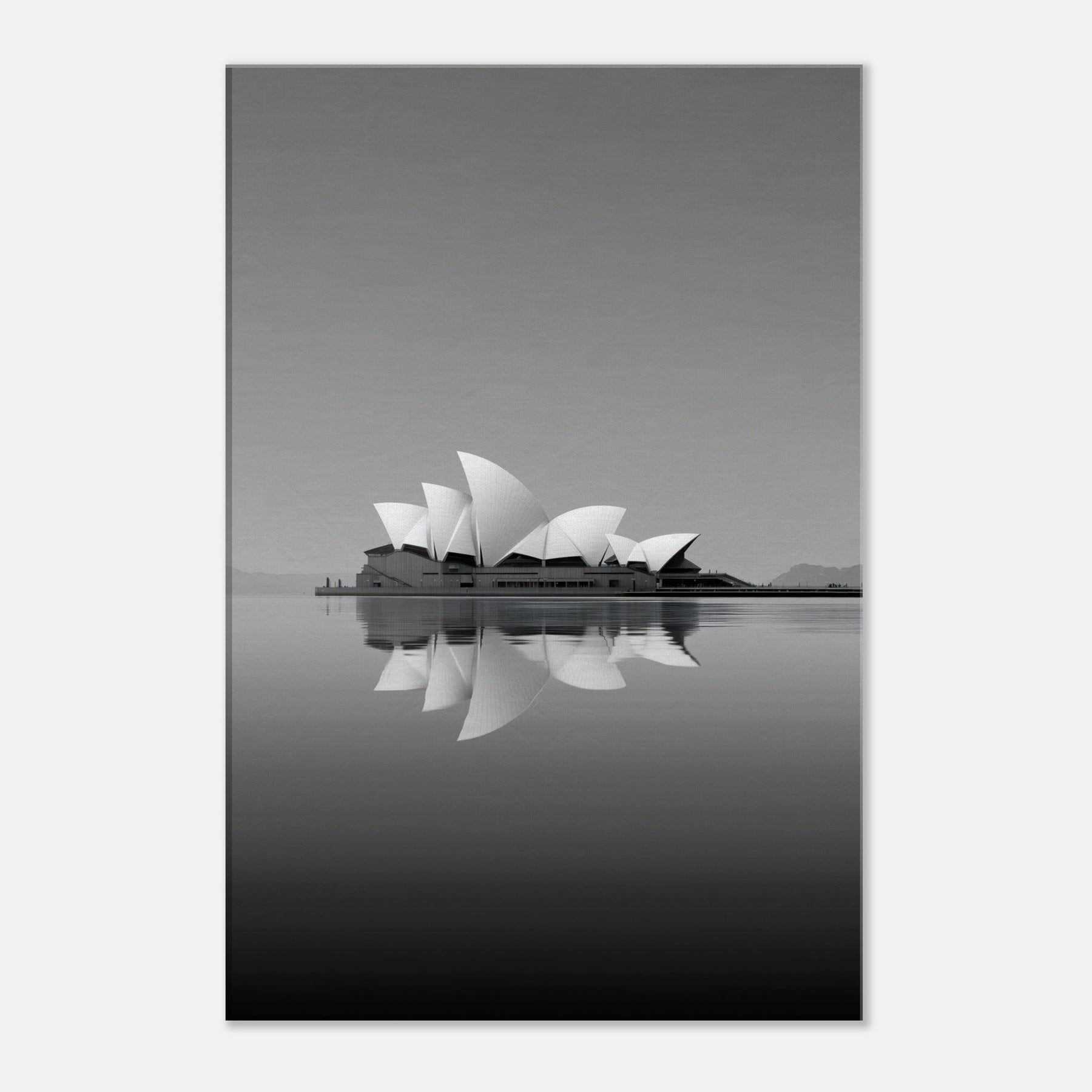 A serene, dreamlike reinterpretation of Sydney Opera House rises from still waters, its sails unfolding in soft, rhyming curves. The grayscale palette and mirrored reflections invite a hush of contemplation, as if the room itself were a harbor at dusk. This artwork evokes ambition and memory, turning walls into windows to distant horizons. Hang it in a living room or study to soften edges, amplify natural light, and anchor conversations with a quiet, architectural poetry.