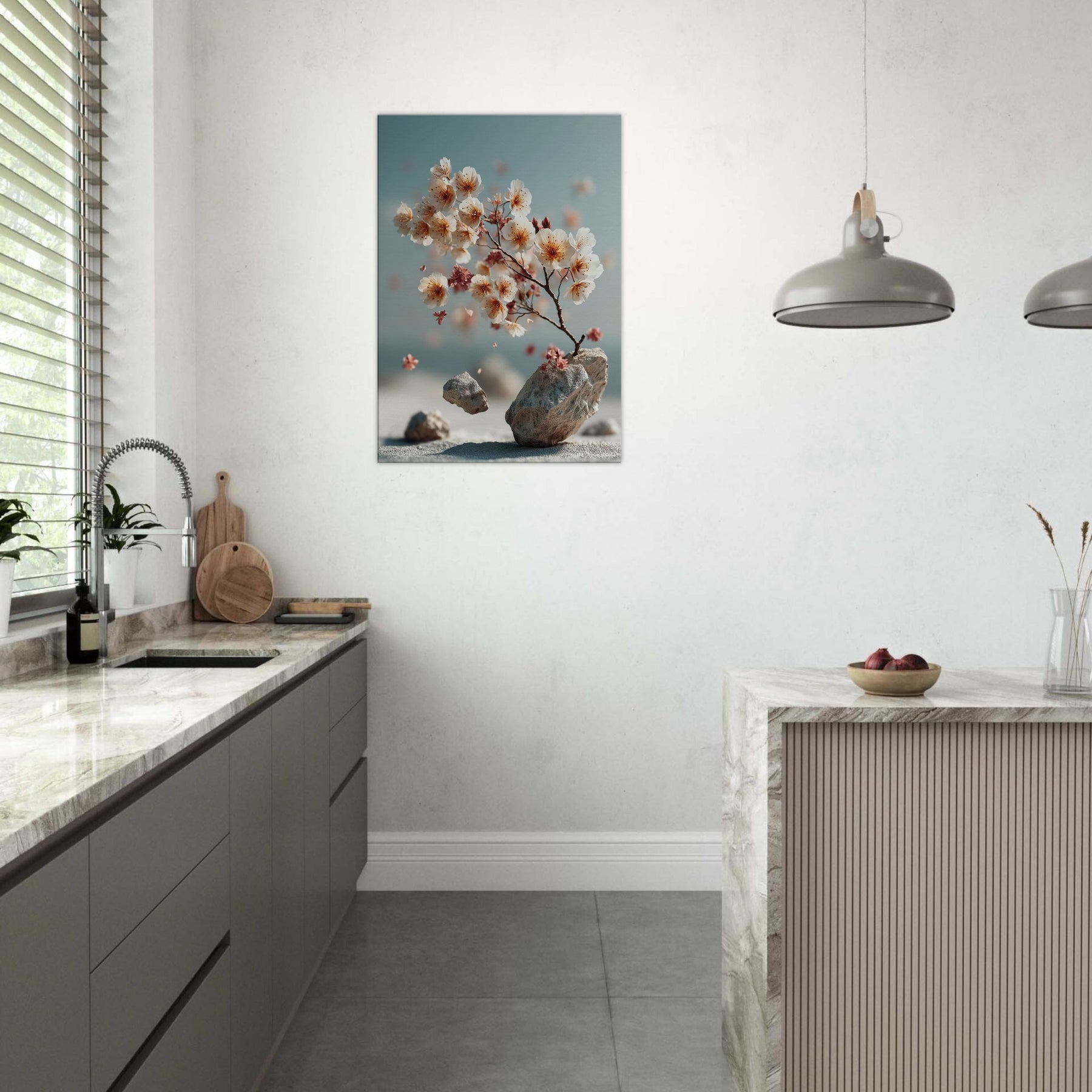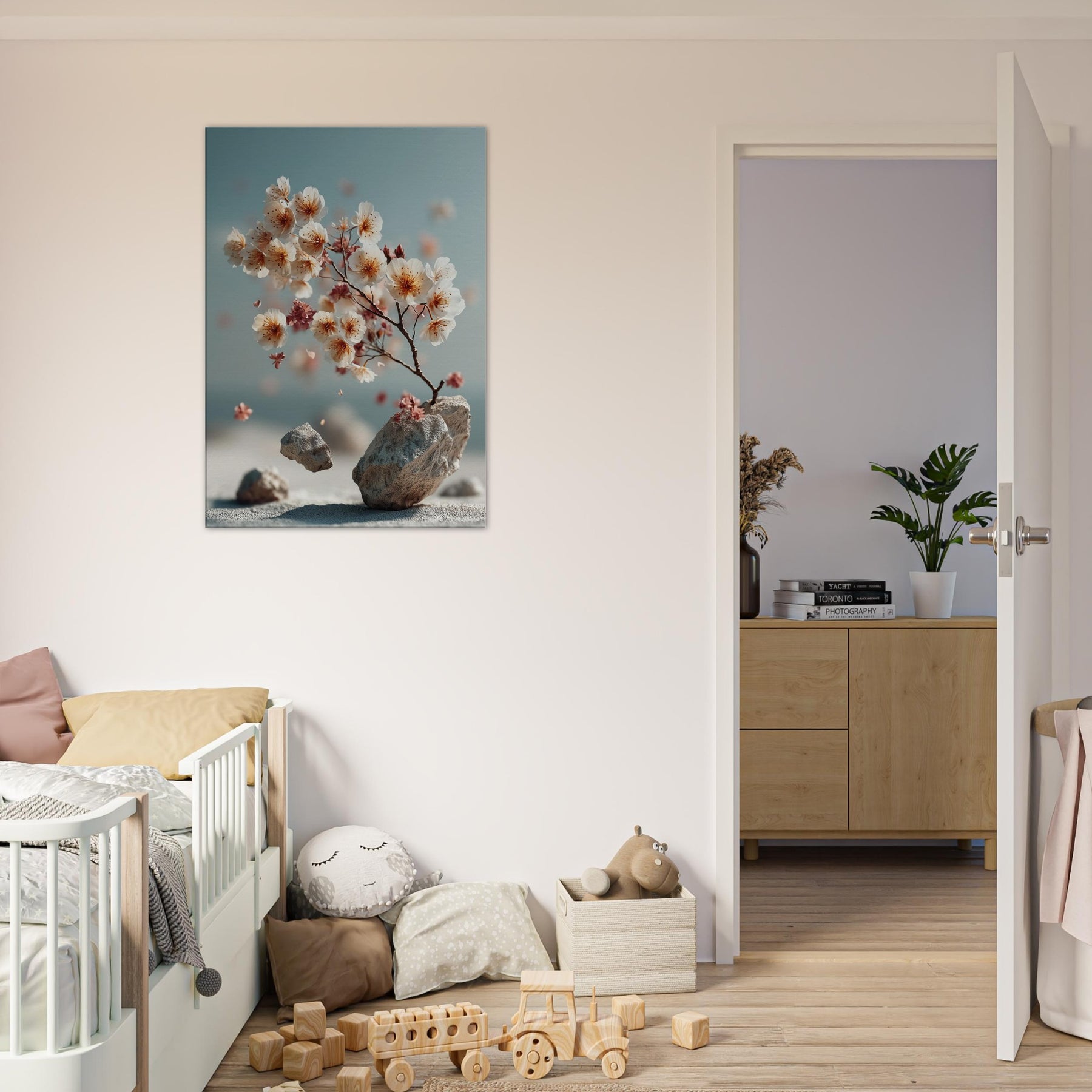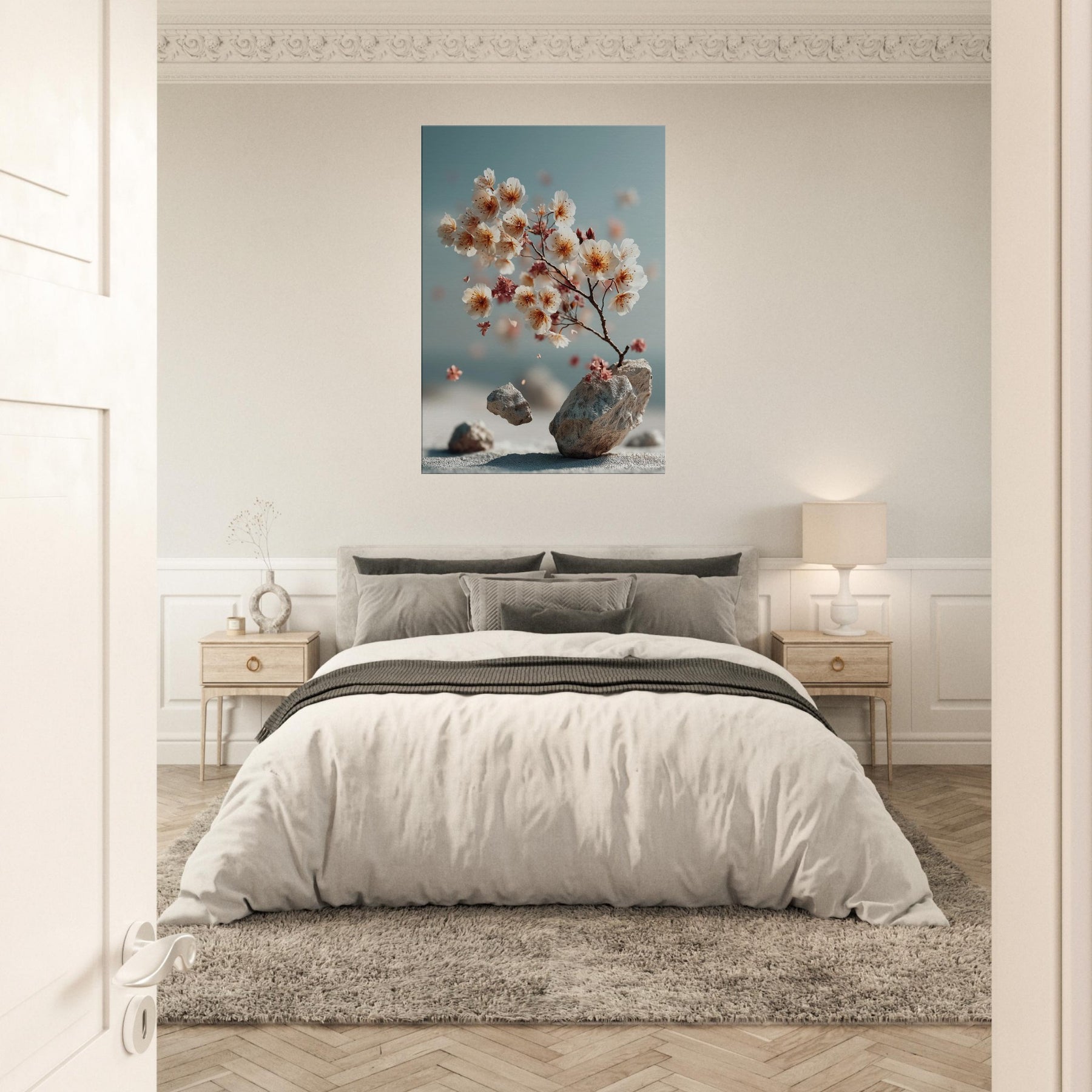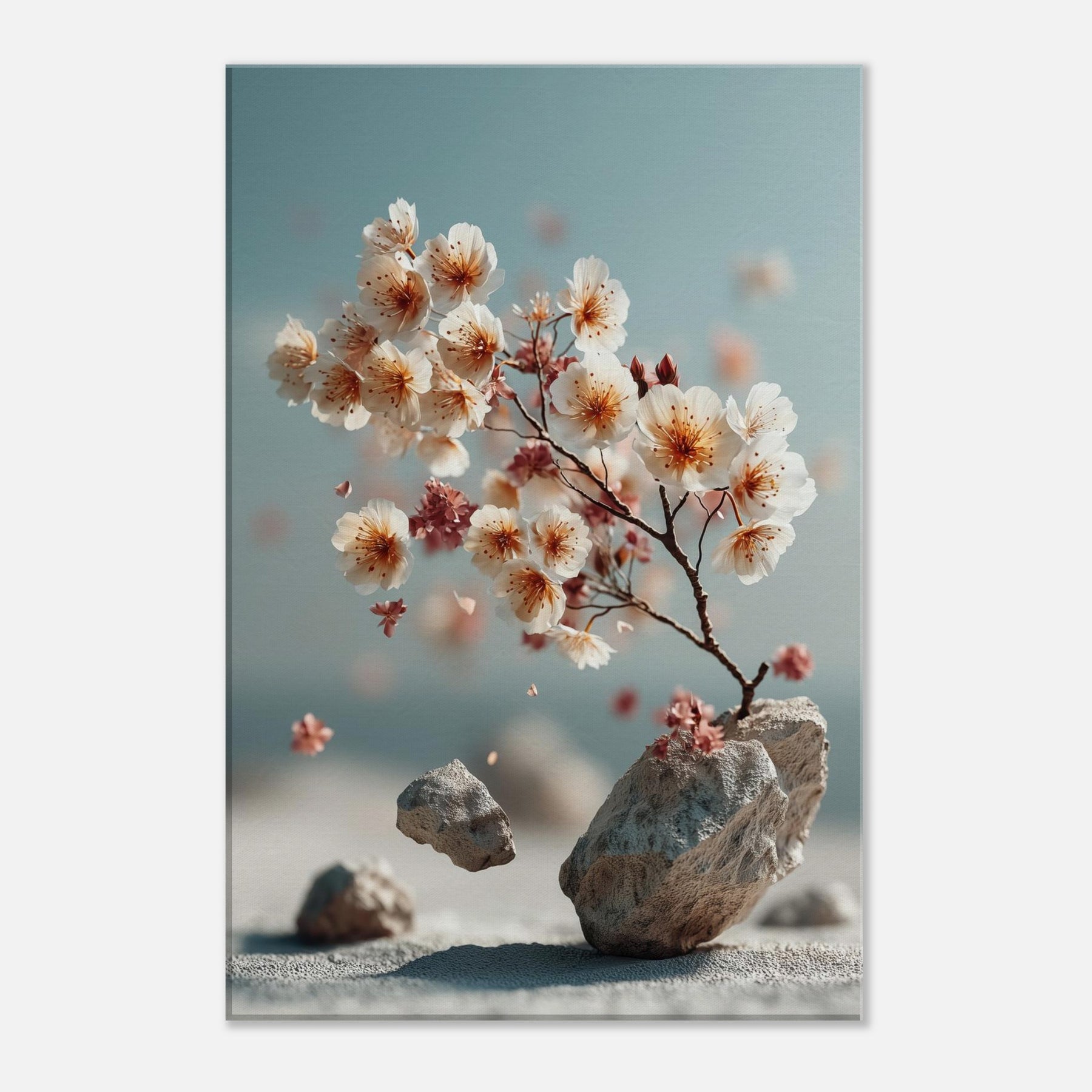 Sakura Branch drifts between dream and daylight, a surreal whisper of blossom and stone. The branch leans toward a pale horizon, where petals drift like lanterns caught in a quiet sea breeze. The composition fuses nature with otherworldliness, inviting slower breaths and longer gazes. In a living room or study, it becomes a gentle focal point, turning walls into a window of memory, season, and quiet possibility.